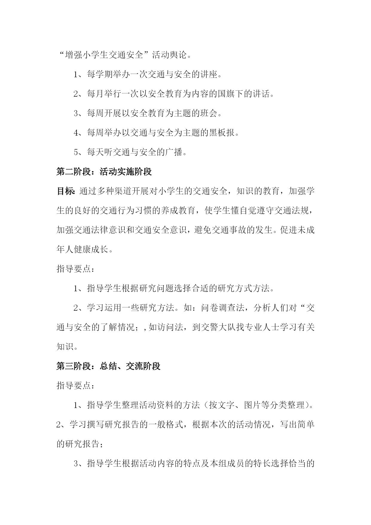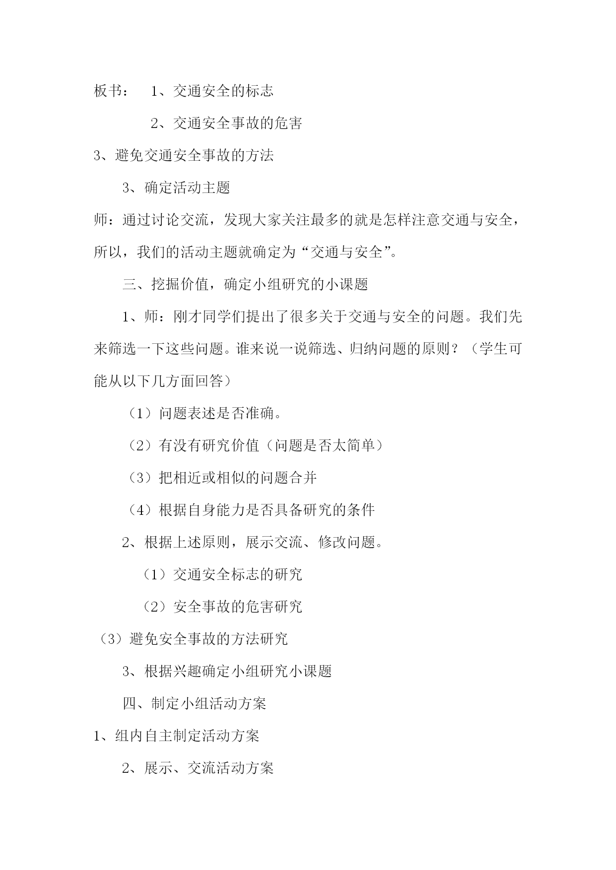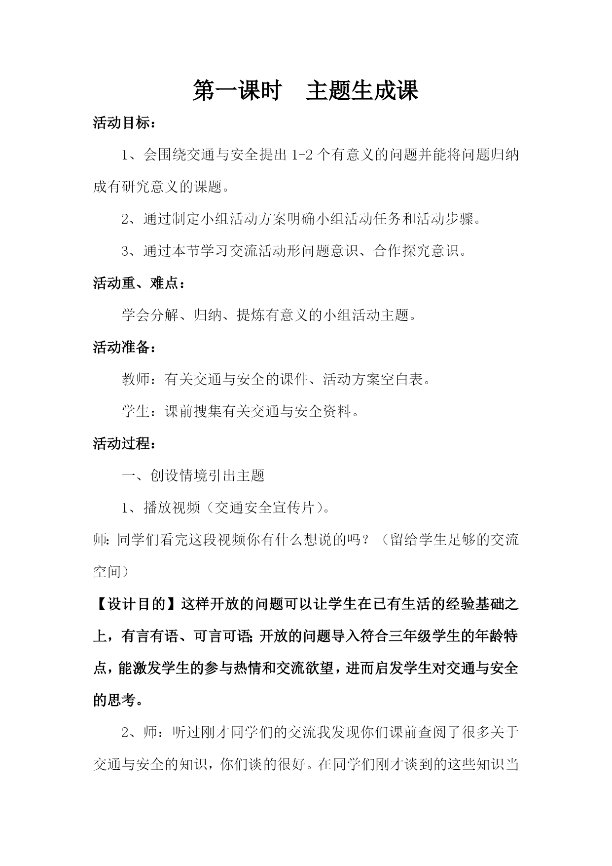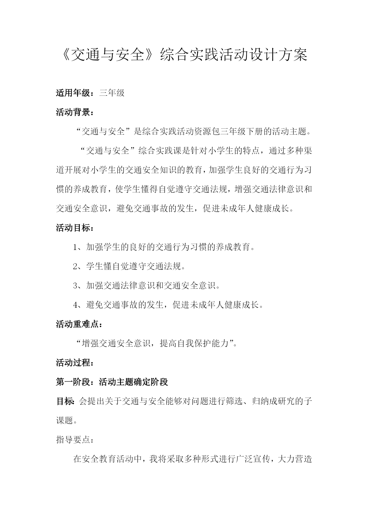 综合实践《交通与安全》活动方案设计最新文档(可以直接使用,可编辑最新文档,欢迎下载)《交通与安全》综合实践活动设计方案单位:实验小学姓名:彭立建时间:202110《交通与安全》综合实践活动设计方案适用年级:三年级活动背景:“交通与安全”是综合实践活动资源包三年级下册的活动主题。“交通与安全”综合实践课是针对小学生的特点,通过多种渠道开展对小学生的交通安全知识的教育,加强学生良好的交通行为习惯的养成教育,使学生懂得自觉遵守交通法规,增强交通法律意识和交通安全意识,避免交通事故的发生,促进未成年人健康成长。活动目标:1、加强学生的良好的交通行为习惯的养成教育。2、学生懂自觉遵守交通法规。3、加强交通法律意识和交通安全意识。4、避免交通事故的发生,促进未成年人健康成长。活动重难点:“增强交通安全意识,提高自我保护能力”。活动过程:第一阶段:活动主题确定阶段目标:会提出关于交通与安全能够对问题进行筛选、归纳成研究的子课题。指导要点:在安全教育活动中,我将采取多种形式进行广泛宣传,大力营造“增强小学生交通安全”活动舆论。1、每学期举办一次交通与安全的讲座。2、每月举行一次以安全教育为内容的国旗下的讲话。3、每周开展以安全教育为主题的班会。4、每周举办以交通与安全为主题的黑板报。5、每天听交通与安全的广播。第二阶段:活动实施阶段目标:通过多种渠道开展对小学生的交通安全,知识的教育,加强学生的良好的交通行为习惯的养成教育,使学生懂自觉遵守交通法规,加强交通法律意识和交通安全意识,避免交通事故的发生。促进未成年人健康成长。指导要点:1、指导学生根据研究问题选择合适的研究方式方法。2、学习运用一些研究方法。如:问卷调查法,分析人们对“交通与安全的了解情况;,如访问法,到交警大队找专业人士学习有关知识。第三阶段:总结、交流阶段指导要点:1、指导学生整理活动资料的方法(按文字、图片等分类整理)。2、学习撰写研究报告的一般格式,根据本次的活动情况,写出简单的研究报告;3、指导学生根据活动内容的特点及本组成员的特长选择恰当的展示交流的方式,确定汇报形式。4、留给学生展示交流的准备时间,教师根据学生汇报的方式进行有针对性地方法援助以便汇报展示更加出彩。《交通与安全》课时安排第一课…………………………………………主题生成课第二课…………………………………………活动指导课第三课…………………………………………中期反馈课第四课…………………………………………展示交流课第一课时主题生成课活动目标:1、会围绕交通与安全提出1-2个有意义的问题并能将问题归纳成有研究意义的课题。2、通过制定小组活动方案明确小组活动任务和活动步骤。3、通过本节学习交流活动形问题意识、合作探究意识。活动重、难点:学会分解、归纳、提炼有意义的小组活动主题。活动准备:教师:有关交通与安全的课件、活动方案空白表。学生:课前搜集有关交通与安全资料。活动过程:一、创设情境引出主题1、播放视频(交通安全宣传片)。师:同学们看完这段视频你有什么想说的吗?(留给学生足够的交流空间)【设计目的】这样开放的问题可以让学生在已有生活的经验基础之上,有言有语、可言可语;开放的问题导入符合三年级学生的年龄特点,能激发学生的参与热情和交流欲望,进而启发学生对交通与安全的思考。2、师:听过刚才同学们的交流我发现你们课前查阅了很多关于交通与安全的知识,你们谈的很好。在同学们刚才谈到的这些知识当中,你们现在还想再深入了解关于交通与安全的哪些主要问题呢?二、交流话题提炼活动主题1、在组内提出具体的研究问题。要求:你最想研究交通与安全的哪个方面?具体问题是什么?请大家以小组为单位,探讨交流,填写表格:最想研究的方面具体的研究问题1、2、3、4、出示要求:(1)合理分工,选出记录人和汇报人(2)全员参与,轻声交流2、展示交流,归纳问题(1)学生交流,出示最想研究的问题:例如:交通安全标志有哪些?怎样避免交通安全事故;交通安全事故对我们的危害等等。(2)指导怎样把一般问题转化成研究的主题。师:请大家将问题修饰一下,规范地表述我们的研究课题。一般来说课题表述包括3个方面:研究对象+研究内容+研究方法。你能够将问题转化成课题吗?谁来试一下?(教师指导归纳)板书:1、交通安全的标志2、交通安全事故的危害3、避免交通安全事故的方法3、确定活动主题师:通过讨论交流,发现大家关注最多的就是怎样注意交通与安全,所以,我们的活动主题就确定为“交通与安全”。三、挖掘价值,确定小组研究的小课题1、师:刚才同学们提出了很多关于交通与安全的问