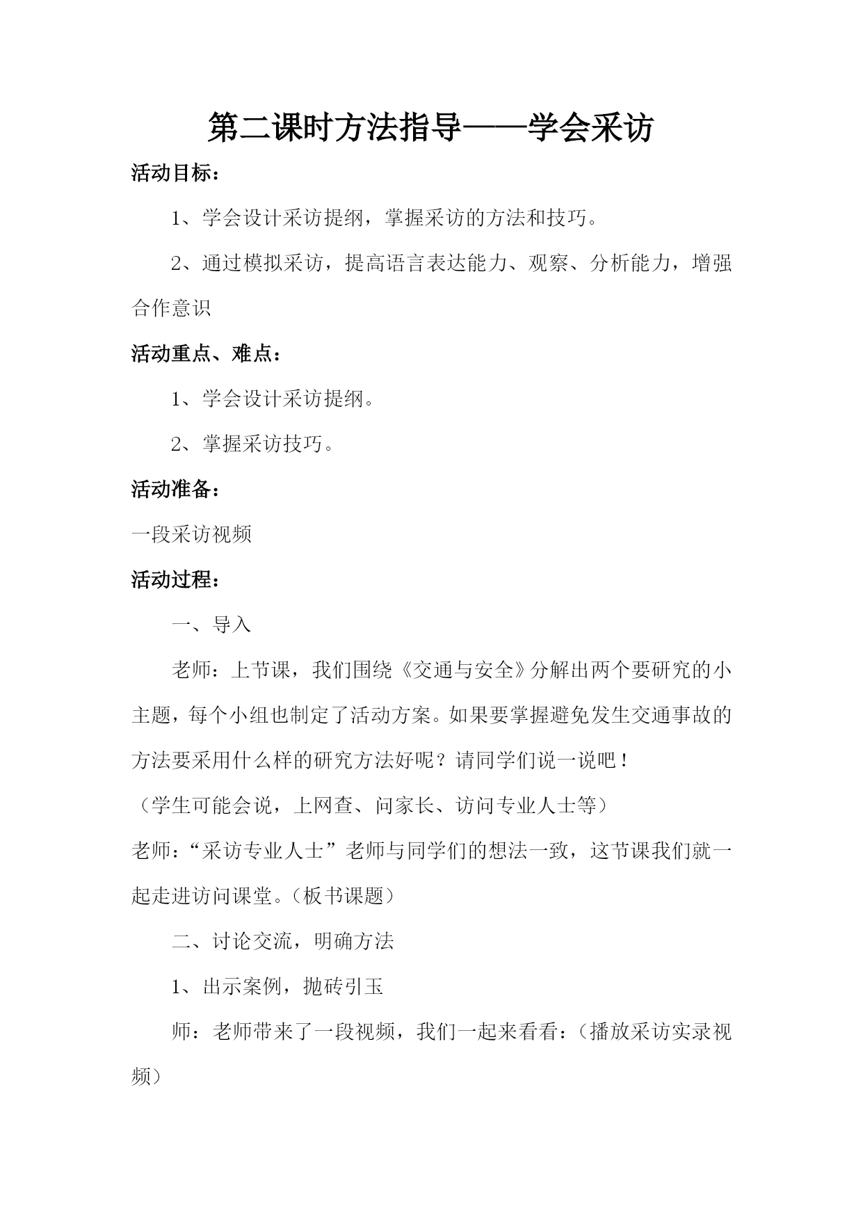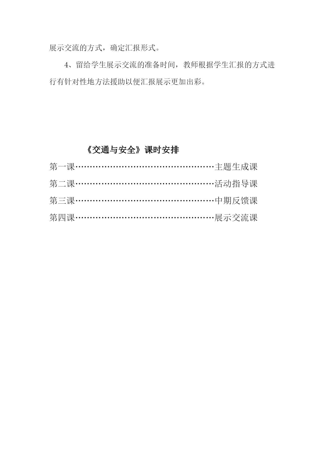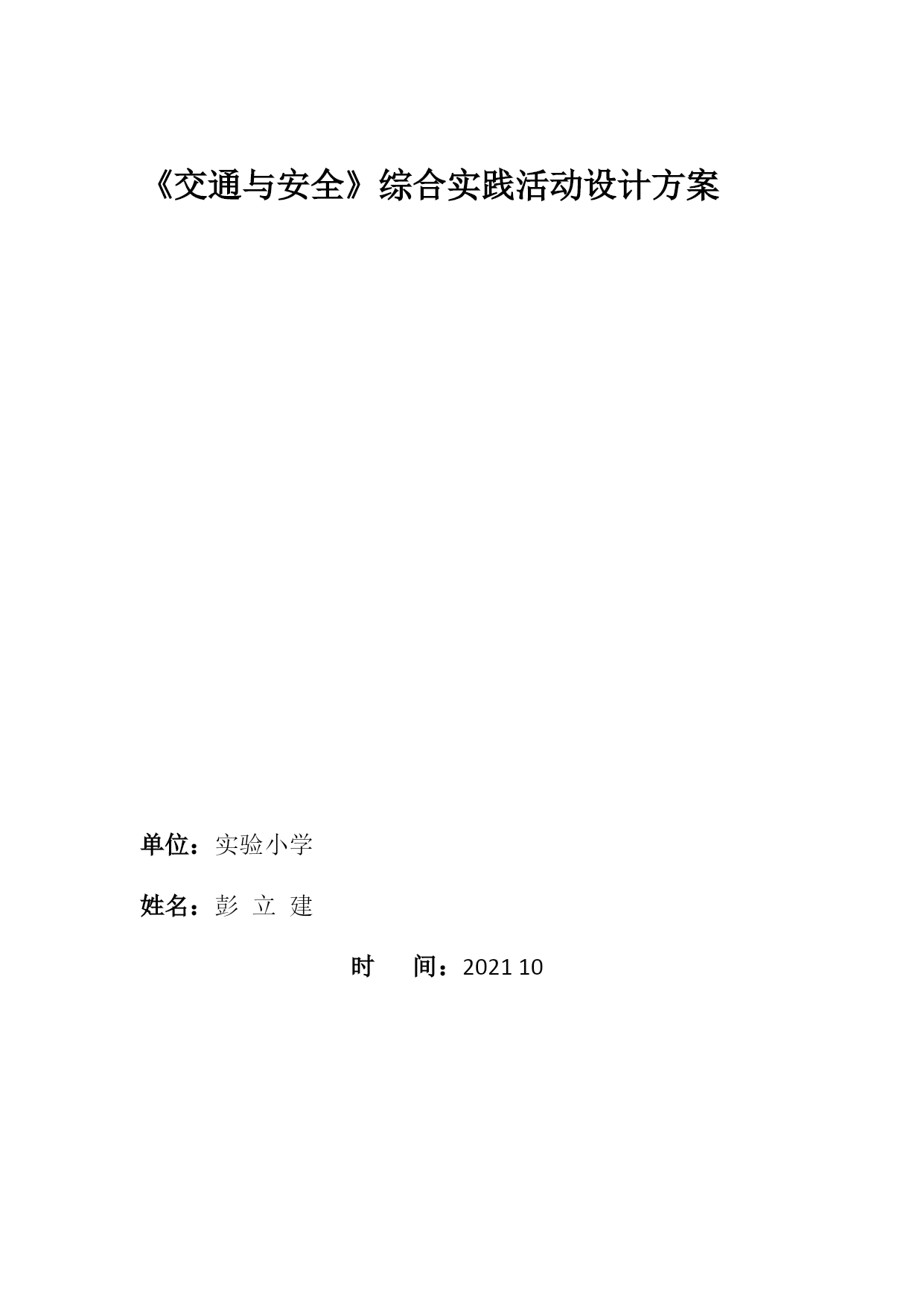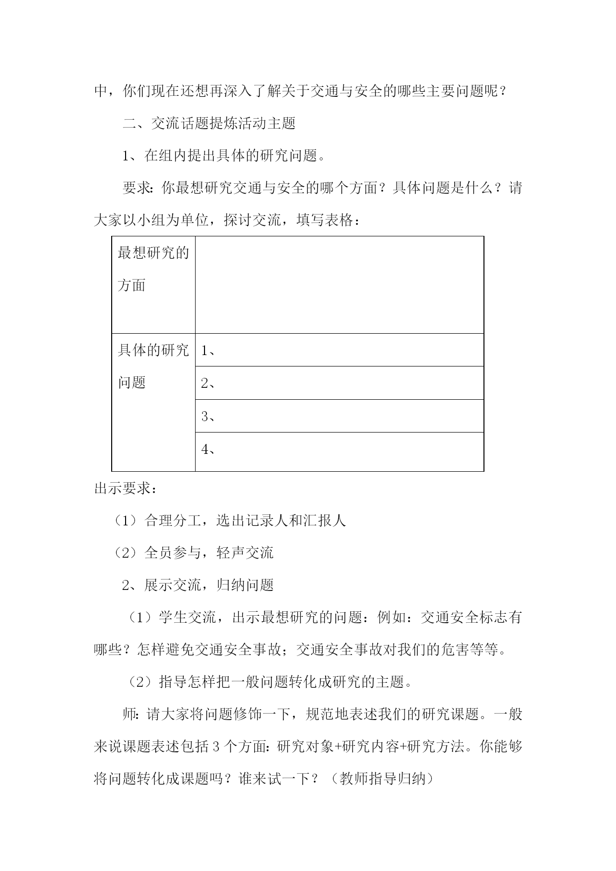 综合实践《交通与安全》活动方案设计最新文档(可以直接使用,可编辑最新文档,欢迎下载)《交通与安全》综合实践活动设计方案单位:实验小学姓名:彭立建时间:202110《交通与安全》综合实践活动设计方案适用年级:三年级活动背景:“交通与安全”是综合实践活动资源包三年级下册的活动主题。“交通与安全”综合实践课是针对小学生的特点,通过多种渠道开展对小学生的交通安全知识的教育,加强学生良好的交通行为习惯的养成教育,使学生懂得自觉遵守交通法规,增强交通法律意识和交通安全意识,避免交通事故的发生,促进未成年人健康成长。活动目标:1、加强学生的良好的交通行为习惯的养成教育。2、学生懂自觉遵守交通法规。3、加强交通法律意识和交通安全意识。4、避免交通事故的发生,促进未成年人健康成长。活动重难点:“增强交通安全意识,提高自我保护能力”。活动过程:第一阶段:活动主题确定阶段目标:会提出关于交通与安全能够对问题进行筛选、归纳成研究的子课题。指导要点:在安全教育活动中,我将采取多种形式进行广泛宣传,大力营造“增强小学生交通安全”活动舆论。1、每学期举办一次交通与安全的讲座。2、每月举行一次以安全教育为内容的国旗下的讲话。3、每周开展以安全教育为主题的班会。4、每周举办以交通与安全为主题的黑板报。5、每天听交通与安全的广播。第二阶段:活动实施阶段目标:通过多种渠道开展对小学生的交通安全,知识的教育,加强学生的良好的交通行为习惯的养成教育,使学生懂自觉遵守交通法规,加强交通法律意识和交通安全意识,避免交通事故的发生。促进未成年人健康成长。指导要点:1、指导学生根据研究问题选择合适的研究方式方法。2、学习运用一些研究方法。如:问卷调查法,分析人们对“交通与安全的了解情况;,如访问法,到交警大队找专业人士学习有关知识。第三阶段:总结、交流阶段指导要点:1、指导学生整理活动资料的方法(按文字、图片等分类整理)。2、学习撰写研究报告的一般格式,根据本次的活动情况,写出简单的研究报告;3、指导学生根据活动内容的特点及本组成员的特长选择恰当的展示交流的方式,确定汇报形式。4、留给学生展示交流的准备时间,教师根据学生汇报的方式进行有针对性地方法援助以便汇报展示更加出彩。《交通与安全》课时安排第一课…………………………………………主题生成课第二课…………………………………………活动指导课第三课…………………………………………中期反馈课第四课…………………………………………展示交流课第一课时主题生成课活动目标:1、会围绕交通与安全提出1-2个有意义的问题并能将问题归纳成有研究意义的课题。2、通过制定小组活动方案明确小组活动任务和活动步骤。3、通过本节学习交流活动形问题意识、合作探究意识。活动重、难点:学会分解、归纳、提炼有意义的小组活动主题。活动准备:教师:有关交通与安全的课件、活动方案空白表。学生:课前搜集有关交通与安全资料。活动过程:一、创设情境引出主题1、播放视频(交通安全宣传片)。师:同学们看完这段视频你有什么想说的吗?(留给学生足够的交流空间)【设计目的】这样开放的问题可以让学生在已有生活的经验基础之上,有言有语、可言可语;开放的问题导入符合三年级学生的年龄特点,能激发学生的参与热情和交流欲望,进而启发学生对交通与安全的思考。2、师:听过刚才同学们的交流我发现你们课前查阅了很多关于交通与安全的知识,你们谈的很好。在同学们刚才谈到的这些知识当中,你们现在还想再深入了解关于交通与安全的哪些主要问题呢?二、交流话题提炼活动主题1、在组内提出具体的研究问题。要求:你最想研究交通与安全的哪个方面?具体问题是什么?请大家以小组为单位,探讨交流,填写表格:最想研究的方面具体的研究问题1、2、3、4、出示要求:(1)合理分工,选出记录人和汇报人(2)全员参与,轻声交流2、展示交流,归纳问题(1)学生交流,出示最想研究的问题:例如:交通安全标志有哪些?怎样避免交通安全事故;交通安全事故对我们的危害等等。(2)指导怎样把一般问题转化成研究的主题。师:请大家将问题修饰一下,规范地表述我们的研究课题。一般来说课题表述包括3个方面:研究对象+研究内容+研究方法。你能够将问题转化成课题吗?谁来试一下?(教师指导归纳)板书:1、交通安全的标志2、交通安全事故的危害3、避免交通安全事故的方法3、确定活动主题师:通过讨论交流,发现大家关注最多的就是怎样注意交通与安全,所以,我们的活动主题就确定为“交通与安全”。三、挖掘价值,确定小组研究的小课题1、师:刚才同学们提出了很多关于交通与安全的问