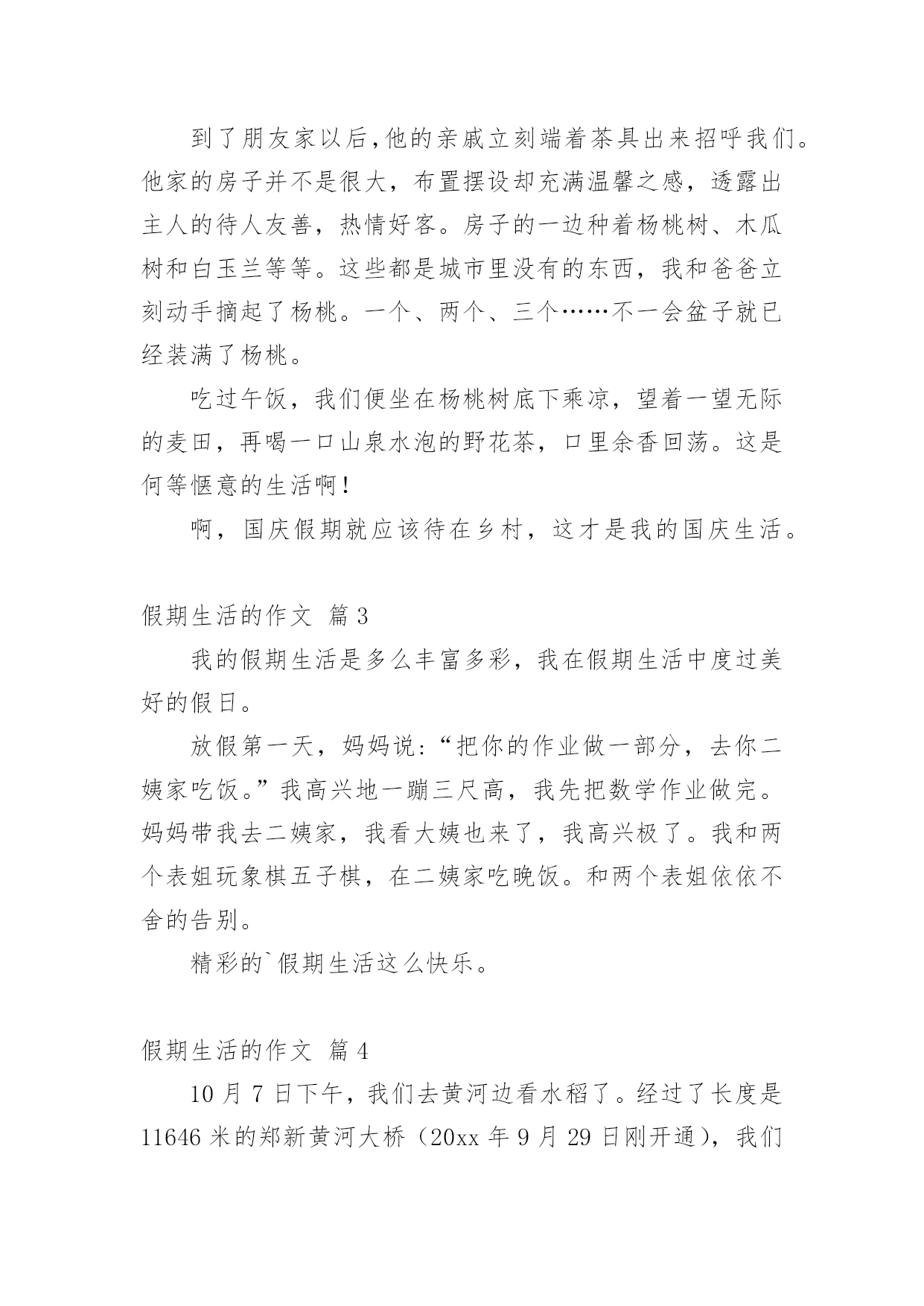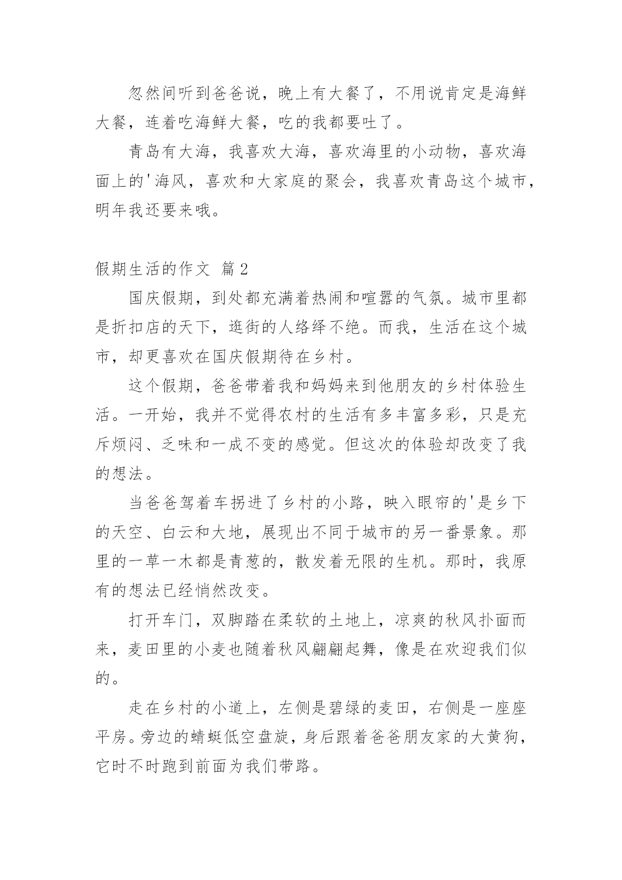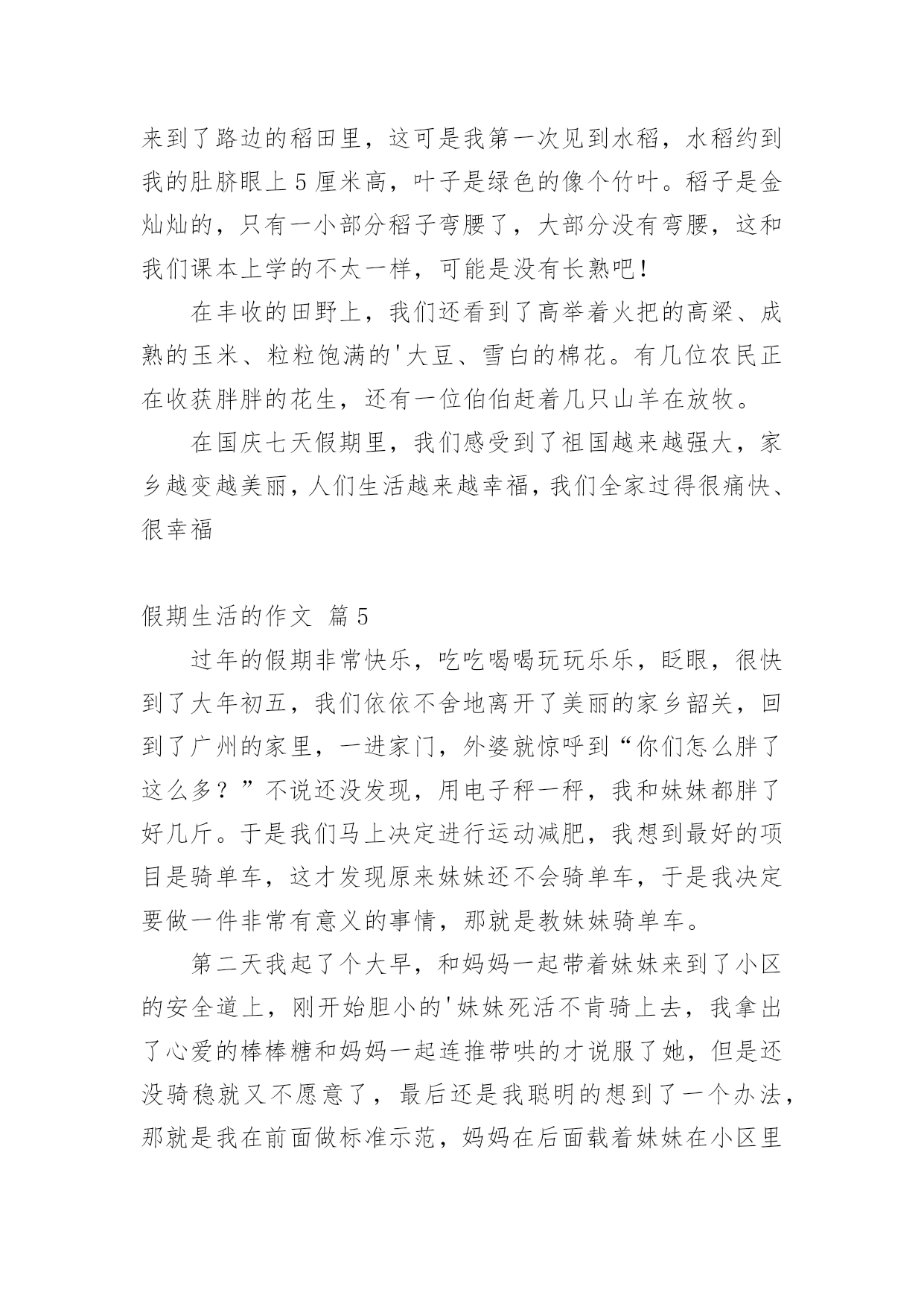 假期生活的作文假期生活的作文5篇【优选】在平日的学习、工作和生活里,许多人都有过写作文的经历,对作文都不陌生吧,作文是经过人的思想考虑和语言组织,通过文字来表达一个主题意义的记叙方法。还是对作文一筹莫展吗?以下是小编整理的假期生活的作文6篇,希望能够帮助到大家。假期生活的作文篇1我的假期生活很开心!因为爸爸带我去了青岛,这是每年的家庭聚会,我们会跟很多叔叔阿姨姐姐弟弟一起到青岛过暑假。到的第一天,休息一晚上,我和三个姐姐在刘峰叔叔家开的民宿大厅玩耍;还有小狗嘟嘟和一只大狗,我们一起遛狗、一起喂小狗喝水、一起回家,这时大狗咬了我一下,虽然不疼,但我还是吓得赶快跑向爸爸,爸爸检查后,说:“没咬烂,没事了”,即使是这样,我还是心里挺害怕,以后跟小狗玩,必须得小心了。过了一会,我们一起去海边捡贝壳,我捡到好多好多还捡到了一只螃蟹,那只螃蟹是比小螃蟹要大一些的,那只螃蟹还夹了我一下呢。到了晚上,我和喜乐弟弟到充气城堡上玩耍,我们摔了好多次,玩的不亦乐乎。忽然间听到爸爸说,晚上有大餐了,不用说肯定是海鲜大餐,连着吃海鲜大餐,吃的我都要吐了。青岛有大海,我喜欢大海,喜欢海里的小动物,喜欢海面上的'海风,喜欢和大家庭的聚会,我喜欢青岛这个城市,明年我还要来哦。假期生活的作文篇2国庆假期,到处都充满着热闹和喧嚣的气氛。城市里都是折扣店的天下,逛街的人络绎不绝。而我,生活在这个城市,却更喜欢在国庆假期待在乡村。这个假期,爸爸带着我和妈妈来到他朋友的乡村体验生活。一开始,我并不觉得农村的生活有多丰富多彩,只是充斥烦闷、乏味和一成不变的感觉。但这次的体验却改变了我的想法。当爸爸驾着车拐进了乡村的小路,映入眼帘的'是乡下的天空、白云和大地,展现出不同于城市的另一番景象。那里的一草一木都是青葱的,散发着无限的生机。那时,我原有的想法已经悄然改变。打开车门,双脚踏在柔软的土地上,凉爽的秋风扑面而来,麦田里的小麦也随着秋风翩翩起舞,像是在欢迎我们似的。走在乡村的小道上,左侧是碧绿的麦田,右侧是一座座平房。旁边的蜻蜓低空盘旋,身后跟着爸爸朋友家的大黄狗,它时不时跑到前面为我们带路。到了朋友家以后,他的亲戚立刻端着茶具出来招呼我们。他家的房子并不是很大,布置摆设却充满温馨之感,透露出主人的待人友善,热情好客。房子的一边种着杨桃树、木瓜树和白玉兰等等。这些都是城市里没有的东西,我和爸爸立刻动手摘起了杨桃。一个、两个、三个……不一会盆子就已经装满了杨桃。吃过午饭,我们便坐在杨桃树底下乘凉,望着一望无际的麦田,再喝一口山泉水泡的野花茶,口里余香回荡。这是何等惬意的生活啊!啊,国庆假期就应该待在乡村,这才是我的国庆生活。假期生活的作文篇3我的假期生活是多么丰富多彩,我在假期生活中度过美好的假日。放假第一天,妈妈说:“把你的作业做一部分,去你二姨家吃饭。”我高兴地一蹦三尺高,我先把数学作业做完。妈妈带我去二姨家,我看大姨也来了,我高兴极了。我和两个表姐玩象棋五子棋,在二姨家吃晚饭。和两个表姐依依不舍的告别。精彩的`假期生活这么快乐。假期生活的作文篇410月7日下午,我们去黄河边看水稻了。经过了长度是11646米的郑新黄河大桥(20xx年9月29日刚开通),我们来到了路边的稻田里,这可是我第一次见到水稻,水稻约到我的肚脐眼上5厘米高,叶子是绿色的像个竹叶。稻子是金灿灿的,只有一小部分稻子弯腰了,大部分没有弯腰,这和我们课本上学的不太一样,可能是没有长熟吧!在丰收的田野上,我们还看到了高举着火把的高梁、成熟的玉米、粒粒饱满的'大豆、雪白的棉花。有几位农民正在收获胖胖的花生,还有一位伯伯赶着几只山羊在放牧。在国庆七天假期里,我们感受到了祖国越来越强大,家乡越变越美丽,人们生活越来越幸福,我们全家过得很痛快、很幸福假期生活的作文篇5过年的假期非常快乐,吃吃喝喝玩玩乐乐,眨眼,很快到了大年初五,我们依依不舍地离开了美丽的家乡韶关,回到了广州的家里,一进家门,外婆就惊呼到“你们怎么胖了这么多?”不说还没发现,用电子秤一秤,我和妹妹都胖了好几斤。于是我们马上决定进行运动减肥,我想到最好的项目是骑单车,这才发现原来妹妹还不会骑单车,于是我决定要做一件非常有意义的事情,那就是教妹妹骑单车。第二天我起了个大早,和妈妈一起带着妹妹来到了小区的安全道上,刚开始胆小的'妹妹死活不肯骑上去,我拿出了心爱的棒棒糖和妈妈一起连推带哄的才说服了她,但是还没骑稳就又不愿意了,最后还是我聪明的想到了一个办法,那就是我在前面做标准示范,妈妈在后面载着妹妹在小区里绕了一圈,期间,我还洋洋得意的做了几个花样动作把妹妹逗得呵呵大笑,这回总算把好动贪玩的妹妹的激情激发出来了,她迫不及待的骑上了自己的小单车。由妈妈在后面扶着,似乎越骑越好,也许妈妈看到这样放松了警惕,得意的妹妹居然学着我摆动车头想学我搞花样,结果连人