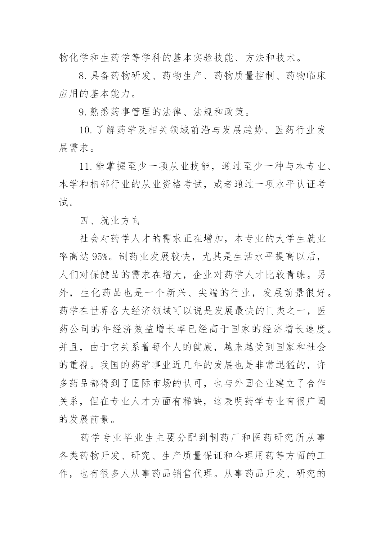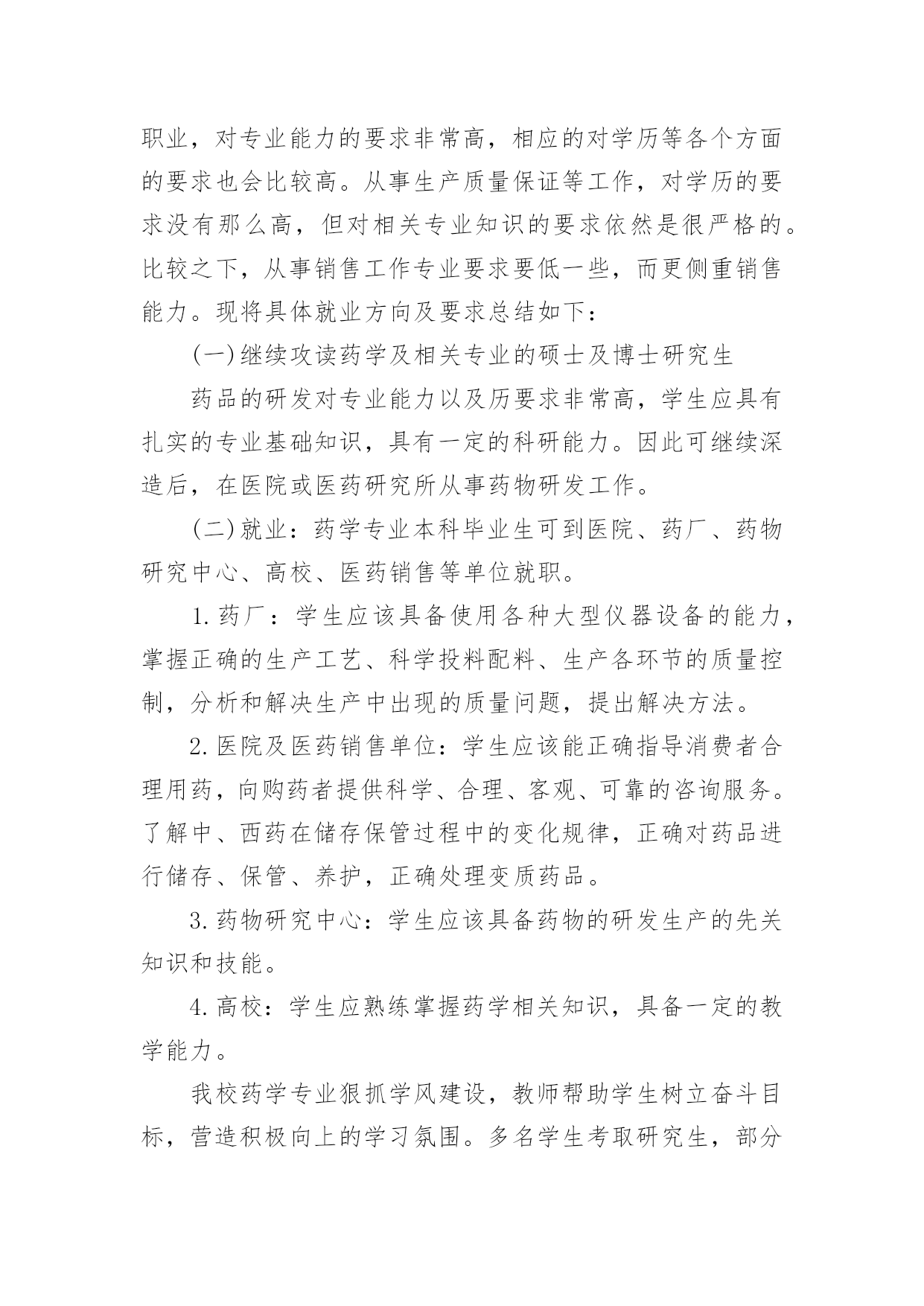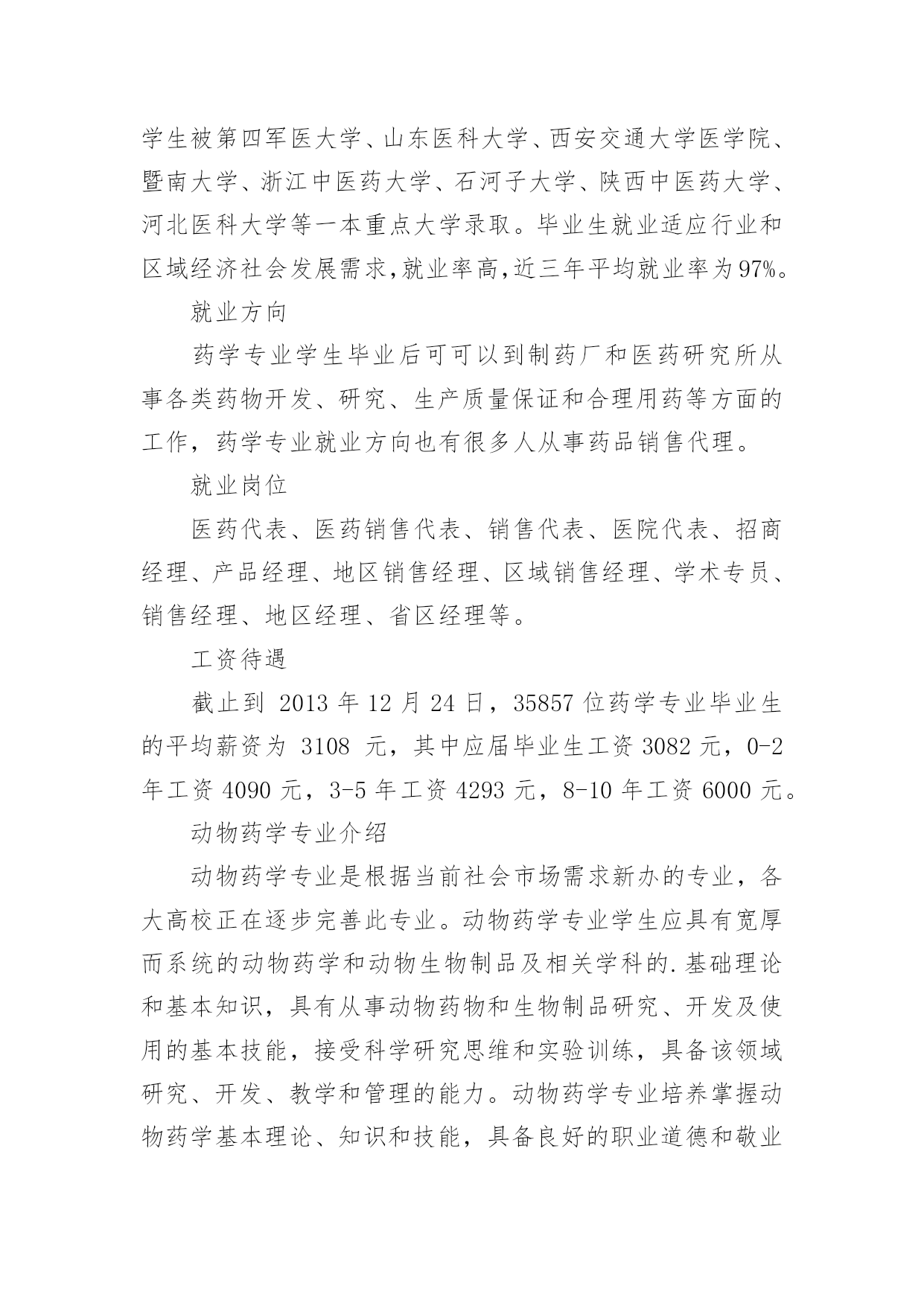 高考专业解读:药学专业2023高考专业解读:药学专业药学专业是很多考生报考的热门专业,为帮助考生们了解更多相关信息,本文是百分网小编搜索整理的关于高考专业解读:药学专业,供参考复习,希望对大家有所帮助!一、药学专业学什么?掌握药学、化学、生物学、基础医学等相关基础理论知识和一定的实验技能,具有药物研发、药物质量控制与临床应用方面的基本能力和良好的药学职业道德素养,熟悉药事管理管理的法律法规和政策,能在药学领域从事药物研发、药品生产、药物质量控制、药物临床应用、药品市场营销和监督管理等工作。二、本专业的培养方式是什么?根据“就业导向”、“应用为本”、“能力为重”的办学理念,以国家执业药师资格准入标准为指导,创新人才培养模式。(一)培养模式1.校企联合共同培养。通过实施学校与医院药学部门和医药生产经营企业的校企合作、产教融合和工学结合,开展合作办与合作育人。2.探索新的人才培养模式。3.分类指导、因材施教。按照学生的不同兴趣、不同层次设置不同方向,根据不同的方向安排课程和实习内容。(二)培养途径本专业通过理论和实践相结合,专业与职业相结合的途径,强化对学生的创新能力和实践能力的训练。1.理论与实践相结合。把一线岗位的先进技术、技能和实际案例融入教材,采用启发式、讨论式等先进教学方法进行教学,积极探索新的人才培养途径。通过设置独立和非独立的实践课程以及集中实践教学环节加强对学生实践能力进行训练。2.课内与课外相结合。利用第二课堂的平台,组织和指导学生参加校内外学科技能竞赛和大学创新创业项目,强化对学生的创新能力和实践能力的训练和综合素质的提高。通过大学生创新创业项目和学科竞赛,取得医药科技成果。3.专业与职业相结合。有重点地安排相应的课程,引导和训练学生参加教师能力认证培训,获得本专业的职业资格证书,提升学生的职业能力。(三)考核方式1.过程性考核和终结性考核相结合:注重学习过程,从考勤、课堂表现、作业完成等方面考查学生的平时学习情况;期末考试综合考查学生学习效果。2.知识考核和能力考核相结合。形式包括考试、考查和毕业论文等,重点考查学生的应用能力、实践能力和创新能力。3.课内成绩与课外成绩相结合。根据学生学科竞赛成绩、职业资格和水平考试成绩给与奖励学分。三、学生在校的基本要求是什么?根据本专业人才培养目标,结合药学相关行业标准,本专业学生毕业时应达到以下标准:1.热爱社会主义祖国,拥护中国共产党的领导,具有正确的世界观、人生观和价值观,具有良好的思想品德、社会公德和职业道德,遵纪守法、诚实守信,具有社会责任意识和开拓创新精神。2.具有良好的体育锻炼和卫生习惯,身心健康,具有较强的语言表达能力、人际沟通能力和社会适应能力。3.能掌握一定的人文社会科学和自然科学基本理论知识,具有自主获取知识的能力,具备一定的创新意识和初步的科研能力,以及综合运用理论知识解决实际问题的初步能力。4.能较熟练地应用一门外语和计算机信息技术,熟练掌握本专业文献检索、资料查询和综述的基本方法。5.能较熟练地阅读本专业的外文资料,具有基本的英语听、说、读、写、译能力,达到英语四级水平(校内标准)。6.掌握药学、化学、生物学、基础医学等学科的基本理论、基本知识、基本基能;掌握与药学学科相关的无机化学、有机化学、分析化学、物理化学的基本知识、基本原理,以及人体解剖生理学、生物化学、微生物学、免疫学基础等相关的基础医学知识和临床医学知识。7.掌握药物化学、药剂学、药理学、药物分析、天然药物化学和生药学等学科的基本实验技能、方法和技术。8.具备药物研发、药物生产、药物质量控制、药物临床应用的基本能力。9.熟悉药事管理的法律、法规和政策。10.了解药学及相关领域前沿与发展趋势、医药行业发展需求。11.能掌握至少一项从业技能,通过至少一种与本专业、本学和相邻行业的从业资格考试,或者通过一项水平认证考试。四、就业方向社会对药学人才的需求正在增加,本专业的大学生就业率高达95%。制药业发展较快,尤其是生活水平提高以后,人们对保健品的需求在增大,企业对药学人才比较青睐。另外,生化药品也是一个新兴、尖端的行业,发展前景很好。药学在世界各大经济领域可以说是发展最快的门类之一,医药公司的年经济效益增长率已经高于国家的经济增长速度。并且,由于它关系着每个人的健康,越来越受到国家和社会的重视。我国的药学事业近几年的发展也是非常迅猛的,许多药品都得到了国际市场的认可,也与外国企业建立了合作关系,但在专业人才方面有稀缺,这表明药学专业有很广阔的发展前景。药学专业毕业生主要分配到制药厂和医药研究所从事各类药物开发、研究、生产质量保证和合理用药等方面的工作,也有很多人从事药品销售代理。从事药品开发、研究的职业,对专业能力的要求非常高,相应的对学历等各个方面的要求也会比较高。从事生产质量保证等