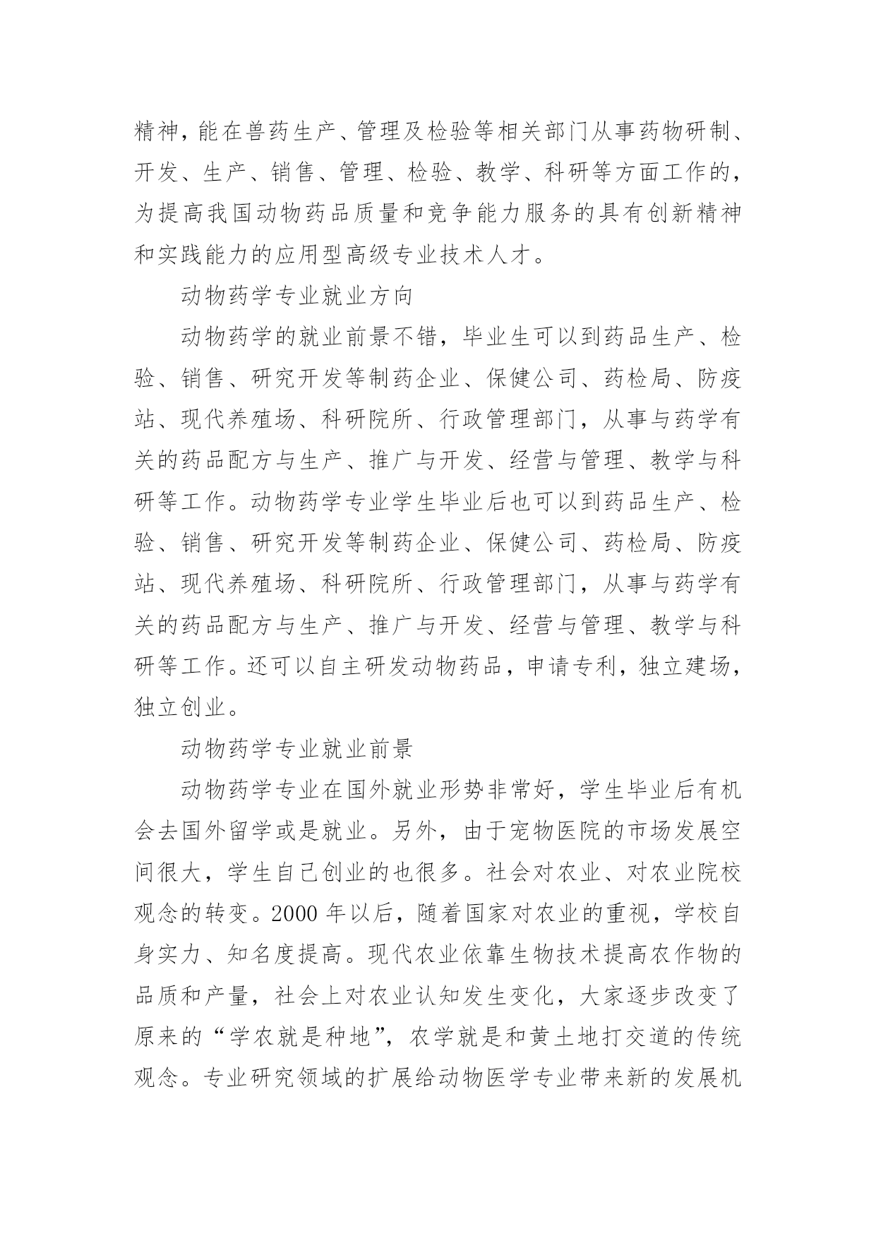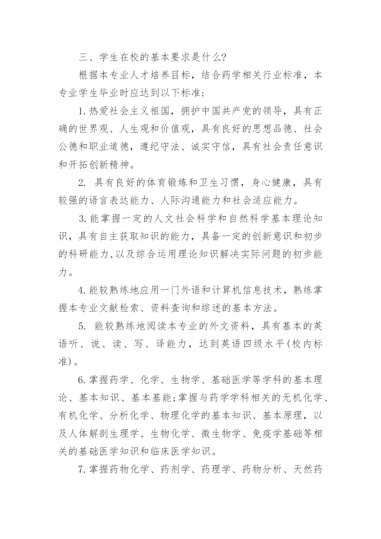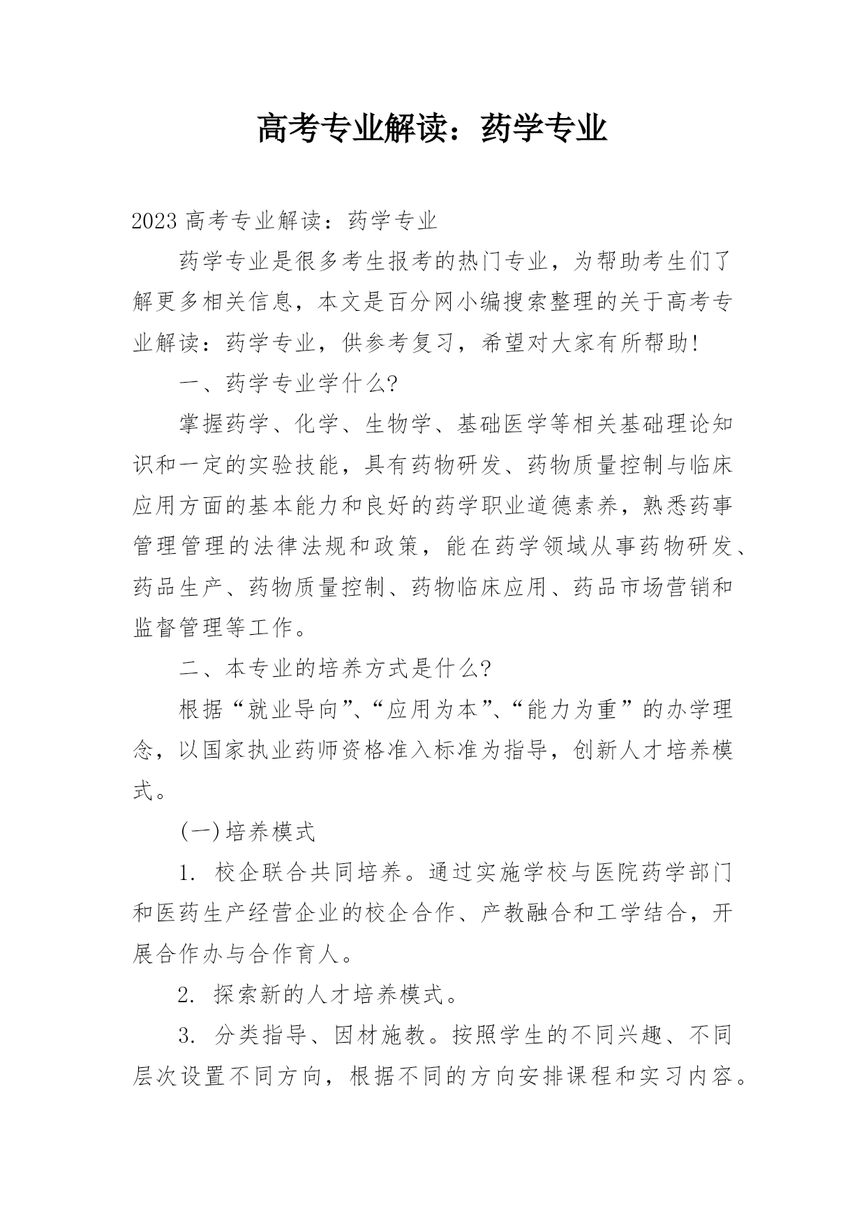 高考专业解读:药学专业2023高考专业解读:药学专业药学专业是很多考生报考的热门专业,为帮助考生们了解更多相关信息,本文是百分网小编搜索整理的关于高考专业解读:药学专业,供参考复习,希望对大家有所帮助!一、药学专业学什么?掌握药学、化学、生物学、基础医学等相关基础理论知识和一定的实验技能,具有药物研发、药物质量控制与临床应用方面的基本能力和良好的药学职业道德素养,熟悉药事管理管理的法律法规和政策,能在药学领域从事药物研发、药品生产、药物质量控制、药物临床应用、药品市场营销和监督管理等工作。二、本专业的培养方式是什么?根据“就业导向”、“应用为本”、“能力为重”的办学理念,以国家执业药师资格准入标准为指导,创新人才培养模式。(一)培养模式1.校企联合共同培养。通过实施学校与医院药学部门和医药生产经营企业的校企合作、产教融合和工学结合,开展合作办与合作育人。2.探索新的人才培养模式。3.分类指导、因材施教。按照学生的不同兴趣、不同层次设置不同方向,根据不同的方向安排课程和实习内容。(二)培养途径本专业通过理论和实践相结合,专业与职业相结合的途径,强化对学生的创新能力和实践能力的训练。1.理论与实践相结合。把一线岗位的先进技术、技能和实际案例融入教材,采用启发式、讨论式等先进教学方法进行教学,积极探索新的人才培养途径。通过设置独立和非独立的实践课程以及集中实践教学环节加强对学生实践能力进行训练。2.课内与课外相结合。利用第二课堂的平台,组织和指导学生参加校内外学科技能竞赛和大学创新创业项目,强化对学生的创新能力和实践能力的训练和综合素质的提高。通过大学生创新创业项目和学科竞赛,取得医药科技成果。3.专业与职业相结合。有重点地安排相应的课程,引导和训练学生参加教师能力认证培训,获得本专业的职业资格证书,提升学生的职业能力。(三)考核方式1.过程性考核和终结性考核相结合:注重学习过程,从考勤、课堂表现、作业完成等方面考查学生的平时学习情况;期末考试综合考查学生学习效果。2.知识考核和能力考核相结合。形式包括考试、考查和毕业论文等,重点考查学生的应用能力、实践能力和创新能力。3.课内成绩与课外成绩相结合。根据学生学科竞赛成绩、职业资格和水平考试成绩给与奖励学分。三、学生在校的基本要求是什么?根据本专业人才培养目标,结合药学相关行业标准,本专业学生毕业时应达到以下标准:1.热爱社会主义祖国,拥护中国共产党的领导,具有正确的世界观、人生观和价值观,具有良好的思想品德、社会公德和职业道德,遵纪守法、诚实守信,具有社会责任意识和开拓创新精神。2.具有良好的体育锻炼和卫生习惯,身心健康,具有较强的语言表达能力、人际沟通能力和社会适应能力。3.能掌握一定的人文社会科学和自然科学基本理论知识,具有自主获取知识的能力,具备一定的创新意识和初步的科研能力,以及综合运用理论知识解决实际问题的初步能力。4.能较熟练地应用一门外语和计算机信息技术,熟练掌握本专业文献检索、资料查询和综述的基本方法。5.能较熟练地阅读本专业的外文资料,具有基本的英语听、说、读、写、译能力,达到英语四级水平(校内标准)。6.掌握药学、化学、生物学、基础医学等学科的基本理论、基本知识、基本基能;掌握与药学学科相关的无机化学、有机化学、分析化学、物理化学的基本知识、基本原理,以及人体解剖生理学、生物化学、微生物学、免疫学基础等相关的基础医学知识和临床医学知识。7.掌握药物化学、药剂学、药理学、药物分析、天然药物化学和生药学等学科的基本实验技能、方法和技术。8.具备药物研发、药物生产、药物质量控制、药物临床应用的基本能力。9.熟悉药事管理的法律、法规和政策。10.了解药学及相关领域前沿与发展趋势、医药行业发展需求。11.能掌握至少一项从业技能,通过至少一种与本专业、本学和相邻行业的从业资格考试,或者通过一项水平认证考试。四、就业方向社会对药学人才的需求正在增加,本专业的大学生就业率高达95%。制药业发展较快,尤其是生活水平提高以后,人们对保健品的需求在增大,企业对药学人才比较青睐。另外,生化药品也是一个新兴、尖端的行业,发展前景很好。药学在世界各大经济领域可以说是发展最快的门类之一,医药公司的年经济效益增长率已经高于国家的经济增长速度。并且,由于它关系着每个人的健康,越来越受到国家和社会的重视。我国的药学事业近几年的发展也是非常迅猛的,许多药品都得到了国际市场的认可,也与外国企业建立了合作关系,但在专业人才方面有稀缺,这表明药学专业有很广阔的发展前景。药学专业毕业生主要分配到制药厂和医药研究所从事各类药物开发、研究、生产质量保证和合理用药等方面的工作,也有很多人从事药品销售代理。从事药品开发、研究的职业,对专业能力的要求非常高,相应的对学历等各个方面的要求也会比较高。从事生产质量保证等