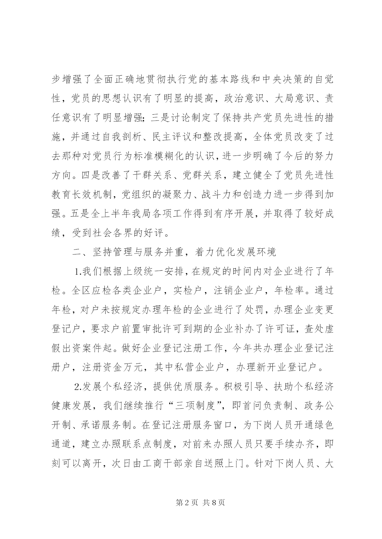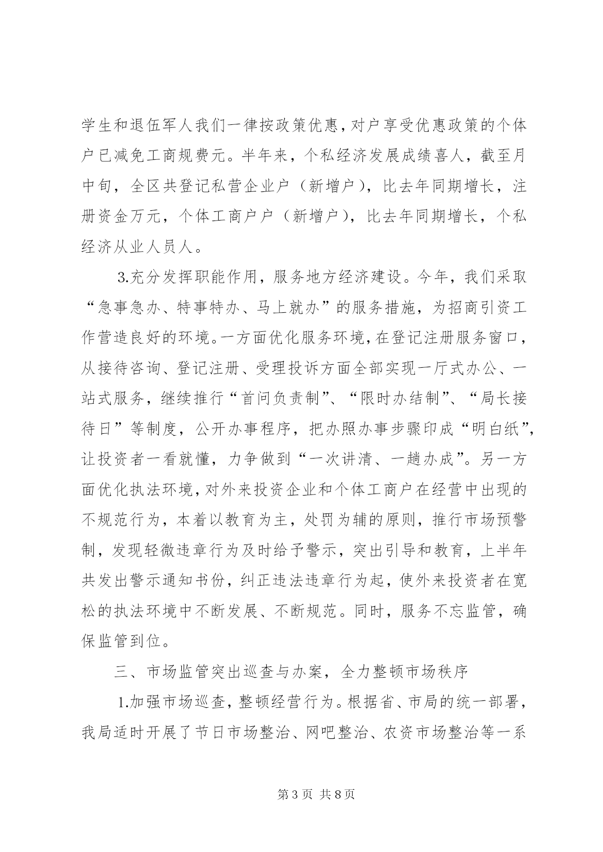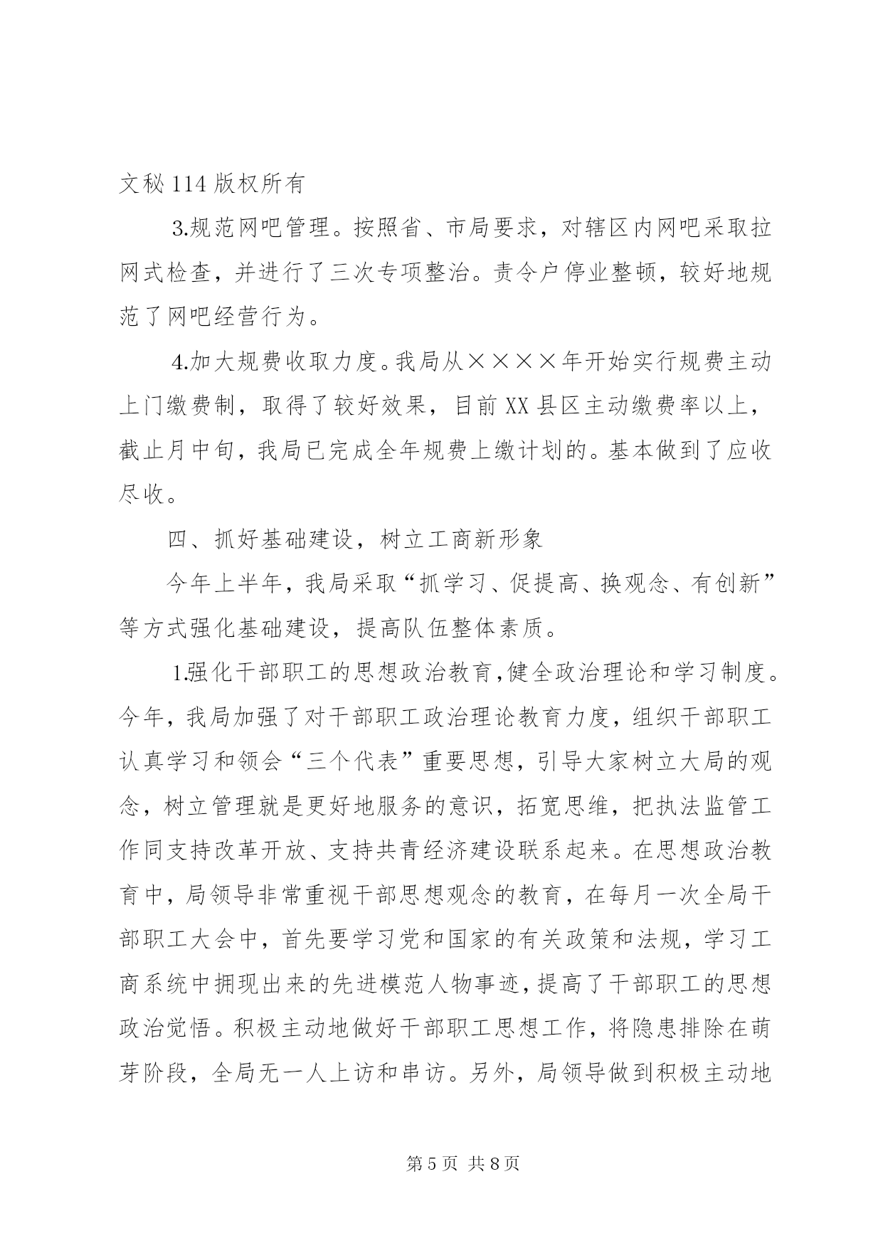 第PAGE\*Arabic\*MERGEFORMAT8页共NUMPAGES\*MERGEFORMAT8页工商局上半年总结工商局上半年总结今年,我局在市工商局和开发区党委、管委会的领导下,坚持以邓小平理论和“三个代表”的重要思想为指导,紧紧围绕地方经济发展这一中心,结合保持共产党员先进性教育活动,全局上下团结一心,稳中求进,进中求好,好中求快,不断创新工作思路,巩固、完善工作机制,切实改进工作作风,努力提高工作绩效,为开发区创造公平竞争的市场环境和安全健康的消费环境,做出了积极的贡献,取得了较好的成文秘114版权所有绩。现就主要工作情况总结如下:一、认真开展保持共产党员先进性教育活动按照开发区党委的统一部署和开发区党委先进性教育活动领导小组办公室的安排,我局的先进性教育活动,从×月×日开始至月中旬基本结束。由于局党组高度重视,精心组织,合理安排,广大党员自觉参与,态度热忱,先进性教育活动各项工作扎实推进,取得了明显的成效。学习培训、分析评议、整改提高三个阶段工作均达到了中央、省委、市委和开发区党委的要求,取得实实在在的效果,达到了目标要求。一是党员素质有了明显提高。通过这次先进性教育活动,广大党员的党员意识和纪律观念得到了明显的增强,学习理论的自觉性也有了明显的提高;二是全体党员普遍受到了一次较为深刻的马克思主义理论教育,进一步增强了全面正确地贯彻执行党的基本路线和中央决策的自觉性,党员的思想认识有了明显的提高,政治意识、大局意识、责任意识有了明显增强;三是讨论制定了保持共产党员先进性的措施,并通过自我剖析、民主评议和整改提高,全体党员改变了过去那种对党员行为标准模糊化的认识,进一步明确了今后的努力方向。四是改善了干群关系、党群关系,建立健全了党员先进性教育长效机制,党组织的凝聚力、战斗力和创造力进一步得到加强。五是全上半年我局各项工作得到有序开展,并取得了较好成绩,受到社会各界的好评。二、坚持管理与服务并重,着力优化发展环境⒈我们根据上级统一安排,在规定的时间内对企业进行了年检。全区应检各类企业户,实检户,注销企业户,年检率。通过年检,对户未按规定办理年检的企业进行了处罚,办理企业变更登记户,要求户前置审批许可到期的企业补办了许可证,查处虚假出资案件起。做好企业登记注册工作,今年共办理企业登记注册户,注册资金万元,其中私营企业户,办理新开业登记户。⒉发展个私经济,提供优质服务。积极引导、扶助个私经济健康发展,我们继续推行“三项制度”,即首问负责制、政务公开制、承诺服务制。在登记注册服务窗口,为下岗人员开通绿色通道,建立办照联系点制度,对前来办照人员只要手续办齐,即刻可以离开,次日由工商干部亲自送照上门。针对下岗人员、大学生和退伍军人我们一律按政策优惠,对户享受优惠政策的个体户已减免工商规费元。半年来,个私经济发展成绩喜人,截至月中旬,全区共登记私营企业户(新增户),比去年同期增长,注册资金万元,个体工商户户(新增户),比去年同期增长,个私经济从业人员人。⒊充分发挥职能作用,服务地方经济建设。今年,我们采取“急事急办、特事特办、马上就办”的服务措施,为招商引资工作营造良好的环境。一方面优化服务环境,在登记注册服务窗口,从接待咨询、登记注册、受理投诉方面全部实现一厅式办公、一站式服务,继续推行“首问负责制”、“限时办结制”、“局长接待日”等制度,公开办事程序,把办照办事步骤印成“明白纸”,让投资者一看就懂,力争做到“一次讲清、一趟办成”。另一方面优化执法环境,对外来投资企业和个体工商户在经营中出现的不规范行为,本着以教育为主,处罚为辅的原则,推行市场预警制,发现轻微违章行为及时给予警示,突出引导和教育,上半年共发出警示通知书份,纠正违法违章行为起,使外来投资者在宽松的执法环境中不断发展、不断规范。同时,服务不忘监管,确保监管到位。三、市场监管突出巡查与办案,全力整顿市场秩序⒈加强市场巡查,整顿经营行为。根据省、市局的统一部署,我局适时开展了节日市场整治、网吧整治、农资市场整治等一系列市场专项整治活动,规范市场经济秩序。开展了节日市场打假保健康活动,先后出动执法人员人次,对全区个市场及近千户个体户特别是学校周边和旅游景点经营主体进行了三次全面检查,捣毁制假窝点处,查缴不合格食品、过期饮料多公斤,三无产品多袋,查处注水牛肉公斤,查缴硫磺熏制白木耳公斤,取缔处松香拨鸭毛经营点,查处一起制售假冒伪造厂名的板鸭案、一起销售过期变质水果案、一起销售假冒“小糊涂仙”酒案。此外,我局以实际行动开展“为农护农”,组织全局党员捐献一天工资购买化肥送到贫困农民手中,帮助困难农民度过春耕播种难关。开展跟踪挂点护农行动,我局一方面组织人员对全区户农资经营点进行跟踪检查,查处一起销售不符合国家标准化肥案,一起非法经营农资案。另一方面