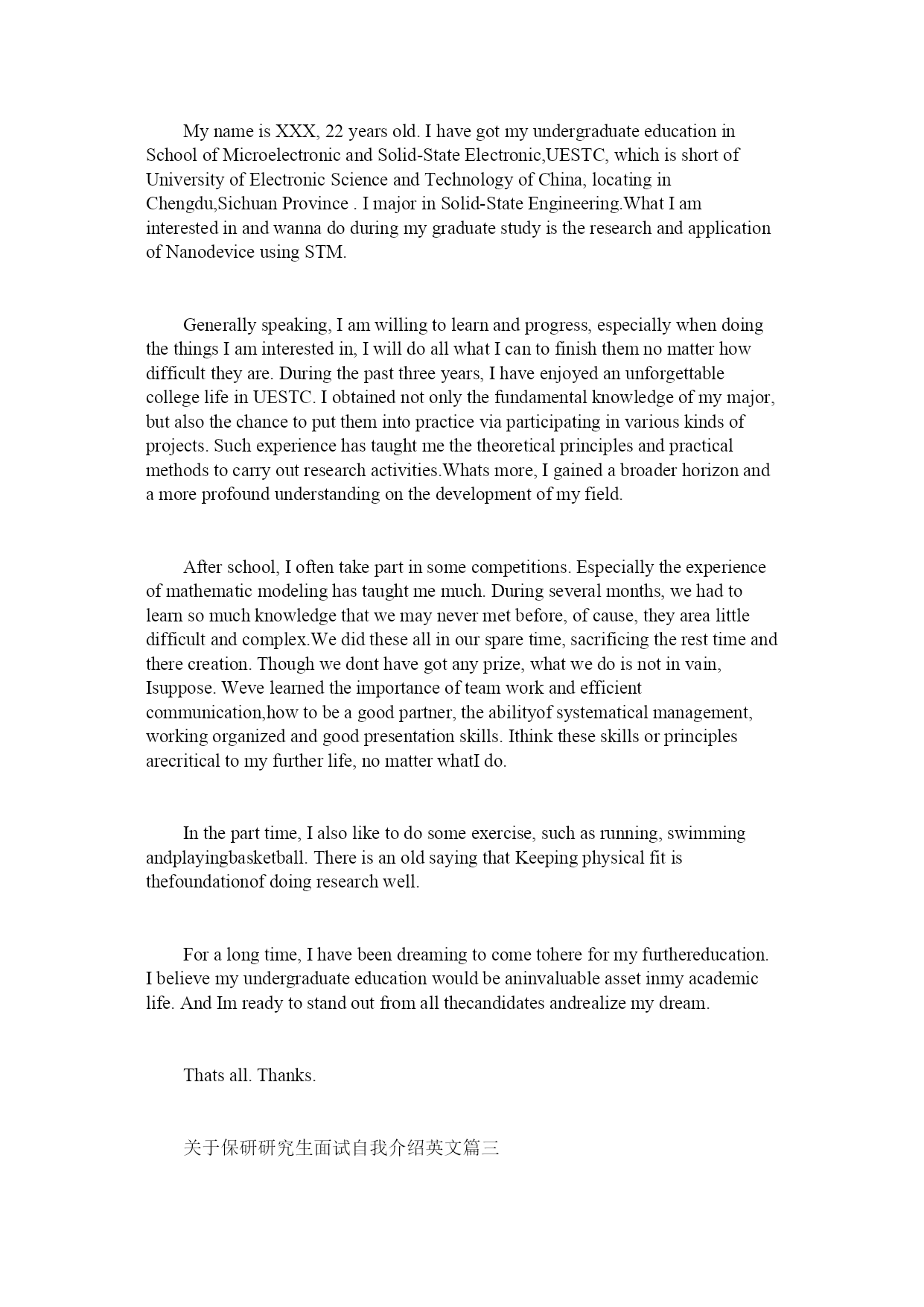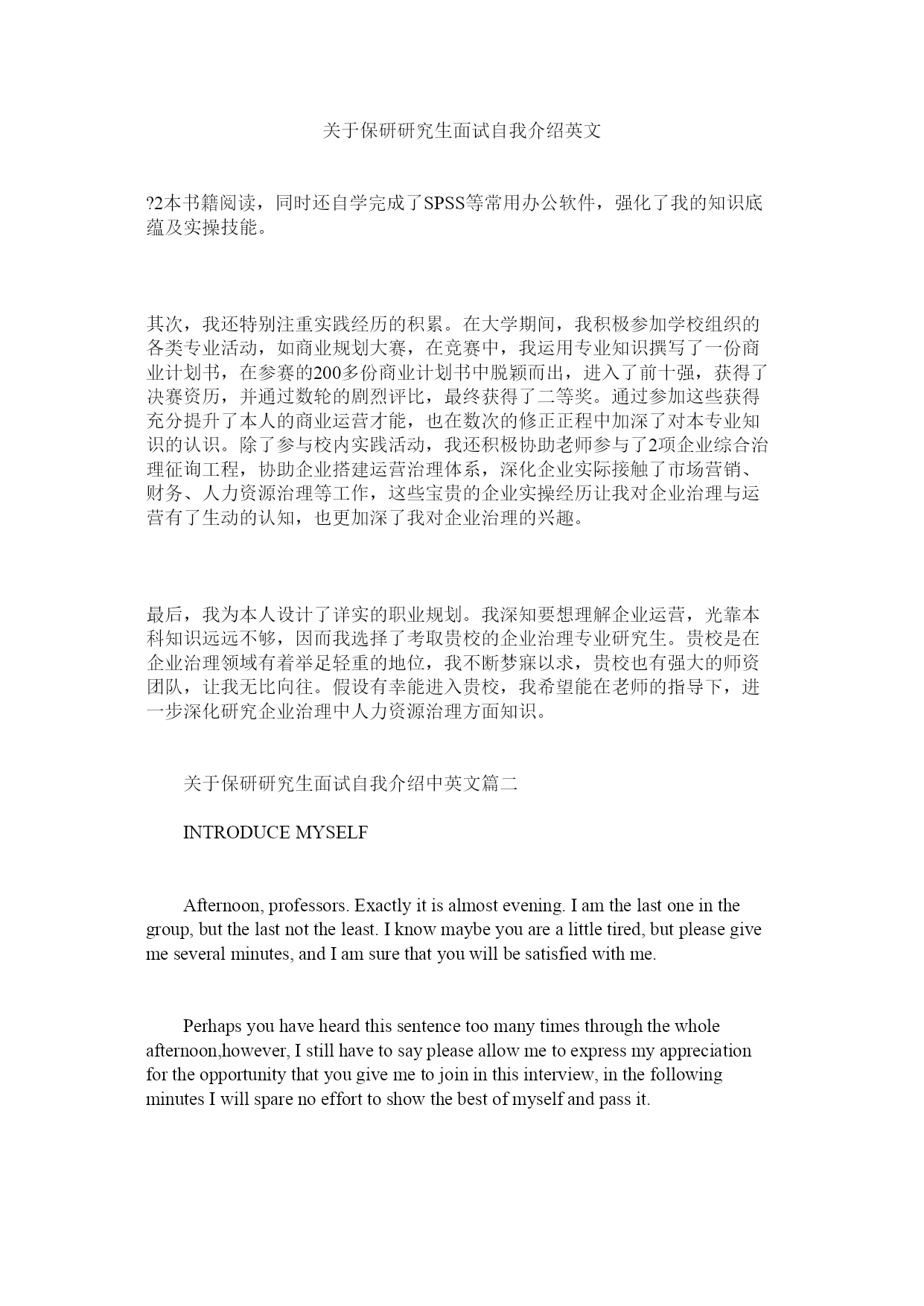 关于保研研究生面试自我介绍英文?2本书籍阅读,同时还自学完成了SPSS等常用办公软件,强化了我的知识底蕴及实操技能。其次,我还特别注重实践经历的积累。在大学期间,我积极参加学校组织的各类专业活动,如商业规划大赛,在竞赛中,我运用专业知识撰写了一份商业计划书,在参赛的200多份商业计划书中脱颖而出,进入了前十强,获得了决赛资历,并通过数轮的剧烈评比,最终获得了二等奖。通过参加这些获得充分提升了本人的商业运营才能,也在数次的修正正程中加深了对本专业知识的认识。除了参与校内实践活动,我还积极协助老师参与了2项企业综合治理征询工程,协助企业搭建运营治理体系,深化企业实际接触了市场营销、财务、人力资源治理等工作,这些宝贵的企业实操经历让我对企业治理与运营有了生动的认知,也更加深了我对企业治理的兴趣。最后,我为本人设计了详实的职业规划。我深知要想理解企业运营,光靠本科知识远远不够,因而我选择了考取贵校的企业治理专业研究生。贵校是在企业治理领域有着举足轻重的地位,我不断梦寐以求,贵校也有强大的师资团队,让我无比向往。假设有幸能进入贵校,我希望能在老师的指导下,进一步深化研究企业治理中人力资源治理方面知识。关于保研研究生面试自我介绍中英文篇二INTRODUCEMYSELFAfternoon,professors.Exactlyitisalmostevening.Iamthelastoneinthegroup,butthelastnottheleast.Iknowmaybeyouarealittletired,butpleasegivemeseveralminutes,andIamsurethatyouwillbesatisfiedwithme.Perhapsyouhaveheardthissentencetoomanytimesthroughthewholeafternoon,however,Istillhavetosaypleaseallowmetoexpressmyappreciationfortheopportunitythatyougivemetojoininthisinterview,inthefollowingminutesIwillsparenoefforttoshowthebestofmyselfandpassit.MynameisXXX,22yearsold.IhavegotmyundergraduateeducationinSchoolofMicroelectronicandSolid-StateElectronic,UESTC,whichisshortofUniversityofElectronicScienceandTechnologyofChina,locatinginChengdu,SichuanProvince.ImajorinSolid-StateEngineering.WhatIaminterestedinandwannadoduringmygraduatestudyistheresearchandapplicationofNanodeviceusingSTM.Generallyspeaking,Iamwillingtolearnandprogress,especiallywhendoingthethingsIaminterestedin,IwilldoallwhatIcantofinishthemnomatterhowdifficulttheyare.Duringthepastthreeyears,IhaveenjoyedanunforgettablecollegelifeinUESTC.Iobtainednotonlythefundamentalknowledgeofmymajor,butalsothechancetoputthemintopracticeviaparticipatinginvariouskindsofprojects.Suchexperiencehastaughtmethetheoreticalprinciplesandpracticalmethodstocarryoutresearchactivities.Whatsmore,Igainedabroaderhorizonandamoreprofoundunderstandingonthedevelopmentofmyfield.Afterschool,Ioftentakepartinsomecompetitions.Especiallytheexperienceofmathematicmodelinghastaughtmemuch.Duringseveralmonths,weha