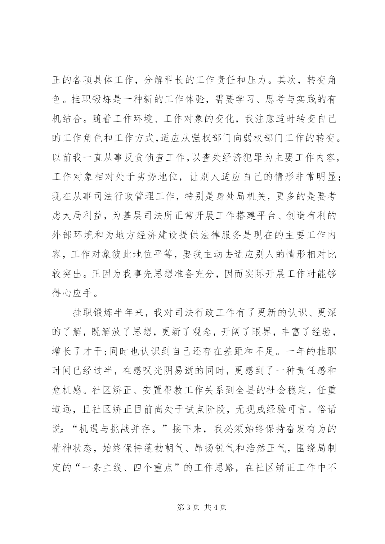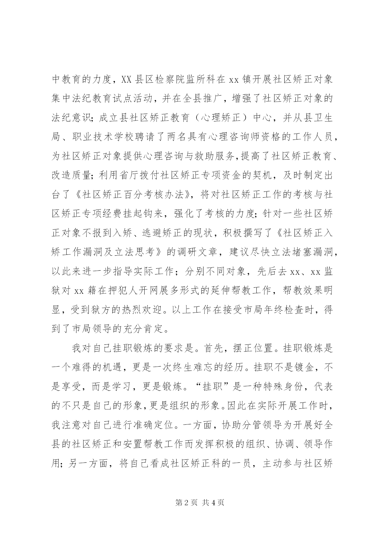 第PAGE\*Arabic\*MERGEFORMAT4页共NUMPAGES\*MERGEFORMAT4页司法社区挂职锻炼半年心得体会编者按。挂职锻炼半年来,我对司法行政工作有了更新的认识、更深的了解。挂职锻炼近半年来,在分管领导的直接带领下,我和社矫科的同志一道创造性地开展工作,召开了公、检、法、司分管领导及相关部门负责人参加的社区矫正工作联席会议,营造了各方齐抓共管、注重实效的良好氛围;加强与县检察院对接,实现了监外执行人员信息共享,落实监管安全责任;加大集中教育的力度,XX县区检察院监所科在xx镇开展社区矫正对象集中法纪教育试点活动,并在全县推广,增强了社区矫正对象的法纪意识。挂职锻炼是一个难得的机遇,更是一次终生难忘的经历。挂职不是镀金,不是享受,而是学习,更是锻炼。“挂职”是一种特殊身份,代表的不只是自己的形象,更是组织的形象。挂职锻炼半年来,我对司法行政工作有了更新的认识、更深的了解,既解放了思想,更新了观念,开阔了眼界,丰富了经验,增长了才干;同时也认识到自己还存在差距和不足。身处这样一个开拓奋进的集体,我时刻面临着压力和挑战,工作丝毫不敢懈怠。挂职锻炼近半年来,在分管领导的直接带领下,我和社矫科的同志一道创造性地开展工作,召开了公、检、法、司分管领导及相关部门负责人参加的社区矫正工作联席会议,营造了各方齐抓共管、注重实效的良好氛围;加强与县检察院对接,实现了监外执行人员信息共享,落实监管安全责任;加大集中教育的力度,XX县区检察院监所科在xx镇开展社区矫正对象集中法纪教育试点活动,并在全县推广,增强了社区矫正对象的法纪意识;成立县社区矫正教育(心理矫正)中心,并从县卫生局、职业技术学校聘请了两名具有心理咨询师资格的工作人员,为社区矫正对象提供心理咨询与救助服务,提高了社区矫正教育、改造质量;利用省厅拨付社区矫正专项资金的契机,及时制定出台了《社区矫正百分考核办法》,将对社区矫正工作的考核与社区矫正专项经费挂起钩来,强化了考核的力度;针对一些社区矫正对象不报到入矫、逃避矫正的现状,积极撰写了《社区矫正入矫工作漏洞及立法思考》的调研文章,建议尽快立法堵塞漏洞,以此来进一步指导实际工作;分别不同对象,先后去xx、xx监狱对xx籍在押犯人开网展多形式的延伸帮教工作,帮教效果明显,受到狱方的热烈欢迎。以上工作在接受市局年终检查时,得到了市局领导的充分肯定。我对自己挂职锻炼的要求是。首先,摆正位置。挂职锻炼是一个难得的机遇,更是一次终生难忘的经历。挂职不是镀金,不是享受,而是学习,更是锻炼。“挂职”是一种特殊身份,代表的不只是自己的形象,更是组织的形象。因此在实际开展工作时,我注意对自己进行准确定位。一方面,协助分管领导为开展好全县的社区矫正和安置帮教工作而发挥积极的组织、协调、领导作用;另一方面,将自己看成社区矫正科的一员,主动参与社区矫正的各项具体工作,分解科长的工作责任和压力。其次,转变角色。挂职锻炼是一种新的工作体验,需要学习、思考与实践的有机结合。随着工作环境、工作对象的变化,我注意适时转变自己的工作角色和工作方式,适应从强权部门向弱权部门工作的转变。以前我一直从事反贪侦查工作,以查处经济犯罪为主要工作内容,工作对象相对处于劣势地位,让别人适应自己的情形非常明显;现在从事司法行政管理工作,特别是身处局机关,更多的是要考虑大局利益,为基层司法所正常开展工作搭建平台、创造有利的外部环境和为地方经济建设提供法律服务是现在的主要工作内容,工作对象彼此地位平等,要我主动去适应别人的情形相对比较突出。正因为我事先思想准备充分,因而实际开展工作时能够得心应手。挂职锻炼半年来,我对司法行政工作有了更新的认识、更深的了解,既解放了思想,更新了观念,开阔了眼界,丰富了经验,增长了才干;同时也认识到自己还存在差距和不足。一年的挂职时间已经过半,在感叹光阴易逝的同时,更感到了一种责任感和危机感。社区矫正、安置帮教工作关系到全县的社会稳定,任重道远,且社区矫正目前尚处于试点阶段,无现成经验可言。俗话说:“机遇与挑战并存。”接下来,我必须始终保持奋发有为的精神状态,始终保持蓬勃朝气、昂扬锐气和浩然正气,围绕局制定的“一条主线、四个重点”的工作思路,在社区矫正工作中不断探索,积极思考,打造亮点特色,为全局争创“全省优秀司法局”的目标作出自己应有的努力,为全县经济社会的和谐稳定奉献自己绵薄的力量。
