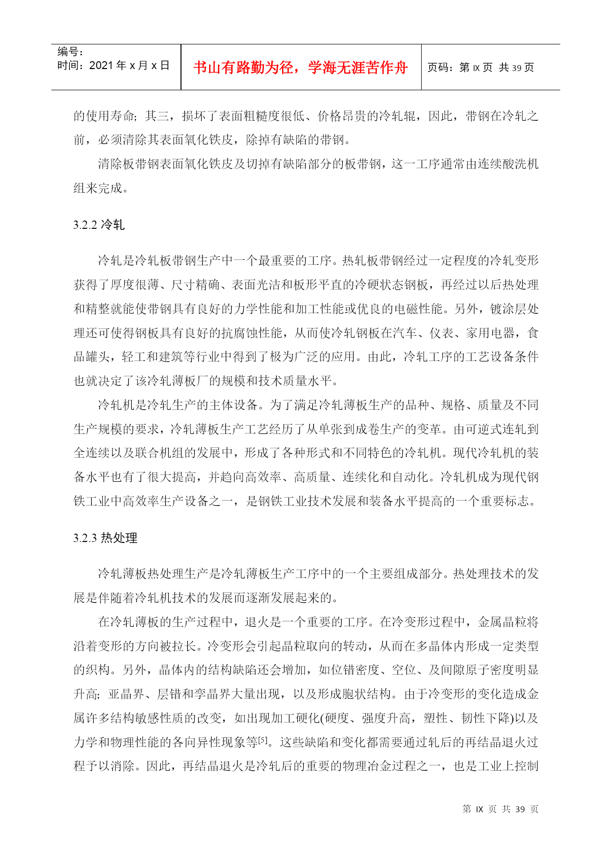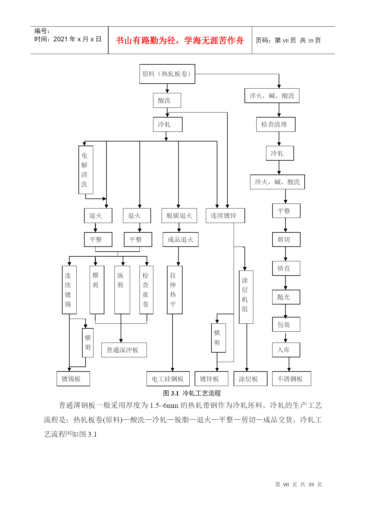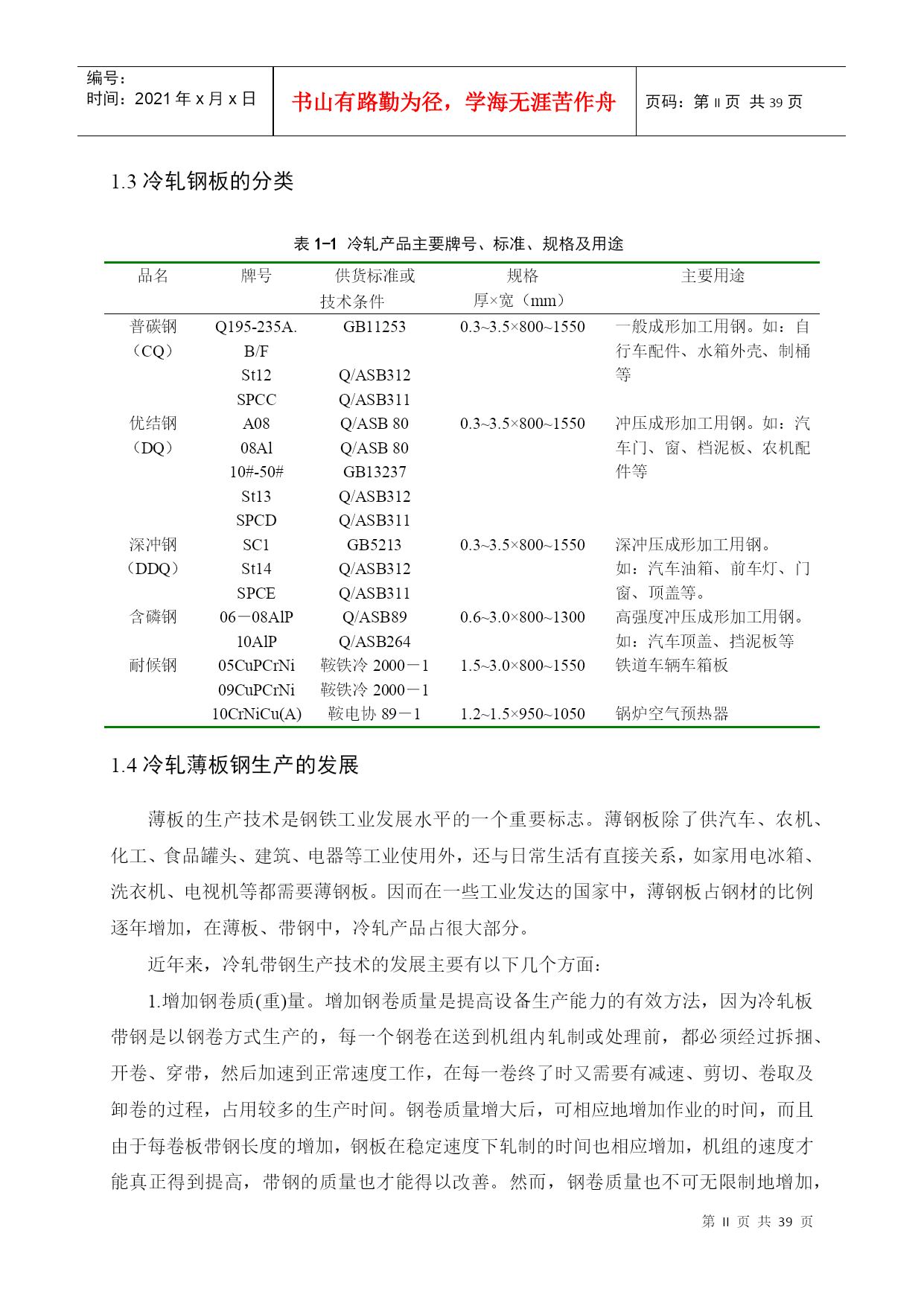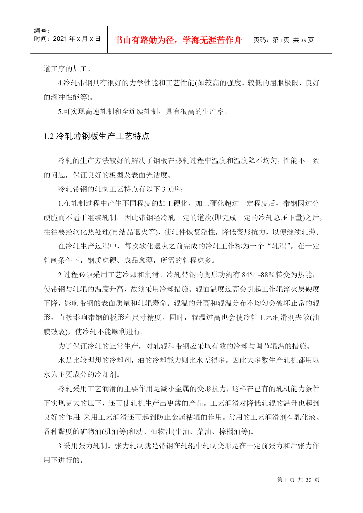 编号:时间:2021年x月x日书山有路勤为径,学海无涯苦作舟页码:第PAGEXXXVIII页共NUMPAGES39页第PAGE\*MERGEFORMATXXXVIII页共NUMPAGES\*MERGEFORMAT39页1综述1.1冷轧薄板简介金属在再结晶温度以下进行轧制变形叫做冷轧,一般指薄板不经加热而在室温直接进行轧制加工。冷轧后的带钢可能烫手,但还是叫冷轧[1]。钢的冷轧是在19世纪中叶始于德国,当时只能生产宽度20~25mm的冷轧薄板。美国1859年建立了25mm冷轧机,1887年生产出宽度为l50mm的低碳钢板。1880年以后冷轧钢板生产在美国、德国发展很快,产品宽度不断扩大,并逐步建立了附属设备,如剪切、矫直,平整和热处理设备等,产品质量也有了提高。宽的冷轧薄板(韧带)是在热轧成卷带钢的基础上发展起来的。首先是美国早在1920年第一次成功地轧制出宽带钢,并很快由单机不可逆轧制而跨入单机可逆式轧制。1926年阿姆柯公司巴持勒工厂建成四机架冷连轧机。我国冷轧宽带钢的生产开始于1960年,首先建立了1700mm单机可逆式冷轧机,以后陆续投产了1200mm单机可道式冷轧机,Mxw1400mm偏八辊轧机、1150mm二十辊冷轧机和1250mmHC单机可逆式冷轧机等,70年代投产了我国第一套1700mm连续式五机架冷轧机,1988年建成了2030mm五机架全连续冷轧机。近年来我国冷轧薄板生产能力增加了20多倍,生产装备技术水平已由只能生产低碳薄板而发展到能生产高碳钢、合金钢、高合金钢、不锈耐热冷轧薄板、镀锌板、涂层钢板、塑料复合薄板和硅钢片等。但随着四化建设的发展,无论在数量和品种质量上都远远满足不了四化建设发展的需要,为此我们必须增建新轮机,改造现有冷轧机,大力发展冷轧生产。冷轧生产可提供大量高精确度和性能优良的钢板和带材,其最主要的特点是加工温度低,同热轧生产相比,它有以下优点:1.冷轧带钢产品尺寸精确,厚度均匀,带钢厚度差一般不超过0.01~0.03mm或更小,完全可以符合高精度公差的要求。2.可获得热轧无法生产的极薄带材(最薄可达0.001mm以下)。3.冷轧产品表面质量优越,不存在热轧带钢常常出现的麻点、压入氧化铁皮等缺陷,并且可根据用户的要求,生产出不同表面粗糙度的带钢(光泽面或麻糙面等),以利于下道工序的加工。4.冷轧带钢具有很好的力学性能和工艺性能(如较高的强度、较低的屈服极限、良好的深冲性能等)。5.可实现高速轧制和全连续轧制,具有很高的生产率。1.2冷轧薄钢板生产工艺特点冷轧的生产方法较好的解决了钢板在热轧过程中温度和温度降不均匀,性能不一致的问题,保证良好的板型及表面光洁度。冷轧带钢的轧制工艺特点有以下3点[2]:1.在轧制过程中产生不同程度的加工硬化。加工硬化超过一定程度后,带钢因过分硬脆而不适于继续轧制。因此带钢经冷轧一定的道次(即完成一定的冷轧总压下量)之后,往往要经软化热处理(再结晶退火等),使轧件恢复塑性,降低变形抗力,以便继续轧薄。在冷轧生产过程中,每次软化退火之前完成的冷轧工作称为一个“轧程”。在一定轧制条件下,钢质愈硬、成品愈薄,所需的轧程愈多。2.过程必须采用工艺冷却和润滑。冷轧带钢的变形功约有84%~88%转变为热能,使带钢与轧辊的温度升高,故须采用冷却措施。辊面温度过高会引起工作辊淬火层硬度下降,影响带钢的表面质量和轧辊寿命。辊温的升高和辊温分布不均匀会破坏正常的辊形,直接影响带钢的板形和尺寸精度。同时,辊温过高也会使冷轧工艺润滑剂失效(油膜破裂),使冷轧不能顺利进行。为了保证冷轧的正常生产,对轧辊和带钢应采取有效的冷却与调节辊温的措施。水是比较理想的冷却剂,油的冷却能力则比水差得多。因此大多数生产轧机都用以水为主要成分的冷却剂。冷轧采用工艺润滑的主要作用是减小金属的变形抗力,这样在已有的轧机能力条件下实现更大的压下,还可使轧机生产出更薄的产品。工艺润滑对降低轧辊的温升也起到良好的作用;采用工艺润滑还可起到防止金属粘辊的作用。常用的工艺润滑剂有乳化液、各种黏度的矿物油(机油等)和动、植物油(牛油、菜油、棕榈油等)。3.采用张力轧制。张力轧制就是带钢在轧辊中轧制变形是在一定前张力和后张力作用下进行的。1.3冷轧钢板的分类表1-1冷轧产品主要牌号、标准、规格及用途品名牌号供货标准或技术条件规格厚×宽(mm)主要用途普碳钢(CQ)Q195-235A.B/FGB112530.3~3.5×800~1550一般成形加工用钢。如:自行车配件、水箱外壳、制桶等St12Q/ASB312SPCCQ/ASB311优结钢(DQ)A08Q/ASB800.3~3.5×800~1550冲压成形加工用钢。如:汽车门、窗、档泥板、