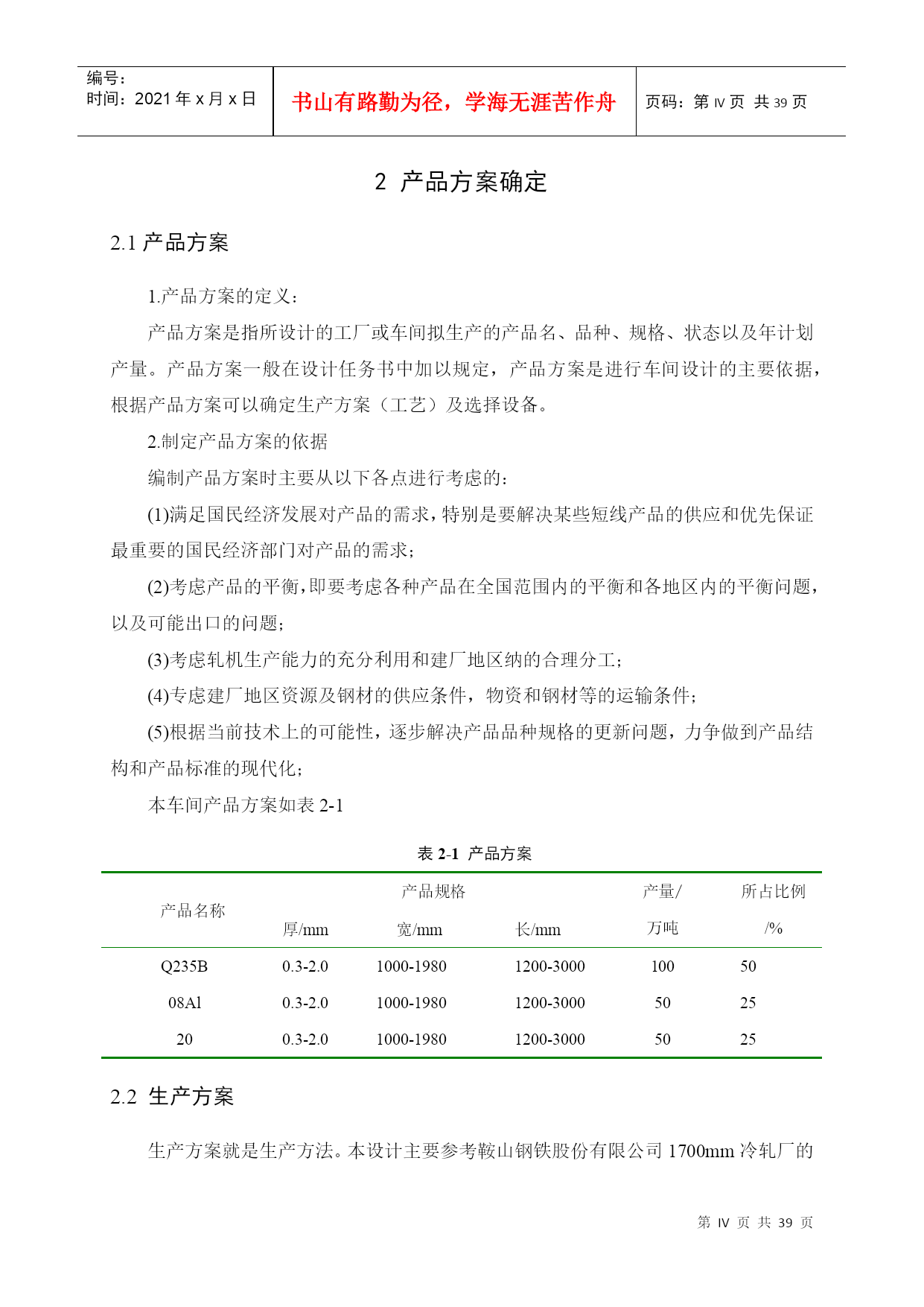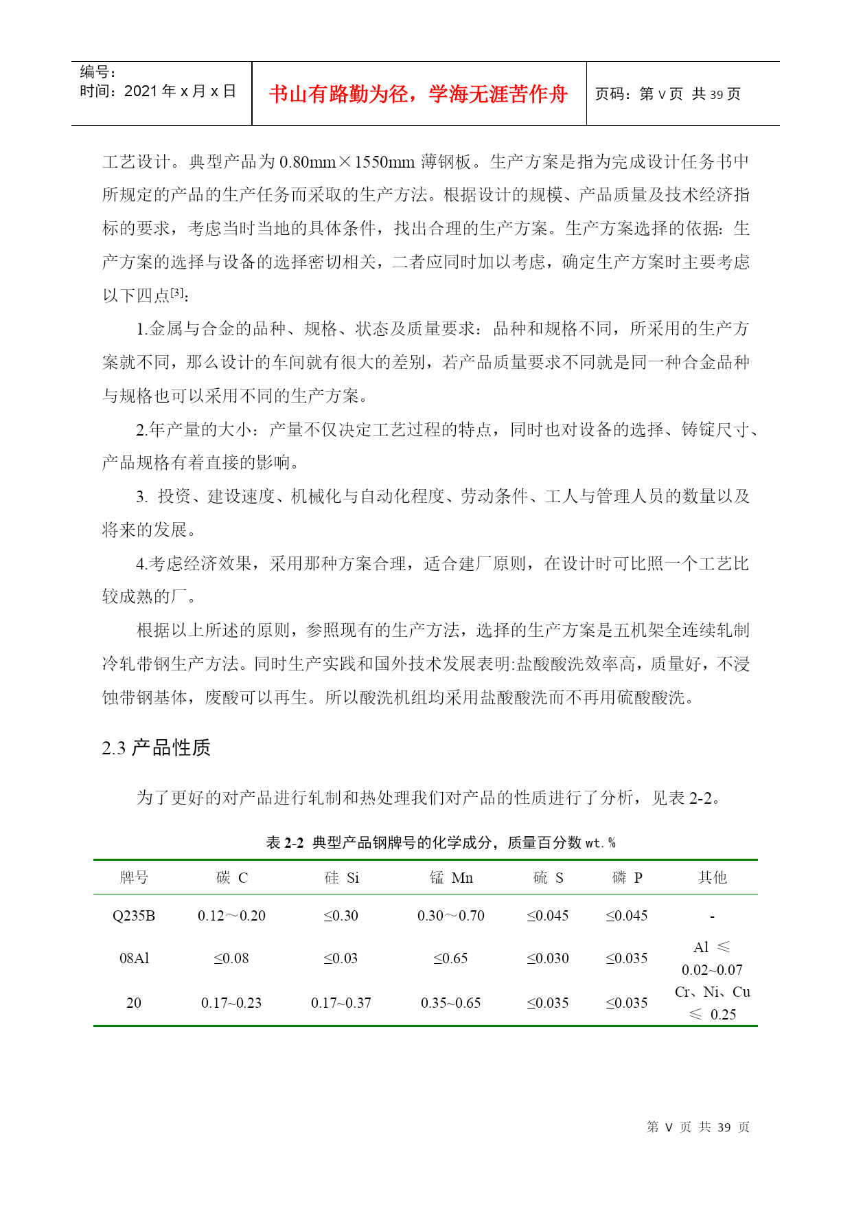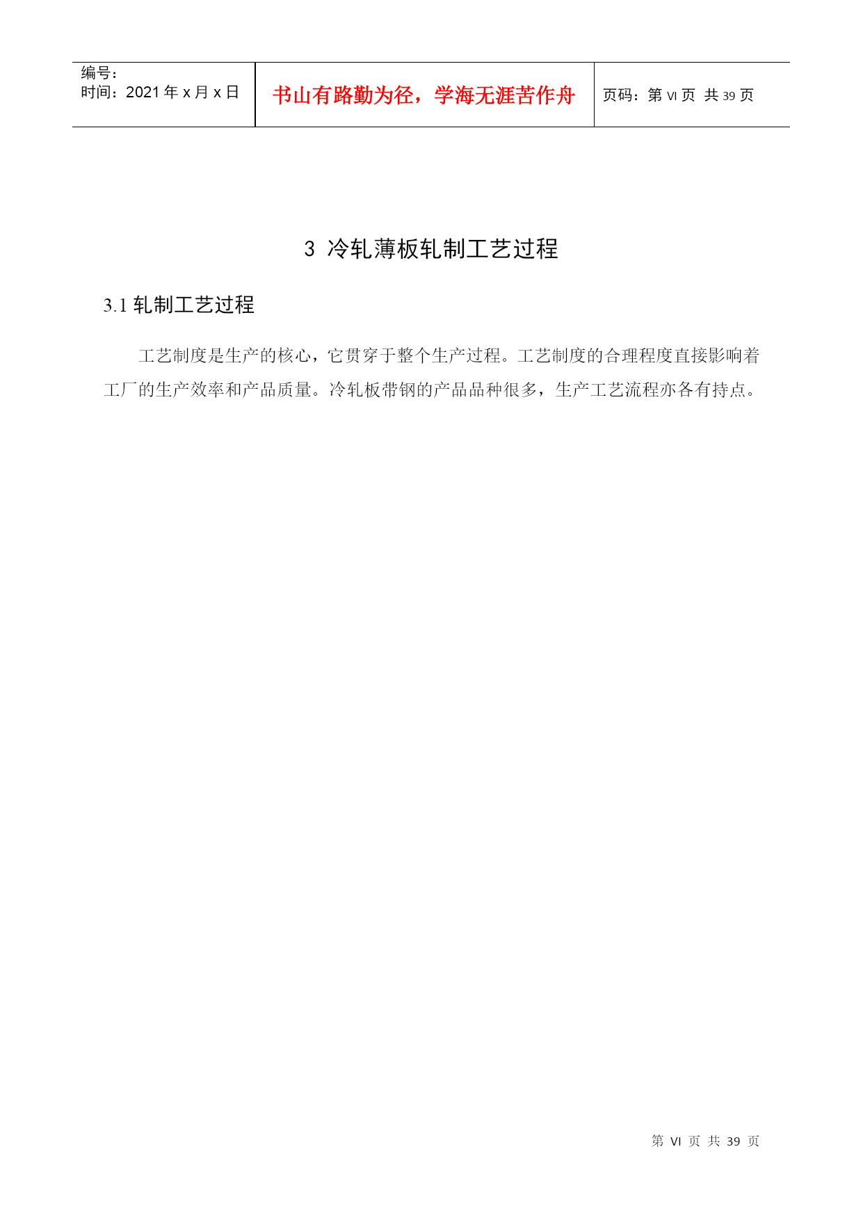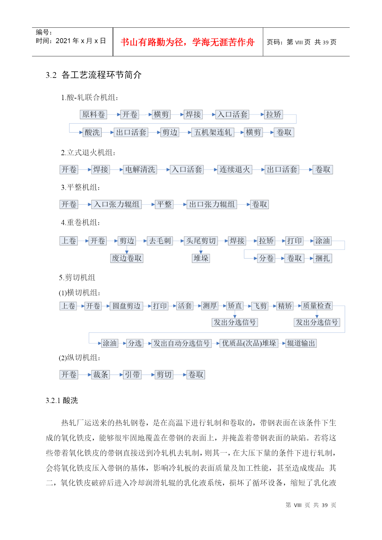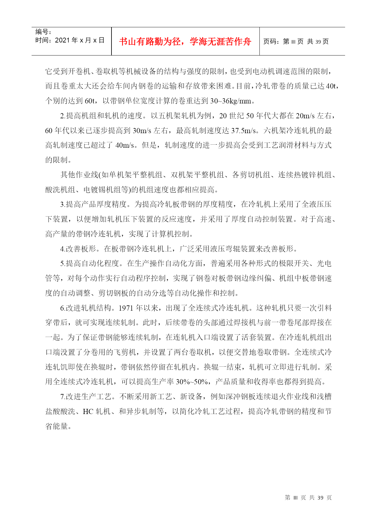 编号:时间:2021年x月x日书山有路勤为径,学海无涯苦作舟页码:第PAGEXXXVIII页共NUMPAGES39页第PAGE\*MERGEFORMATXXXVIII页共NUMPAGES\*MERGEFORMAT39页1综述1.1冷轧薄板简介金属在再结晶温度以下进行轧制变形叫做冷轧,一般指薄板不经加热而在室温直接进行轧制加工。冷轧后的带钢可能烫手,但还是叫冷轧[1]。钢的冷轧是在19世纪中叶始于德国,当时只能生产宽度20~25mm的冷轧薄板。美国1859年建立了25mm冷轧机,1887年生产出宽度为l50mm的低碳钢板。1880年以后冷轧钢板生产在美国、德国发展很快,产品宽度不断扩大,并逐步建立了附属设备,如剪切、矫直,平整和热处理设备等,产品质量也有了提高。宽的冷轧薄板(韧带)是在热轧成卷带钢的基础上发展起来的。首先是美国早在1920年第一次成功地轧制出宽带钢,并很快由单机不可逆轧制而跨入单机可逆式轧制。1926年阿姆柯公司巴持勒工厂建成四机架冷连轧机。我国冷轧宽带钢的生产开始于1960年,首先建立了1700mm单机可逆式冷轧机,以后陆续投产了1200mm单机可道式冷轧机,Mxw1400mm偏八辊轧机、1150mm二十辊冷轧机和1250mmHC单机可逆式冷轧机等,70年代投产了我国第一套1700mm连续式五机架冷轧机,1988年建成了2030mm五机架全连续冷轧机。近年来我国冷轧薄板生产能力增加了20多倍,生产装备技术水平已由只能生产低碳薄板而发展到能生产高碳钢、合金钢、高合金钢、不锈耐热冷轧薄板、镀锌板、涂层钢板、塑料复合薄板和硅钢片等。但随着四化建设的发展,无论在数量和品种质量上都远远满足不了四化建设发展的需要,为此我们必须增建新轮机,改造现有冷轧机,大力发展冷轧生产。冷轧生产可提供大量高精确度和性能优良的钢板和带材,其最主要的特点是加工温度低,同热轧生产相比,它有以下优点:1.冷轧带钢产品尺寸精确,厚度均匀,带钢厚度差一般不超过0.01~0.03mm或更小,完全可以符合高精度公差的要求。2.可获得热轧无法生产的极薄带材(最薄可达0.001mm以下)。3.冷轧产品表面质量优越,不存在热轧带钢常常出现的麻点、压入氧化铁皮等缺陷,并且可根据用户的要求,生产出不同表面粗糙度的带钢(光泽面或麻糙面等),以利于下道工序的加工。4.冷轧带钢具有很好的力学性能和工艺性能(如较高的强度、较低的屈服极限、良好的深冲性能等)。5.可实现高速轧制和全连续轧制,具有很高的生产率。1.2冷轧薄钢板生产工艺特点冷轧的生产方法较好的解决了钢板在热轧过程中温度和温度降不均匀,性能不一致的问题,保证良好的板型及表面光洁度。冷轧带钢的轧制工艺特点有以下3点[2]:1.在轧制过程中产生不同程度的加工硬化。加工硬化超过一定程度后,带钢因过分硬脆而不适于继续轧制。因此带钢经冷轧一定的道次(即完成一定的冷轧总压下量)之后,往往要经软化热处理(再结晶退火等),使轧件恢复塑性,降低变形抗力,以便继续轧薄。在冷轧生产过程中,每次软化退火之前完成的冷轧工作称为一个“轧程”。在一定轧制条件下,钢质愈硬、成品愈薄,所需的轧程愈多。2.过程必须采用工艺冷却和润滑。冷轧带钢的变形功约有84%~88%转变为热能,使带钢与轧辊的温度升高,故须采用冷却措施。辊面温度过高会引起工作辊淬火层硬度下降,影响带钢的表面质量和轧辊寿命。辊温的升高和辊温分布不均匀会破坏正常的辊形,直接影响带钢的板形和尺寸精度。同时,辊温过高也会使冷轧工艺润滑剂失效(油膜破裂),使冷轧不能顺利进行。为了保证冷轧的正常生产,对轧辊和带钢应采取有效的冷却与调节辊温的措施。水是比较理想的冷却剂,油的冷却能力则比水差得多。因此大多数生产轧机都用以水为主要成分的冷却剂。冷轧采用工艺润滑的主要作用是减小金属的变形抗力,这样在已有的轧机能力条件下实现更大的压下,还可使轧机生产出更薄的产品。工艺润滑对降低轧辊的温升也起到良好的作用;采用工艺润滑还可起到防止金属粘辊的作用。常用的工艺润滑剂有乳化液、各种黏度的矿物油(机油等)和动、植物油(牛油、菜油、棕榈油等)。3.采用张力轧制。张力轧制就是带钢在轧辊中轧制变形是在一定前张力和后张力作用下进行的。1.3冷轧钢板的分类表1-1冷轧产品主要牌号、标准、规格及用途品名牌号供货标准或技术条件规格厚×宽(mm)主要用途普碳钢(CQ)Q195-235A.B/FGB112530.3~3.5×800~1550一般成形加工用钢。如:自行车配件、水箱外壳、制桶等St12Q/ASB312SPCCQ/ASB311优结钢(DQ)A08Q/ASB800.3~3.5×800~1550冲压成形加工用钢。如:汽车门、窗、档泥板、