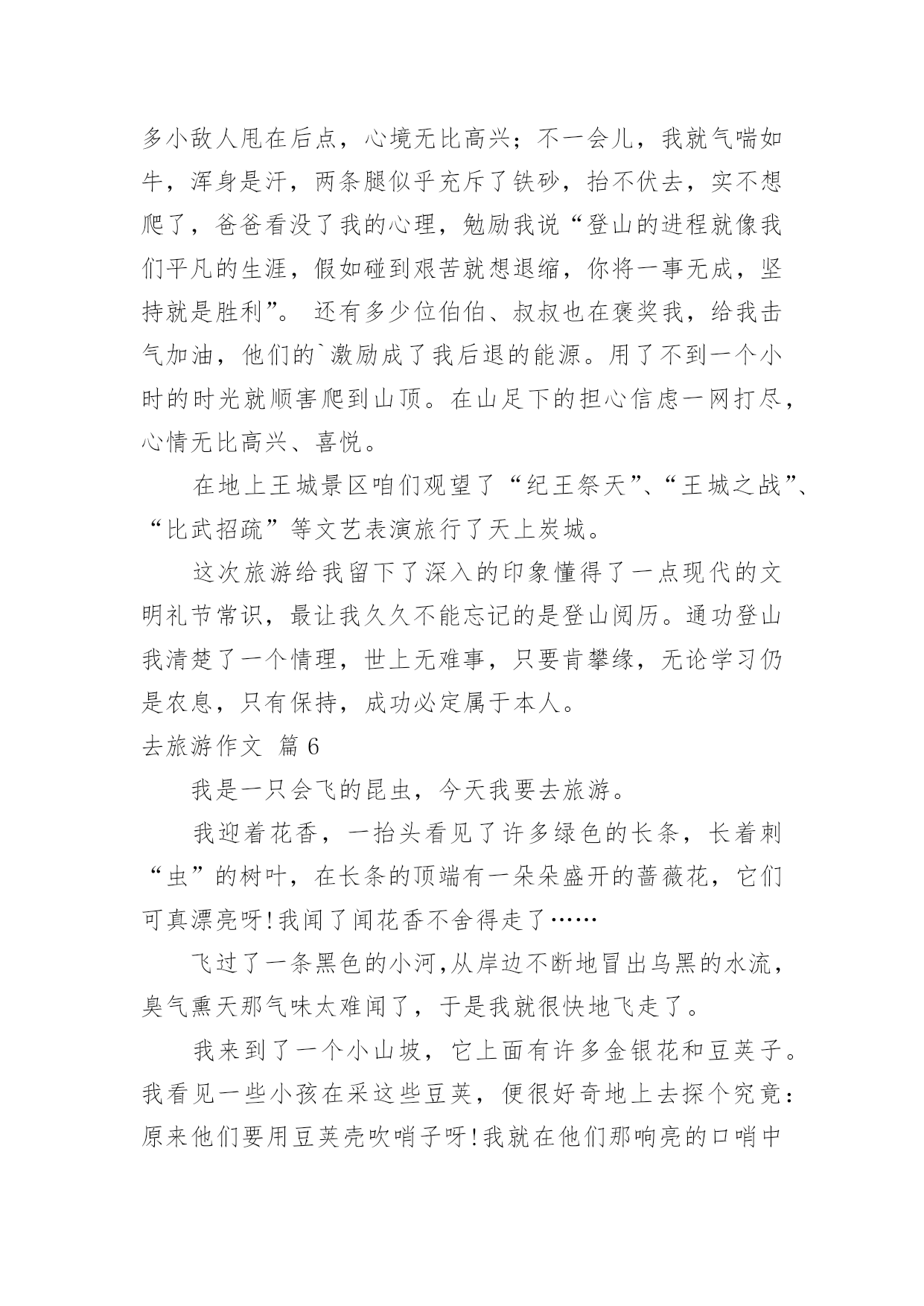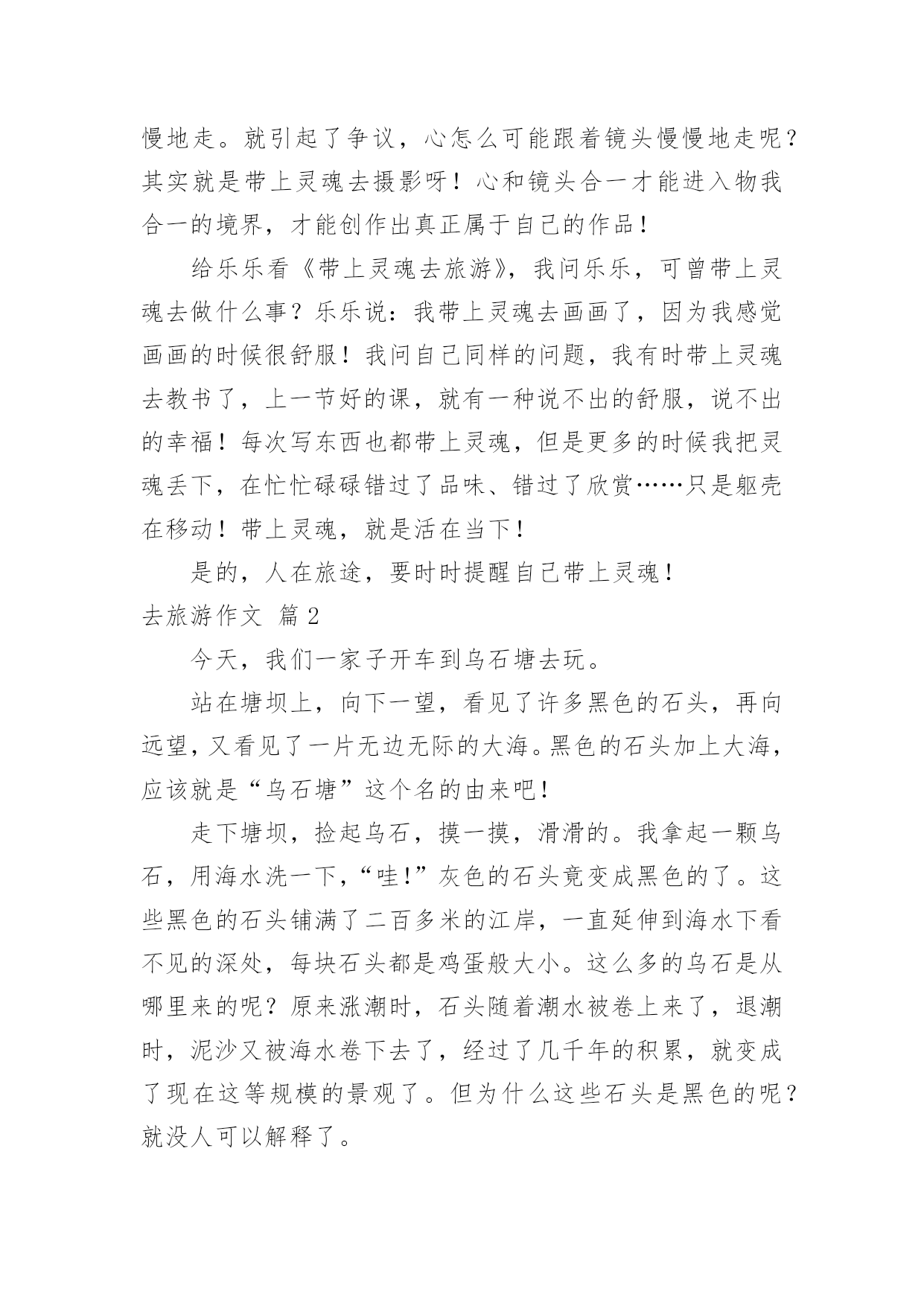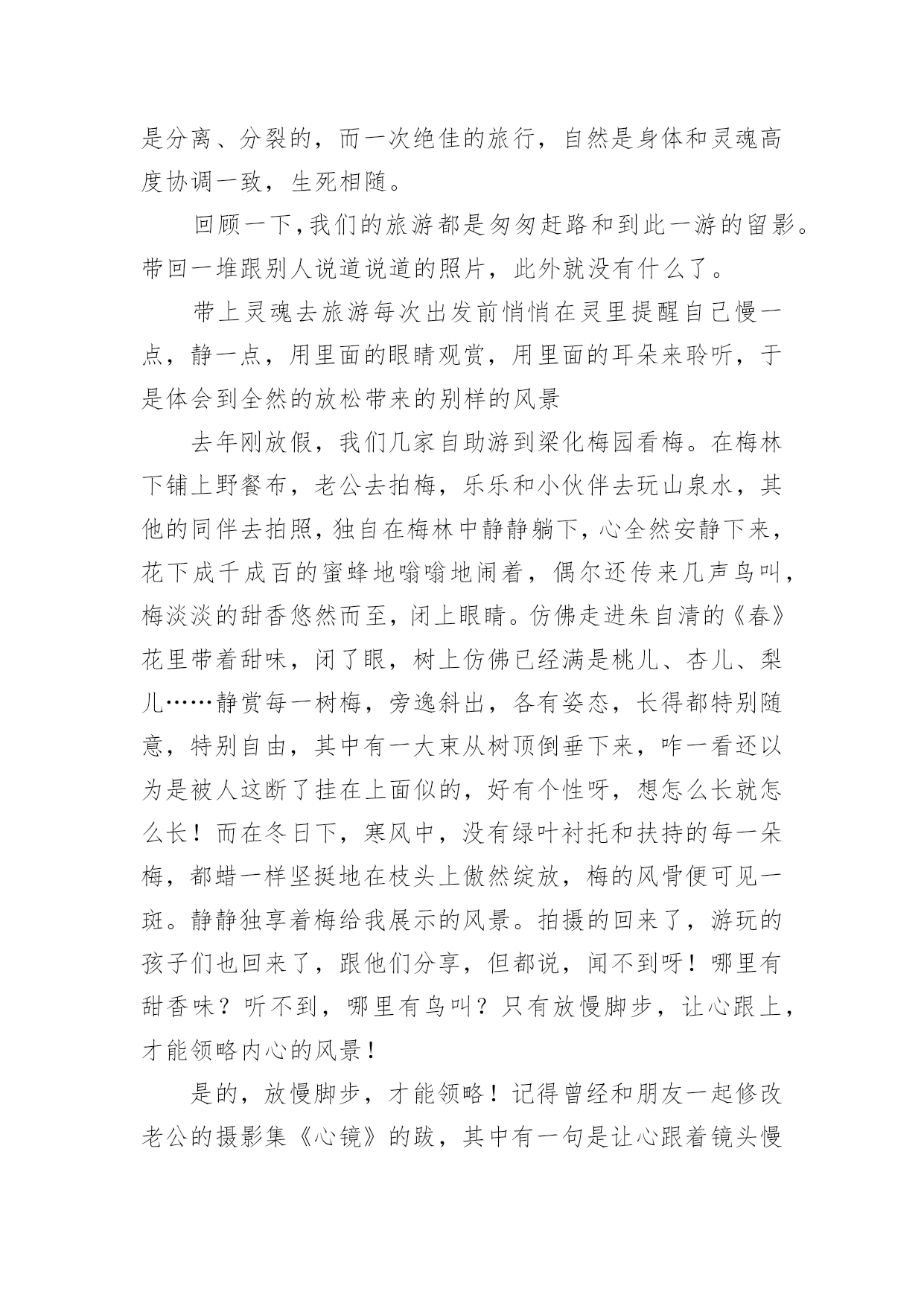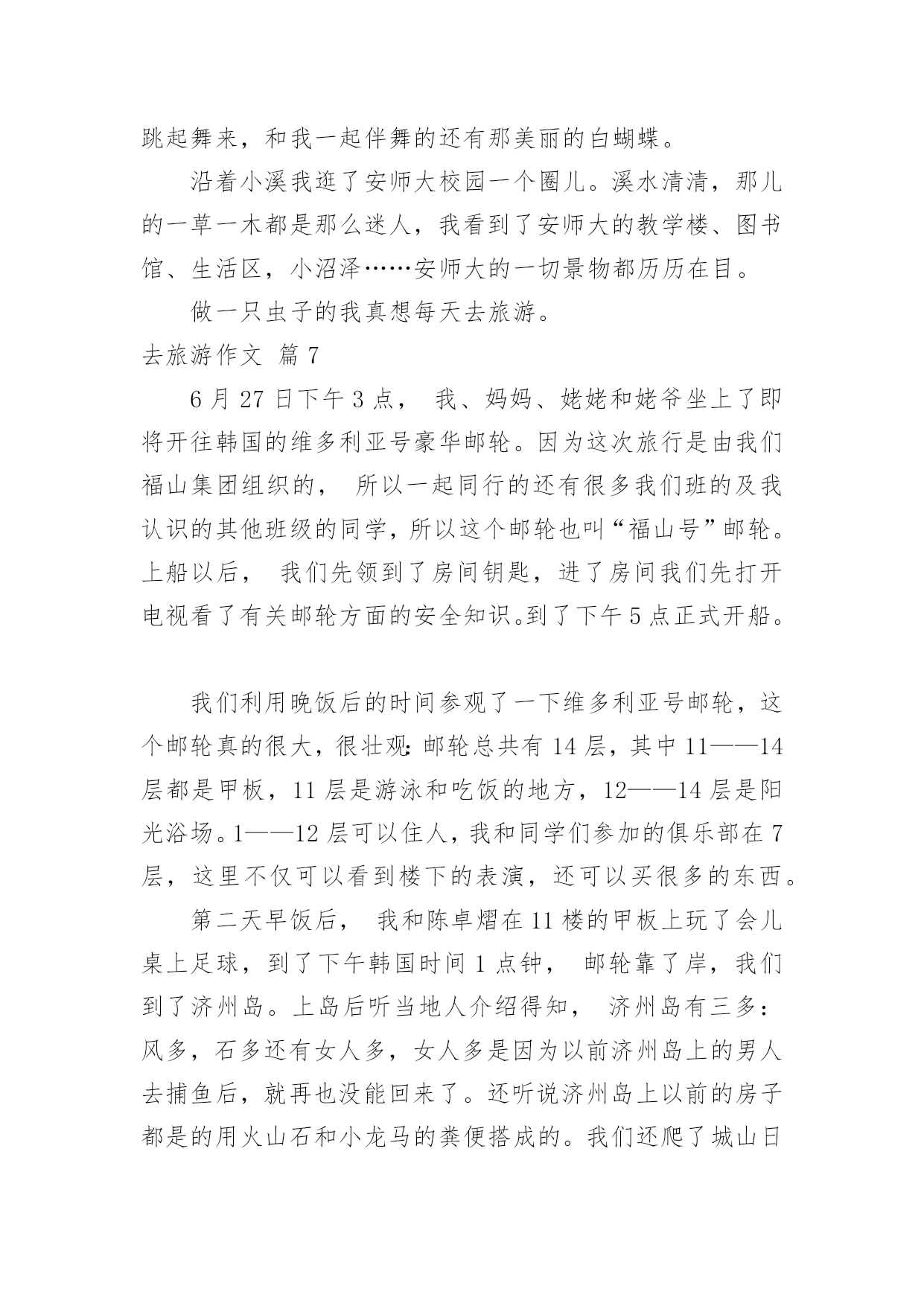 去旅游作文关于去旅游作文7篇在平凡的学习、工作、生活中,许多人都写过作文吧,借助作文可以宣泄心中的情感,调节自己的心情。相信许多人会觉得作文很难写吧,下面是小编精心整理的去旅游作文7篇,希望能够帮助到大家。去旅游作文篇1喜欢毕淑敏的散文,心常常能随着她的笔静静地散步,她的风景和我的风景渐渐融合……久久的蜗居,易使我们的视野狭小,胸怀仄斜,肌力减弱……这时候就需要我们收拾行囊,告辞亲人,踏上旅途……旅游也就这样成了我的生活方式,亦或说是我生命的另一种呈现方式,一年如果不出去旅行一趟,仿佛心被囚禁了,于是无论长途还是短途总要出去,只要是没有去过的地方,我不知道自己为什么会这样,毕淑敏说:旅行以一种充满未知的魅力,激发人们不倦的向往。每每读她的,我总能找到一些我感觉到,但是不知道的封存在心底的答案。所以当心情需要平静的时候,我会翻翻她的散文,听她说说话。最近读她的一篇《带上灵魂去旅行》的,仿佛如一泓清泉涌入灵魂似乎是一个身负重担或手脚不利索的弱者,慢慢吞吞地经常掉队,你走快了,它就跟不上趟,我觉得此说最有意义的部分,是证明旅行中,我们的身体和灵魂是不同步的,是分离、分裂的,而一次绝佳的旅行,自然是身体和灵魂高度协调一致,生死相随。回顾一下,我们的旅游都是匆匆赶路和到此一游的留影。带回一堆跟别人说道说道的照片,此外就没有什么了。带上灵魂去旅游每次出发前悄悄在灵里提醒自己慢一点,静一点,用里面的眼睛观赏,用里面的耳朵来聆听,于是体会到全然的放松带来的别样的风景去年刚放假,我们几家自助游到梁化梅园看梅。在梅林下铺上野餐布,老公去拍梅,乐乐和小伙伴去玩山泉水,其他的同伴去拍照,独自在梅林中静静躺下,心全然安静下来,花下成千成百的蜜蜂地嗡嗡地闹着,偶尔还传来几声鸟叫,梅淡淡的甜香悠然而至,闭上眼睛。仿佛走进朱自清的《春》花里带着甜味,闭了眼,树上仿佛已经满是桃儿、杏儿、梨儿……静赏每一树梅,旁逸斜出,各有姿态,长得都特别随意,特别自由,其中有一大束从树顶倒垂下来,咋一看还以为是被人这断了挂在上面似的,好有个性呀,想怎么长就怎么长!而在冬日下,寒风中,没有绿叶衬托和扶持的每一朵梅,都蜡一样坚挺地在枝头上傲然绽放,梅的风骨便可见一斑。静静独享着梅给我展示的风景。拍摄的回来了,游玩的孩子们也回来了,跟他们分享,但都说,闻不到呀!哪里有甜香味?听不到,哪里有鸟叫?只有放慢脚步,让心跟上,才能领略内心的风景!是的,放慢脚步,才能领略!记得曾经和朋友一起修改老公的摄影集《心镜》的跋,其中有一句是让心跟着镜头慢慢地走。就引起了争议,心怎么可能跟着镜头慢慢地走呢?其实就是带上灵魂去摄影呀!心和镜头合一才能进入物我合一的境界,才能创作出真正属于自己的作品!给乐乐看《带上灵魂去旅游》,我问乐乐,可曾带上灵魂去做什么事?乐乐说:我带上灵魂去画画了,因为我感觉画画的时候很舒服!我问自己同样的问题,我有时带上灵魂去教书了,上一节好的课,就有一种说不出的舒服,说不出的幸福!每次写东西也都带上灵魂,但是更多的时候我把灵魂丢下,在忙忙碌碌错过了品味、错过了欣赏……只是躯壳在移动!带上灵魂,就是活在当下!是的,人在旅途,要时时提醒自己带上灵魂!去旅游作文篇2今天,我们一家子开车到乌石塘去玩。站在塘坝上,向下一望,看见了许多黑色的石头,再向远望,又看见了一片无边无际的大海。黑色的石头加上大海,应该就是“乌石塘”这个名的由来吧!走下塘坝,捡起乌石,摸一摸,滑滑的。我拿起一颗乌石,用海水洗一下,“哇!”灰色的石头竟变成黑色的了。这些黑色的石头铺满了二百多米的江岸,一直延伸到海水下看不见的深处,每块石头都是鸡蛋般大小。这么多的乌石是从哪里来的呢?原来涨潮时,石头随着潮水被卷上来了,退潮时,泥沙又被海水卷下去了,经过了几千年的积累,就变成了现在这等规模的景观了。但为什么这些石头是黑色的呢?就没人可以解释了。再往下走,就是海水了。这里的海水不像嵊泗的海水那样浑浊,也不像青岛的海水那样湛蓝,由于海底都是黑色的石头,所以海水就成碧绿的了。看到了这样碧绿的海水,我忍不住随着其他游人一样挽起裤脚下海了,当时正涨潮时,浪头落差一米左右,我每次都能随着浪花的起伏轻巧地躲避着。忽然远处一个大浪奔腾过来,旁边的一个小男孩全部衣服都被打湿了,他的爸妈干脆将他扔进大海,让他在海上游泳,我也来不及作出反应,就被打湿了整个裤子,于是就坐在石滩上扔石子。快到十二时,肚子已在造反了,在父母的催促下我恋恋不舍的离开了乌石塘。去旅游作文篇3“轰!”随着一声巨响,我乘坐的“新四驱兄弟1号”成功飞上了太空。在空中,一阵阵摩擦声陆续传入耳中。飞船行驶的越来越快,仿佛想一口气冲到太空早点儿将整个宇宙一览无余。飞船冲入大气层,开始慢了下来。往外看,一片茫茫,什么也看不见,只听见巨大的摩擦声。过了十分钟后,飞船畅通无阻地进入宇