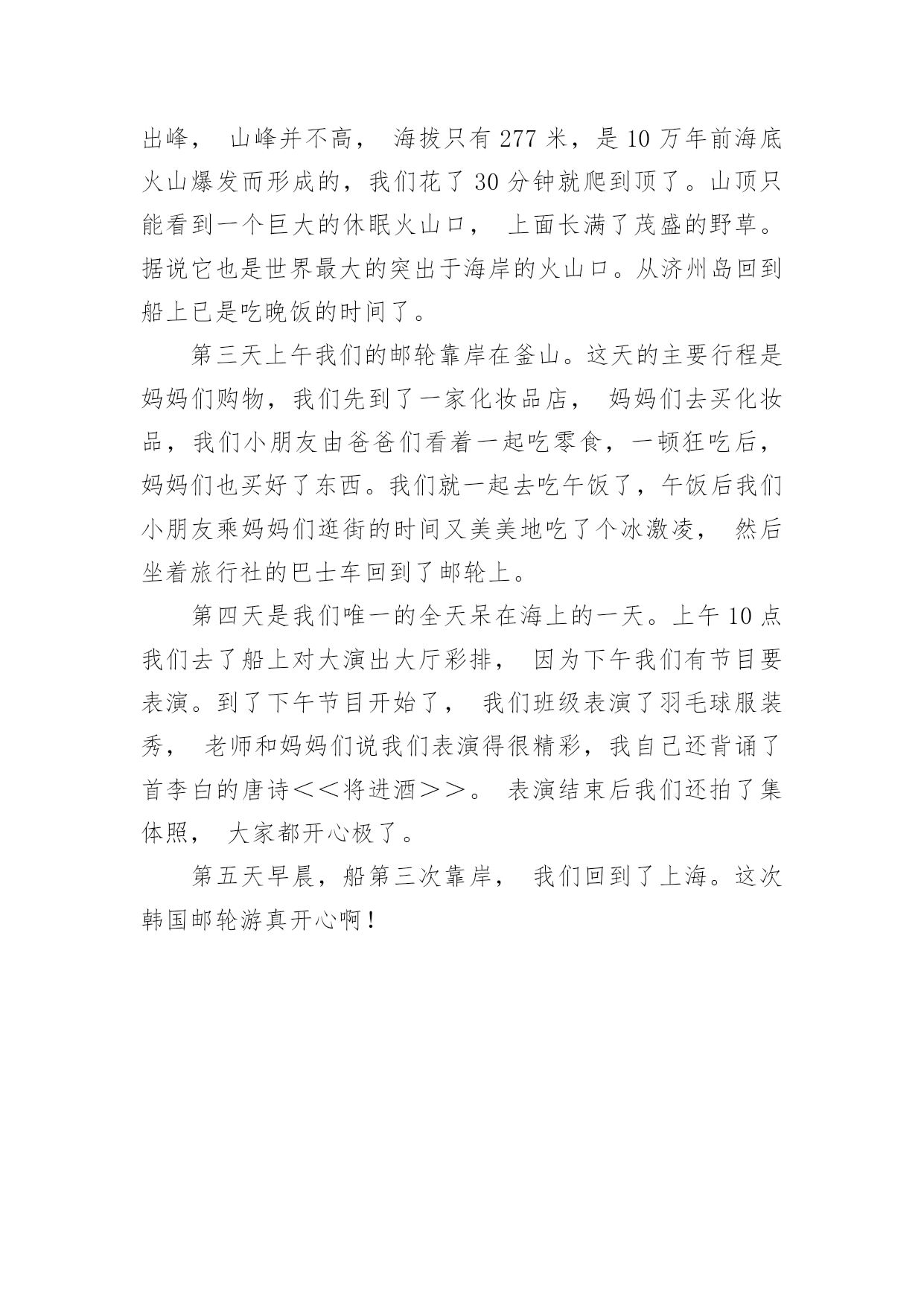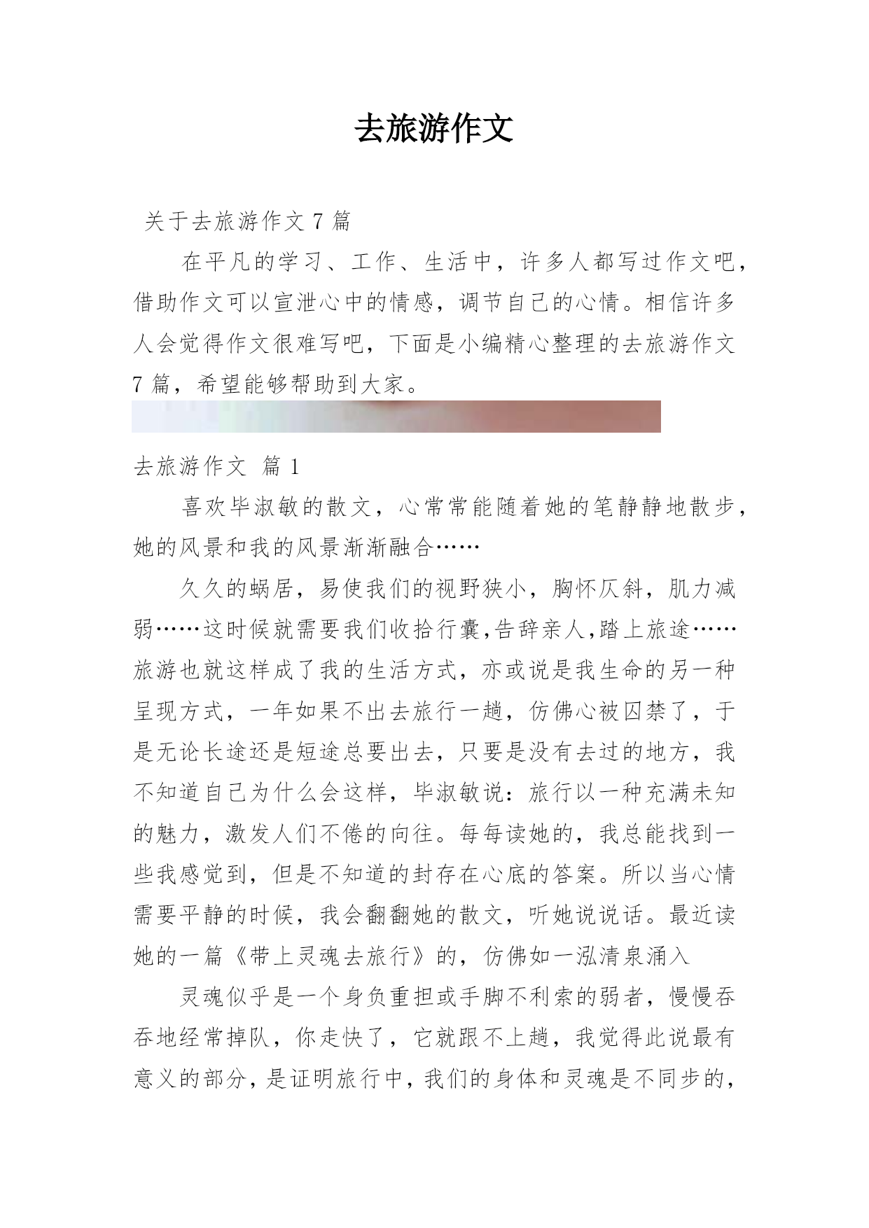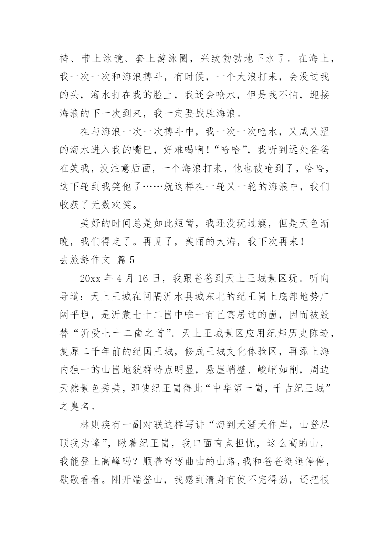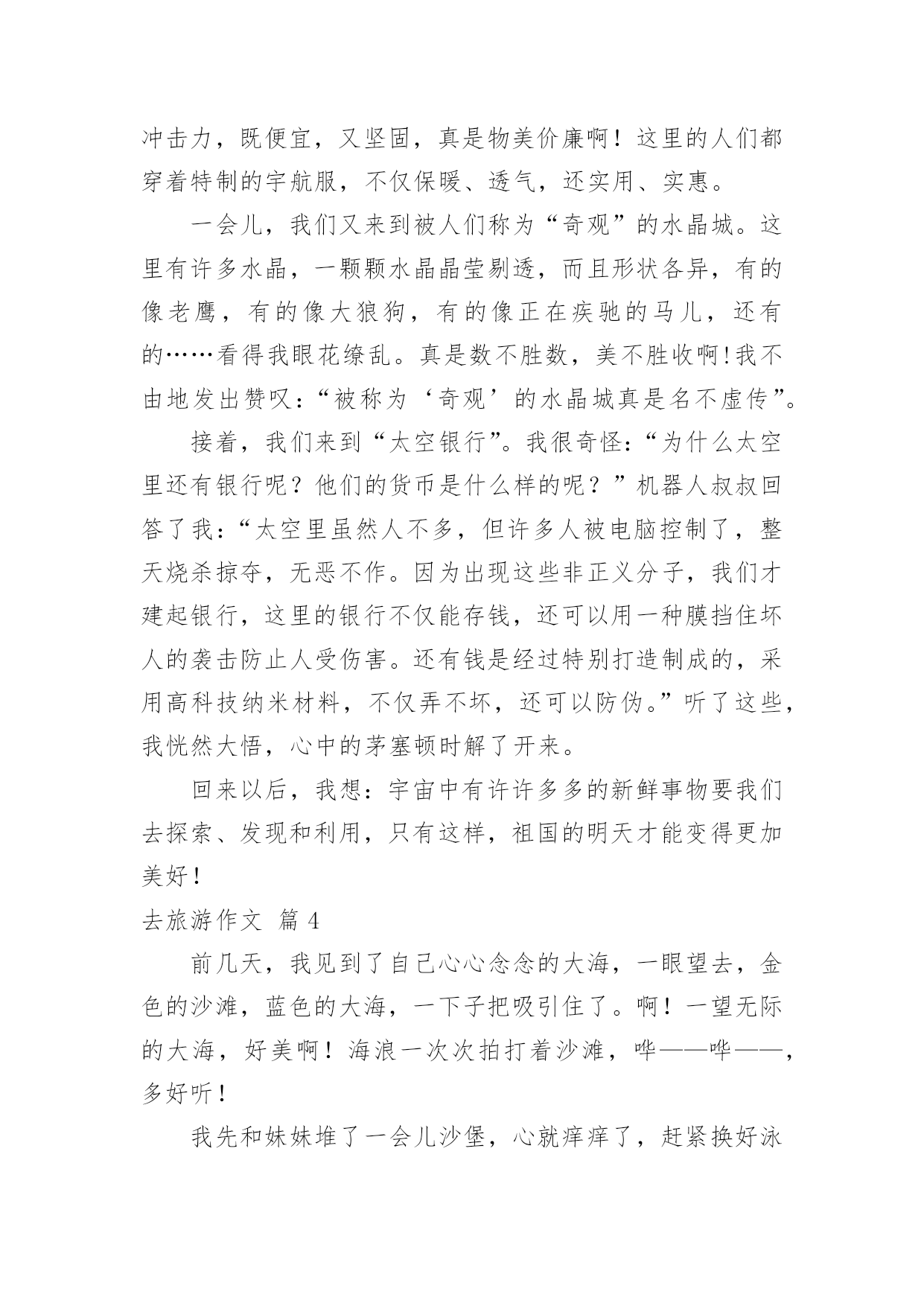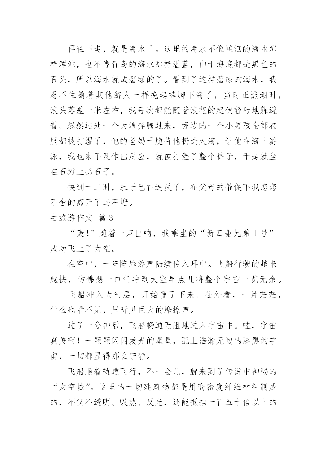 去旅游作文关于去旅游作文7篇在平凡的学习、工作、生活中,许多人都写过作文吧,借助作文可以宣泄心中的情感,调节自己的心情。相信许多人会觉得作文很难写吧,下面是小编精心整理的去旅游作文7篇,希望能够帮助到大家。去旅游作文篇1喜欢毕淑敏的散文,心常常能随着她的笔静静地散步,她的风景和我的风景渐渐融合……久久的蜗居,易使我们的视野狭小,胸怀仄斜,肌力减弱……这时候就需要我们收拾行囊,告辞亲人,踏上旅途……旅游也就这样成了我的生活方式,亦或说是我生命的另一种呈现方式,一年如果不出去旅行一趟,仿佛心被囚禁了,于是无论长途还是短途总要出去,只要是没有去过的地方,我不知道自己为什么会这样,毕淑敏说:旅行以一种充满未知的魅力,激发人们不倦的向往。每每读她的,我总能找到一些我感觉到,但是不知道的封存在心底的答案。所以当心情需要平静的时候,我会翻翻她的散文,听她说说话。最近读她的一篇《带上灵魂去旅行》的,仿佛如一泓清泉涌入灵魂似乎是一个身负重担或手脚不利索的弱者,慢慢吞吞地经常掉队,你走快了,它就跟不上趟,我觉得此说最有意义的部分,是证明旅行中,我们的身体和灵魂是不同步的,是分离、分裂的,而一次绝佳的旅行,自然是身体和灵魂高度协调一致,生死相随。回顾一下,我们的旅游都是匆匆赶路和到此一游的留影。带回一堆跟别人说道说道的照片,此外就没有什么了。带上灵魂去旅游每次出发前悄悄在灵里提醒自己慢一点,静一点,用里面的眼睛观赏,用里面的耳朵来聆听,于是体会到全然的放松带来的别样的风景去年刚放假,我们几家自助游到梁化梅园看梅。在梅林下铺上野餐布,老公去拍梅,乐乐和小伙伴去玩山泉水,其他的同伴去拍照,独自在梅林中静静躺下,心全然安静下来,花下成千成百的蜜蜂地嗡嗡地闹着,偶尔还传来几声鸟叫,梅淡淡的甜香悠然而至,闭上眼睛。仿佛走进朱自清的《春》花里带着甜味,闭了眼,树上仿佛已经满是桃儿、杏儿、梨儿……静赏每一树梅,旁逸斜出,各有姿态,长得都特别随意,特别自由,其中有一大束从树顶倒垂下来,咋一看还以为是被人这断了挂在上面似的,好有个性呀,想怎么长就怎么长!而在冬日下,寒风中,没有绿叶衬托和扶持的每一朵梅,都蜡一样坚挺地在枝头上傲然绽放,梅的风骨便可见一斑。静静独享着梅给我展示的风景。拍摄的回来了,游玩的孩子们也回来了,跟他们分享,但都说,闻不到呀!哪里有甜香味?听不到,哪里有鸟叫?只有放慢脚步,让心跟上,才能领略内心的风景!是的,放慢脚步,才能领略!记得曾经和朋友一起修改老公的摄影集《心镜》的跋,其中有一句是让心跟着镜头慢慢地走。就引起了争议,心怎么可能跟着镜头慢慢地走呢?其实就是带上灵魂去摄影呀!心和镜头合一才能进入物我合一的境界,才能创作出真正属于自己的作品!给乐乐看《带上灵魂去旅游》,我问乐乐,可曾带上灵魂去做什么事?乐乐说:我带上灵魂去画画了,因为我感觉画画的时候很舒服!我问自己同样的问题,我有时带上灵魂去教书了,上一节好的课,就有一种说不出的舒服,说不出的幸福!每次写东西也都带上灵魂,但是更多的时候我把灵魂丢下,在忙忙碌碌错过了品味、错过了欣赏……只是躯壳在移动!带上灵魂,就是活在当下!是的,人在旅途,要时时提醒自己带上灵魂!去旅游作文篇2今天,我们一家子开车到乌石塘去玩。站在塘坝上,向下一望,看见了许多黑色的石头,再向远望,又看见了一片无边无际的大海。黑色的石头加上大海,应该就是“乌石塘”这个名的由来吧!走下塘坝,捡起乌石,摸一摸,滑滑的。我拿起一颗乌石,用海水洗一下,“哇!”灰色的石头竟变成黑色的了。这些黑色的石头铺满了二百多米的江岸,一直延伸到海水下看不见的深处,每块石头都是鸡蛋般大小。这么多的乌石是从哪里来的呢?原来涨潮时,石头随着潮水被卷上来了,退潮时,泥沙又被海水卷下去了,经过了几千年的积累,就变成了现在这等规模的景观了。但为什么这些石头是黑色的呢?就没人可以解释了。再往下走,就是海水了。这里的海水不像嵊泗的海水那样浑浊,也不像青岛的海水那样湛蓝,由于海底都是黑色的石头,所以海水就成碧绿的了。看到了这样碧绿的海水,我忍不住随着其他游人一样挽起裤脚下海了,当时正涨潮时,浪头落差一米左右,我每次都能随着浪花的起伏轻巧地躲避着。忽然远处一个大浪奔腾过来,旁边的一个小男孩全部衣服都被打湿了,他的爸妈干脆将他扔进大海,让他在海上游泳,我也来不及作出反应,就被打湿了整个裤子,于是就坐在石滩上扔石子。快到十二时,肚子已在造反了,在父母的催促下我恋恋不舍的离开了乌石塘。去旅游作文篇3“轰!”随着一声巨响,我乘坐的“新四驱兄弟1号”成功飞上了太空。在空中,一阵阵摩擦声陆续传入耳中。飞船行驶的越来越快,仿佛想一口气冲到太空早点儿将整个宇宙一览无余。飞船冲入大气层,开始慢了下来。往外看,一片茫茫,什么也看不见,只听见巨大的摩擦声。过了十分钟后,飞船畅通无阻地进入宇