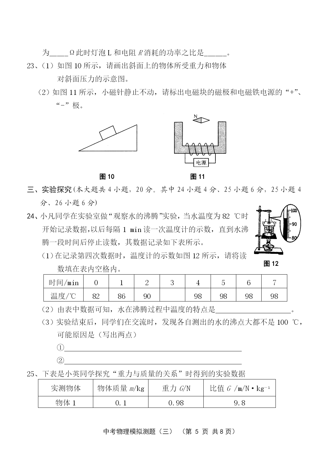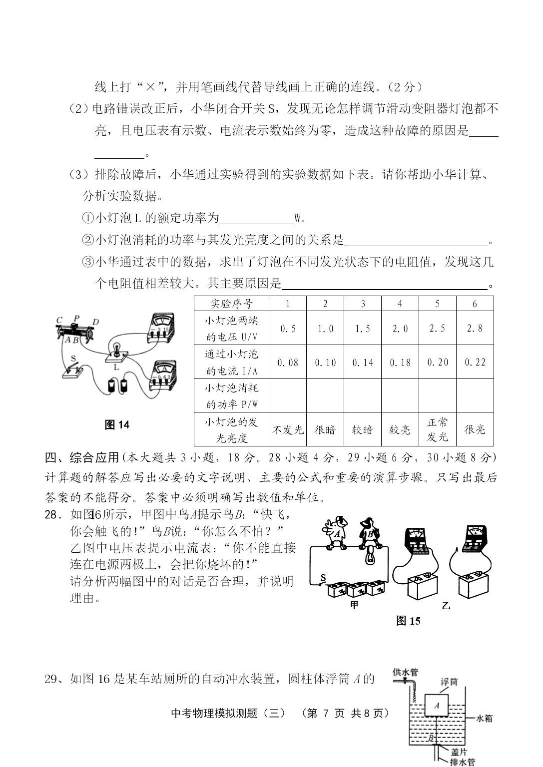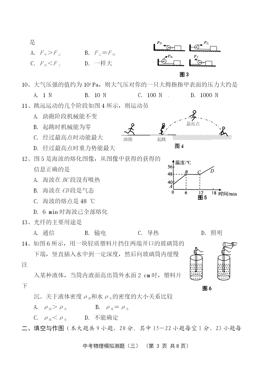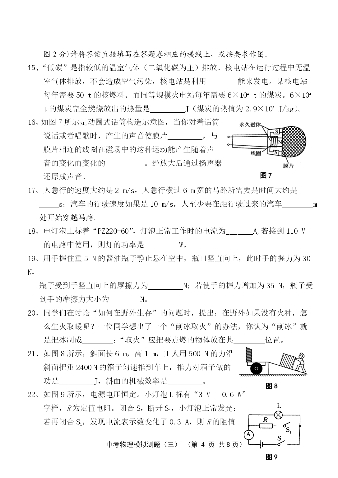 PAGE中考物理模拟测题(三)(第PAGE9页)中考物理模拟测试与评估(三)(本试卷共4大题,30小题;满分:100分;考试时间:90分钟)注意事项:1.答案一律填写在答题卷上,在试题卷上作答无效。考试结束,将本试卷和答题卷一并交回。2.解答选择题时,请用2B铅笔在答题卷上将选定的答案标点涂黑。3.解答非选择题部分必须使用0.5mm黑色签字笔书写在答题卷相应位置上。一、单项选择(每小题3分,共42分。每小题给出的四个选项中,只有一个是正确的。用2B铅笔把答题卷上对应题目的答案标号涂黑。每小题选对的给3分,不选、多选或选错的均给0分。)1、“北风乱/夜未央/你的影子剪不断/徒留我孤单/在湖面/成双/”是《菊花台》中的一段歌词。以下对“成双”的理解,正确的是A.“我”和“你”成双B.“我”和“你的影子”成双C.“我”和湖面反射的“我的影子”成双D.“我”和湖面折射的“我的影子”成双2、在“探究凸透镜成像规律”的实验中,当烛焰离凸透镜的距离小于焦距时,眼睛通过透镜观察到的虚像的情况是图1的ABCD图13、人类对原子结构的探究最早是从静电现象开始的,对静电现象的认识,下列说法中正确的是A.自然界中只存在正、负两种电荷B.同种电荷相互吸引,异种电荷相互排斥C.从静电现象认识到原子核是可分的D.摩擦起电创造了电荷4、小轿车上大都装有一个指示灯,用它来提醒司机或乘客车门是否关好。四个车门中只要有一个车门没关好(相当于一个开关断开),该指示灯就会发光。图2为小明同学设计的模拟电路图,你认为最符合要求的是图25、关于安全用电,下列说法不正确的是A.家庭电路中空气开关跳闸一定是发生了短路B.家庭电路中发生触电事故,通常是人体直接或间接跟火线接触造成的C.使用电笔时,手指按住笔卡,用笔尖接触被测的导线,手指不能碰到笔尖D.三孔插座比两孔插座多的那个孔是用来跟地线连接的6、在下列电器中,利用磁场对电流作用的原理来工作的是A.电动机B.发电机C.电磁铁D.白炽灯7、婴儿从呱呱坠地的那时起,就无时无刻不与声打交道,下列关于声的说法,错误的是A.我们能听到远处的雷声,说明空气可以传声B.人在岸上大声说话也能惊动水中的鱼,说明水能传声C.将耳朵贴在长钢管的一端,让他人在另一端敲击一下,你会听到两次敲击声,其中最先听到的声音是通过空气传来的D.宇航员在太空中不能直接对话,说明真空不能传声8、坐在原来做匀速直线运动的汽车里的人,身体突然向右倾斜,这可能是A.汽车正在加速B.汽车正在减速C.汽车正在向左拐弯D.汽车正在向右拐弯9、如图3所示,在用滑轮将同一物体沿相同水平地面匀速移动时,拉力分别为F甲、F乙、F丙、F丁,比较它们的大小(不计滑轮重及滑轮与细绳间的摩擦),正确的是A.F甲>F乙B.F乙=F丙C.F丙<F丁D.一样大图310、大气压强的值约为105Pa,则大气压对你的一只大拇指指甲表面的压力大约是A.1NB.10NC.100ND.1000N11、跳远运动的几个阶段如图4所示,则运动员图4助跑最高点起跳A.助跑阶段机械能不变B.起跳时机械能为零C.经过最高点时动能最大D.经过最高点时重力势能最大12、图5是海波的熔化图像,从图像中获得的获得的信息正确的是图5A.海波在BC段没有吸热B.海波在CD段是气态C.海波的熔点是48℃D.6min时海波已全部熔化图613、光纤的主要用途是A.通信B.输电C.导热D.照明14、如图6所示,用一块轻质塑料片挡住两端开口的玻璃筒的下端,竖直插入水中到一定深度,然后向玻璃筒内缓慢注入某种液体,当筒内液面高出筒外水面2cm时,塑料片下沉。关于液体密度ρ液和水ρ水的密度的大小关系比较A.ρ液>ρ水B.ρ液=ρ水C.ρ液<ρ水D.不能确定二、填空与作图(本大题共9小题,20分。其中15—22小题每空1分,23小题每图2分)请将答案直接填写在答题卷相应的横线上,或按要求作图。15、“低碳”是指较低的温室气体(二氧化碳为主)排放、核电站在运行过程中无温室气体排放,不会造成空气污染,核电站是利用能来发电。某核电站每年需要50t的核燃料。而同等规模火电站每年需要6×104t的煤炭。6×104t的煤炭完全燃烧放出的热量是J(煤炭的热值为2.9×107J/kg)。16、如图7所示是动圈式话筒构造示意图,当你对着话筒说话或者唱歌时,产生的声音使膜片,与膜片相连的线圈在磁场中的这种运动能产生随着声音的变化而变化的。经放大后通过扬声器还原图7成声音。17、人急