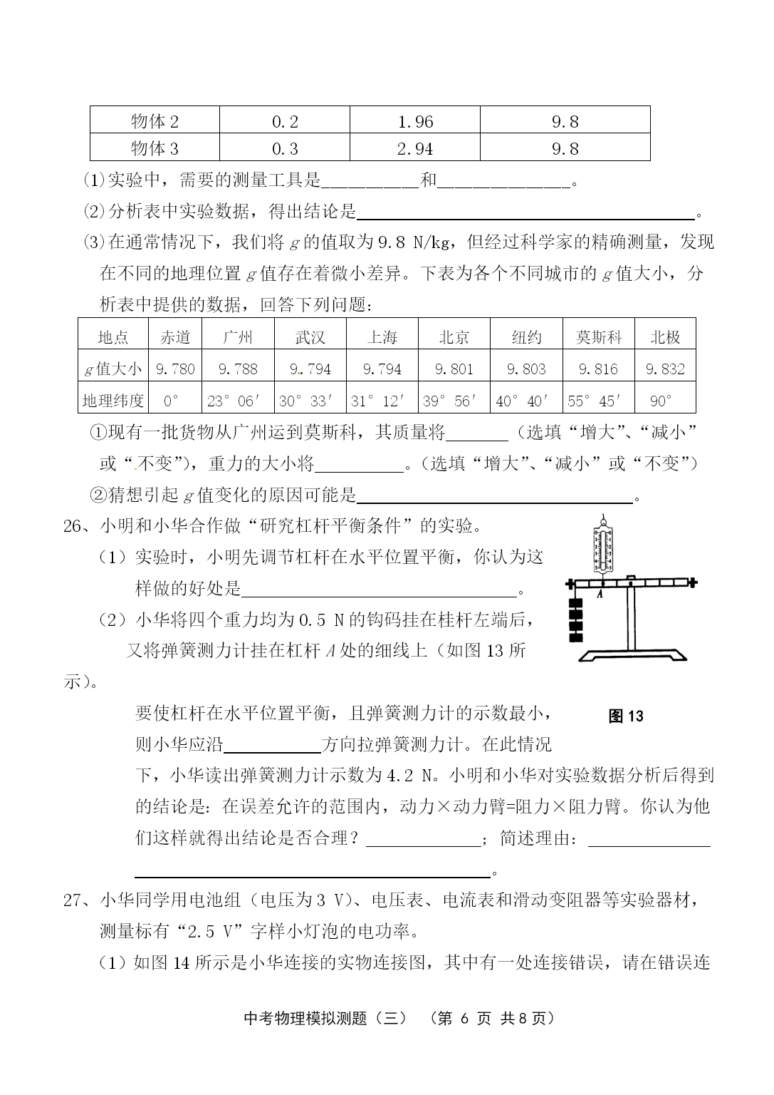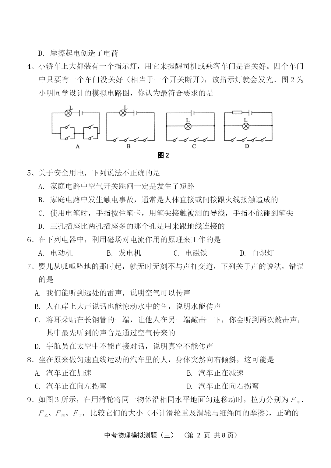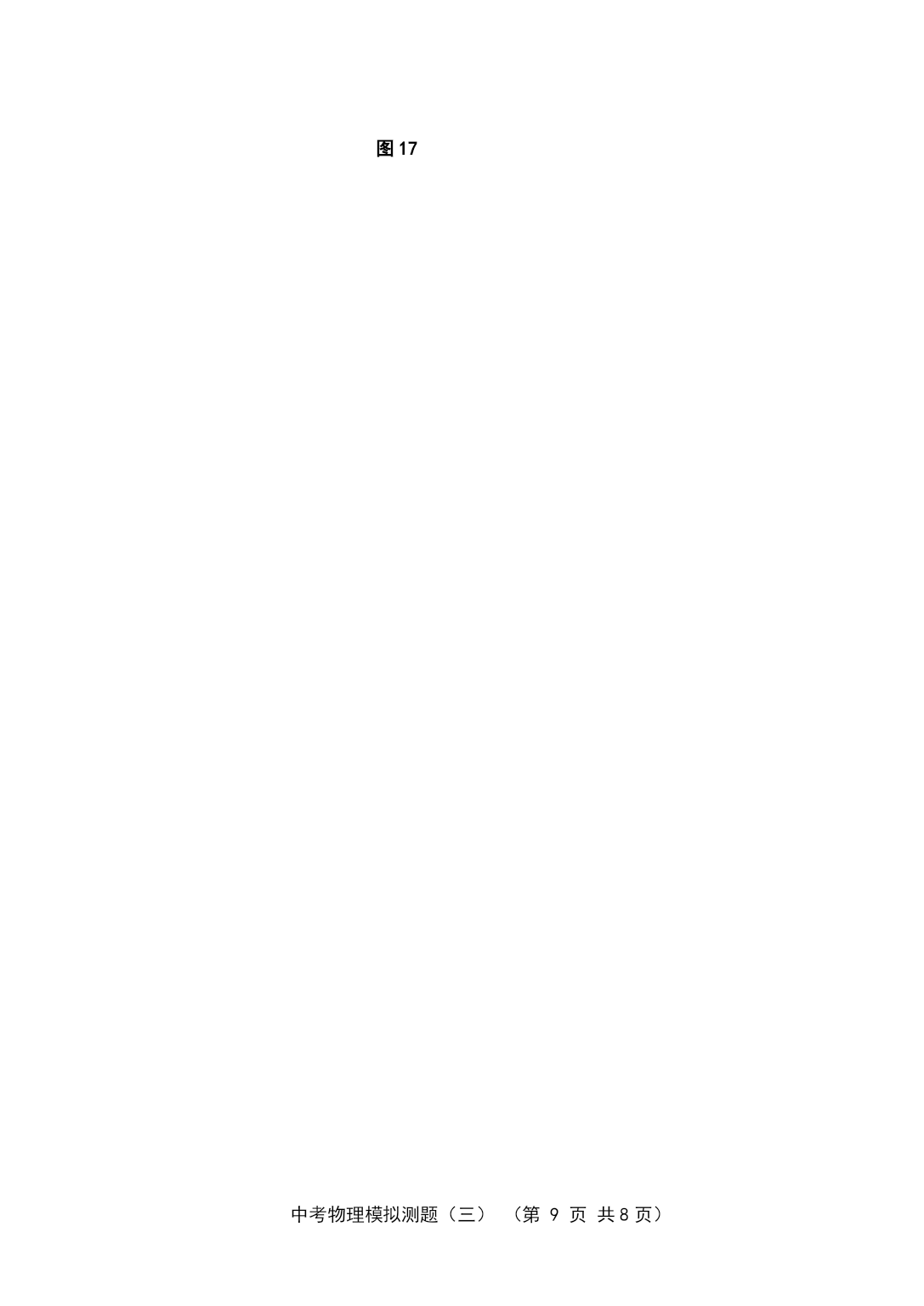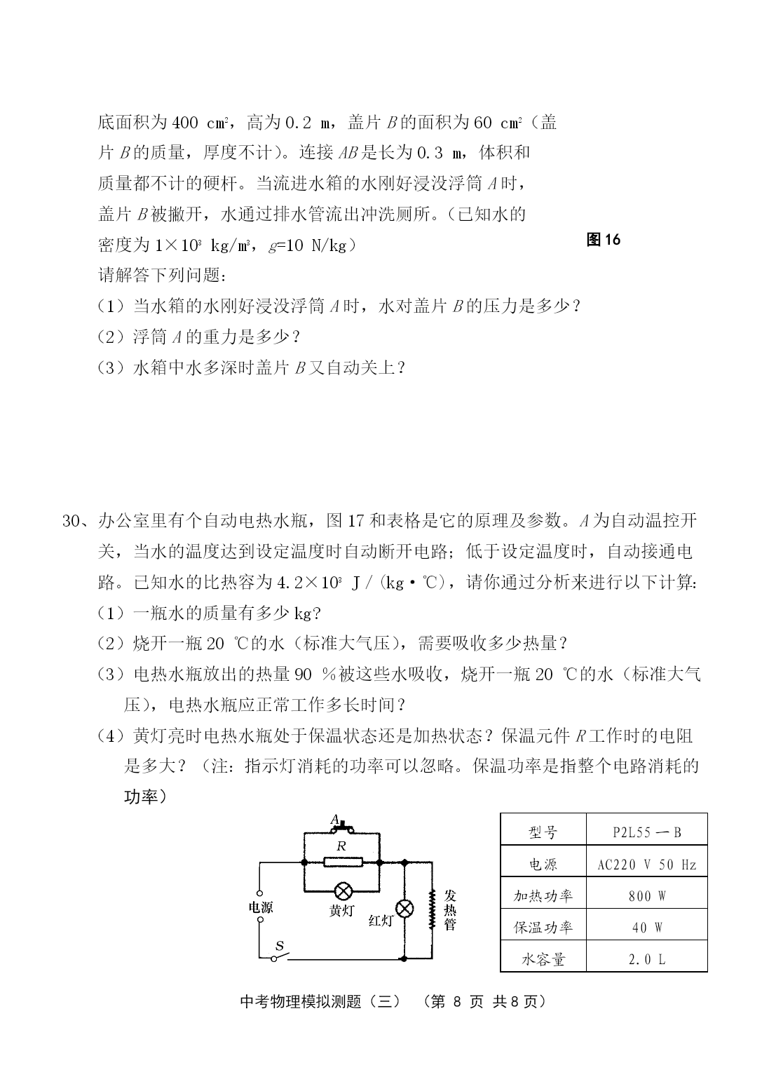 PAGE中考物理模拟测题(三)(第PAGE9页)中考物理模拟测试与评估(三)(本试卷共4大题,30小题;满分:100分;考试时间:90分钟)注意事项:1.答案一律填写在答题卷上,在试题卷上作答无效。考试结束,将本试卷和答题卷一并交回。2.解答选择题时,请用2B铅笔在答题卷上将选定的答案标点涂黑。3.解答非选择题部分必须使用0.5mm黑色签字笔书写在答题卷相应位置上。一、单项选择(每小题3分,共42分。每小题给出的四个选项中,只有一个是正确的。用2B铅笔把答题卷上对应题目的答案标号涂黑。每小题选对的给3分,不选、多选或选错的均给0分。)1、“北风乱/夜未央/你的影子剪不断/徒留我孤单/在湖面/成双/”是《菊花台》中的一段歌词。以下对“成双”的理解,正确的是A.“我”和“你”成双B.“我”和“你的影子”成双C.“我”和湖面反射的“我的影子”成双D.“我”和湖面折射的“我的影子”成双2、在“探究凸透镜成像规律”的实验中,当烛焰离凸透镜的距离小于焦距时,眼睛通过透镜观察到的虚像的情况是图1的ABCD图13、人类对原子结构的探究最早是从静电现象开始的,对静电现象的认识,下列说法中正确的是A.自然界中只存在正、负两种电荷B.同种电荷相互吸引,异种电荷相互排斥C.从静电现象认识到原子核是可分的D.摩擦起电创造了电荷4、小轿车上大都装有一个指示灯,用它来提醒司机或乘客车门是否关好。四个车门中只要有一个车门没关好(相当于一个开关断开),该指示灯就会发光。图2为小明同学设计的模拟电路图,你认为最符合要求的是图25、关于安全用电,下列说法不正确的是A.家庭电路中空气开关跳闸一定是发生了短路B.家庭电路中发生触电事故,通常是人体直接或间接跟火线接触造成的C.使用电笔时,手指按住笔卡,用笔尖接触被测的导线,手指不能碰到笔尖D.三孔插座比两孔插座多的那个孔是用来跟地线连接的6、在下列电器中,利用磁场对电流作用的原理来工作的是A.电动机B.发电机C.电磁铁D.白炽灯7、婴儿从呱呱坠地的那时起,就无时无刻不与声打交道,下列关于声的说法,错误的是A.我们能听到远处的雷声,说明空气可以传声B.人在岸上大声说话也能惊动水中的鱼,说明水能传声C.将耳朵贴在长钢管的一端,让他人在另一端敲击一下,你会听到两次敲击声,其中最先听到的声音是通过空气传来的D.宇航员在太空中不能直接对话,说明真空不能传声8、坐在原来做匀速直线运动的汽车里的人,身体突然向右倾斜,这可能是A.汽车正在加速B.汽车正在减速C.汽车正在向左拐弯D.汽车正在向右拐弯9、如图3所示,在用滑轮将同一物体沿相同水平地面匀速移动时,拉力分别为F甲、F乙、F丙、F丁,比较它们的大小(不计滑轮重及滑轮与细绳间的摩擦),正确的是A.F甲>F乙B.F乙=F丙C.F丙<F丁D.一样大图310、大气压强的值约为105Pa,则大气压对你的一只大拇指指甲表面的压力大约是A.1NB.10NC.100ND.1000N11、跳远运动的几个阶段如图4所示,则运动员图4助跑最高点起跳A.助跑阶段机械能不变B.起跳时机械能为零C.经过最高点时动能最大D.经过最高点时重力势能最大12、图5是海波的熔化图像,从图像中获得的获得的信息正确的是图5A.海波在BC段没有吸热B.海波在CD段是气态C.海波的熔点是48℃D.6min时海波已全部熔化图613、光纤的主要用途是A.通信B.输电C.导热D.照明14、如图6所示,用一块轻质塑料片挡住两端开口的玻璃筒的下端,竖直插入水中到一定深度,然后向玻璃筒内缓慢注入某种液体,当筒内液面高出筒外水面2cm时,塑料片下沉。关于液体密度ρ液和水ρ水的密度的大小关系比较A.ρ液>ρ水B.ρ液=ρ水C.ρ液<ρ水D.不能确定二、填空与作图(本大题共9小题,20分。其中15—22小题每空1分,23小题每图2分)请将答案直接填写在答题卷相应的横线上,或按要求作图。15、“低碳”是指较低的温室气体(二氧化碳为主)排放、核电站在运行过程中无温室气体排放,不会造成空气污染,核电站是利用能来发电。某核电站每年需要50t的核燃料。而同等规模火电站每年需要6×104t的煤炭。6×104t的煤炭完全燃烧放出的热量是J(煤炭的热值为2.9×107J/kg)。16、如图7所示是动圈式话筒构造示意图,当你对着话筒说话或者唱歌时,产生的声音使膜片,与膜片相连的线圈在磁场中的这种运动能产生随着声音的变化而变化的。经放大后通过扬声器还原图7成声音。17、人急