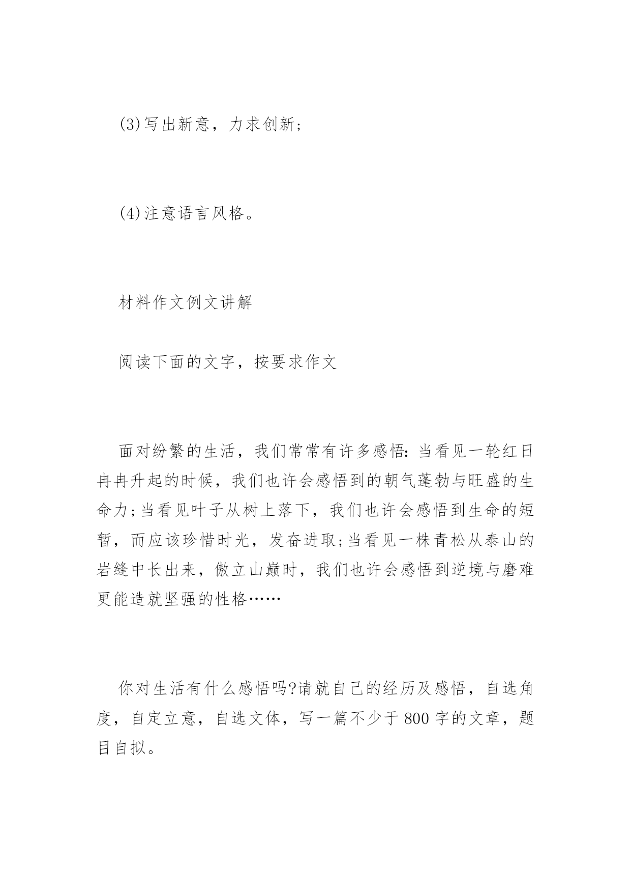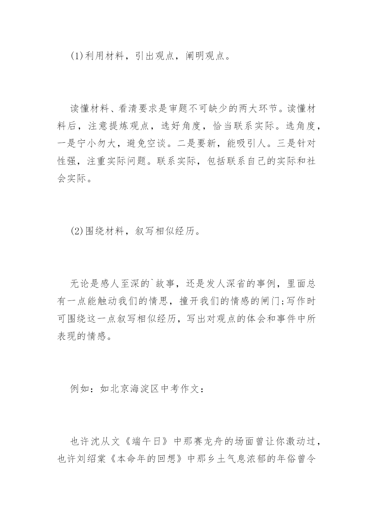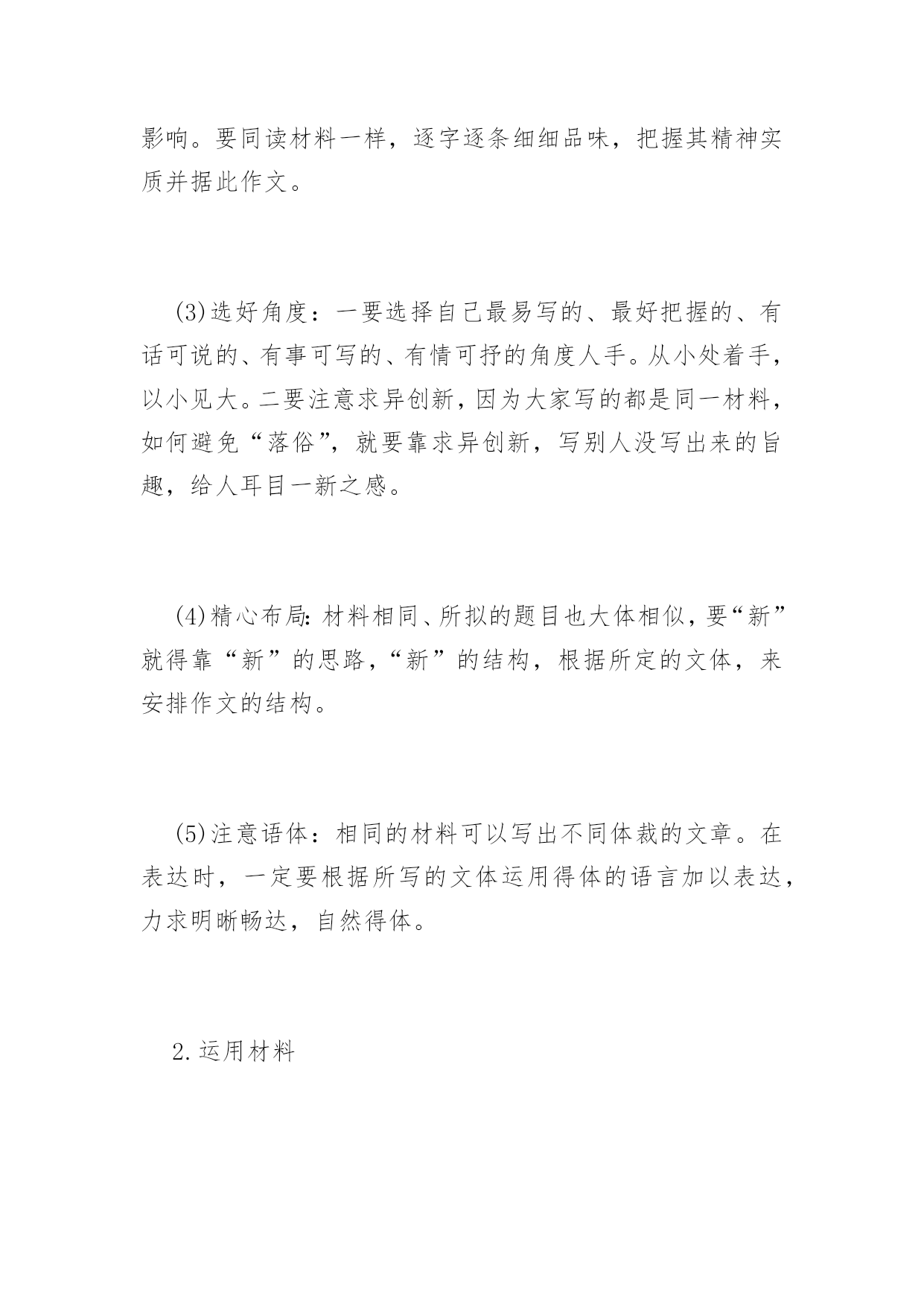 中考写好材料作文的方法技巧2017中考写好材料作文的方法技巧材料作文是只给材料不给题目,题目的确定,完全是靠应试者自己对所给材料的理解与把握而定。下面是小编为你整理的2017中考写好材料作文的方法技巧,欢迎阅读。写好材料作文的方法技巧1.审题材料作文审题侧重于两个方面:一是要弄清题意,二是要明确要求,可采用下列步骤:(1)读懂材料:针对不同类型材料的不同意蕴,找出你感受最深的细节,抓住材料的中心。(2)看清要求:材料作文的耍求是考生作文应遵循的法则,如果对相关要求把握不准,理解不透就会给审题和作文带来影响。要同读材料一样,逐字逐条细细品味,把握其精神实质并据此作文。(3)选好角度:一要选择自己最易写的、最好把握的、有话可说的、有事可写的、有情可抒的角度人手。从小处着手,以小见大。二要注意求异创新,因为大家写的都是同一材料,如何避免“落俗”,就要靠求异创新,写别人没写出来的旨趣,给人耳目一新之感。(4)精心布局:材料相同、所拟的题目也大体相似,要“新”就得靠“新”的思路,“新”的结构,根据所定的文体,来安排作文的结构。(5)注意语体:相同的材料可以写出不同体裁的文章。在表达时,一定要根据所写的文体运用得体的语言加以表达,力求明晰畅达,自然得体。2.运用材料(1)利用材料,引出观点,阐明观点。读懂材料、看清要求是审题不可缺少的两大环节。读懂材料后,注意提炼观点,选好角度,恰当联系实际。选角度,一是宁小勿大,避免空谈。二是要新,能吸引人。三是针对性强,注重实际问题。联系实际,包括联系自己的实际和社会实际。(2)围绕材料,叙写相似经历。无论是感人至深的`故事,还是发人深省的事例,里面总有一点能触动我们的情思,撞开我们的情感的闸门;写作时可围绕这一点叙写相似经历,写出对观点的体会和事件中所表现的情感。例如:如北京海淀区中考作文:也许沈从文《端午日》中那赛龙舟的场面曾让你激动过,也许刘绍棠《本命年的回想》中那乡土气息浓郁的年俗曾令你向往过。是啊,我们有那么多充满民族特色的传统节日:春节、元宵节、端午节、中秋节、重阳节。近年来,像圣诞节、愚人节、母亲节这些西方的节日,也开始在我们这块古老的土地上“闪亮登场”,而且受到了一些人尤其是年轻人的青睐。你了解某个节日的来历、风俗吗?回首往事,哪个节日最令你难以忘怀?对于中国统传节日和西方节日,你有哪些看法和感受?请你从以上三个角度中任选一个,自拟题目,写一篇作文。【材料解析】从上述材料,我们能强烈感受到入题有三个角度可选,写作空间大,感情的琴弦容易拨响,记忆的闸门容易打开,可回忆某个难忘的节日的人与事,可抒发自己对节日的感悟,还可大发感慨,写篇议论文。3.写作步骤(1)读懂材料,确定切题点;(2)明确要求,按要求行文;(3)写出新意,力求创新;(4)注意语言风格。材料作文例文讲解阅读下面的文字,按要求作文面对纷繁的生活,我们常常有许多感悟:当看见一轮红日冉冉升起的时候,我们也许会感悟到的朝气蓬勃与旺盛的生命力;当看见叶子从树上落下,我们也许会感悟到生命的短暂,而应该珍惜时光,发奋进取;当看见一株青松从泰山的岩缝中长出来,傲立山巅时,我们也许会感悟到逆境与磨难更能造就坚强的性格……你对生活有什么感悟吗?请就自己的经历及感悟,自选角度,自定立意,自选文体,写一篇不少于800字的文章,题目自拟。[写作提示]这是一道新材料作文试题,在材料中,给出了多种自然现象及可以参悟的人生哲理,要求考生“就自己的经历及感悟”自选角度,写一篇作文。在此特别提醒考生,近年来高考作文命题越来越注重引导考生贴近现实生活,贴近自己的生活经历,写出有真情实感的作文,这一道作文试题,就很好地体现了这种命题导向。“就自己的经历及感悟”作文,就要求考生必须写自己的亲身经历,写自己的真实感悟,而不能以写他人为主,不能天南海北、古今中外地泛泛而谈。另外,考生要注意写出感悟,感悟不是一般的酸甜苦辣的浅层感受,而是要在记述经历的`基础上,层层开掘,参悟出深刻的人生哲理。站在高处看世界“会当凌绝顶,一览众山小”。站在高处看世界,世界将是另一番景象,而人的心灵将是别样的清爽和豁达。去年刚放暑假时的那段日子,是我人生中特别晦暗的时光。倒不是因为我的学业成绩排名亮了红灯,而是平时一向排在我之后的同桌,这次竟然排在我前头。她的姓名,沉沉地压在了我的心头,压得我真有点喘不过气来。愁苦之中我不禁扼腕长叹:“上帝啊,既生瑜,何生亮也!”不久,一次偶然的苏杭之旅,让我的心胸改变了“景观”。那天阳光很好,空气清新。早上一醒来,爸爸就告诉我一个惊人的好消息,爸妈单位也放了长假,他们要带我一起去苏杭旅游。“上有天堂,下有苏杭”,去苏杭旅游是我多年的梦想,今日如愿以偿,我高兴得跳起拉丁舞来。未了,还破天荒