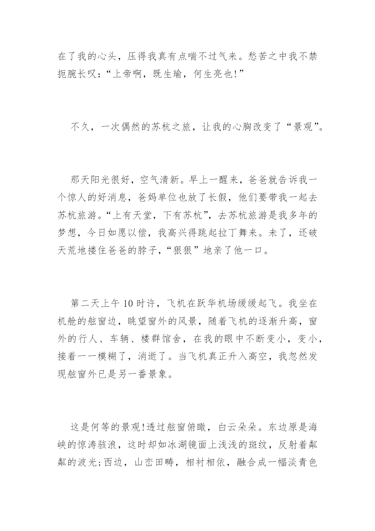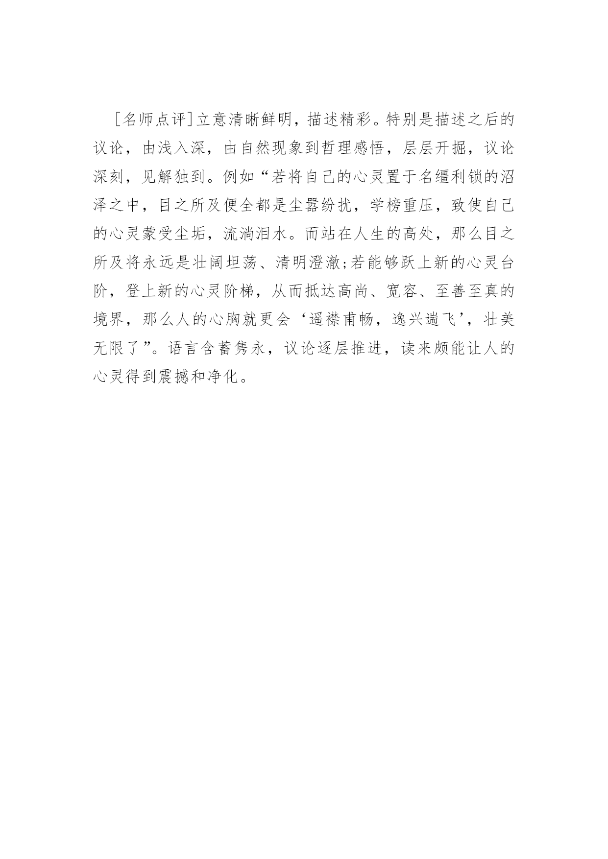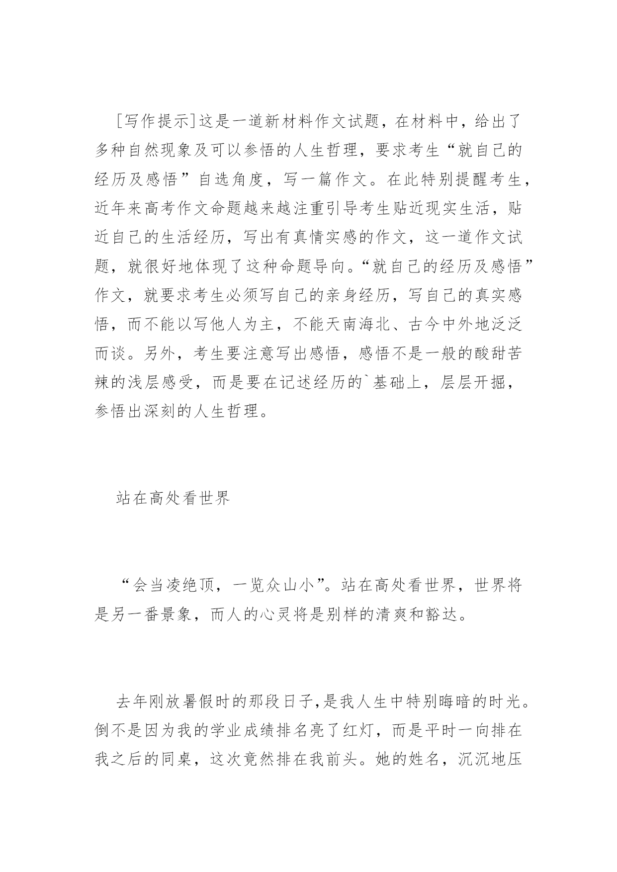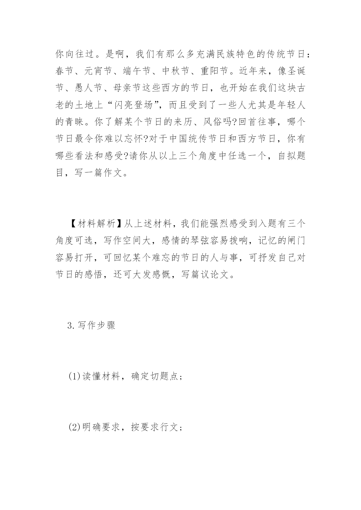 中考写好材料作文的方法技巧2017中考写好材料作文的方法技巧材料作文是只给材料不给题目,题目的确定,完全是靠应试者自己对所给材料的理解与把握而定。下面是小编为你整理的2017中考写好材料作文的方法技巧,欢迎阅读。写好材料作文的方法技巧1.审题材料作文审题侧重于两个方面:一是要弄清题意,二是要明确要求,可采用下列步骤:(1)读懂材料:针对不同类型材料的不同意蕴,找出你感受最深的细节,抓住材料的中心。(2)看清要求:材料作文的耍求是考生作文应遵循的法则,如果对相关要求把握不准,理解不透就会给审题和作文带来影响。要同读材料一样,逐字逐条细细品味,把握其精神实质并据此作文。(3)选好角度:一要选择自己最易写的、最好把握的、有话可说的、有事可写的、有情可抒的角度人手。从小处着手,以小见大。二要注意求异创新,因为大家写的都是同一材料,如何避免“落俗”,就要靠求异创新,写别人没写出来的旨趣,给人耳目一新之感。(4)精心布局:材料相同、所拟的题目也大体相似,要“新”就得靠“新”的思路,“新”的结构,根据所定的文体,来安排作文的结构。(5)注意语体:相同的材料可以写出不同体裁的文章。在表达时,一定要根据所写的文体运用得体的语言加以表达,力求明晰畅达,自然得体。2.运用材料(1)利用材料,引出观点,阐明观点。读懂材料、看清要求是审题不可缺少的两大环节。读懂材料后,注意提炼观点,选好角度,恰当联系实际。选角度,一是宁小勿大,避免空谈。二是要新,能吸引人。三是针对性强,注重实际问题。联系实际,包括联系自己的实际和社会实际。(2)围绕材料,叙写相似经历。无论是感人至深的`故事,还是发人深省的事例,里面总有一点能触动我们的情思,撞开我们的情感的闸门;写作时可围绕这一点叙写相似经历,写出对观点的体会和事件中所表现的情感。例如:如北京海淀区中考作文:也许沈从文《端午日》中那赛龙舟的场面曾让你激动过,也许刘绍棠《本命年的回想》中那乡土气息浓郁的年俗曾令你向往过。是啊,我们有那么多充满民族特色的传统节日:春节、元宵节、端午节、中秋节、重阳节。近年来,像圣诞节、愚人节、母亲节这些西方的节日,也开始在我们这块古老的土地上“闪亮登场”,而且受到了一些人尤其是年轻人的青睐。你了解某个节日的来历、风俗吗?回首往事,哪个节日最令你难以忘怀?对于中国统传节日和西方节日,你有哪些看法和感受?请你从以上三个角度中任选一个,自拟题目,写一篇作文。【材料解析】从上述材料,我们能强烈感受到入题有三个角度可选,写作空间大,感情的琴弦容易拨响,记忆的闸门容易打开,可回忆某个难忘的节日的人与事,可抒发自己对节日的感悟,还可大发感慨,写篇议论文。3.写作步骤(1)读懂材料,确定切题点;(2)明确要求,按要求行文;(3)写出新意,力求创新;(4)注意语言风格。材料作文例文讲解阅读下面的文字,按要求作文面对纷繁的生活,我们常常有许多感悟:当看见一轮红日冉冉升起的时候,我们也许会感悟到的朝气蓬勃与旺盛的生命力;当看见叶子从树上落下,我们也许会感悟到生命的短暂,而应该珍惜时光,发奋进取;当看见一株青松从泰山的岩缝中长出来,傲立山巅时,我们也许会感悟到逆境与磨难更能造就坚强的性格……你对生活有什么感悟吗?请就自己的经历及感悟,自选角度,自定立意,自选文体,写一篇不少于800字的文章,题目自拟。[写作提示]这是一道新材料作文试题,在材料中,给出了多种自然现象及可以参悟的人生哲理,要求考生“就自己的经历及感悟”自选角度,写一篇作文。在此特别提醒考生,近年来高考作文命题越来越注重引导考生贴近现实生活,贴近自己的生活经历,写出有真情实感的作文,这一道作文试题,就很好地体现了这种命题导向。“就自己的经历及感悟”作文,就要求考生必须写自己的亲身经历,写自己的真实感悟,而不能以写他人为主,不能天南海北、古今中外地泛泛而谈。另外,考生要注意写出感悟,感悟不是一般的酸甜苦辣的浅层感受,而是要在记述经历的`基础上,层层开掘,参悟出深刻的人生哲理。站在高处看世界“会当凌绝顶,一览众山小”。站在高处看世界,世界将是另一番景象,而人的心灵将是别样的清爽和豁达。去年刚放暑假时的那段日子,是我人生中特别晦暗的时光。倒不是因为我的学业成绩排名亮了红灯,而是平时一向排在我之后的同桌,这次竟然排在我前头。她的姓名,沉沉地压在了我的心头,压得我真有点喘不过气来。愁苦之中我不禁扼腕长叹:“上帝啊,既生瑜,何生亮也!”不久,一次偶然的苏杭之旅,让我的心胸改变了“景观”。那天阳光很好,空气清新。早上一醒来,爸爸就告诉我一个惊人的好消息,爸妈单位也放了长假,他们要带我一起去苏杭旅游。“上有天堂,下有苏杭”,去苏杭旅游是我多年的梦想,今日如愿以偿,我高兴得跳起拉丁舞来。未了,还破天荒