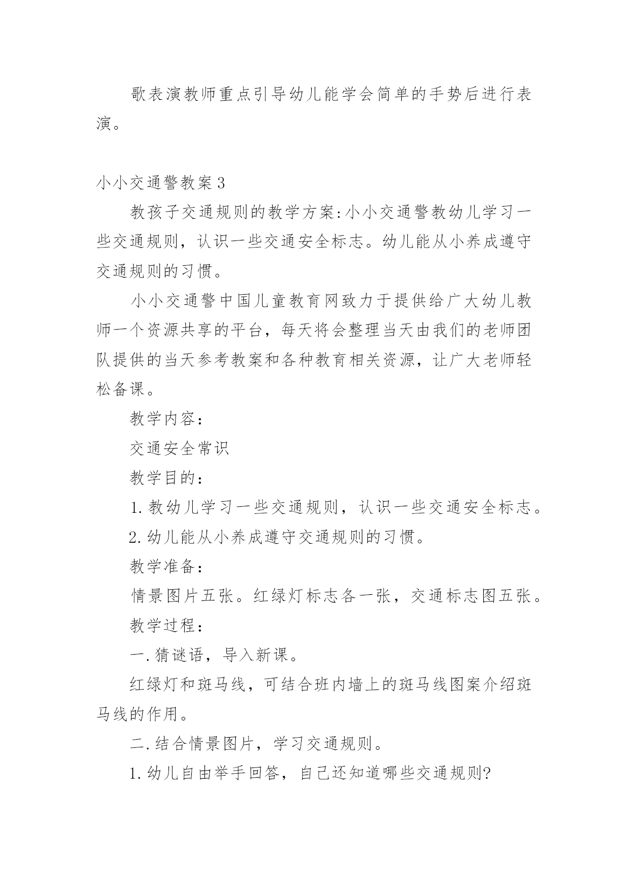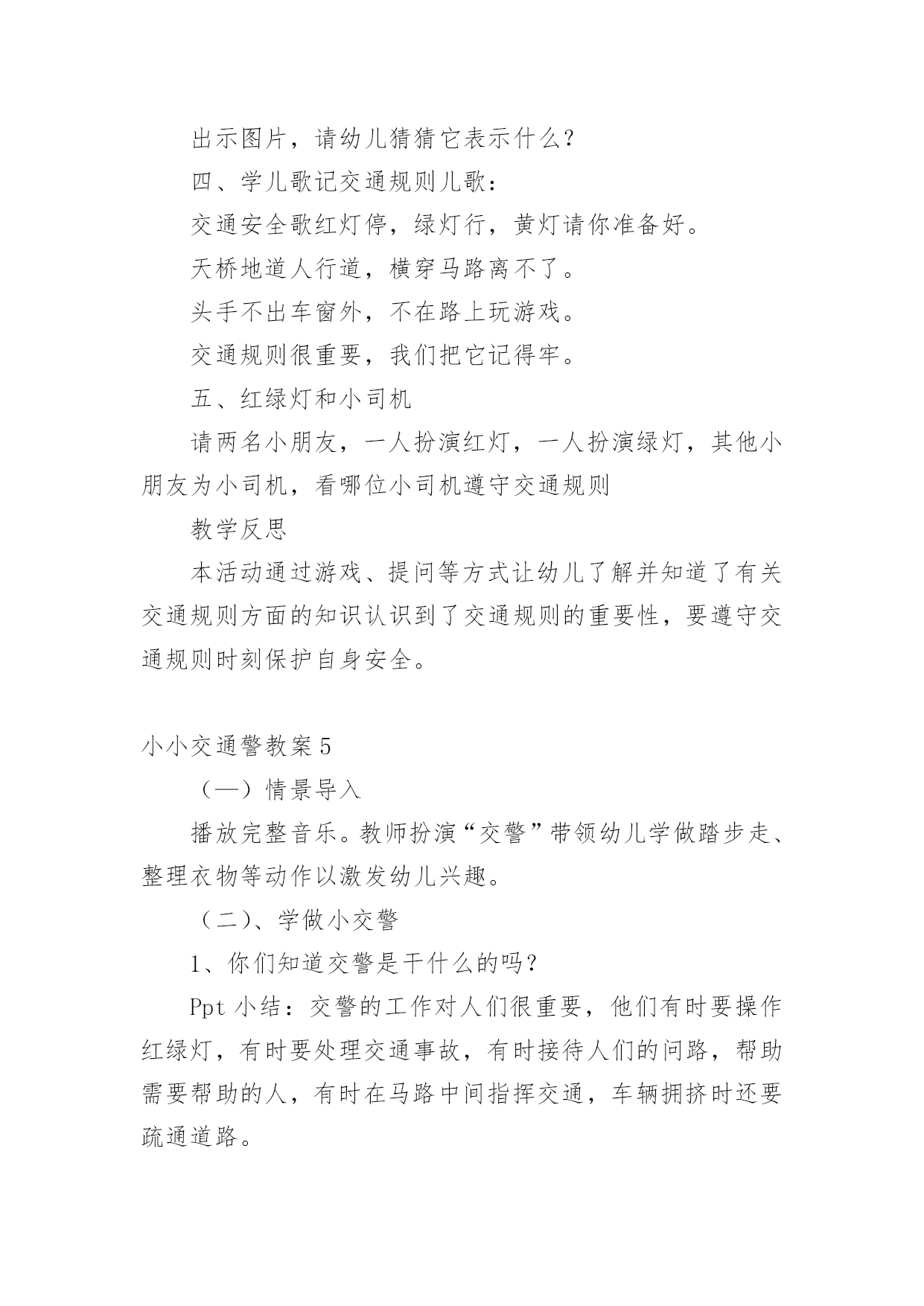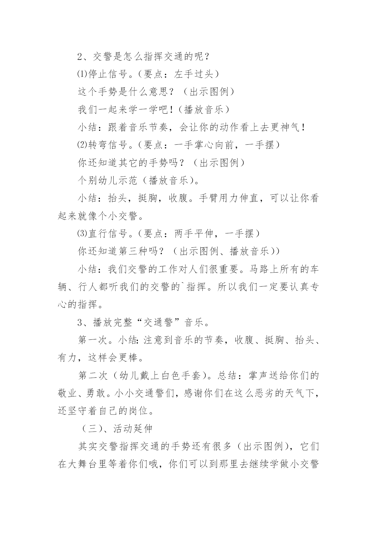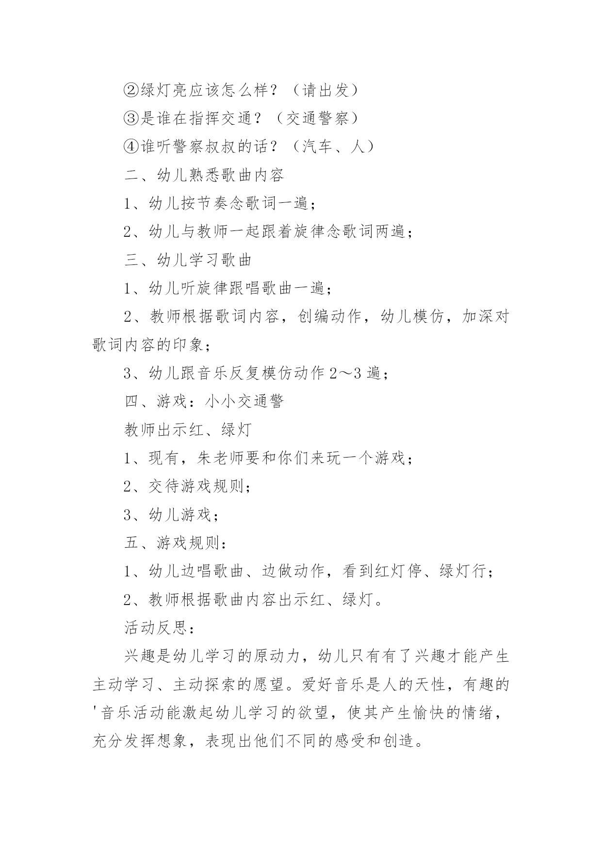 小小交通警教案作为一名辛苦耕耘的教育工作者,常常要根据教学需要编写教案,编写教案有利于我们弄通教材内容,进而选择科学、恰当的教学方法。那么优秀的教案是什么样的呢?下面是小编帮大家整理的小小交通警教案,欢迎阅读与收藏。小小交通警教案1活动目标:1、通过歌曲了解红灯停、绿灯行的道理。2、学会唱歌曲,了解歌曲内容。3、感受旋律的气氛以及和同伴一起参加集体音乐活动的乐趣。4、培养幼儿的音乐节奏感,发展幼儿的表现力。5、乐意参加音乐活动,体验音乐活动中的快乐。活动准备:1、红、绿两色圆形卡纸2、课前事先录好的歌曲旋律活动过程:一、幼儿欣赏歌曲,了解歌曲内容1、今天朱老师给小朋友带来了一首好听地歌曲,叫《小小交通警》,请你们听一听歌曲里都讲了些什么?2、幼儿欣赏歌曲一遍,并按节奏拍拍小手。3、提问:①红灯闪应该怎么样?(快停下)②绿灯亮应该怎么样?(请出发)③是谁在指挥交通?(交通警察)④谁听警察叔叔的话?(汽车、人)二、幼儿熟悉歌曲内容1、幼儿按节奏念歌词一遍;2、幼儿与教师一起跟着旋律念歌词两遍;三、幼儿学习歌曲1、幼儿听旋律跟唱歌曲一遍;2、教师根据歌词内容,创编动作,幼儿模仿,加深对歌词内容的印象;3、幼儿跟音乐反复模仿动作2~3遍;四、游戏:小小交通警教师出示红、绿灯1、现有,朱老师要和你们来玩一个游戏;2、交待游戏规则;3、幼儿游戏;五、游戏规则:1、幼儿边唱歌曲、边做动作,看到红灯停、绿灯行;2、教师根据歌曲内容出示红、绿灯。活动反思:兴趣是幼儿学习的原动力,幼儿只有有了兴趣才能产生主动学习、主动探索的愿望。爱好音乐是人的天性,有趣的'音乐活动能激起幼儿学习的欲望,使其产生愉快的情绪,充分发挥想象,表现出他们不同的感受和创造。小小交通警教案2活动目标:1、在学会歌曲的基础上,进行表演。2、了解交通警察的一些简单手势。3、懂得一些简单的交通规则。活动准备:音乐。活动过程:一、律动《小司机》1、今天我们小朋友都变成了小司机,现在就请你听交通警察的指挥开车吧!2、幼儿随音乐进行律动表演。二、师幼谈话。1、你看见谁在指挥交通?2、你看见了哪些有趣的动作?3、幼儿自由地做一做自己喜欢的.动作。三、幼儿欣赏歌曲。你刚才听到了什么?(教师根据幼儿的回答进行范唱)四、学唱歌曲。1、教师出示红绿灯,念歌词。2、节奏练习:根据歌词念节奏。3、幼儿学唱。五、游戏。歌表演教师重点引导幼儿能学会简单的手势后进行表演。小小交通警教案3教孩子交通规则的教学方案:小小交通警教幼儿学习一些交通规则,认识一些交通安全标志。幼儿能从小养成遵守交通规则的习惯。小小交通警中国儿童教育网致力于提供给广大幼儿教师一个资源共享的平台,每天将会整理当天由我们的老师团队提供的当天参考教案和各种教育相关资源,让广大老师轻松备课。教学内容:交通安全常识教学目的:1.教幼儿学习一些交通规则,认识一些交通安全标志。2.幼儿能从小养成遵守交通规则的习惯。教学准备:情景图片五张。红绿灯标志各一张,交通标志图五张。教学过程:一.猜谜语,导入新课。红绿灯和斑马线,可结合班内墙上的斑马线图案介绍斑马线的作用。二.结合情景图片,学习交通规则。1.幼儿自由举手回答,自己还知道哪些交通规则?2.幼儿说出来的可结合图片讲解,没想到的出示图片,说说图片上的幼儿做的对不对,应该怎样做才是遵守交通规则。三.认识交通安全标志。出示图片,请幼儿猜猜它表示什么?四.学儿歌记交通规则儿歌:交通安全歌红灯停,绿灯行,黄灯请你准备好。天桥地道人行道,横穿马路离不了。头手不出车窗外,不在路上玩游戏。交通规则很重要,我们把它记得牢。五.红绿灯和小司机请两名小朋友,一人扮演红灯,一人扮演绿灯,其他小朋友为小司机,看哪位小司机遵守交通规则。教孩子学会危险的东西不要碰在《我找到的危险》活动中,孩子找到了许多危险,观察到幼儿的兴趣很浓,于是我同孩子一起生成了这样一节教学活动。让孩子通过歌曲创编的形式加深幼儿自我保护意识。危险的东西不要碰中国儿童教育网致力于提供给广大幼儿教师一个资源共享的平台,每天将会整理当天由我们的老师团队提供的当天参考教案和各种教育相关资源,让广大老师轻松备课。设计意图:在《我找到的危险》活动中,孩子找到了许多危险,观察到幼儿的兴趣很浓,于是我同孩子一起生成了这样一节教学活动。让孩子通过歌曲创编的形式加深幼儿自我保护意识。活动目标:1、幼儿能基本掌握歌曲旋律,理解歌词含义;2、能在理解歌词后在原歌词上进行创编,并乐意创编歌词;3、知道身边有哪些危险,并学会保护自己和提醒朋友注意安全。4、培养幼儿动脑思考问题、解决问题的能力。5、知道危险来临时如何保护自己,如何逃生。活动准备:1、打火机、插座、暖水瓶、药瓶图片各一。一个幼儿被火烧手指、一个幼儿被电到、一幼儿被烫到、一幼儿倒下的图片。2、图的注释。如:打火机(