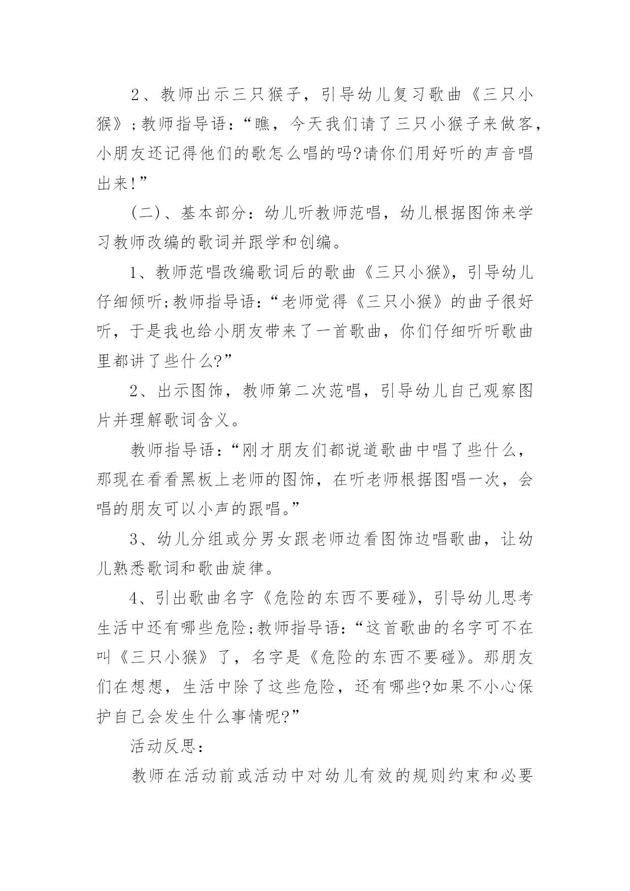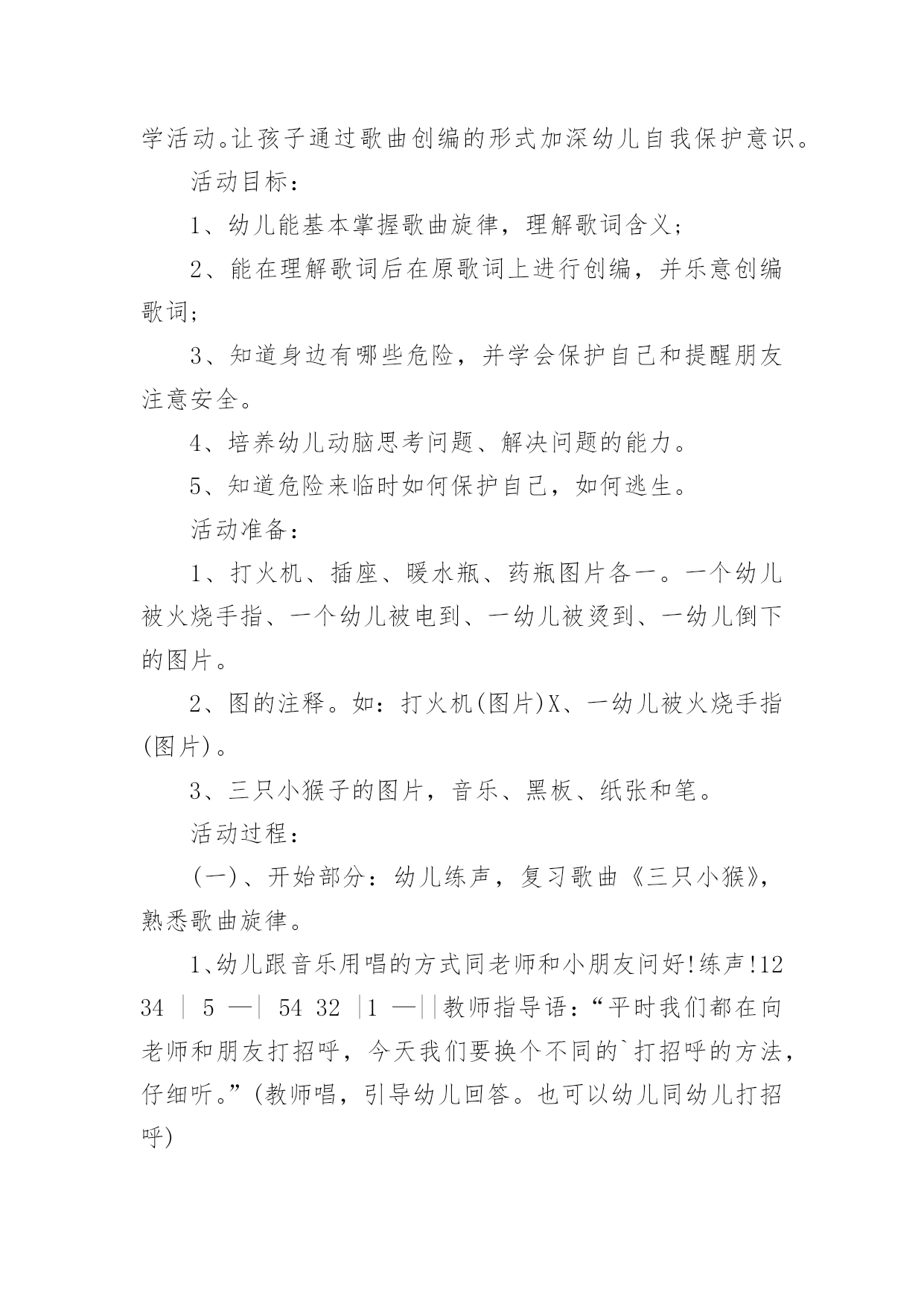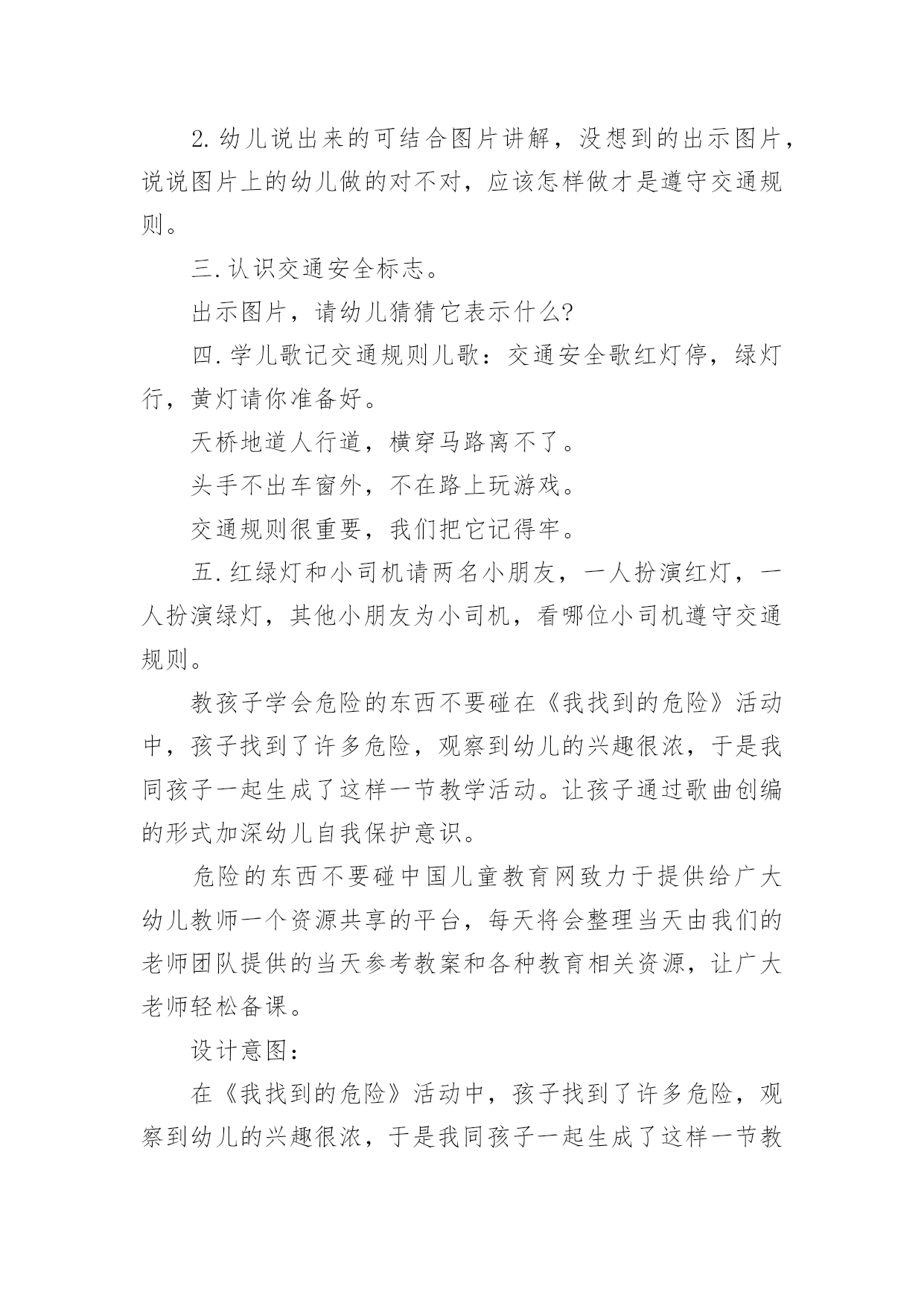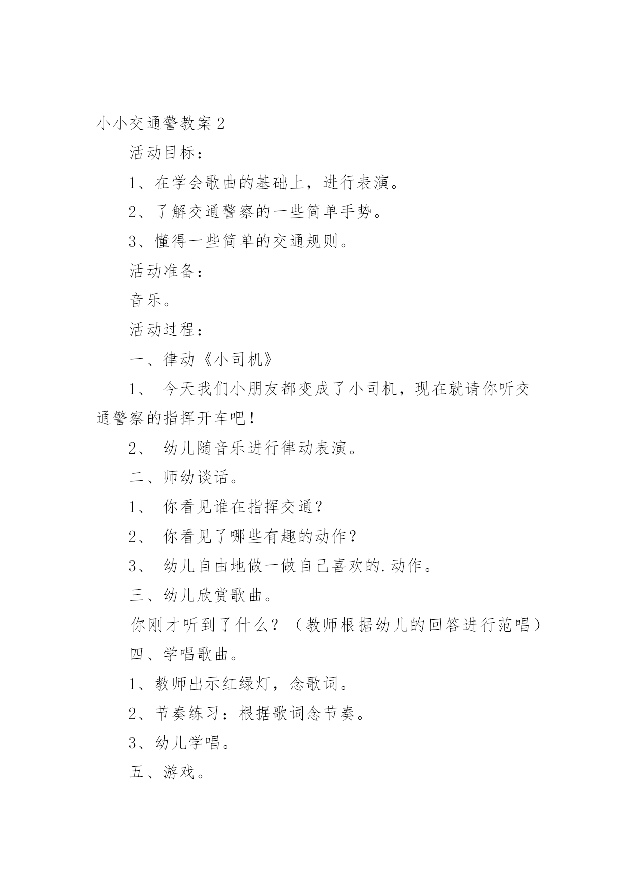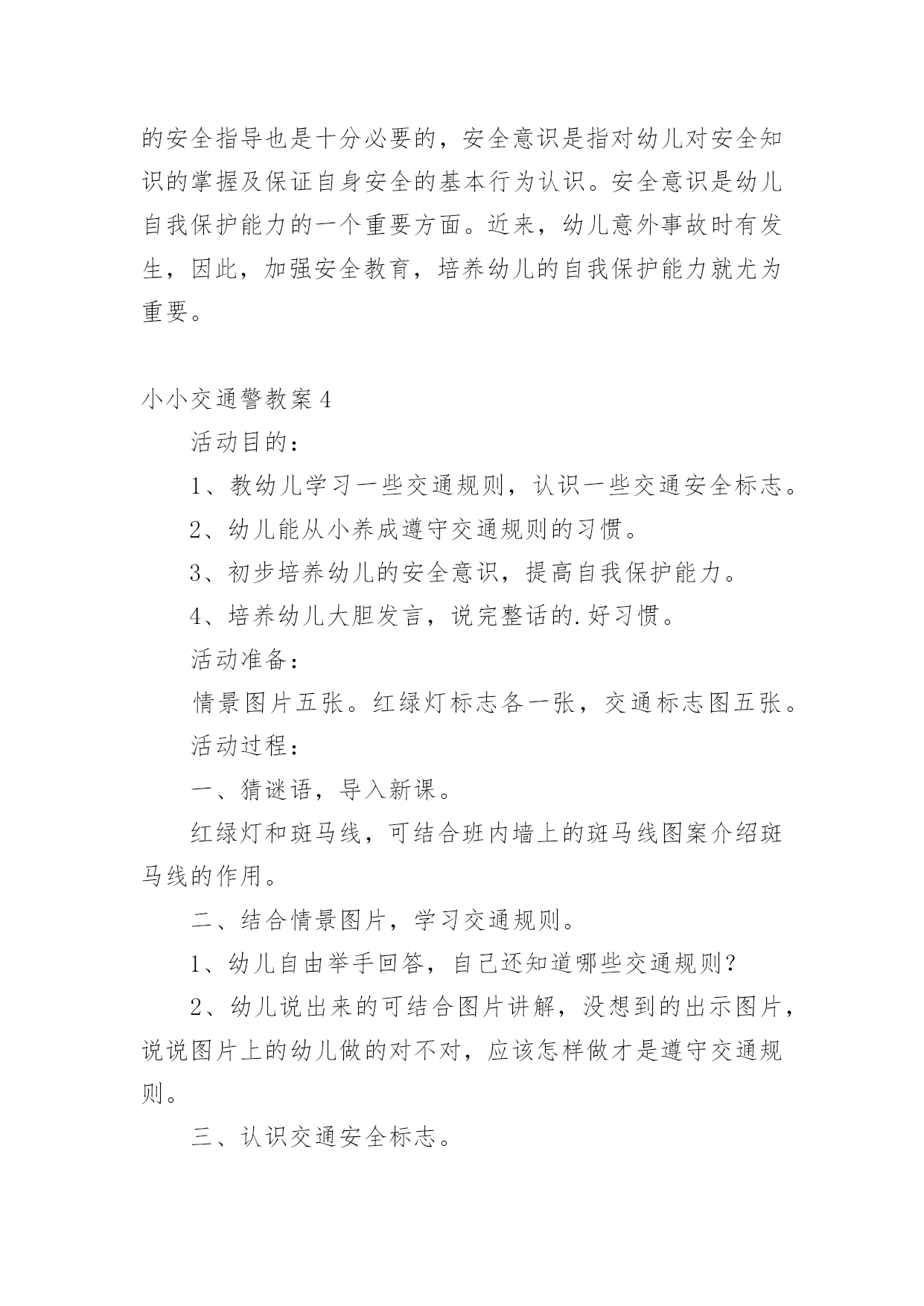 小小交通警教案作为一名辛苦耕耘的教育工作者,常常要根据教学需要编写教案,编写教案有利于我们弄通教材内容,进而选择科学、恰当的教学方法。那么优秀的教案是什么样的呢?下面是小编帮大家整理的小小交通警教案,欢迎阅读与收藏。小小交通警教案1活动目标:1、通过歌曲了解红灯停、绿灯行的道理。2、学会唱歌曲,了解歌曲内容。3、感受旋律的气氛以及和同伴一起参加集体音乐活动的乐趣。4、培养幼儿的音乐节奏感,发展幼儿的表现力。5、乐意参加音乐活动,体验音乐活动中的快乐。活动准备:1、红、绿两色圆形卡纸2、课前事先录好的歌曲旋律活动过程:一、幼儿欣赏歌曲,了解歌曲内容1、今天朱老师给小朋友带来了一首好听地歌曲,叫《小小交通警》,请你们听一听歌曲里都讲了些什么?2、幼儿欣赏歌曲一遍,并按节奏拍拍小手。3、提问:①红灯闪应该怎么样?(快停下)②绿灯亮应该怎么样?(请出发)③是谁在指挥交通?(交通警察)④谁听警察叔叔的话?(汽车、人)二、幼儿熟悉歌曲内容1、幼儿按节奏念歌词一遍;2、幼儿与教师一起跟着旋律念歌词两遍;三、幼儿学习歌曲1、幼儿听旋律跟唱歌曲一遍;2、教师根据歌词内容,创编动作,幼儿模仿,加深对歌词内容的印象;3、幼儿跟音乐反复模仿动作2~3遍;四、游戏:小小交通警教师出示红、绿灯1、现有,朱老师要和你们来玩一个游戏;2、交待游戏规则;3、幼儿游戏;五、游戏规则:1、幼儿边唱歌曲、边做动作,看到红灯停、绿灯行;2、教师根据歌曲内容出示红、绿灯。活动反思:兴趣是幼儿学习的原动力,幼儿只有有了兴趣才能产生主动学习、主动探索的愿望。爱好音乐是人的天性,有趣的'音乐活动能激起幼儿学习的欲望,使其产生愉快的情绪,充分发挥想象,表现出他们不同的感受和创造。小小交通警教案2活动目标:1、在学会歌曲的基础上,进行表演。2、了解交通警察的一些简单手势。3、懂得一些简单的交通规则。活动准备:音乐。活动过程:一、律动《小司机》1、今天我们小朋友都变成了小司机,现在就请你听交通警察的指挥开车吧!2、幼儿随音乐进行律动表演。二、师幼谈话。1、你看见谁在指挥交通?2、你看见了哪些有趣的动作?3、幼儿自由地做一做自己喜欢的.动作。三、幼儿欣赏歌曲。你刚才听到了什么?(教师根据幼儿的回答进行范唱)四、学唱歌曲。1、教师出示红绿灯,念歌词。2、节奏练习:根据歌词念节奏。3、幼儿学唱。五、游戏。歌表演教师重点引导幼儿能学会简单的手势后进行表演。小小交通警教案3教孩子交通规则的教学方案:小小交通警教幼儿学习一些交通规则,认识一些交通安全标志。幼儿能从小养成遵守交通规则的习惯。小小交通警中国儿童教育网致力于提供给广大幼儿教师一个资源共享的平台,每天将会整理当天由我们的老师团队提供的当天参考教案和各种教育相关资源,让广大老师轻松备课。教学内容:交通安全常识教学目的:1.教幼儿学习一些交通规则,认识一些交通安全标志。2.幼儿能从小养成遵守交通规则的习惯。教学准备:情景图片五张。红绿灯标志各一张,交通标志图五张。教学过程:一.猜谜语,导入新课。红绿灯和斑马线,可结合班内墙上的斑马线图案介绍斑马线的作用。二.结合情景图片,学习交通规则。1.幼儿自由举手回答,自己还知道哪些交通规则?2.幼儿说出来的可结合图片讲解,没想到的出示图片,说说图片上的幼儿做的对不对,应该怎样做才是遵守交通规则。三.认识交通安全标志。出示图片,请幼儿猜猜它表示什么?四.学儿歌记交通规则儿歌:交通安全歌红灯停,绿灯行,黄灯请你准备好。天桥地道人行道,横穿马路离不了。头手不出车窗外,不在路上玩游戏。交通规则很重要,我们把它记得牢。五.红绿灯和小司机请两名小朋友,一人扮演红灯,一人扮演绿灯,其他小朋友为小司机,看哪位小司机遵守交通规则。教孩子学会危险的东西不要碰在《我找到的危险》活动中,孩子找到了许多危险,观察到幼儿的兴趣很浓,于是我同孩子一起生成了这样一节教学活动。让孩子通过歌曲创编的形式加深幼儿自我保护意识。危险的东西不要碰中国儿童教育网致力于提供给广大幼儿教师一个资源共享的平台,每天将会整理当天由我们的老师团队提供的当天参考教案和各种教育相关资源,让广大老师轻松备课。设计意图:在《我找到的危险》活动中,孩子找到了许多危险,观察到幼儿的兴趣很浓,于是我同孩子一起生成了这样一节教学活动。让孩子通过歌曲创编的形式加深幼儿自我保护意识。活动目标:1、幼儿能基本掌握歌曲旋律,理解歌词含义;2、能在理解歌词后在原歌词上进行创编,并乐意创编歌词;3、知道身边有哪些危险,并学会保护自己和提醒朋友注意安全。4、培养幼儿动脑思考问题、解决问题的能力。5、知道危险来临时如何保护自己,如何逃生。活动准备:1、打火机、插座、暖水瓶、药瓶图片各一。一个幼儿被火烧手指、一个幼儿被电到、一幼儿被烫到、一幼儿倒下的图片。2、图的注释。如:打火机(