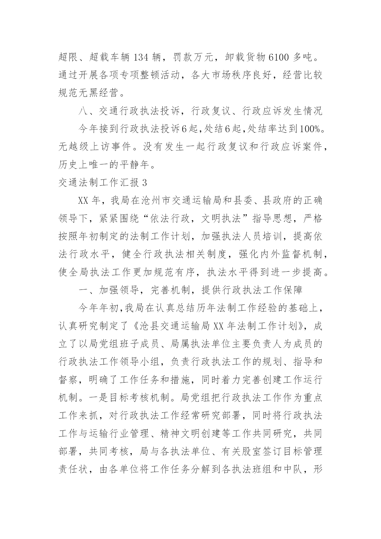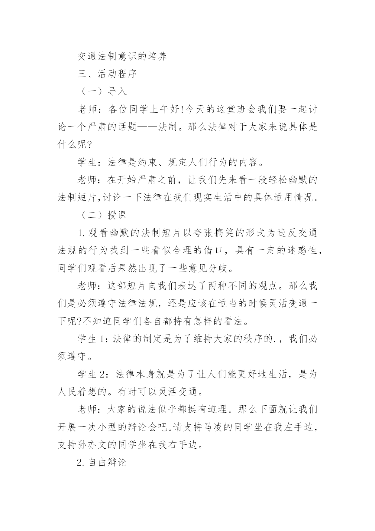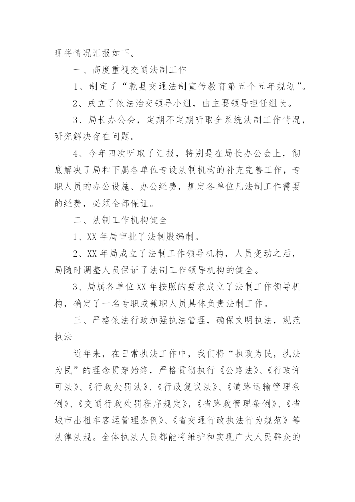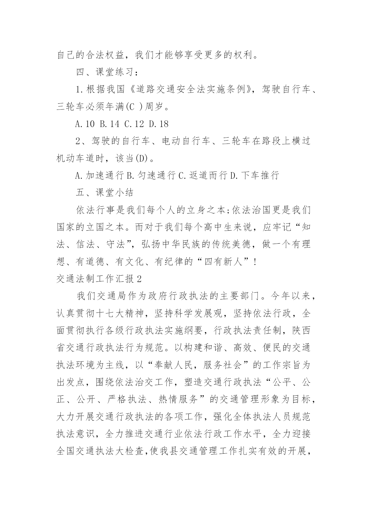 交通法制工作汇报交通法制工作汇报无论是在学校还是在社会中,我们接触到汇报的场景越来越多,汇报就是把某个阶段做的工作,进行全面系统的分析、研究后报告给上级领导,每次提笔要写汇报的时候都毫无头绪?下面是小编收集整理的交通法制工作汇报,仅供参考,希望能够帮助到大家。交通法制工作汇报1一、教学目标:1.通过观看有关是否该遵守交通法规的幽默的法制短片,引发同学思考:是否可以因为某些原因而不遵守法律规范?2.通过自由辩论的形式,让正反两种观点进行交锋,使同学们在讨论中看清问题的本质,了解到不仅要知法,更要信法,进而守法。3.在明确了守法的重要性之后,通过知识竞赛的形式,使同学们在寓教于乐中掌握基本的法律常识,为严格守法打下基础。4.评选“法制之星”,作为班级法制活动的带头人,带动全班同学乃至全年级、全校同学一起做知法、信法、守法的好学生,好公民。二、教学重难点交通法制意识的培养三、活动程序(一)导入老师:各位同学上午好!今天的这堂班会我们要一起讨论一个严肃的话题——法制。那么法律对于大家来说具体是什么呢?学生:法律是约束、规定人们行为的内容。老师:在开始严肃之前,让我们先来看一段轻松幽默的法制短片,讨论一下法律在我们现实生活中的具体适用情况。(二)授课1.观看幽默的法制短片以夸张搞笑的形式为违反交通法规的行为找到一些看似合理的借口,具有一定的迷惑性,同学们观看后果然出现了一些意见分歧。老师:这部短片向我们表达了两种不同的观点。那么我们是必须遵守法律法规,还是应该在适当的时候灵活变通一下呢?不知道同学们各自都持有怎样的看法。学生1:法律的制定是为了维持大家的秩序的.,我们必须遵守。学生2:法律本身就是为了让人们能更好地生活,是为人民着想的。有时可以灵活变通。老师:大家的说法似乎都挺有道理。那么下面就让我们开展一次小型的辩论会吧。请支持马凌的同学坐在我左手边,支持孙亦文的同学坐在我右手边。2.自由辩论围绕幽默的法制短片展开辩论,并可将议题适当扩展而不局限于交通法规。同学们自主分成两组,由主持人宣布规则,进行自由辩论。辩论结束后由在场老师做评委,对同学们提出建议和指导。老师:那么下面我宣布一下规则。两方可自由派出辩手,一方发言结束另一方即可接上,一方累计发言时间不得超过3分钟。最后由两方各自派一人进行1分钟的总结陈词。好,那么我们就开始吧!首先,请大家就各自的辩题思考半分钟。【半分钟】好,停!下面是自由辩论时间。学生3:法律是中央领导、专家学者经过层层修订而制定出来的,完全符合“依法治国”的思想,非常合理。学生4:法律是人定的,总会在某些程度上缺乏科学性、合理性。法律应随时代的变更而改变。学生5:中国的法律还不够完整、完善。学生6:虽然现行法律并非100%完备,但人们可以向有关部门反映存在的不足,而不是违反它。学生7:由于纪律的缺陷,在不损害国家利益的情况下,应该可以稍稍变通。老师评价:自由辩论时间较短,辩手相对集中,发言人数过少;同学对政府有信心,在相对时间内我们中学生必须牢记守法。3.评选“法制之星”。评选我们自己的“法制之星”,让他/她做我们的领头人,在平时的学习生活中发挥模范带头作用,知法、信法、守法。下面请刚才有答对题目的同学起立,我们将在这些同学之中选出我们今天的“法制之星”。希望我们能够学好基本的法律,这样我们才能够维护自己的合法权益,我们才能够享受更多的权利。四、课堂练习:1.根据我国《道路交通安全法实施条例》,驾驶自行车、三轮车必须年满(C)周岁。A.10B.14C.12D.182、驾驶的自行车、电动自行车、三轮车在路段上横过机动车道时,该当(D)。A.加速通行B.匀速通行C.返道而行D.下车推行五、课堂小结依法行事是我们每个人的立身之本;依法治国更是我们国家的立国之本。而对于我们每个高中生来说,应牢记“知法、信法、守法”,弘扬中华民族的传统美德,做一个有理想、有道德、有文化、有纪律的“四有新人”!交通法制工作汇报2我们交通局作为政府行政执法的主要部门。今年以来,认真贯彻十七大精神,坚持科学发展观,坚持依法行政,全面贯彻执行各级行政执法实施纲要,行政执法责任制,陕西省交通行政执法行为规范。以构建和谐、高效、便民的交通执法环境为主线,以“奉献人民,服务社会”的工作宗旨为出发点,围绕依法治交工作,塑造交通行政执法“公平、公正、公开、严格执法、热情服务”的交通管理形象为目标,大力开展交通行政执法的各项工作,强化全体执法人员规范执法意识,全力推进交通行业依法行政工作水平,全力迎接全国交通执法大检查,使我县交通管理工作扎实有效的开展,现将情况汇报如下。一、高度重视交通法制工作1、制定了“乾县交通法制宣传教育第五个五年规划”。2、成立了依法治交领导小组,由主要领导担任组长。3、局长办公会,定期不定期听取全系统法制工作情况,研究解决存在