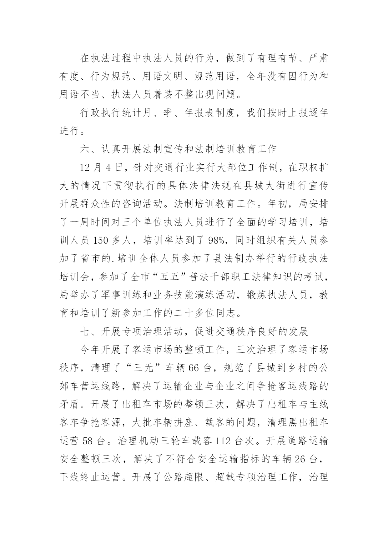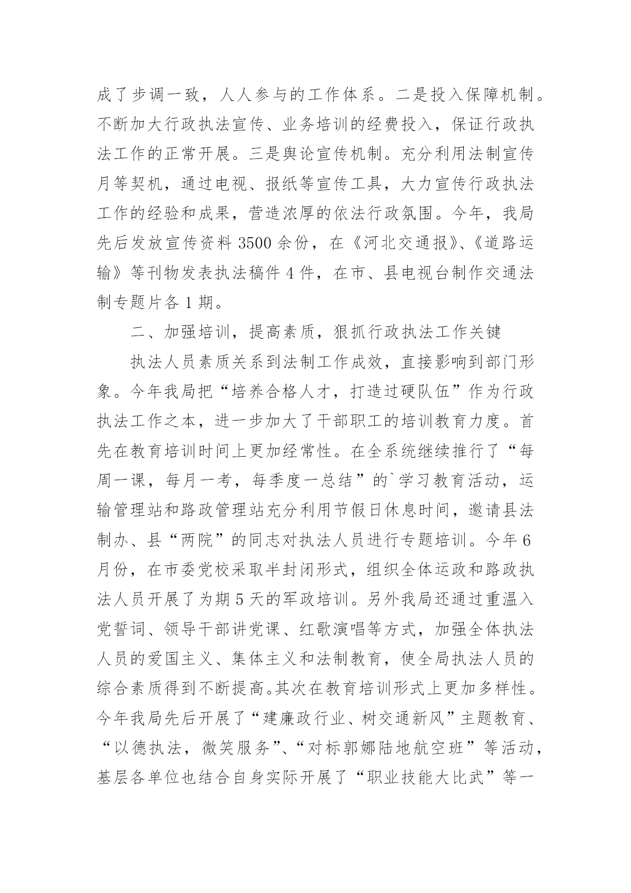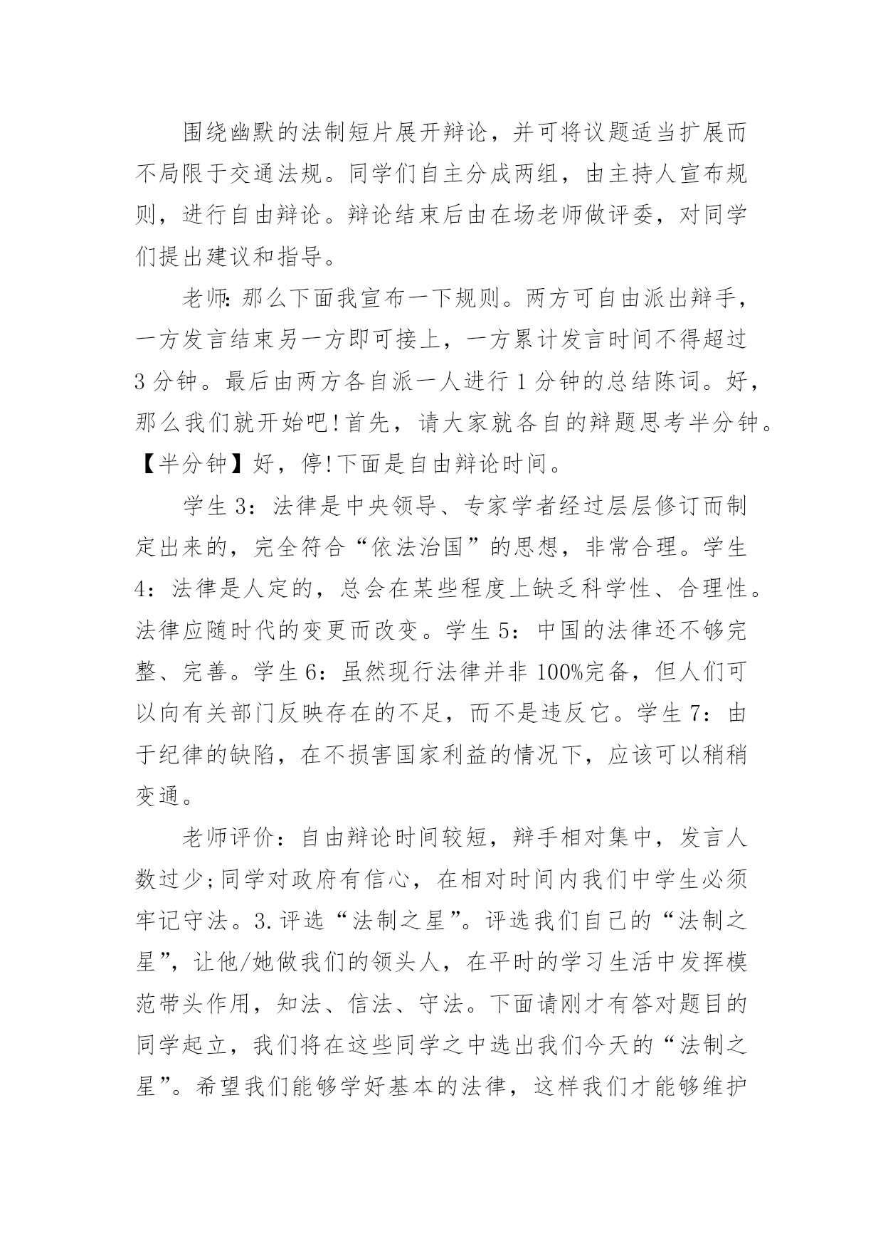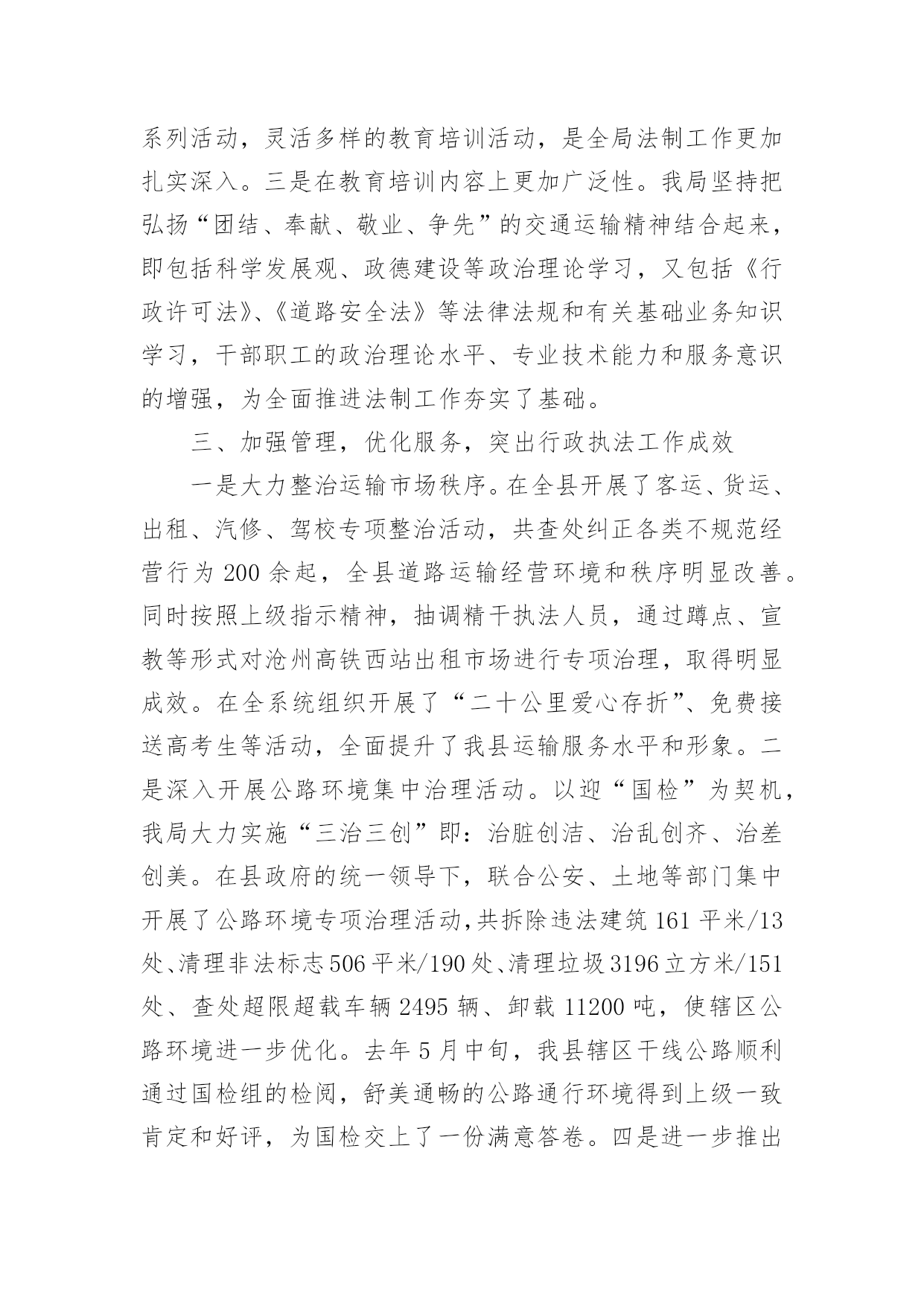 交通法制工作汇报交通法制工作汇报无论是在学校还是在社会中,我们接触到汇报的场景越来越多,汇报就是把某个阶段做的工作,进行全面系统的分析、研究后报告给上级领导,每次提笔要写汇报的时候都毫无头绪?下面是小编收集整理的交通法制工作汇报,仅供参考,希望能够帮助到大家。交通法制工作汇报1一、教学目标:1.通过观看有关是否该遵守交通法规的幽默的法制短片,引发同学思考:是否可以因为某些原因而不遵守法律规范?2.通过自由辩论的形式,让正反两种观点进行交锋,使同学们在讨论中看清问题的本质,了解到不仅要知法,更要信法,进而守法。3.在明确了守法的重要性之后,通过知识竞赛的形式,使同学们在寓教于乐中掌握基本的法律常识,为严格守法打下基础。4.评选“法制之星”,作为班级法制活动的带头人,带动全班同学乃至全年级、全校同学一起做知法、信法、守法的好学生,好公民。二、教学重难点交通法制意识的培养三、活动程序(一)导入老师:各位同学上午好!今天的这堂班会我们要一起讨论一个严肃的话题——法制。那么法律对于大家来说具体是什么呢?学生:法律是约束、规定人们行为的内容。老师:在开始严肃之前,让我们先来看一段轻松幽默的法制短片,讨论一下法律在我们现实生活中的具体适用情况。(二)授课1.观看幽默的法制短片以夸张搞笑的形式为违反交通法规的行为找到一些看似合理的借口,具有一定的迷惑性,同学们观看后果然出现了一些意见分歧。老师:这部短片向我们表达了两种不同的观点。那么我们是必须遵守法律法规,还是应该在适当的时候灵活变通一下呢?不知道同学们各自都持有怎样的看法。学生1:法律的制定是为了维持大家的秩序的.,我们必须遵守。学生2:法律本身就是为了让人们能更好地生活,是为人民着想的。有时可以灵活变通。老师:大家的说法似乎都挺有道理。那么下面就让我们开展一次小型的辩论会吧。请支持马凌的同学坐在我左手边,支持孙亦文的同学坐在我右手边。2.自由辩论围绕幽默的法制短片展开辩论,并可将议题适当扩展而不局限于交通法规。同学们自主分成两组,由主持人宣布规则,进行自由辩论。辩论结束后由在场老师做评委,对同学们提出建议和指导。老师:那么下面我宣布一下规则。两方可自由派出辩手,一方发言结束另一方即可接上,一方累计发言时间不得超过3分钟。最后由两方各自派一人进行1分钟的总结陈词。好,那么我们就开始吧!首先,请大家就各自的辩题思考半分钟。【半分钟】好,停!下面是自由辩论时间。学生3:法律是中央领导、专家学者经过层层修订而制定出来的,完全符合“依法治国”的思想,非常合理。学生4:法律是人定的,总会在某些程度上缺乏科学性、合理性。法律应随时代的变更而改变。学生5:中国的法律还不够完整、完善。学生6:虽然现行法律并非100%完备,但人们可以向有关部门反映存在的不足,而不是违反它。学生7:由于纪律的缺陷,在不损害国家利益的情况下,应该可以稍稍变通。老师评价:自由辩论时间较短,辩手相对集中,发言人数过少;同学对政府有信心,在相对时间内我们中学生必须牢记守法。3.评选“法制之星”。评选我们自己的“法制之星”,让他/她做我们的领头人,在平时的学习生活中发挥模范带头作用,知法、信法、守法。下面请刚才有答对题目的同学起立,我们将在这些同学之中选出我们今天的“法制之星”。希望我们能够学好基本的法律,这样我们才能够维护自己的合法权益,我们才能够享受更多的权利。四、课堂练习:1.根据我国《道路交通安全法实施条例》,驾驶自行车、三轮车必须年满(C)周岁。A.10B.14C.12D.182、驾驶的自行车、电动自行车、三轮车在路段上横过机动车道时,该当(D)。A.加速通行B.匀速通行C.返道而行D.下车推行五、课堂小结依法行事是我们每个人的立身之本;依法治国更是我们国家的立国之本。而对于我们每个高中生来说,应牢记“知法、信法、守法”,弘扬中华民族的传统美德,做一个有理想、有道德、有文化、有纪律的“四有新人”!交通法制工作汇报2我们交通局作为政府行政执法的主要部门。今年以来,认真贯彻十七大精神,坚持科学发展观,坚持依法行政,全面贯彻执行各级行政执法实施纲要,行政执法责任制,陕西省交通行政执法行为规范。以构建和谐、高效、便民的交通执法环境为主线,以“奉献人民,服务社会”的工作宗旨为出发点,围绕依法治交工作,塑造交通行政执法“公平、公正、公开、严格执法、热情服务”的交通管理形象为目标,大力开展交通行政执法的各项工作,强化全体执法人员规范执法意识,全力推进交通行业依法行政工作水平,全力迎接全国交通执法大检查,使我县交通管理工作扎实有效的开展,现将情况汇报如下。一、高度重视交通法制工作1、制定了“乾县交通法制宣传教育第五个五年规划”。2、成立了依法治交领导小组,由主要领导担任组长。3、局长办公会,定期不定期听取全系统法制工作情况,研究解决存在