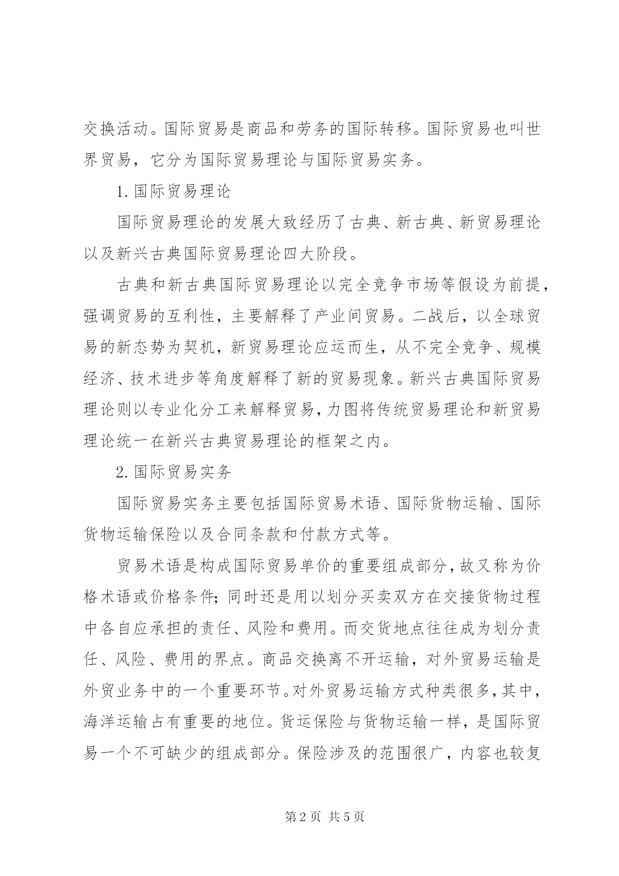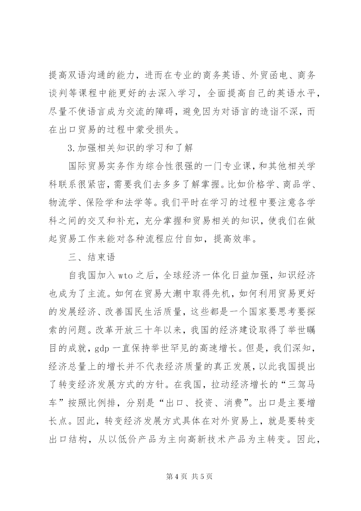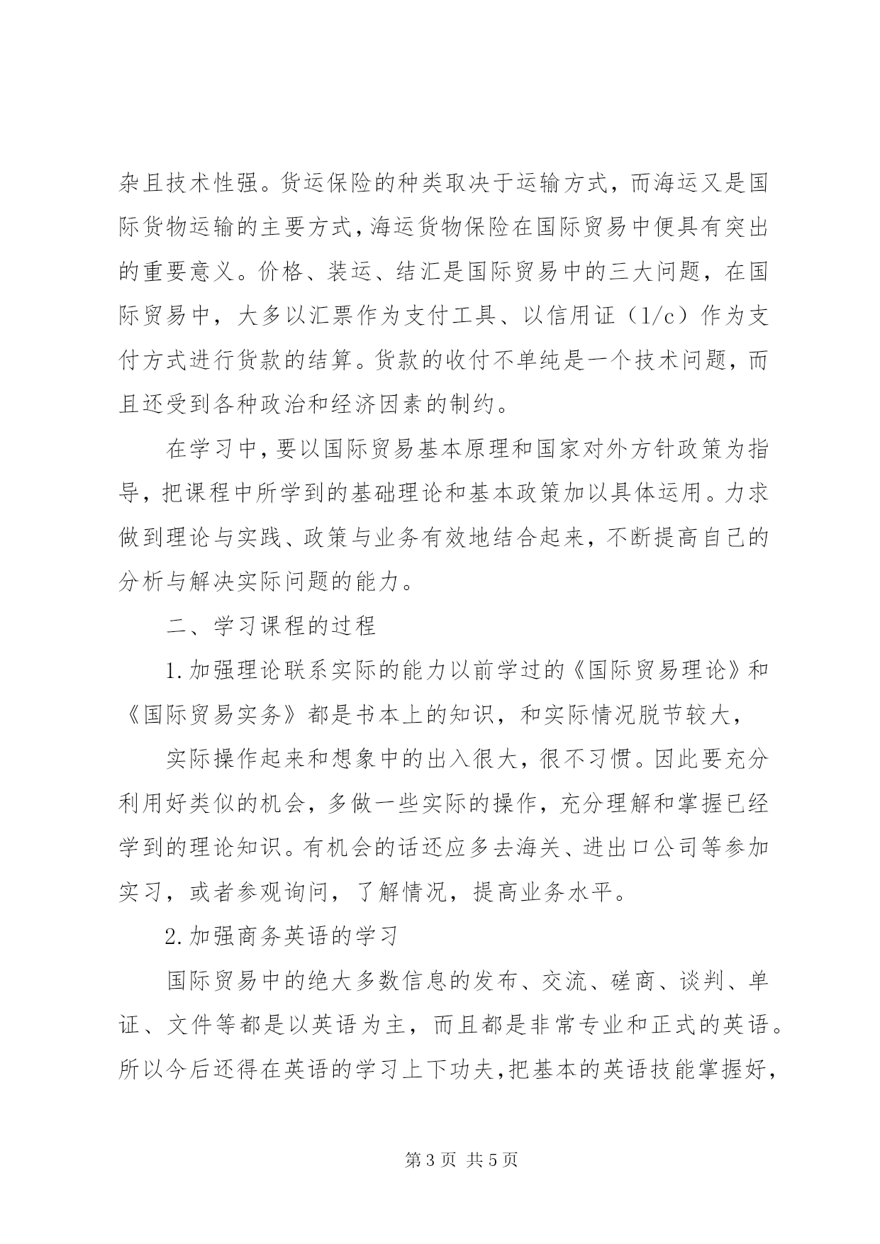 第PAGE\*Arabic\*MERGEFORMAT5页共NUMPAGES\*MERGEFORMAT5页国际贸易理论与实务学习感想国际贸易理论与实务学习心得这个学期是大三的第一学期,我们接触了《国际贸易理论与实务》这门课程,经过近一学期的课程的学习,同时在老师平时的悉心教导下,我对国际贸易这门学问有了赞新的认知与了解,并对这门学科产生了深刻的感想。《国际贸易理论与实务》的学习,让我认识到了贸易工作的复杂性,变化性,灵活性,困难性,也体会到了作为一名优秀的外贸工作者应加盖具备的基本业务素质和心理素质。在以后的实践过程中,可能有许多环节的操作,是我们以前没有接触过的,虽然一笔进出口业务也没完成,但每天都有新收获,可以说是受益匪浅,这也令我感到非常的满意。我也逐步意识到国际贸易的重要性和其独有的特点:国际贸易既是一项经济活动,也是涉外活动的一个方面;它属于跨国交易,情况错综复杂;受国际局势变化的影响,具有不稳定性;面临的风险远比国内贸易大,线长面广,中间环节多;商战不止,竞争异常激烈。所以,作为从事国际经贸的人员,不仅必须掌握国际贸易的基本原理、基本知识和基本技能与方法,而且还应具备开拓创新的能力、驾驭市场的能力和善于应战与随机应变的能力。一、课程主要内容国际贸易是指不同国家(和/或地区)之间的商品和劳务的交换活动。国际贸易是商品和劳务的国际转移。国际贸易也叫世界贸易,它分为国际贸易理论与国际贸易实务。1.国际贸易理论国际贸易理论的发展大致经历了古典、新古典、新贸易理论以及新兴古典国际贸易理论四大阶段。古典和新古典国际贸易理论以完全竞争市场等假设为前提,强调贸易的互利性,主要解释了产业间贸易。二战后,以全球贸易的新态势为契机,新贸易理论应运而生,从不完全竞争、规模经济、技术进步等角度解释了新的贸易现象。新兴古典国际贸易理论则以专业化分工来解释贸易,力图将传统贸易理论和新贸易理论统一在新兴古典贸易理论的框架之内。2.国际贸易实务国际贸易实务主要包括国际贸易术语、国际货物运输、国际货物运输保险以及合同条款和付款方式等。贸易术语是构成国际贸易单价的重要组成部分,故又称为价格术语或价格条件;同时还是用以划分买卖双方在交接货物过程中各自应承担的责任、风险和费用。而交货地点往往成为划分责任、风险、费用的界点。商品交换离不开运输,对外贸易运输是外贸业务中的一个重要环节。对外贸易运输方式种类很多,其中,海洋运输占有重要的地位。货运保险与货物运输一样,是国际贸易一个不可缺少的组成部分。保险涉及的范围很广,内容也较复杂且技术性强。货运保险的种类取决于运输方式,而海运又是国际货物运输的主要方式,海运货物保险在国际贸易中便具有突出的重要意义。价格、装运、结汇是国际贸易中的三大问题,在国际贸易中,大多以汇票作为支付工具、以信用证(l/c)作为支付方式进行货款的结算。货款的收付不单纯是一个技术问题,而且还受到各种政治和经济因素的制约。在学习中,要以国际贸易基本原理和国家对外方针政策为指导,把课程中所学到的基础理论和基本政策加以具体运用。力求做到理论与实践、政策与业务有效地结合起来,不断提高自己的分析与解决实际问题的能力。二、学习课程的过程1.加强理论联系实际的能力以前学过的《国际贸易理论》和《国际贸易实务》都是书本上的知识,和实际情况脱节较大,实际操作起来和想象中的出入很大,很不习惯。因此要充分利用好类似的机会,多做一些实际的操作,充分理解和掌握已经学到的理论知识。有机会的话还应多去海关、进出口公司等参加实习,或者参观询问,了解情况,提高业务水平。2.加强商务英语的学习国际贸易中的绝大多数信息的发布、交流、磋商、谈判、单证、文件等都是以英语为主,而且都是非常专业和正式的英语。所以今后还得在英语的学习上下功夫,把基本的英语技能掌握好,提高双语沟通的能力,进而在专业的商务英语、外贸函电、商务谈判等课程中能更好的去深入学习,全面提高自己的英语水平,尽量不使语言成为交流的障碍,避免因为对语言的造诣不深,而在出口贸易的过程中蒙受损失。3.加强相关知识的学习和了解国际贸易实务作为综合性很强的一门专业课,和其他相关学科联系很紧密,需要我们去多多了解掌握。比如价格学、商品学、物流学、保险学和法学等。我们平时在学习的过程中要注意各学科之间的交叉和补充,充分掌握和贸易相关的知识,使我们在做起贸易工作来能对各种流程应付自如,提高效率。三、结束语自我国加入wto之后,全球经济一体化日益加强,知识经济也成为了主流。如何在贸易大潮中取得先机,如何利用贸易更好的发展经济、改善国民生活质量,这些都是一个国家要思考要探索的问题。改革开放三十年以来,我国的经济建设取得了举世瞩目的成就,gdp一直保持举世罕见的高速增长。但是,我们深知,经济总量上的增长并不代表经济质量的真