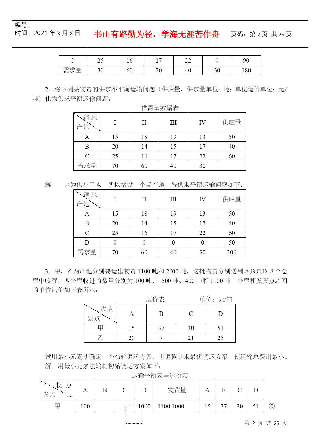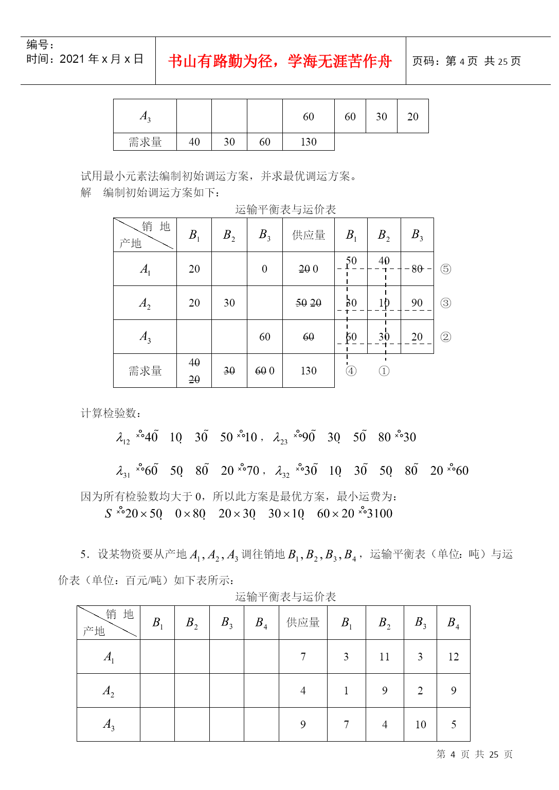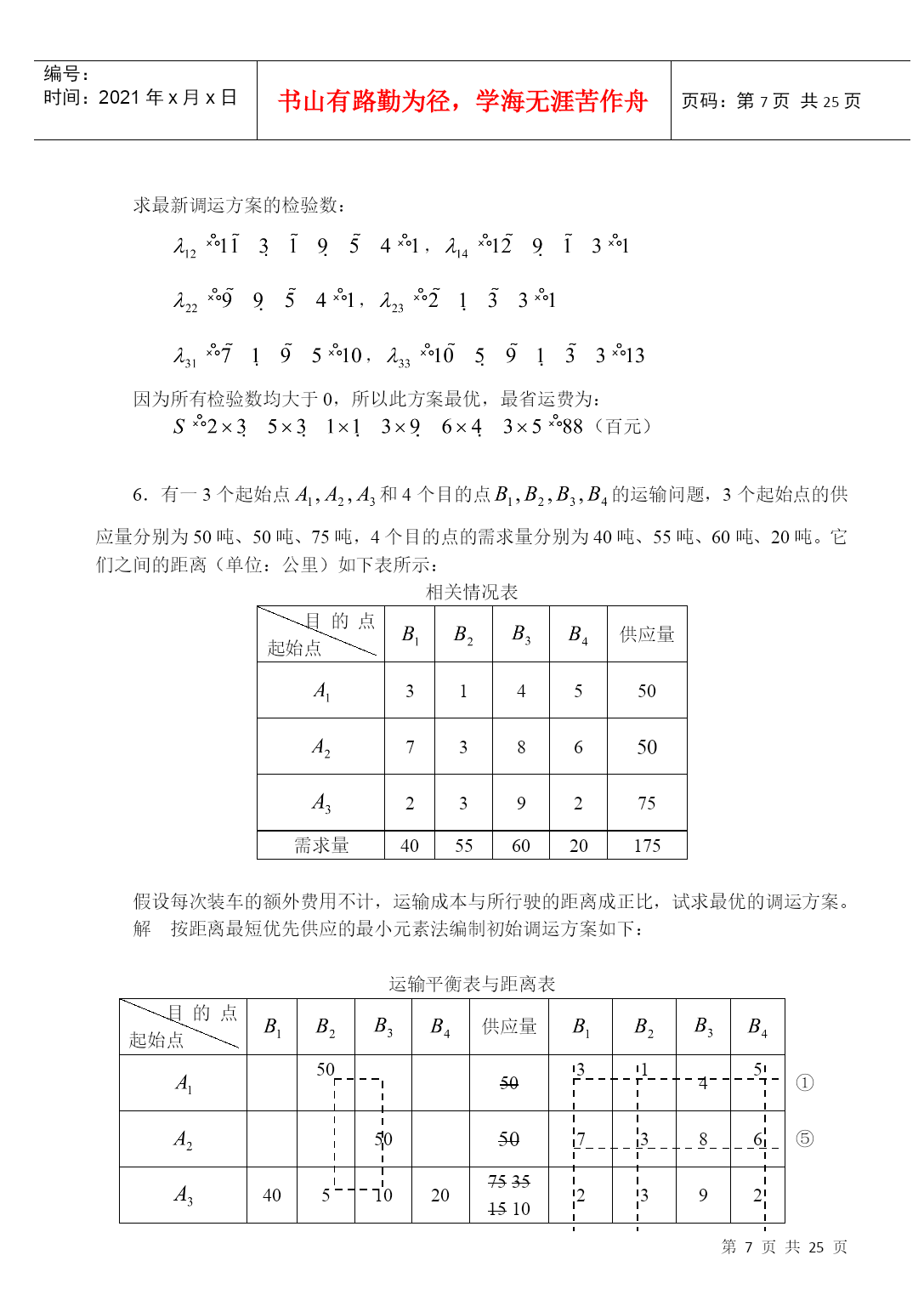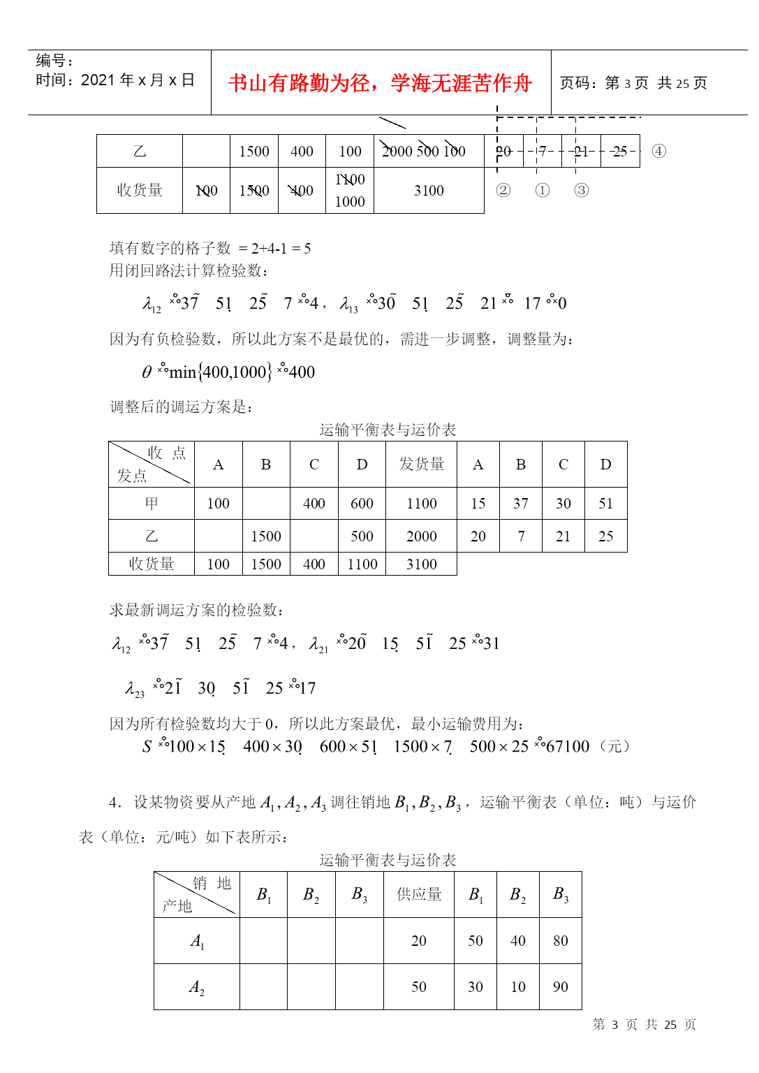 编号:时间:2021年x月x日书山有路勤为径,学海无涯苦作舟页码:第PAGE25页共NUMPAGES25页第PAGE\*MERGEFORMAT25页共NUMPAGES\*MERGEFORMAT25页《物流管理定量分析》第一次作业(物资调运方案的优化的表上作业法)1.将下列某物资的供求不平衡运输问题(供应量、供求量单位:吨;单位运价单位:元/吨)化为供求平衡运输问题:供需量数据表销地产地IIIIIIIV供应量A1518191350B2014151740C2516172290需求量30602040解因为供大于求,所以增设一个虚销地,得供求平衡运输问题如下:销地产地IIIIIIIVV供应量A15181913050B20141517040C25161722090需求量30602040301802.将下列某物资的供求不平衡运输问题(供应量、供求量单位:吨;单位运价单位:元/吨)化为供求平衡运输问题:供需量数据表销地产地IIIIIIIV供应量A1518191350B2014151740C2516172260需求量70604030解因为供小于求,所以增设一个虚产地,得供求平衡运输问题如下:销地产地IIIIIIIV供应量A1518191350B2014151740C2516172260D000050需求量706040302003.甲、乙两产地分别要运出物资1100吨和2000吨,这批物资分别送到A,B,C,D四个仓库中收存,四仓库收进的数量分别为100吨、1500吨、400吨和1100吨,仓库和发货点之间的单位运价如下表所示:运价表单位:元/吨收点发点ABCD甲15373051乙2072125试用最小元素法确定一个初始调运方案,再调整寻求最优调运方案,使运输总费用最小。解用最小元素法编制初始调运方案如下:运输平衡表与运价表收点发点ABCD发货量ABCD甲10010001100100015373051⑤乙150040010020005001002072125④收货量1001500400110010003100②①③填有数字的格子数=2+4-1=5用闭回路法计算检验数:,因为有负检验数,所以此方案不是最优的,需进一步调整,调整量为:调整后的调运方案是:运输平衡表与运价表收点发点ABCD发货量ABCD甲100400600110015373051乙150050020002072125收货量100150040011003100求最新调运方案的检验数:,因为所有检验数均大于0,所以此方案最优,最小运输费用为:(元)4.设某物资要从产地调往销地,运输平衡表(单位:吨)与运价表(单位:元/吨)如下表所示:运输平衡表与运价表销地产地供应量205040805030109060603020需求量403060130试用最小元素法编制初始调运方案,并求最优调运方案。解编制初始调运方案如下:运输平衡表与运价表销地产地供应量200200504080⑤20305020301090③6060603020②需求量402030600130④①计算检验数:,,因为所有检验数均大于0,所以此方案是最优方案,最小运费为:5.设某物资要从产地调往销地,运输平衡表(单位:吨)与运价表(单位:百元/吨)如下表所示:运输平衡表与运价表销地产地供应量731131241929974105需求量365620试问应怎样调运才能使总运费最省?解编制初始调运方案如下:运输平衡表与运价表销地产地供应量437331131231411929②639374105⑤需求量36546320①④③计算检验数:,因为有负检验数,所以此方案不是最优的,需进一步调整,调整量为:调整后的调运方案是:运输平衡表与运价表销地产地供应量527311312314192954974105需求量365620求最新调运方案的检验数:,,因为有负检验数,所以此方案不是最优的,继续调整,调整量为:调整后的调运方案是:运输平衡表与运价表销地产地供应量527311312314192963974105需求量365620求最新调运方案的检验数:因为有负检验数,所以此方案不是最优的,继续调整,调整量为:调整后的调运方案是:运输平衡表与运价表销地产地供应量257311312134192963974105需求量365620求最新调运方案的检验数:,,,因为所有检验数均大于0,所以此方案最优,最省运费为:(百元)6.有一3个起始点和4个目的点的运输问题,3个起始点的供应量分别为50吨、50吨、75吨,4个目的点的需求量分别为40吨、55