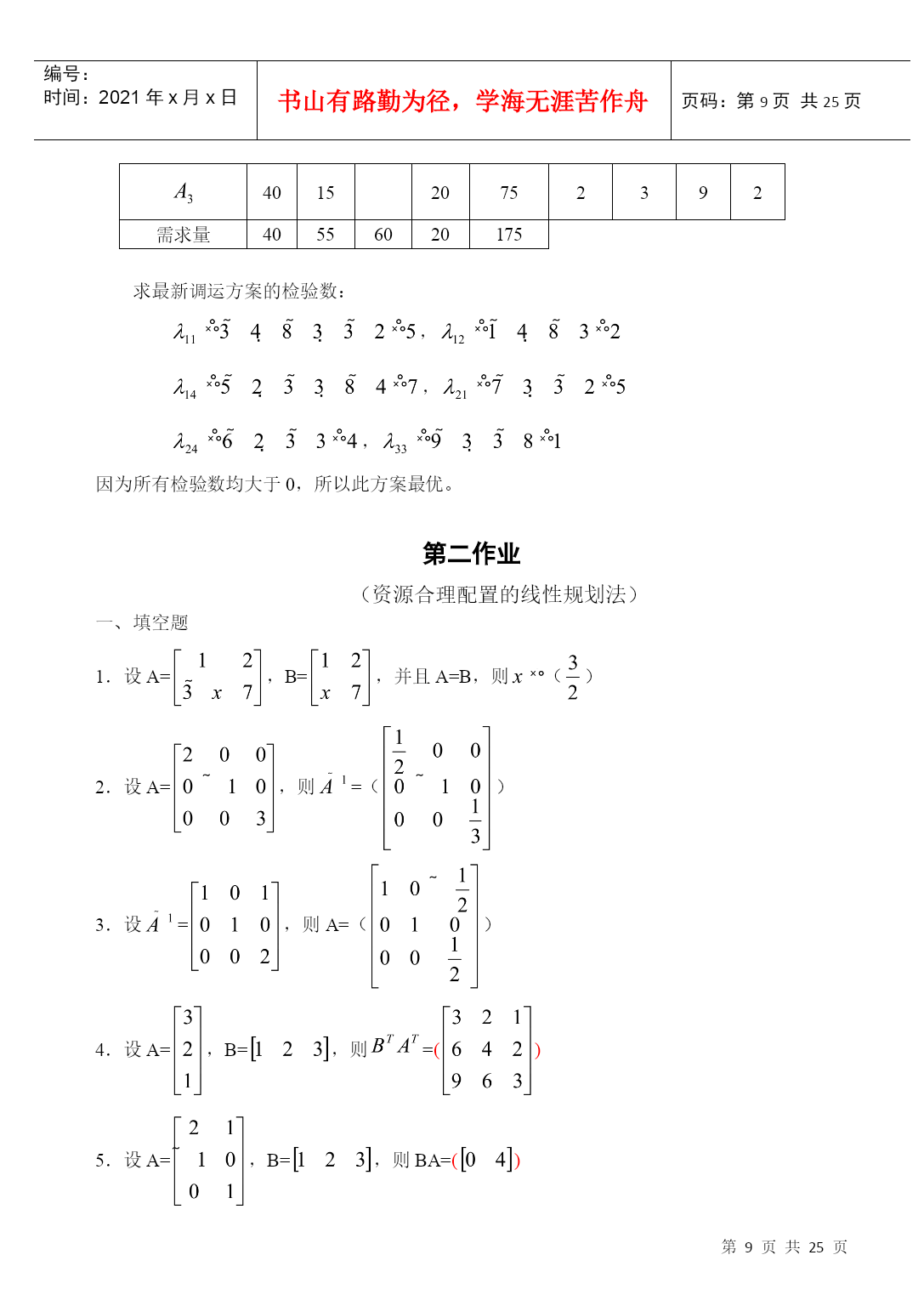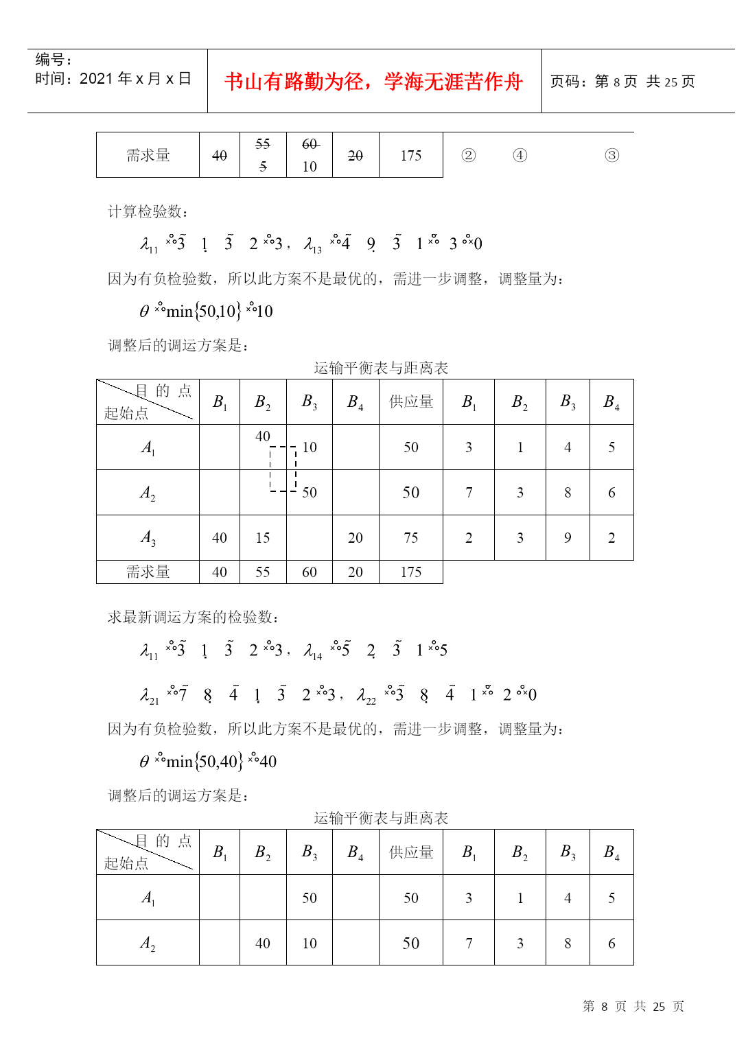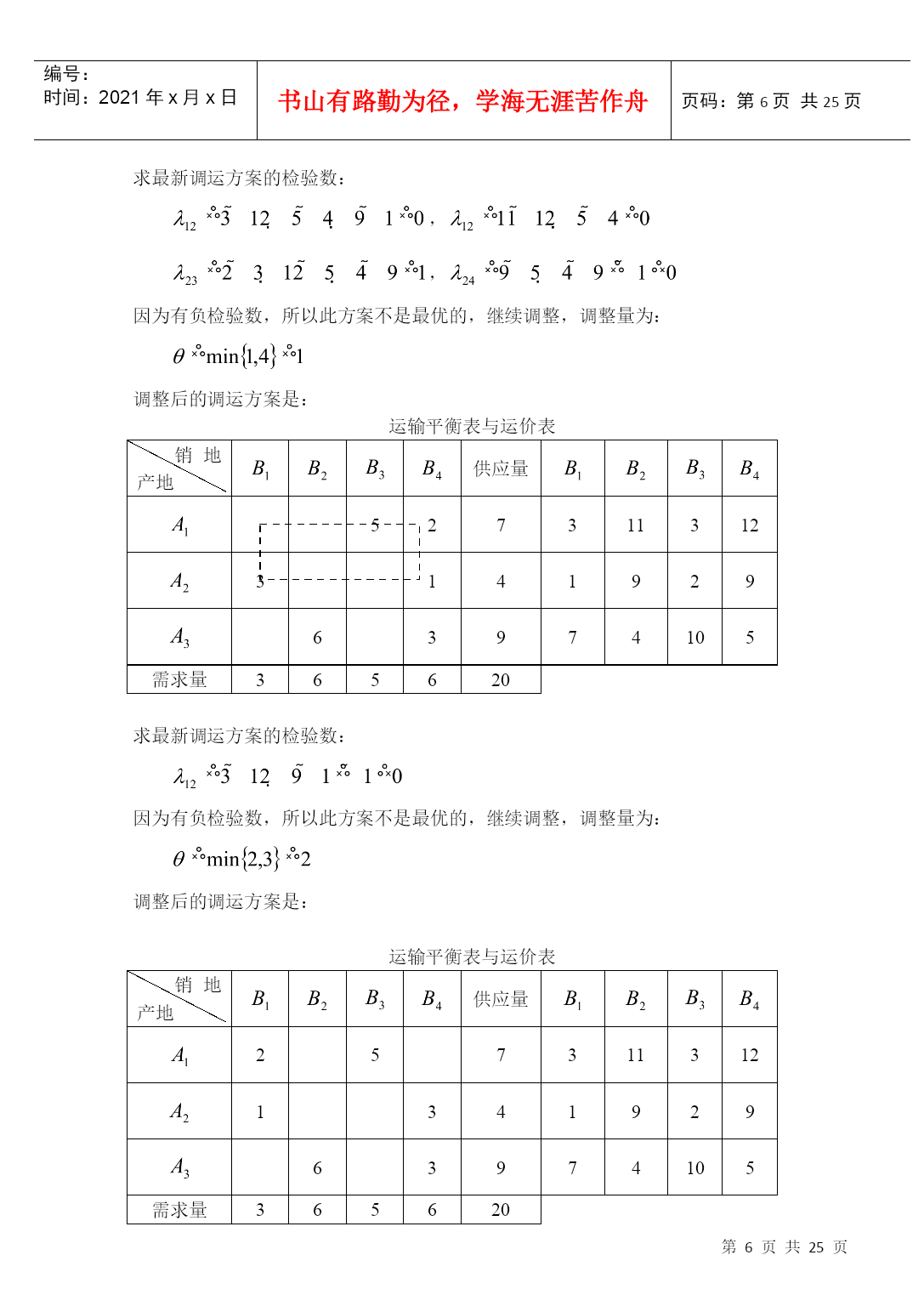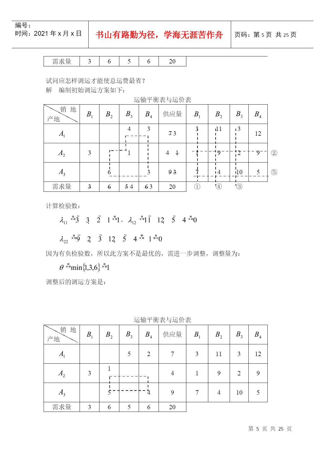 编号:时间:2021年x月x日书山有路勤为径,学海无涯苦作舟页码:第PAGE25页共NUMPAGES25页第PAGE\*MERGEFORMAT25页共NUMPAGES\*MERGEFORMAT25页《物流管理定量分析》第一次作业(物资调运方案的优化的表上作业法)1.将下列某物资的供求不平衡运输问题(供应量、供求量单位:吨;单位运价单位:元/吨)化为供求平衡运输问题:供需量数据表销地产地IIIIIIIV供应量A1518191350B2014151740C2516172290需求量30602040解因为供大于求,所以增设一个虚销地,得供求平衡运输问题如下:销地产地IIIIIIIVV供应量A15181913050B20141517040C25161722090需求量30602040301802.将下列某物资的供求不平衡运输问题(供应量、供求量单位:吨;单位运价单位:元/吨)化为供求平衡运输问题:供需量数据表销地产地IIIIIIIV供应量A1518191350B2014151740C2516172260需求量70604030解因为供小于求,所以增设一个虚产地,得供求平衡运输问题如下:销地产地IIIIIIIV供应量A1518191350B2014151740C2516172260D000050需求量706040302003.甲、乙两产地分别要运出物资1100吨和2000吨,这批物资分别送到A,B,C,D四个仓库中收存,四仓库收进的数量分别为100吨、1500吨、400吨和1100吨,仓库和发货点之间的单位运价如下表所示:运价表单位:元/吨收点发点ABCD甲15373051乙2072125试用最小元素法确定一个初始调运方案,再调整寻求最优调运方案,使运输总费用最小。解用最小元素法编制初始调运方案如下:运输平衡表与运价表收点发点ABCD发货量ABCD甲10010001100100015373051⑤乙150040010020005001002072125④收货量1001500400110010003100②①③填有数字的格子数=2+4-1=5用闭回路法计算检验数:,因为有负检验数,所以此方案不是最优的,需进一步调整,调整量为:调整后的调运方案是:运输平衡表与运价表收点发点ABCD发货量ABCD甲100400600110015373051乙150050020002072125收货量100150040011003100求最新调运方案的检验数:,因为所有检验数均大于0,所以此方案最优,最小运输费用为:(元)4.设某物资要从产地调往销地,运输平衡表(单位:吨)与运价表(单位:元/吨)如下表所示:运输平衡表与运价表销地产地供应量205040805030109060603020需求量403060130试用最小元素法编制初始调运方案,并求最优调运方案。解编制初始调运方案如下:运输平衡表与运价表销地产地供应量200200504080⑤20305020301090③6060603020②需求量402030600130④①计算检验数:,,因为所有检验数均大于0,所以此方案是最优方案,最小运费为:5.设某物资要从产地调往销地,运输平衡表(单位:吨)与运价表(单位:百元/吨)如下表所示:运输平衡表与运价表销地产地供应量731131241929974105需求量365620试问应怎样调运才能使总运费最省?解编制初始调运方案如下:运输平衡表与运价表销地产地供应量437331131231411929②639374105⑤需求量36546320①④③计算检验数:,因为有负检验数,所以此方案不是最优的,需进一步调整,调整量为:调整后的调运方案是:运输平衡表与运价表销地产地供应量527311312314192954974105需求量365620求最新调运方案的检验数:,,因为有负检验数,所以此方案不是最优的,继续调整,调整量为:调整后的调运方案是:运输平衡表与运价表销地产地供应量527311312314192963974105需求量365620求最新调运方案的检验数:因为有负检验数,所以此方案不是最优的,继续调整,调整量为:调整后的调运方案是:运输平衡表与运价表销地产地供应量257311312134192963974105需求量365620求最新调运方案的检验数:,,,因为所有检验数均大于0,所以此方案最优,最省运费为:(百元)6.有一3个起始点和4个目的点的运输问题,3个起始点的供应量分别为50吨、50吨、75吨,4个目的点的需求量分别为40吨、55