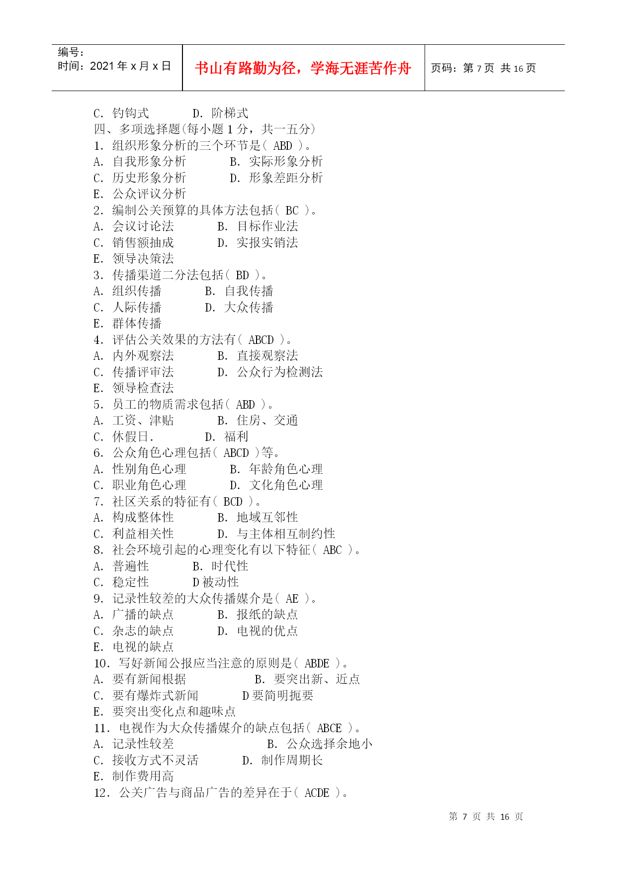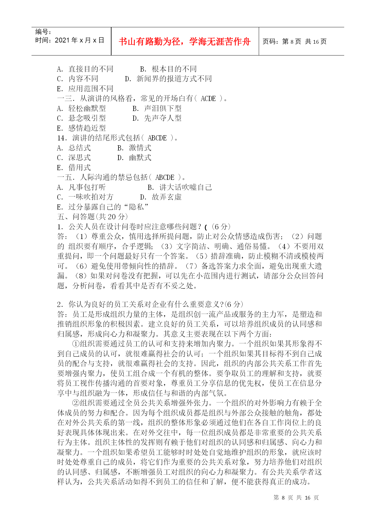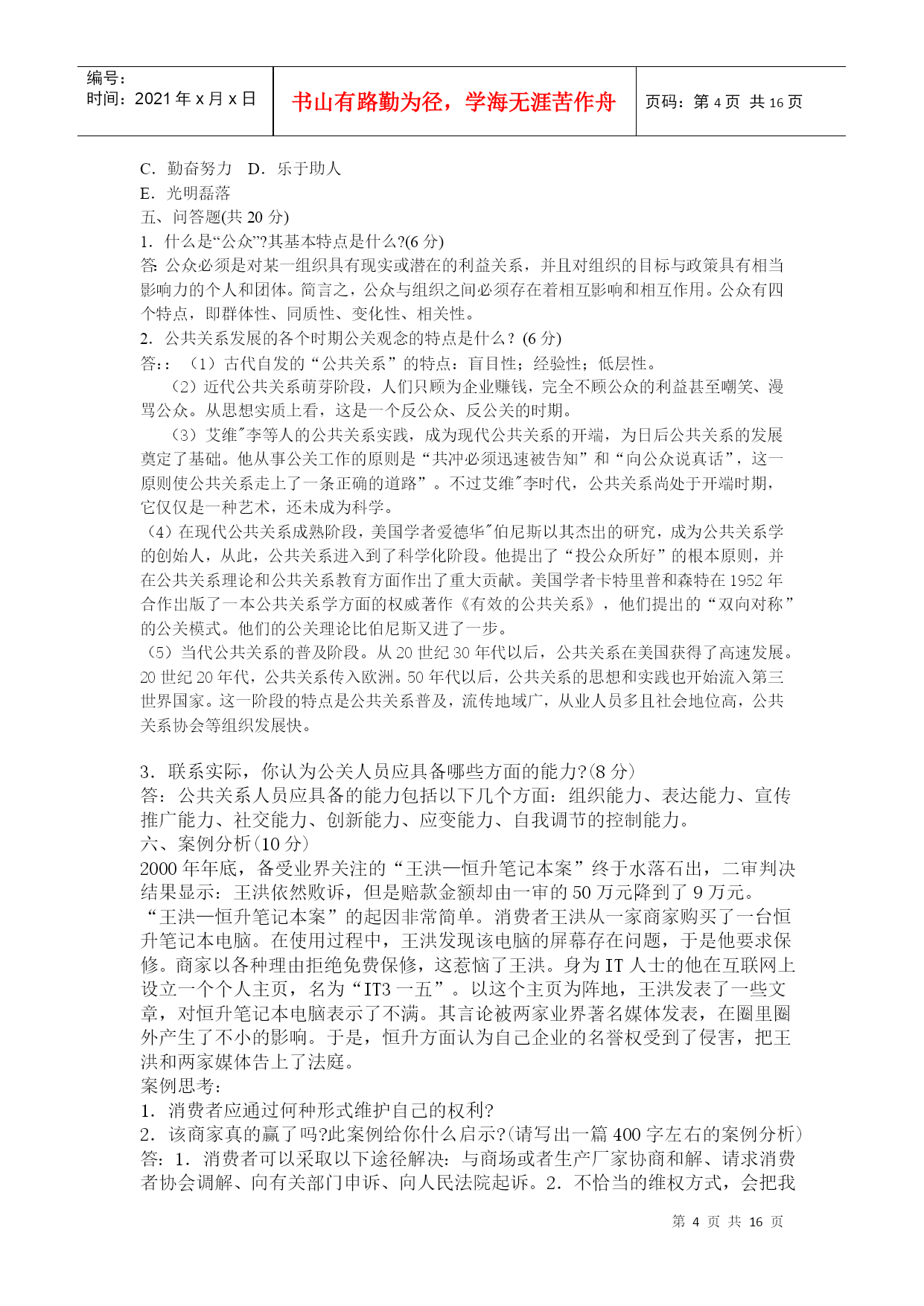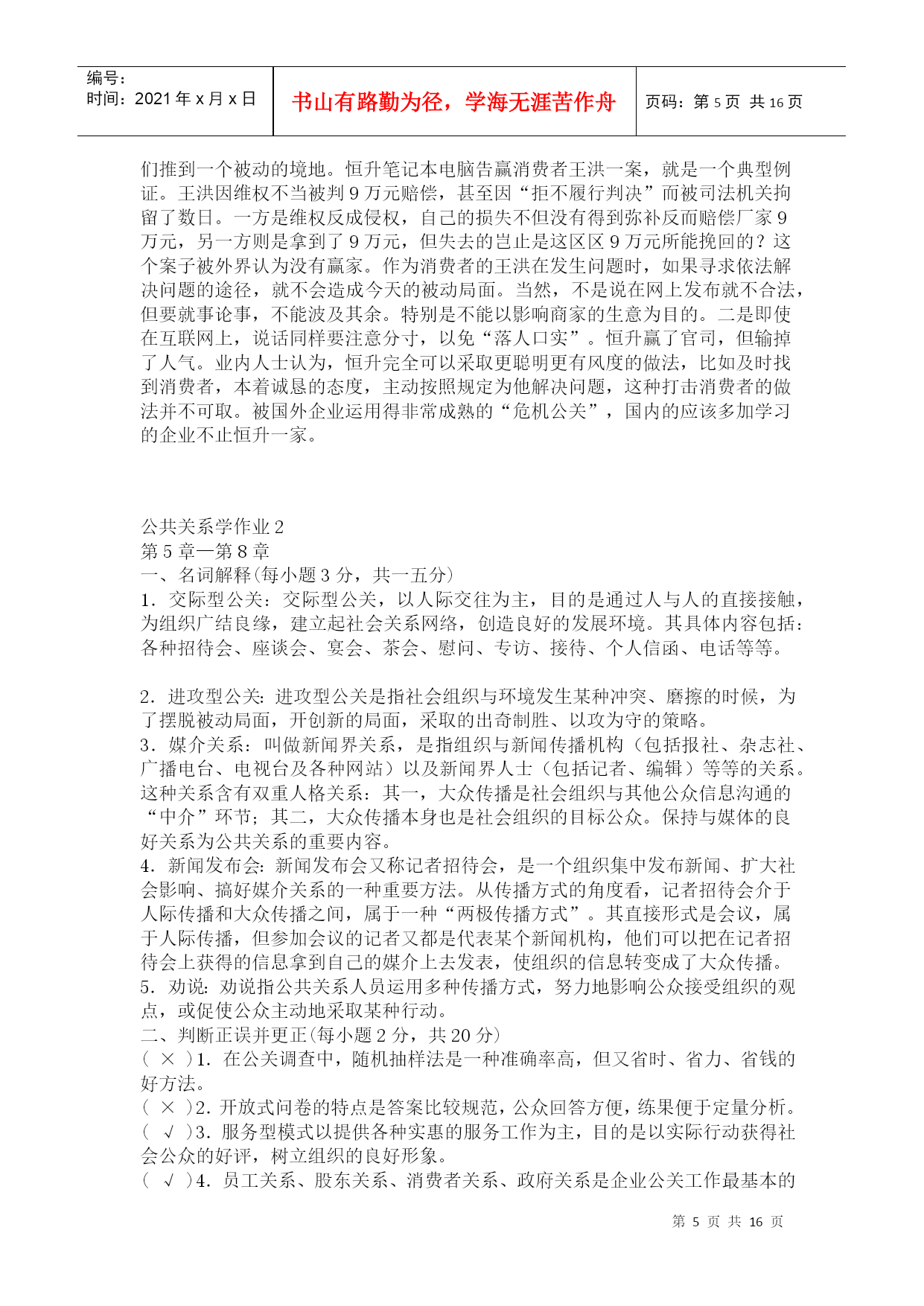 编号:时间:2021年x月x日书山有路勤为径,学海无涯苦作舟页码:第PAGE16页共NUMPAGES16页第PAGE\*MERGEFORMAT16页共NUMPAGES\*MERGEFORMAT16页HYPERLINK"xxxx/"《公共关系学》形成性考核册1-4全部答案公共关系学作业1第1章—第4章一、名词解释(每小题3分,共一五分)1.公共关系:所谓公共关系,就是一个组织运用有效的传播手段,使自身适应公众的需要,并使公众也适应组织发展需要的一种思想、政策和管理职能。2.公共关系观念:是人们在公共关系实践中形成的影响人们思想和行为倾向的深层的思想意识,是人们对公共关系活动的一种自觉的认识和理解。3.揭丑运动:19世纪下半叶,美国的商品经济得到高度发展,资本主义从自由竞争走向了垄断。百来个经济巨头控制了美国的经济命脉,他们为了巩固这种垄断地位,对内根本无视员工的利益,对外以损害公众利益作为赚钱的重要手段,奉行所谓“只有我能发财,让公众利益见鬼去吧”的经营哲学,引起了社会公众舆论的强烈不满和抨击,出现了2000多篇揭露实业界、传播界丑闻的文章,形成了近代美国史—上著名的“揭丑运动”。(又称“扒粪运动”)4.爱德华·伯尼斯:使公共关系由一种活动、一种社会现象变为一门科学的杰出人物是爱德华·伯奈斯。他从1923年出版第一部公共关系著作《公众舆论之凝结》,到1952年完成教科书《公共关系学》,使公共关系的原理和方法逐渐形成一个较为完整的理论体系。他强调组织应该在确切了解自己的公众的基础上来进行组织的传播工作;通过“投公众所好”来实现组织的目标。由于伯奈斯将公共关系引上了科学的轨道,被世人誉为“公共关系泰斗”。5.全员公关:全员公关指社会组织中所有工作人员都参与公共关系活动,简称全员PR。其意义在于增强组织全体员工的公关意识,上下齐心,合理搞好公关工作。二、判断正误并更正(每小题2分,共20分)(√)1.公共关系是一门综合性的应用科学。(√)2.公共关系特指组织与公众之间的传播沟通关系。(×)3.公共关系传播模式是根据传播过程的反馈模式的原理设计的,但它不包含“五W”模式的基本要素。(×)4.艾维·李创办世界上第一家宣传事务顾问所。(×)5.有了发达的商品经济就会产生发达的公共关系。(√)6.公共关系90%靠自己做得对,10%靠宣传。(√)7.在比较发达的商品经济社会,公众的消费主要是由消费心理支配的。(×)8.公共关系完全是为组织营造生存、发展环境服务的。(√)9.公共关系部的优势,往往就是公共关系公司的不足之处,反之亦然。(×)10.一般认为,公共关系的人才培养,就是培养专才式的公共关系人才。三、单项选择题(每小题2分,共20分)1.公共关系可直接称为(A)。A.公众关系B.人际关系C.人群关系D.社区关系2.组织与公众联结的方式是(B)。A.大众传播B.传播沟通C.人际沟通D.舆论宣传3.组织开展公共关系活动的基础是(C)。A.公共关系意识B.公共关系观念C.公共关系状态D.公共关系策划4.被誉为公共关系之父的是(B)。A.巴纳姆B.艾维.李C.伯尼斯D.卡特里普5.1952年,卡特里普和森特出版了权威的公共关系学著作是(C)。A.《公众舆论的形成》B.《公共关系学》C.《有效的公共关系》D.《原则宣言》6.组织公共关系活动的出发点应当是(A)。A.从事实出发B.从理想出发C.从利益出发D.从专家意见出发7.组织形象的基础是(D)。A.员工形象B.管理形象C.机构形象D.产品形象8.民主参与法是用来协调(D)。A.外部公众关系B.顾客公众关系C.媒介公众关系D.内部公众关系9.在部门所属型的公共关系部中,把公共关系职能定位于传播功能,主要是因为将公共关系部归属于(B)。A.销售部门B.广告宣传部门C.接待部门D.办公室10.与公共关系部比较,公共关系公司的长处之一是(D)。A.熟悉组织情况B.接近客户C.工作连续性、持久性D.职业水准较高四、多项选择题(每小题1分,共一五分)1.人们普遍认为公共关系可以是(ABCDE)。A.公共关系状态B.公共关系活动C.公共关系观念D.公共关系学E.公共关系职业2.公共关系观念主要有(ABCDE)。A.形象观念B.互惠观念C.协调观念D.公众观念E.传播观念3.公共关系的基本要素包括(ABE)。A.组织B.传播C.环境D.资金E.公众4.公共关系涉及的学科有(ABCDE)。A.伦理学B.管理学C.社会学D.营销学E.传播学5.公共关系思想在发展过程中,最有代表性思想分别是(BCD)。A.巴纳姆B.艾维.李C.伯尼斯D.卡特里普和森特6.从20世纪80年代开始,相继在中国设立分公司或代表机构的美国著名的公共关系公司是(BC)。A.派克和李B.希尔—