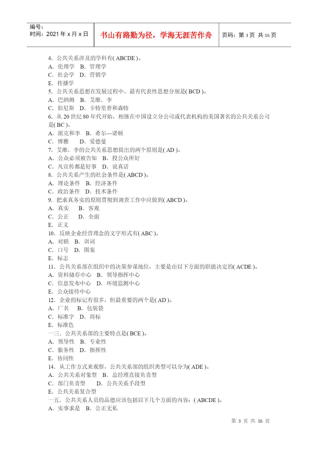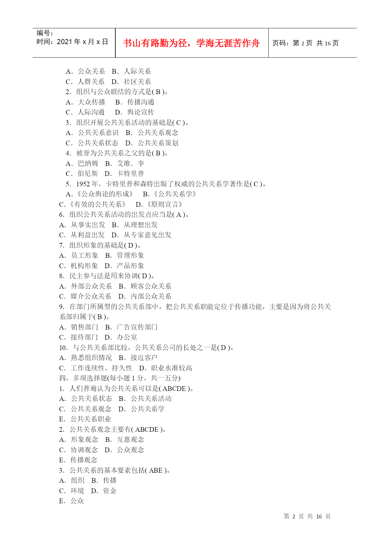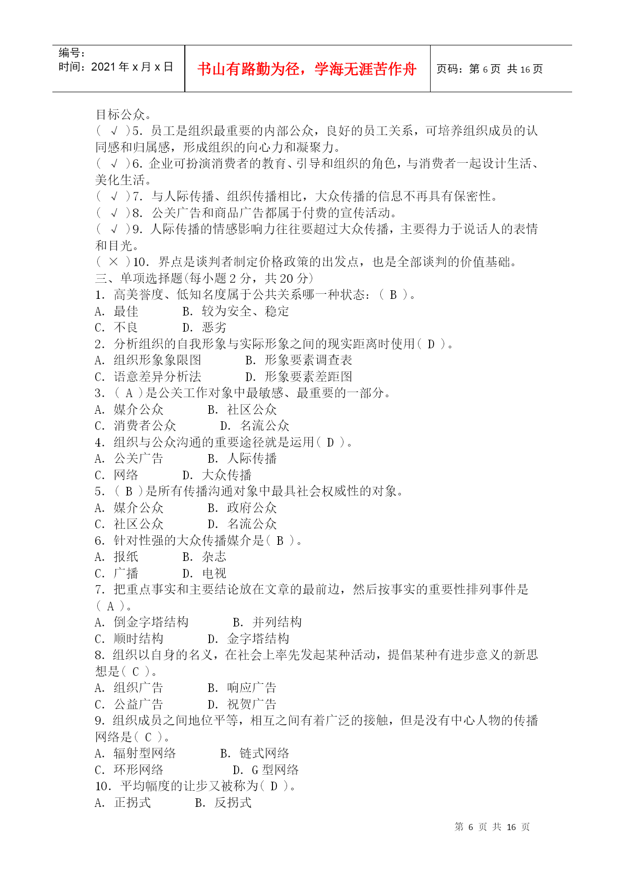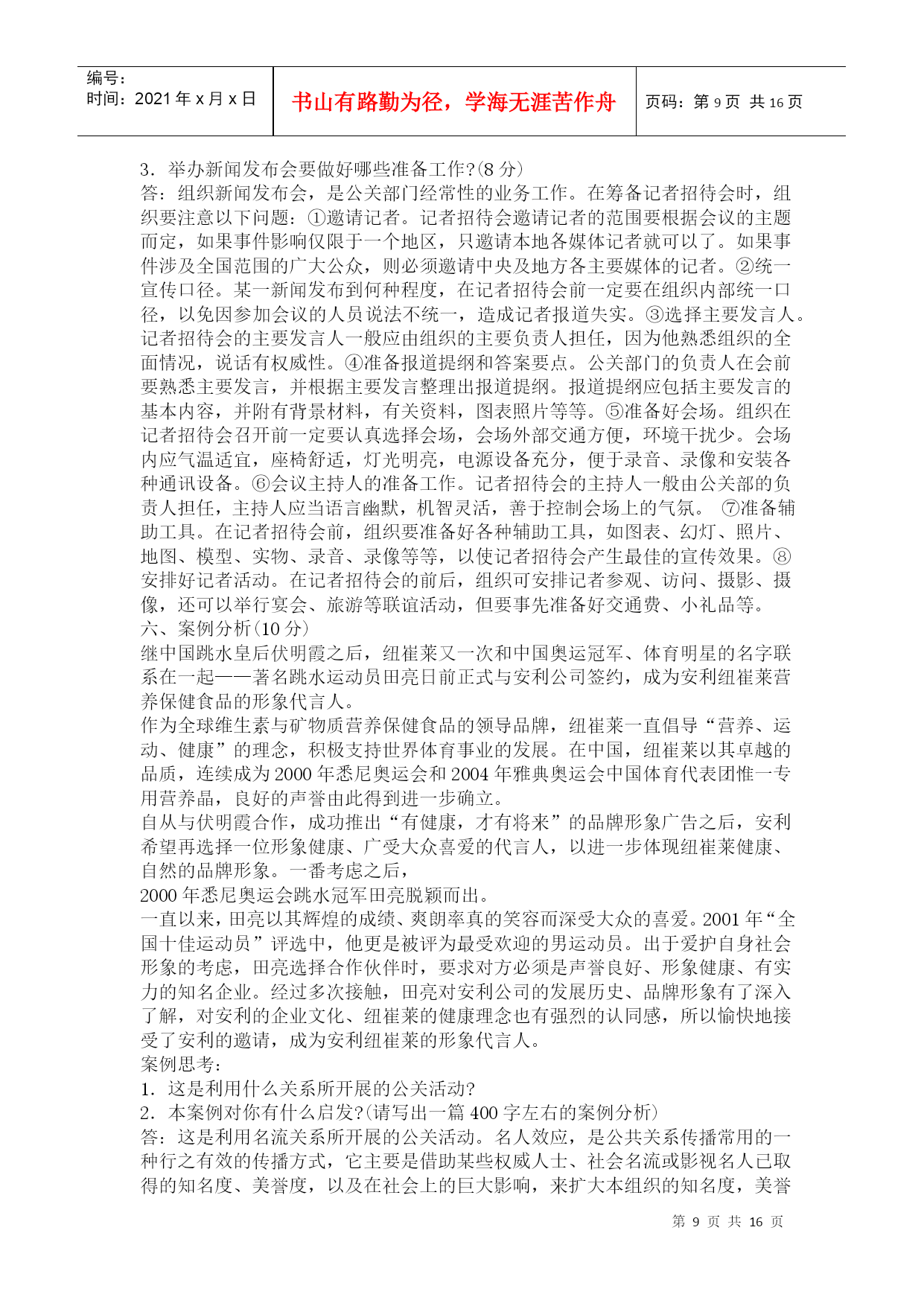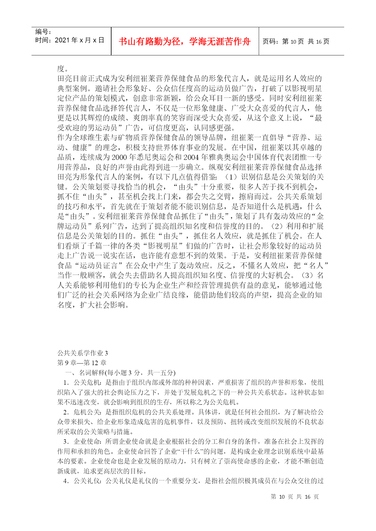 编号:时间:2021年x月x日书山有路勤为径,学海无涯苦作舟页码:第PAGE16页共NUMPAGES16页第PAGE\*MERGEFORMAT16页共NUMPAGES\*MERGEFORMAT16页HYPERLINK"xxxx/"《公共关系学》形成性考核册1-4全部答案公共关系学作业1第1章—第4章一、名词解释(每小题3分,共一五分)1.公共关系:所谓公共关系,就是一个组织运用有效的传播手段,使自身适应公众的需要,并使公众也适应组织发展需要的一种思想、政策和管理职能。2.公共关系观念:是人们在公共关系实践中形成的影响人们思想和行为倾向的深层的思想意识,是人们对公共关系活动的一种自觉的认识和理解。3.揭丑运动:19世纪下半叶,美国的商品经济得到高度发展,资本主义从自由竞争走向了垄断。百来个经济巨头控制了美国的经济命脉,他们为了巩固这种垄断地位,对内根本无视员工的利益,对外以损害公众利益作为赚钱的重要手段,奉行所谓“只有我能发财,让公众利益见鬼去吧”的经营哲学,引起了社会公众舆论的强烈不满和抨击,出现了2000多篇揭露实业界、传播界丑闻的文章,形成了近代美国史—上著名的“揭丑运动”。(又称“扒粪运动”)4.爱德华·伯尼斯:使公共关系由一种活动、一种社会现象变为一门科学的杰出人物是爱德华·伯奈斯。他从1923年出版第一部公共关系著作《公众舆论之凝结》,到1952年完成教科书《公共关系学》,使公共关系的原理和方法逐渐形成一个较为完整的理论体系。他强调组织应该在确切了解自己的公众的基础上来进行组织的传播工作;通过“投公众所好”来实现组织的目标。由于伯奈斯将公共关系引上了科学的轨道,被世人誉为“公共关系泰斗”。5.全员公关:全员公关指社会组织中所有工作人员都参与公共关系活动,简称全员PR。其意义在于增强组织全体员工的公关意识,上下齐心,合理搞好公关工作。二、判断正误并更正(每小题2分,共20分)(√)1.公共关系是一门综合性的应用科学。(√)2.公共关系特指组织与公众之间的传播沟通关系。(×)3.公共关系传播模式是根据传播过程的反馈模式的原理设计的,但它不包含“五W”模式的基本要素。(×)4.艾维·李创办世界上第一家宣传事务顾问所。(×)5.有了发达的商品经济就会产生发达的公共关系。(√)6.公共关系90%靠自己做得对,10%靠宣传。(√)7.在比较发达的商品经济社会,公众的消费主要是由消费心理支配的。(×)8.公共关系完全是为组织营造生存、发展环境服务的。(√)9.公共关系部的优势,往往就是公共关系公司的不足之处,反之亦然。(×)10.一般认为,公共关系的人才培养,就是培养专才式的公共关系人才。三、单项选择题(每小题2分,共20分)1.公共关系可直接称为(A)。A.公众关系B.人际关系C.人群关系D.社区关系2.组织与公众联结的方式是(B)。A.大众传播B.传播沟通C.人际沟通D.舆论宣传3.组织开展公共关系活动的基础是(C)。A.公共关系意识B.公共关系观念C.公共关系状态D.公共关系策划4.被誉为公共关系之父的是(B)。A.巴纳姆B.艾维.李C.伯尼斯D.卡特里普5.1952年,卡特里普和森特出版了权威的公共关系学著作是(C)。A.《公众舆论的形成》B.《公共关系学》C.《有效的公共关系》D.《原则宣言》6.组织公共关系活动的出发点应当是(A)。A.从事实出发B.从理想出发C.从利益出发D.从专家意见出发7.组织形象的基础是(D)。A.员工形象B.管理形象C.机构形象D.产品形象8.民主参与法是用来协调(D)。A.外部公众关系B.顾客公众关系C.媒介公众关系D.内部公众关系9.在部门所属型的公共关系部中,把公共关系职能定位于传播功能,主要是因为将公共关系部归属于(B)。A.销售部门B.广告宣传部门C.接待部门D.办公室10.与公共关系部比较,公共关系公司的长处之一是(D)。A.熟悉组织情况B.接近客户C.工作连续性、持久性D.职业水准较高四、多项选择题(每小题1分,共一五分)1.人们普遍认为公共关系可以是(ABCDE)。A.公共关系状态B.公共关系活动C.公共关系观念D.公共关系学E.公共关系职业2.公共关系观念主要有(ABCDE)。A.形象观念B.互惠观念C.协调观念D.公众观念E.传播观念3.公共关系的基本要素包括(ABE)。A.组织B.传播C.环境D.资金E.公众4.公共关系涉及的学科有(ABCDE)。A.伦理学B.管理学C.社会学D.营销学E.传播学5.公共关系思想在发展过程中,最有代表性思想分别是(BCD)。A.巴纳姆B.艾维.李C.伯尼斯D.卡特里普和森特6.从20世纪80年代开始,相继在中国设立分公司或代表机构的美国著名的公共关系公司是(BC)。A.派克和李B.希尔—