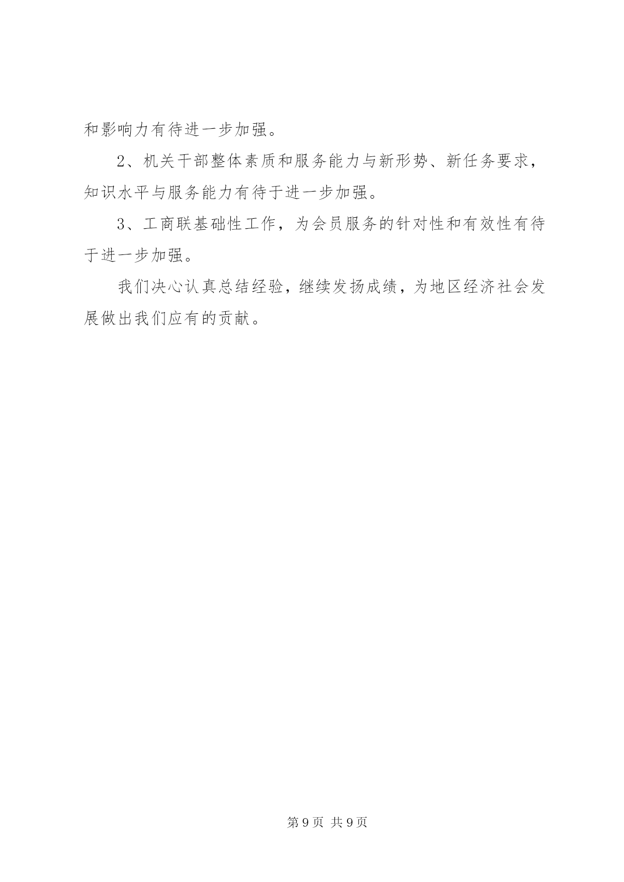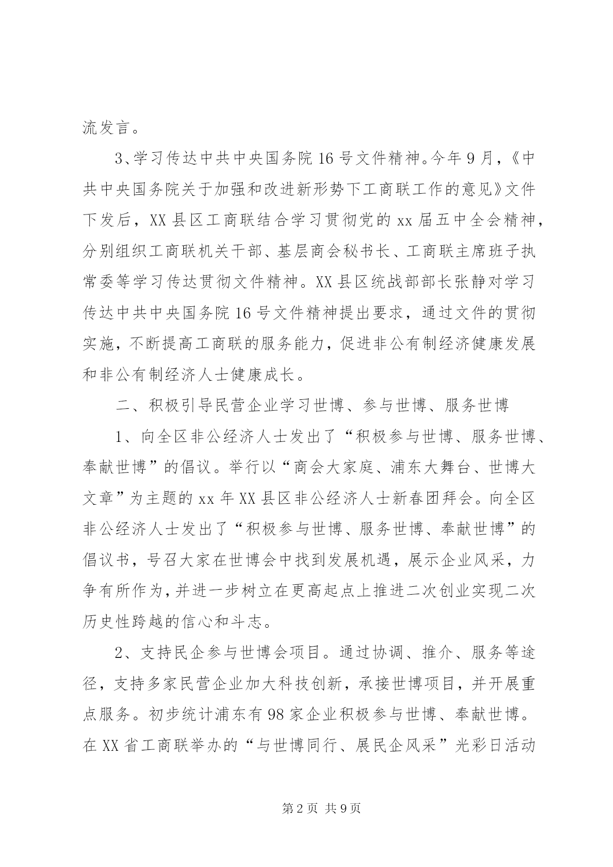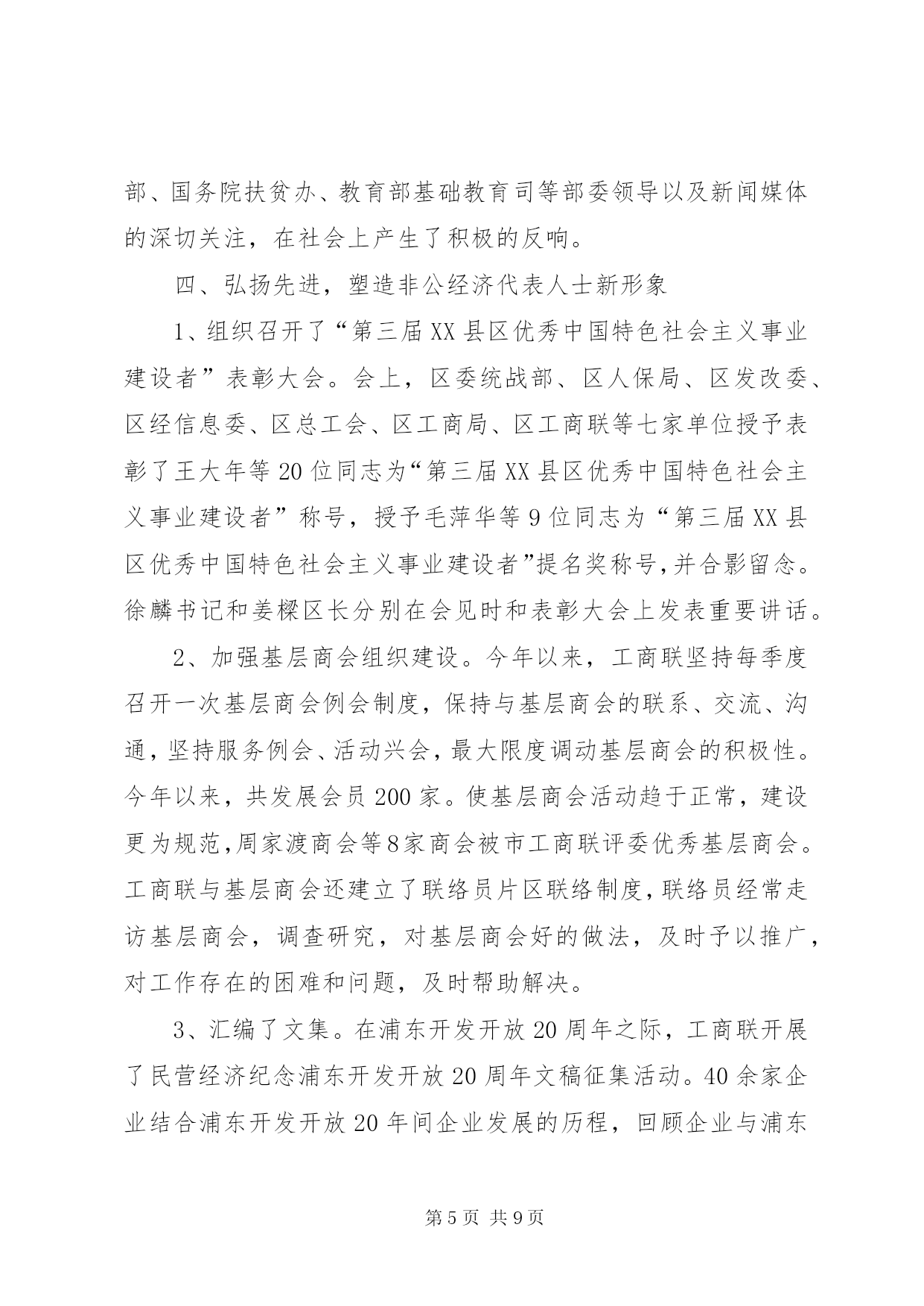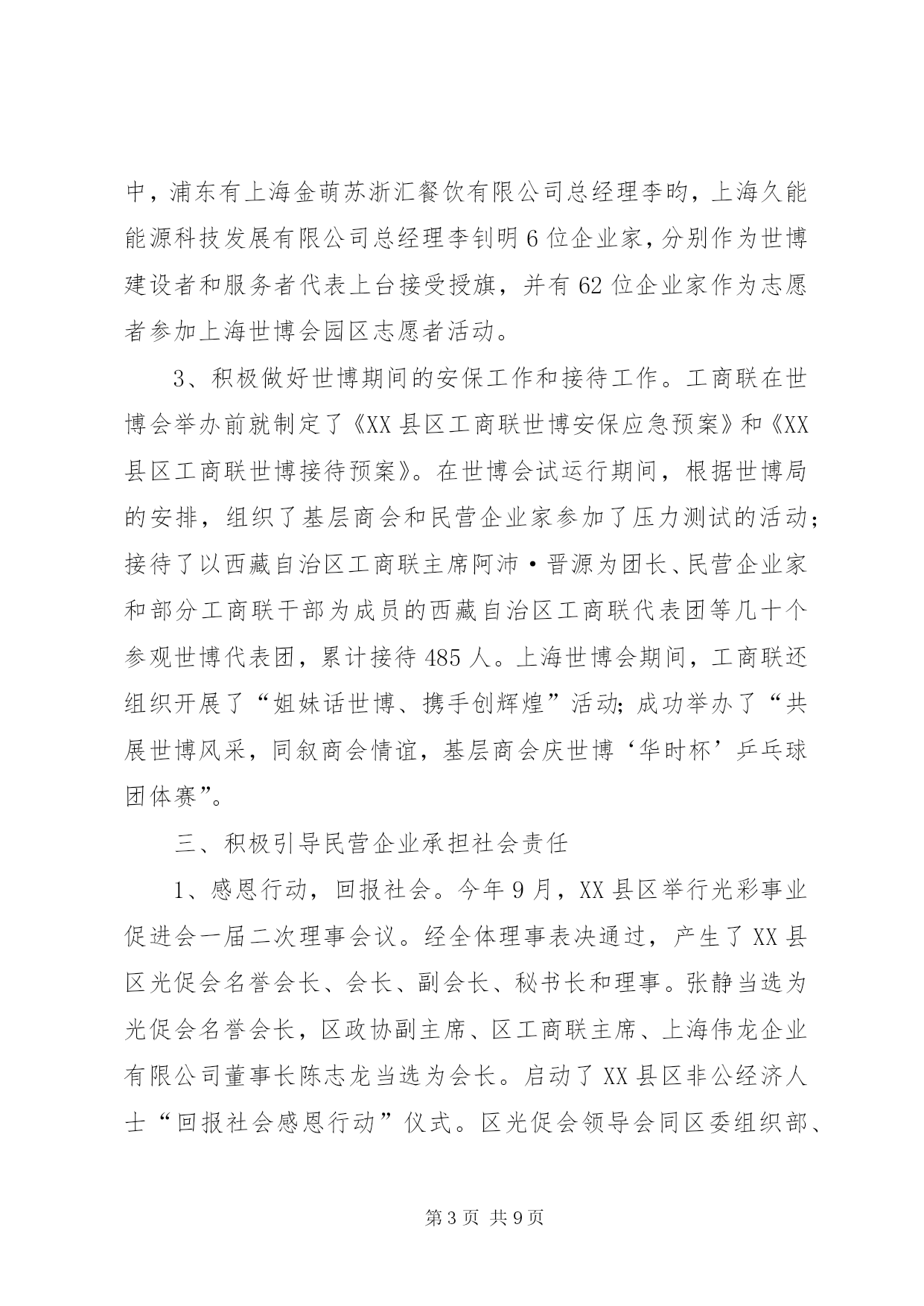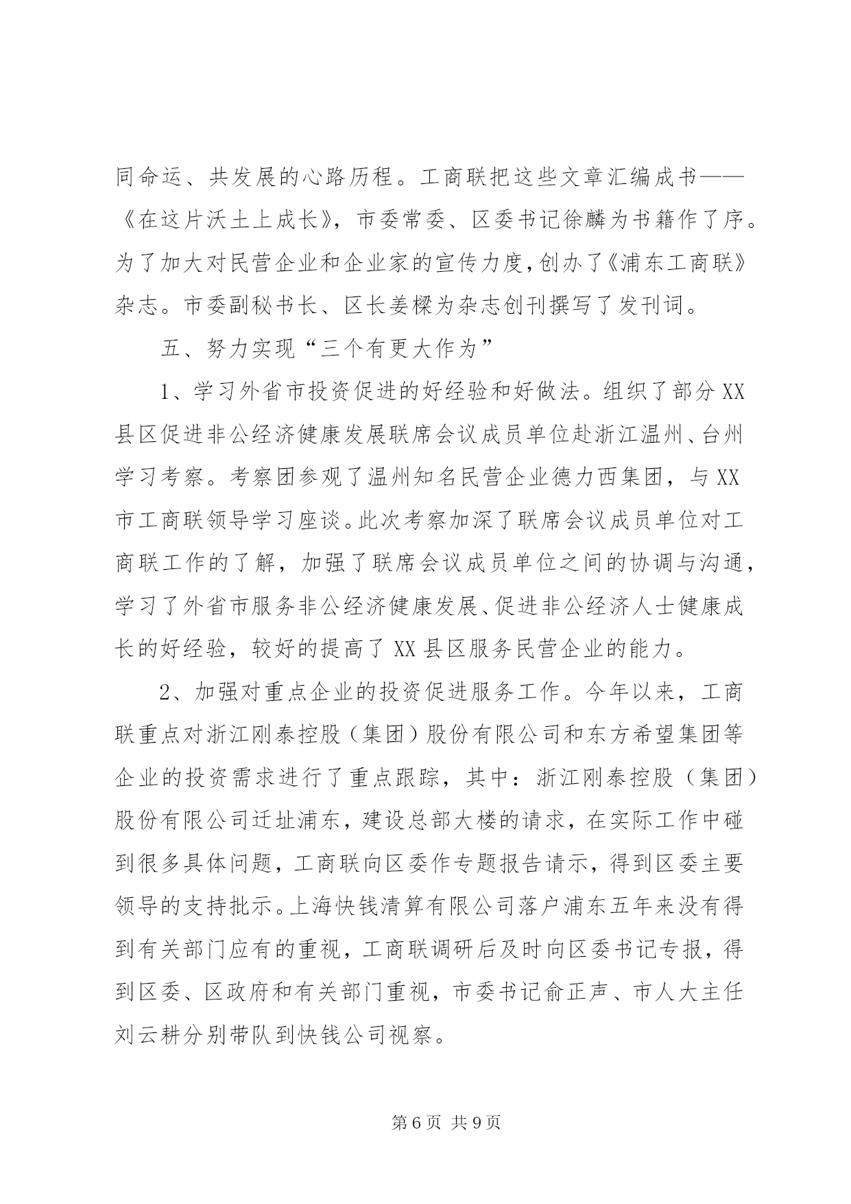 第PAGE\*Arabic\*MERGEFORMAT9页共NUMPAGES\*MERGEFORMAT9页工商联党组领导班子述职报告在区委和区委统战部的正确领导下,在市工商联的正确指导下,紧紧围绕区委和区政府的中心工作,认真履行工商联职责,按照xx提出的工商联要从全局和战略的高度,为非公有制企业在加快发展方式的转变、保障和改善民生、提升自身素质方面有更大的作为,充分发挥了工商联党组领导核心作用,推动非公有制经济又好又快发展和不断开创工商联工作新局面。今年以来工商联主要做了以下工作:一、积极开展思想政治引领工作1、组织学习xx重要讲话精神。今年全国政协大会开幕后第一天讨论,xx就看望民建、工商联界别委员,参加讨论,并发表了重要讲话,《国务院关于鼓励和引导民间投资健康发展的若干意见》,工商联及时组织民营企业家和基层商会学习讨论,反响热烈。大家表示,要把握好这一历史机遇,更好地为浦东再次实现跨越式发展建立新功。2、新浦东、新机遇、再创辉煌。为鼓励非公有制经济快速发展,XX县区召开民营经济纪念浦东开发开放20周年座谈会。出席这次会议的领导有市委常委、XX县区区委书记徐麟,市政协副主席、市工商联主席王新奎,市委副秘书长、区委副书记、区长姜樑等,XX县区有关委办局的领导以及来自浦东各行业的民营经济人士代表参加了座谈会。5位民营经济代表人士作了交流发言。3、学习传达中共中央国务院16号文件精神。今年9月,《中共中央国务院关于加强和改进新形势下工商联工作的意见》文件下发后,XX县区工商联结合学习贯彻党的xx届五中全会精神,分别组织工商联机关干部、基层商会秘书长、工商联主席班子执常委等学习传达贯彻文件精神。XX县区统战部部长张静对学习传达中共中央国务院16号文件精神提出要求,通过文件的贯彻实施,不断提高工商联的服务能力,促进非公有制经济健康发展和非公有制经济人士健康成长。二、积极引导民营企业学习世博、参与世博、服务世博1、向全区非公经济人士发出了“积极参与世博、服务世博、奉献世博”的倡议。举行以“商会大家庭、浦东大舞台、世博大文章”为主题的xx年XX县区非公经济人士新春团拜会。向全区非公经济人士发出了“积极参与世博、服务世博、奉献世博”的倡议书,号召大家在世博会中找到发展机遇,展示企业风采,力争有所作为,并进一步树立在更高起点上推进二次创业实现二次历史性跨越的信心和斗志。2、支持民企参与世博会项目。通过协调、推介、服务等途径,支持多家民营企业加大科技创新,承接世博项目,并开展重点服务。初步统计浦东有98家企业积极参与世博、奉献世博。在XX省工商联举办的“与世博同行、展民企风采”光彩日活动中,浦东有上海金萌苏浙汇餐饮有限公司总经理李昀,上海久能能源科技发展有限公司总经理李钊明6位企业家,分别作为世博建设者和服务者代表上台接受授旗,并有62位企业家作为志愿者参加上海世博会园区志愿者活动。3、积极做好世博期间的安保工作和接待工作。工商联在世博会举办前就制定了《XX县区工商联世博安保应急预案》和《XX县区工商联世博接待预案》。在世博会试运行期间,根据世博局的安排,组织了基层商会和民营企业家参加了压力测试的活动;接待了以西藏自治区工商联主席阿沛·晋源为团长、民营企业家和部分工商联干部为成员的西藏自治区工商联代表团等几十个参观世博代表团,累计接待485人。上海世博会期间,工商联还组织开展了“姐妹话世博、携手创辉煌”活动;成功举办了“共展世博风采,同叙商会情谊,基层商会庆世博‘华时杯’乒乓球团体赛”。三、积极引导民营企业承担社会责任1、感恩行动,回报社会。今年9月,XX县区举行光彩事业促进会一届二次理事会议。经全体理事表决通过,产生了XX县区光促会名誉会长、会长、副会长、秘书长和理事。张静当选为光促会名誉会长,区政协副主席、区工商联主席、上海伟龙企业有限公司董事长陈志龙当选为会长。启动了XX县区非公经济人士“回报社会感恩行动”仪式。区光促会领导会同区委组织部、统战部、工商联领导,慰问了26位“三老”对象。12月,根据市工商联安排,对支内返沪的97位劳模进行了走访慰问。2、情系玉树,奉献爱心。玉树地震发生后,XX县区工商联在组织机关干部捐款的同时,迅速向全区各基层商会和非公有制企业发出赈灾工作的紧急通知,工商联在张江集电港会展中心举办了以“情系玉树、奉献爱心”为主题的浦东非公经济向青海玉树赈灾捐款仪式,近百名XX县区民营企业家、基层商会干部参加了仪式。,浦东41家民营企业捐款582万元。浦东的盛大网络发展有限公司在中央电视台“情系玉树、大爱无疆”抗震救灾大型募捐活动上捐款1500万元;在市工商联的光彩活动日上,浦东有6家民营企业向灾区人民捐资480万元。据不完全统计,浦东民营企业已通过各种渠道,向全国、市、区红十字会、慈善基金会和光彩事