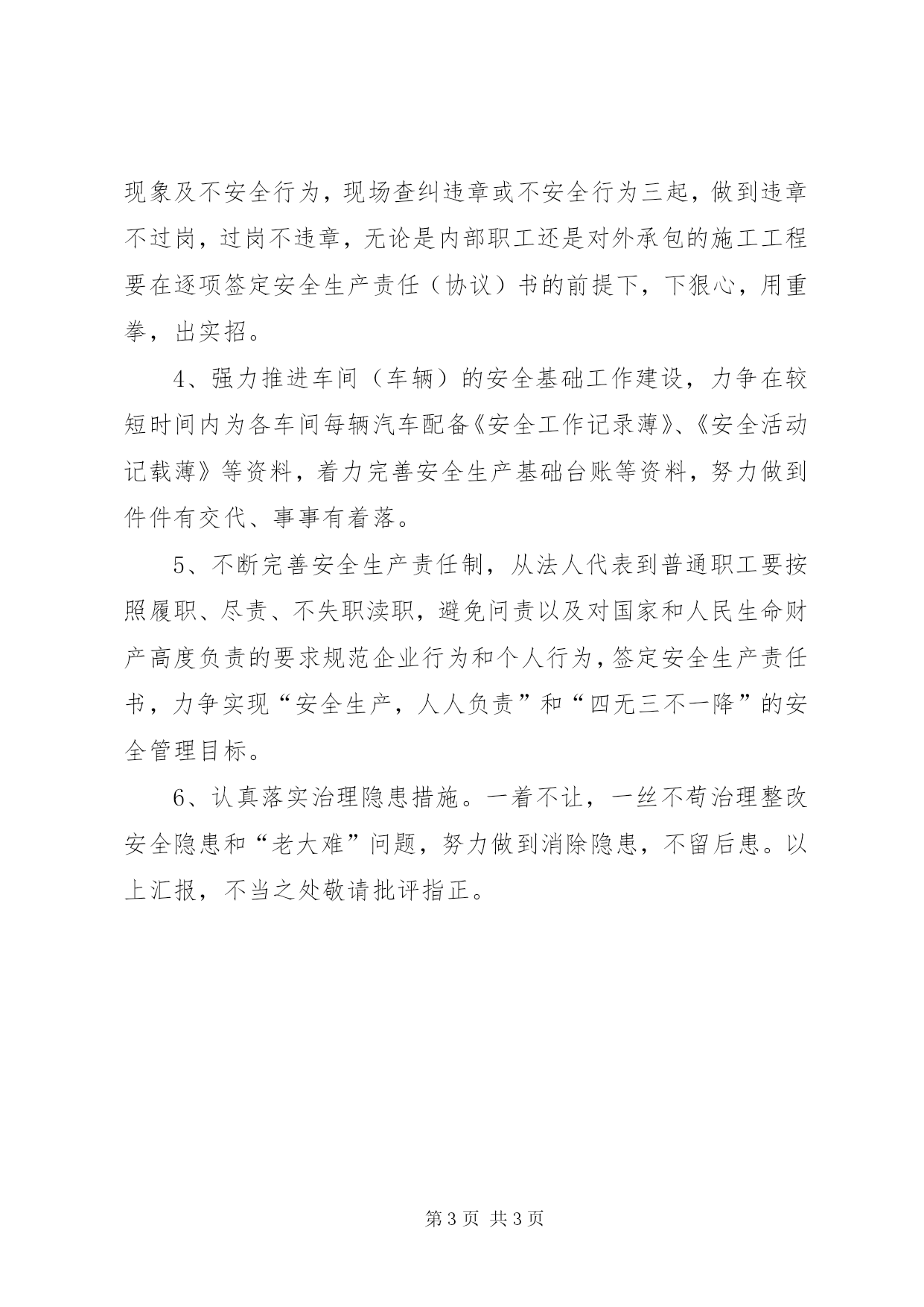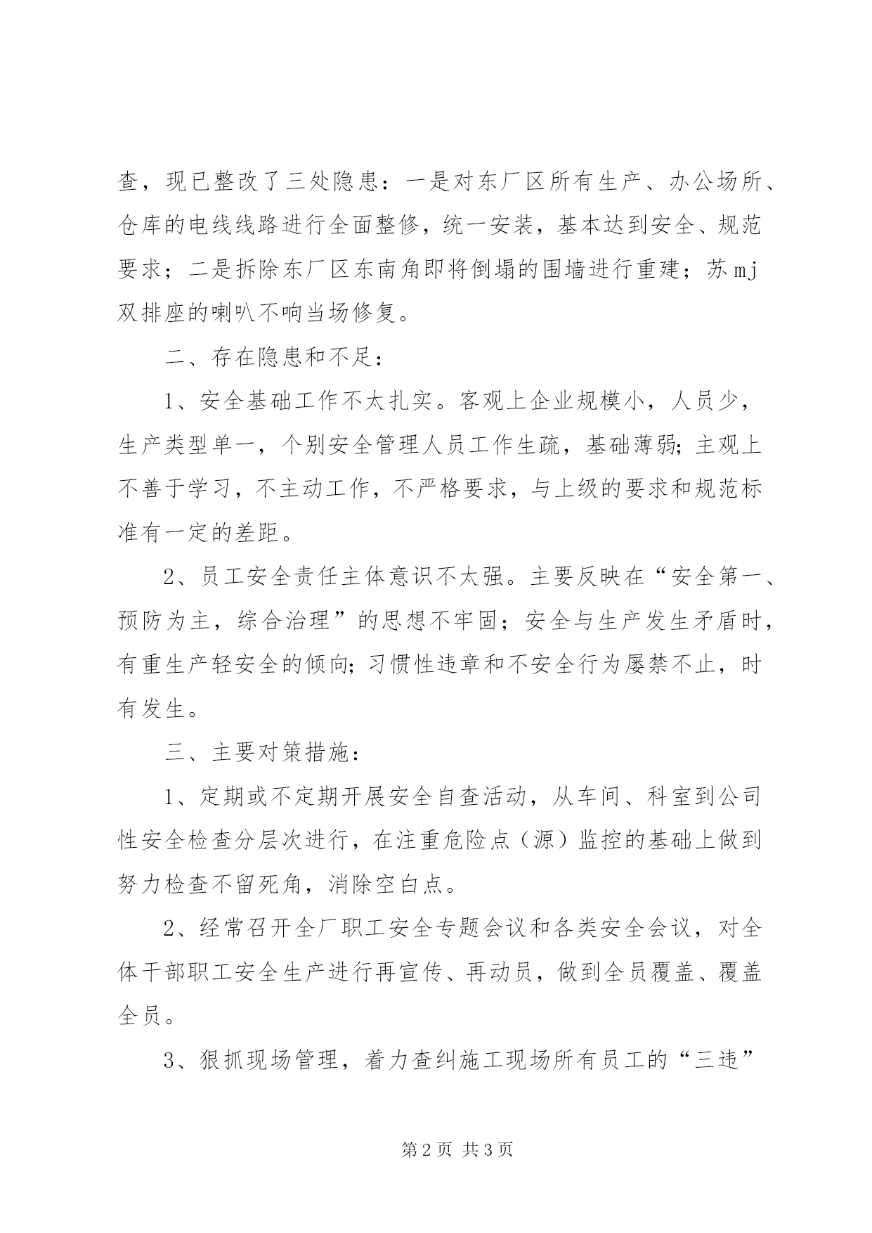 第PAGE\*Arabic\*MERGEFORMAT3页共NUMPAGES\*MERGEFORMAT3页交通公司安全自检汇报材料根据市交通局月日安全生产会议指示精神和工作要求,结合我司安全工作实际和生产经营特点,我们在国庆节前进行全公司范围内安全生产综合性大检查的基础上,近来又侧重对安全生产基础资料生产用电及现场管理为主要内容的安全自查,着力隐患整改和资料完善,现简要汇报如下:一、安全自查回顾:1、集中检查。在局安全生产会议后由总经理同志亲自挂帅,分管经理和其他公司领导以及安全、生产等部门负责人、各车间主任、宁通高速公路养护队队长参加,集中检查了东西两个厂区所有的生产车间、仓库、办公场所用电设施、机械设备等。2、跟踪检查。一是我们派专人到宁通公路养护现场以及生产车间对施工人员及车辆、设备、安全标志牌施放等情况进行跟踪检查;二是由安全科牵头对所属驾驶员资质逐一过堂,一一把关并对其生产车辆的安全部件(方向、照明、制止等)重点检查。3、资料自查。月至月日由分管经理督办,安全科全体人员就今年以来的安全资料进行了全面自查,认真梳理,捡漏补缺。4、思想自省:公司在安全生产会议上明确要求,法人代表、分管经理到一线生产人员要进行一次认真反省:(1)在思想认识上对安全工作重视不重视;(2)在日常工作中有没有“三违”行为;(3)今年以来我为安全工作做了什么。做得怎么样。通过自查,现已整改了三处隐患:一是对东厂区所有生产、办公场所、仓库的电线线路进行全面整修,统一安装,基本达到安全、规范要求;二是拆除东厂区东南角即将倒塌的围墙进行重建;苏mj双排座的喇叭不响当场修复。二、存在隐患和不足:1、安全基础工作不太扎实。客观上企业规模小,人员少,生产类型单一,个别安全管理人员工作生疏,基础薄弱;主观上不善于学习,不主动工作,不严格要求,与上级的要求和规范标准有一定的差距。2、员工安全责任主体意识不太强。主要反映在“安全第一、预防为主,综合治理”的思想不牢固;安全与生产发生矛盾时,有重生产轻安全的倾向;习惯性违章和不安全行为屡禁不止,时有发生。三、主要对策措施:1、定期或不定期开展安全自查活动,从车间、科室到公司性安全检查分层次进行,在注重危险点(源)监控的基础上做到努力检查不留死角,消除空白点。2、经常召开全厂职工安全专题会议和各类安全会议,对全体干部职工安全生产进行再宣传、再动员,做到全员覆盖、覆盖全员。3、狠抓现场管理,着力查纠施工现场所有员工的“三违”现象及不安全行为,现场查纠违章或不安全行为三起,做到违章不过岗,过岗不违章,无论是内部职工还是对外承包的施工工程要在逐项签定安全生产责任(协议)书的前提下,下狠心,用重拳,出实招。4、强力推进车间(车辆)的安全基础工作建设,力争在较短时间内为各车间每辆汽车配备《安全工作记录薄》、《安全活动记载薄》等资料,着力完善安全生产基础台账等资料,努力做到件件有交代、事事有着落。5、不断完善安全生产责任制,从法人代表到普通职工要按照履职、尽责、不失职渎职,避免问责以及对国家和人民生命财产高度负责的要求规范企业行为和个人行为,签定安全生产责任书,力争实现“安全生产,人人负责”和“四无三不一降”的安全管理目标。6、认真落实治理隐患措施。一着不让,一丝不苟治理整改安全隐患和“老大难”问题,努力做到消除隐患,不留后患。以上汇报,不当之处敬请批评指正。