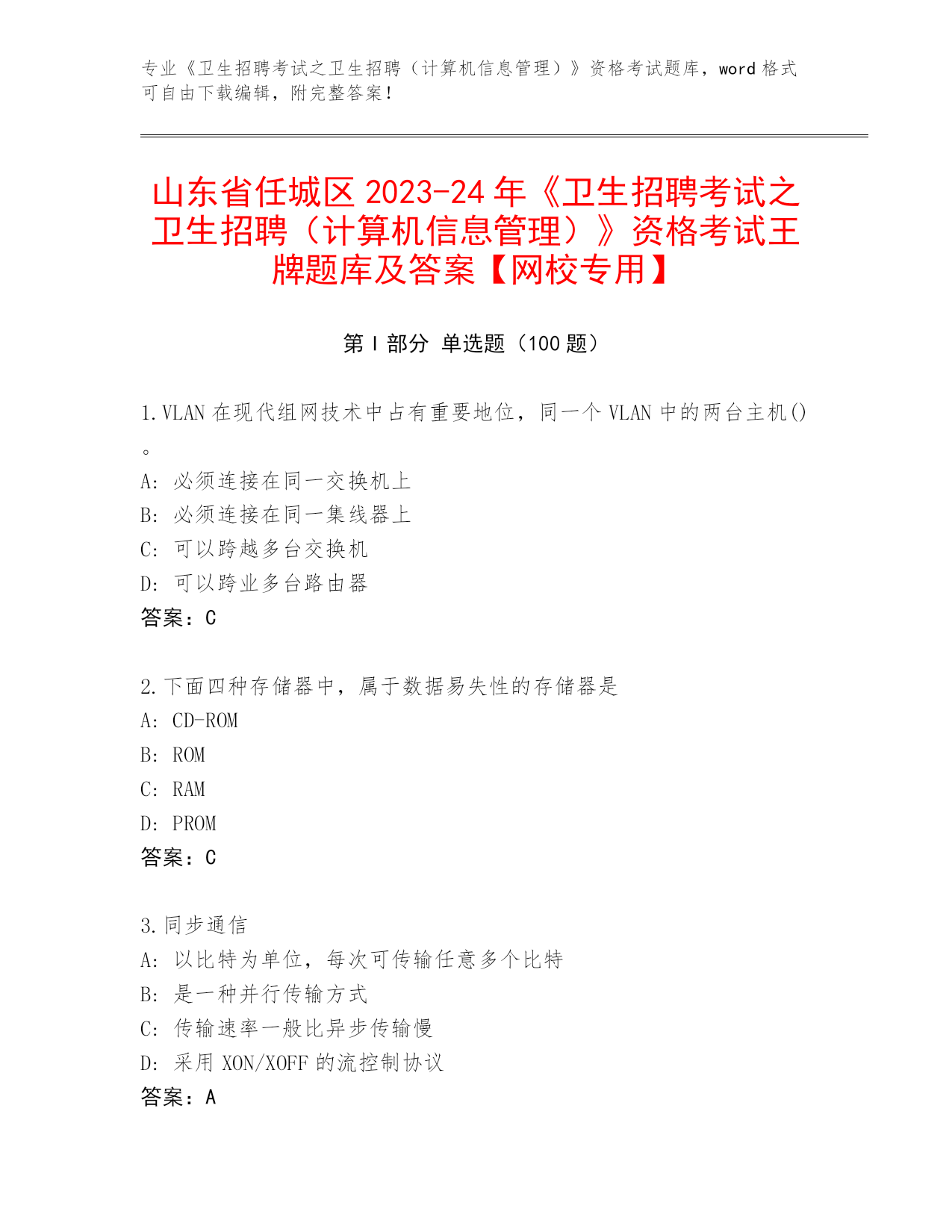 山东省任城区2023-24年《卫生招聘考试之卫生招聘(计算机信息管理)》资格考试王牌题库及答案【网校专用】