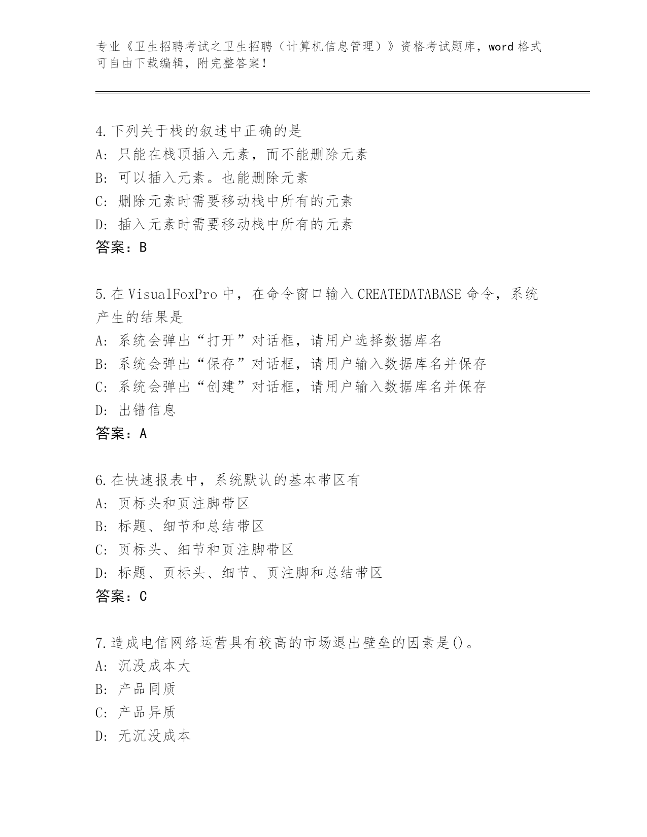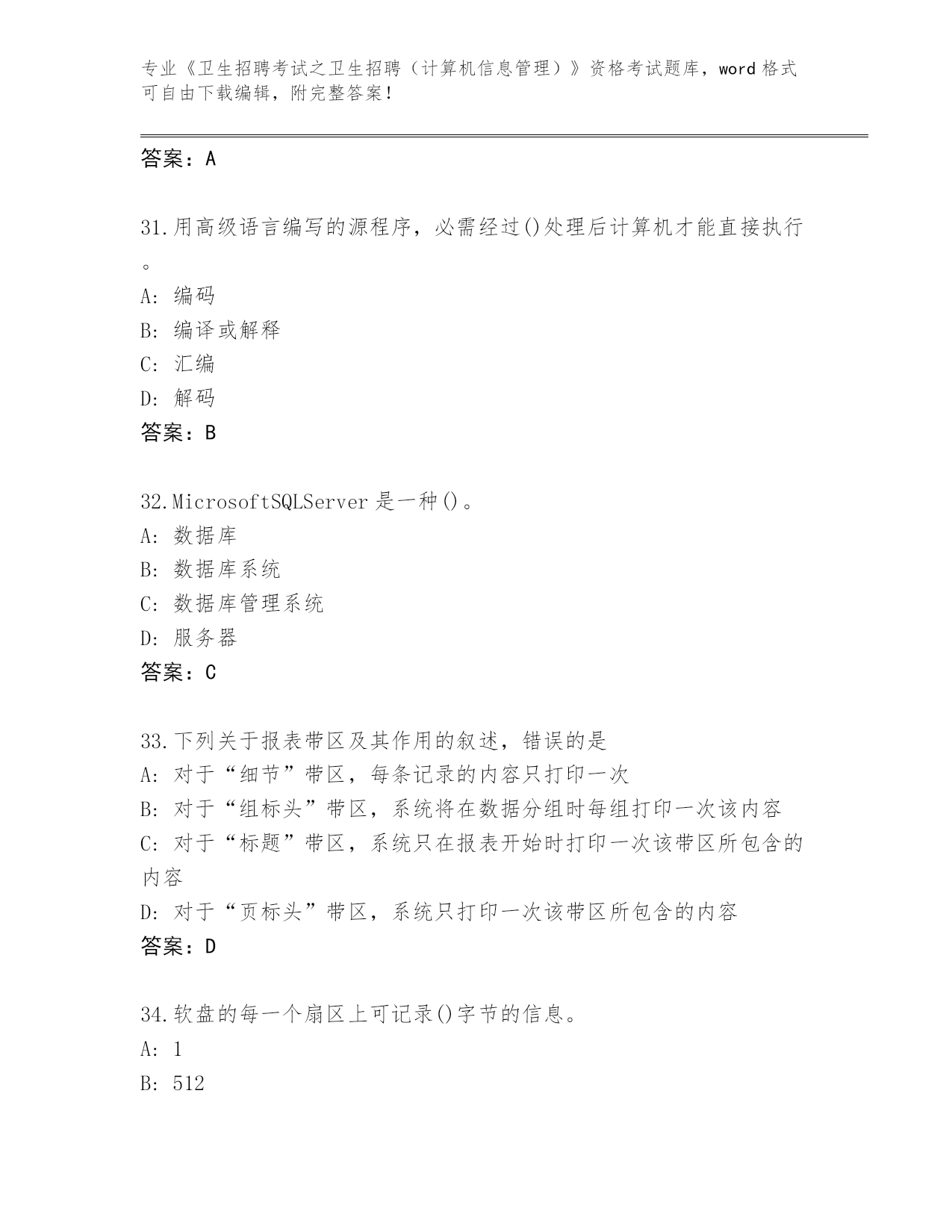2024年江西省浔阳区《卫生招聘考试之卫生招聘(计算机信息管理)》考试王牌题库(网校专用)