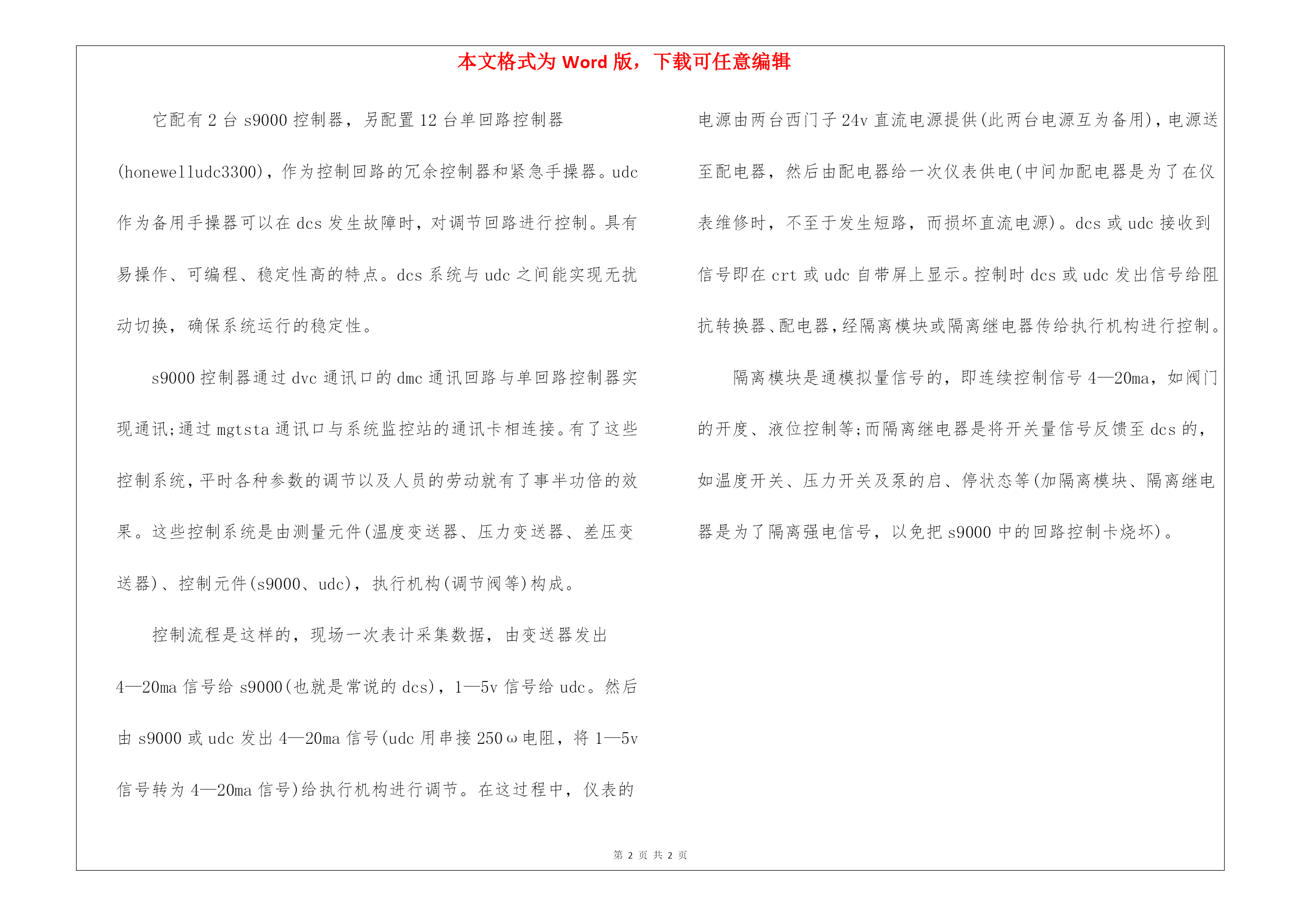 本文格式为Word版,下载可任意编辑第PAGE\*MERGEFORMAT2页共NUMPAGES\*MERGEFORMAT2页2022年度终技术员个人工作总结2022年度终技术员个人工作总结工作总结网发布2022年度终技术员个人工作总结,更多2022年度终技术员个人工作总结相关信息请访问工作总结网工作总结频道。2022年度终技术员个人工作总结自某年某月我被公司授予技术员职称至现今,已有某年的时间。在这四年中,我一直在运行部工作,凭借自己的努力和领导的提携,从一名主值班员晋升到了值班长,进而又被提拔到了部门助理一职。在这期间,我对我们公司首站的各系统有了更深入的了解和认知,对一些系统发生的各类事故有了一定的独立分析和处理能力,做好了一个技术员应尽的职责。我在学校学的专业是热工及自动化控制专业,但从事我们的首站运行工作却最需要的是热机、电气等方面的知识。这对我来说就是一个新的挑战,还需要不断的学习提高,使自己的专业技能能全面发展。所以,我就找来一些有关这些方面的专业书籍,针对我们的'系统进行针对性的学习,同时还请教一些老师傅和专业人员,请他们现身说教。经过自己的努力和同事的帮助,总算功夫不负有心人,我的专业知识和专业技能都有了很大的提高。但我对我们系统有关热工方面的知识还是特别关注,并深入去了解和掌握它。同时在自己学好之余,还承担向其他运行人员说教的职责。我们公司的热水网工程是采用计算机监控系统实现热水网生产运行的数据的全面监控的。它的主要组件包括控制器、输入输出模件和监控站。我公司首站共有18套美国霍尼韦尔公司的scan3000/s9000集散型控制系统(distributedcontrolsystem,简称dcs),它具有热水网运行回路控制,数据采集,数据通信,集中化的信息管理和操作显示功能。它配有2台s9000控制器,另配置12台单回路控制器(honewelludc3300),作为控制回路的冗余控制器和紧急手操器。udc作为备用手操器可以在dcs发生故障时,对调节回路进行控制。具有易操作、可编程、稳定性高的特点。dcs系统与udc之间能实现无扰动切换,确保系统运行的稳定性。s9000控制器通过dvc通讯口的dmc通讯回路与单回路控制器实现通讯;通过mgtsta通讯口与系统监控站的通讯卡相连接。有了这些控制系统,平时各种参数的调节以及人员的劳动就有了事半功倍的效果。这些控制系统是由测量元件(温度变送器、压力变送器、差压变送器)、控制元件(s9000、udc),执行机构(调节阀等)构成。控制流程是这样的,现场一次表计采集数据,由变送器发出4—20ma信号给s9000(也就是常说的dcs),1—5v信号给udc。然后由s9000或udc发出4—20ma信号(udc用串接250ω电阻,将1—5v信号转为4—20ma信号)给执行机构进行调节。在这过程中,仪表的电源由两台西门子24v直流电源提供(此两台电源互为备用),电源送至配电器,然后由配电器给一次仪表供电(中间加配电器是为了在仪表维修时,不至于发生短路,而损坏直流电源)。dcs或udc接收到信号即在crt或udc自带屏上显示。控制时dcs或udc发出信号给阻抗转换器、配电器,经隔离模块或隔离继电器传给执行机构进行控制。隔离模块是通模拟量信号的,即连续控制信号4—20ma,如阀门的开度、液位控制等;而隔离继电器是将开关量信号反馈至dcs的,如温度开关、压力开关及泵的启、停状态等(加隔离模块、隔离继电器是为了隔离强电信号,以免把s9000中的回路控制卡烧坏)。