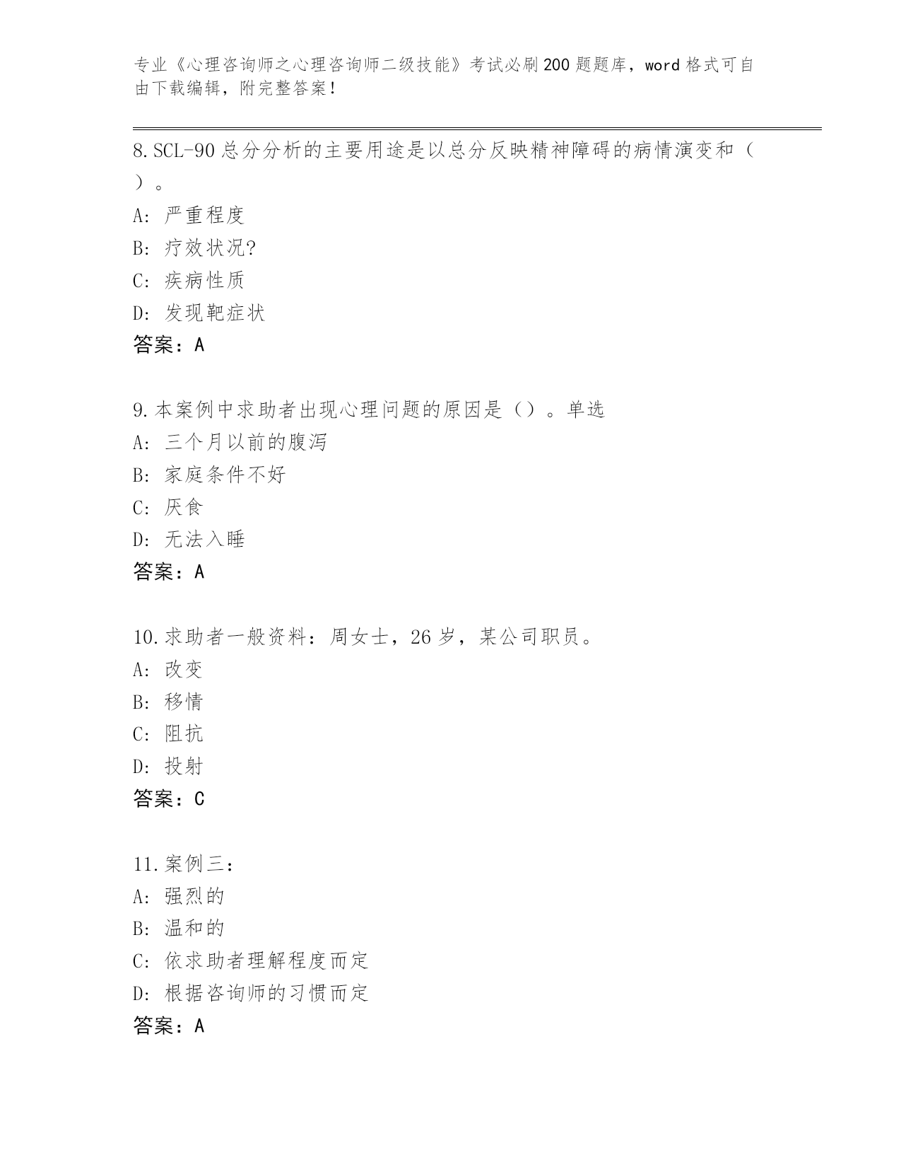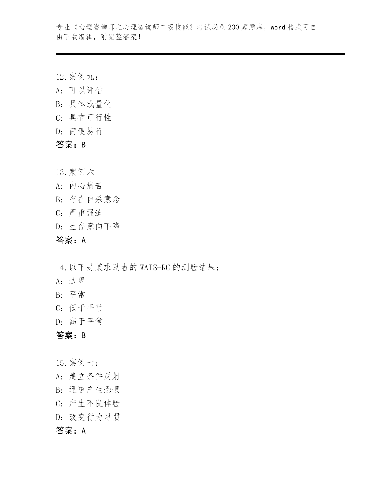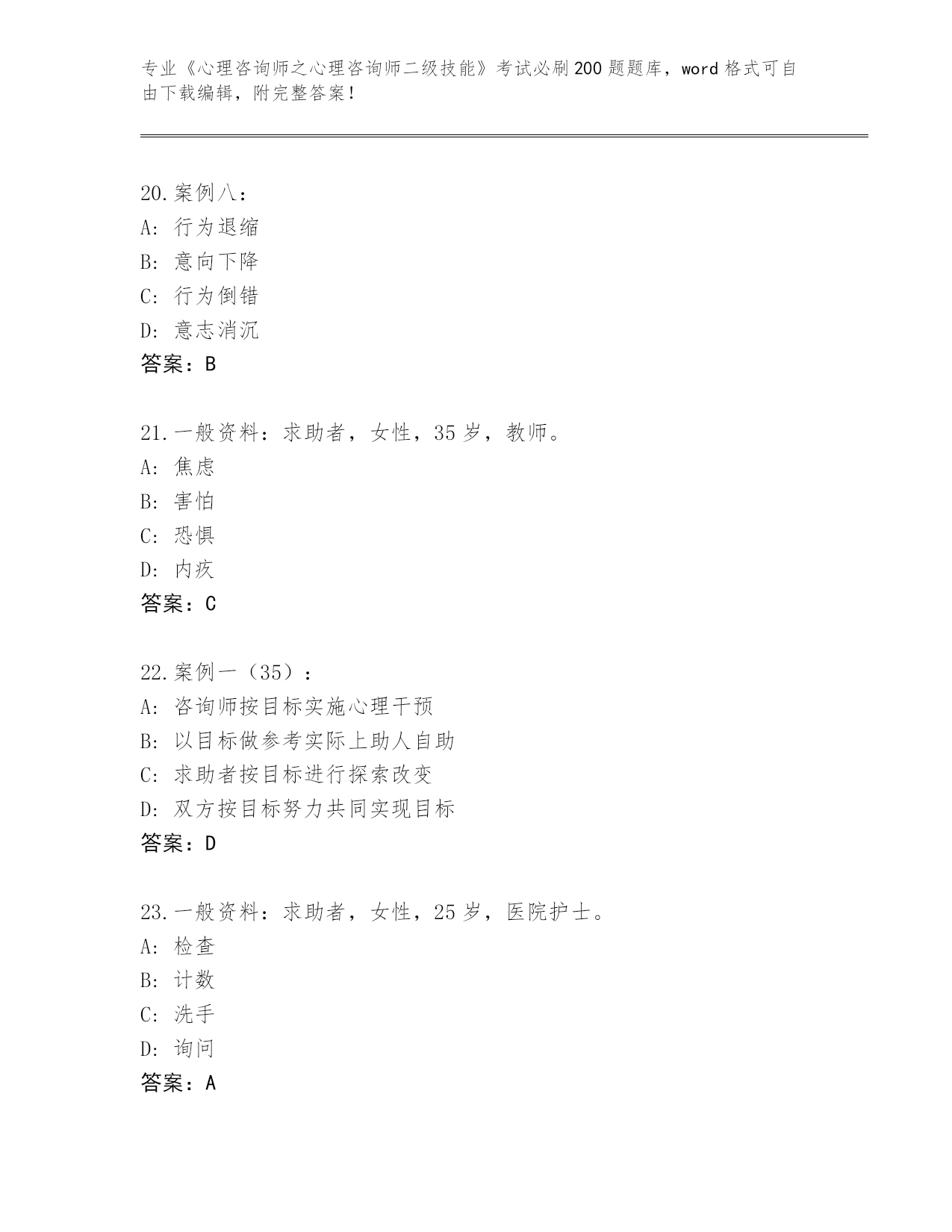 湖北省2024《心理咨询师之心理咨询师二级技能》考试必考200题题库及答案【必刷】