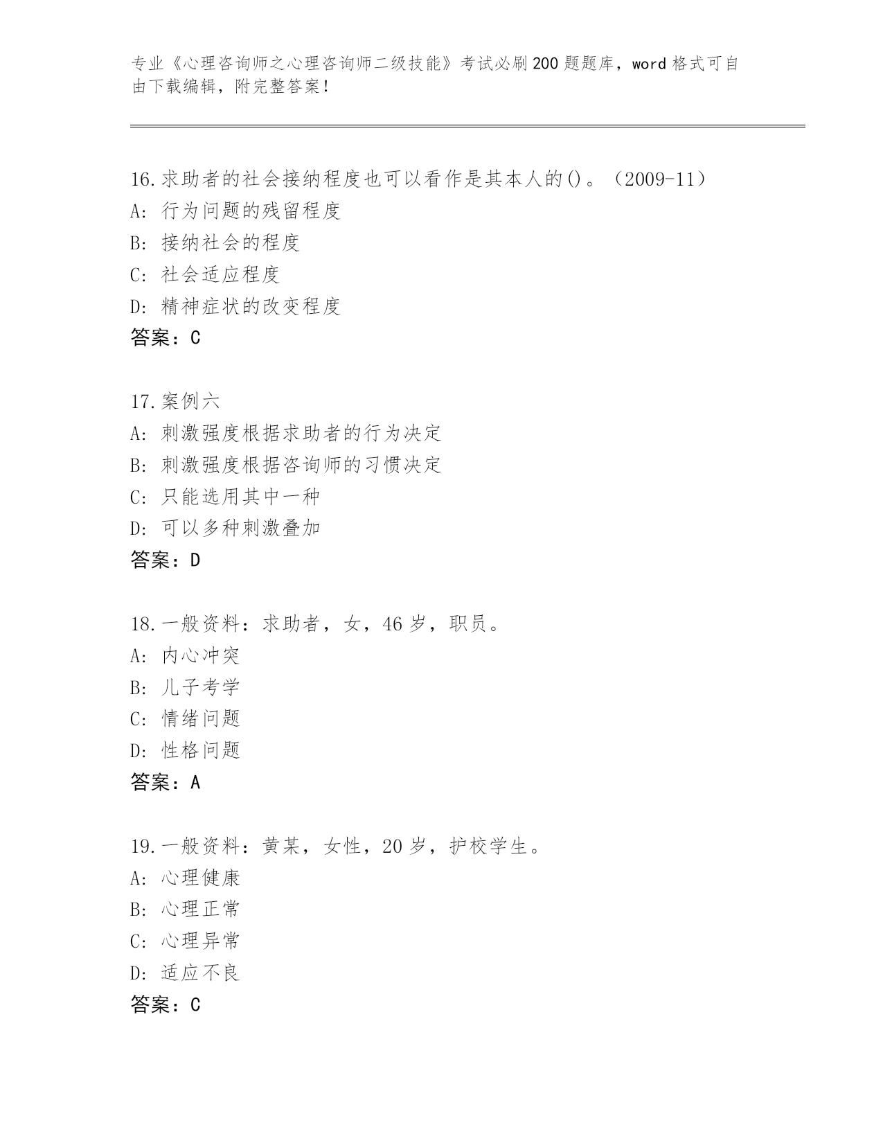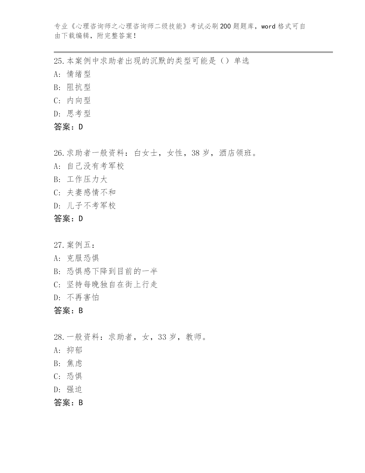 历年湖北省南漳县《心理咨询师之心理咨询师二级技能》资格考试必刷200题题库可打印