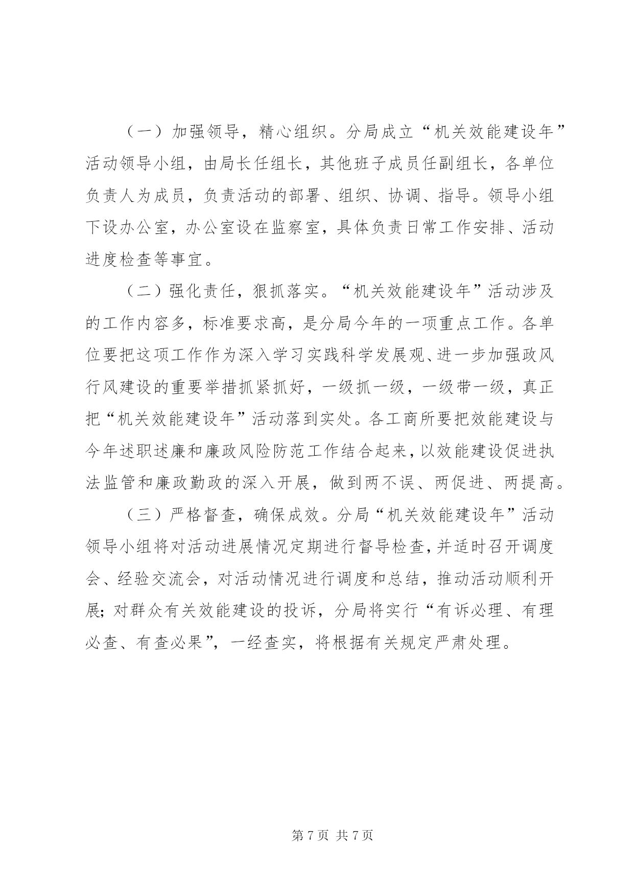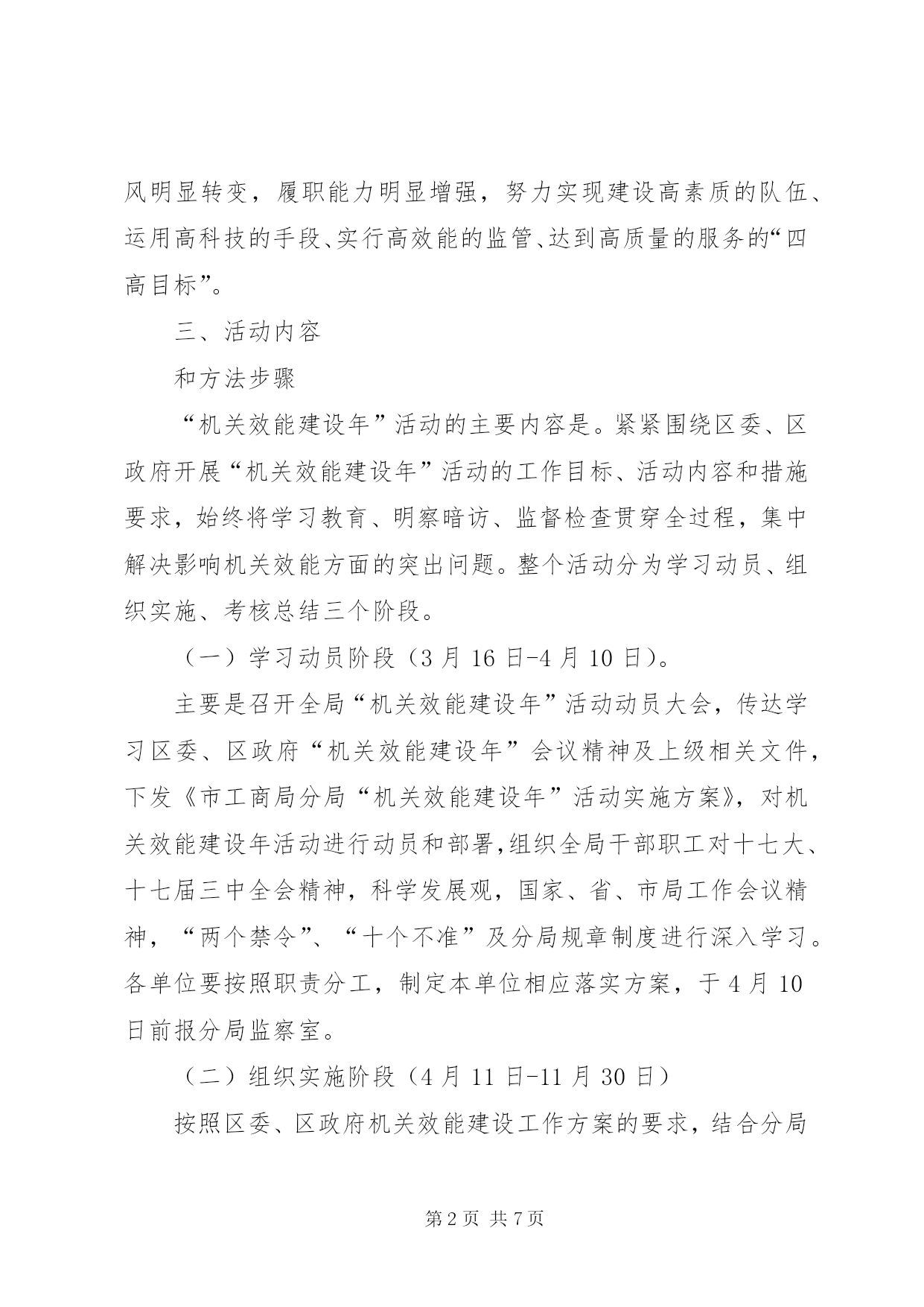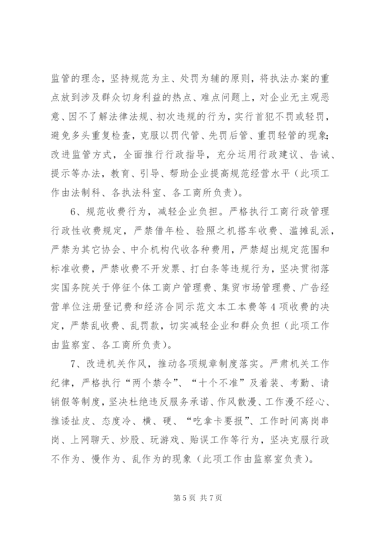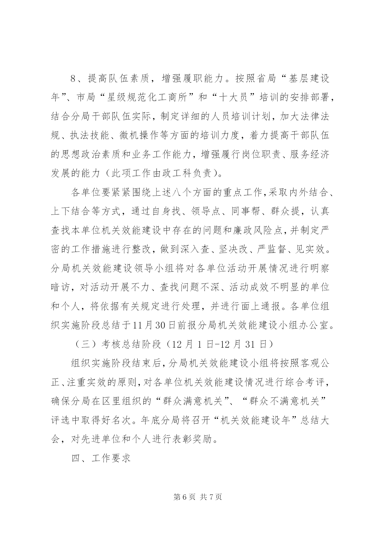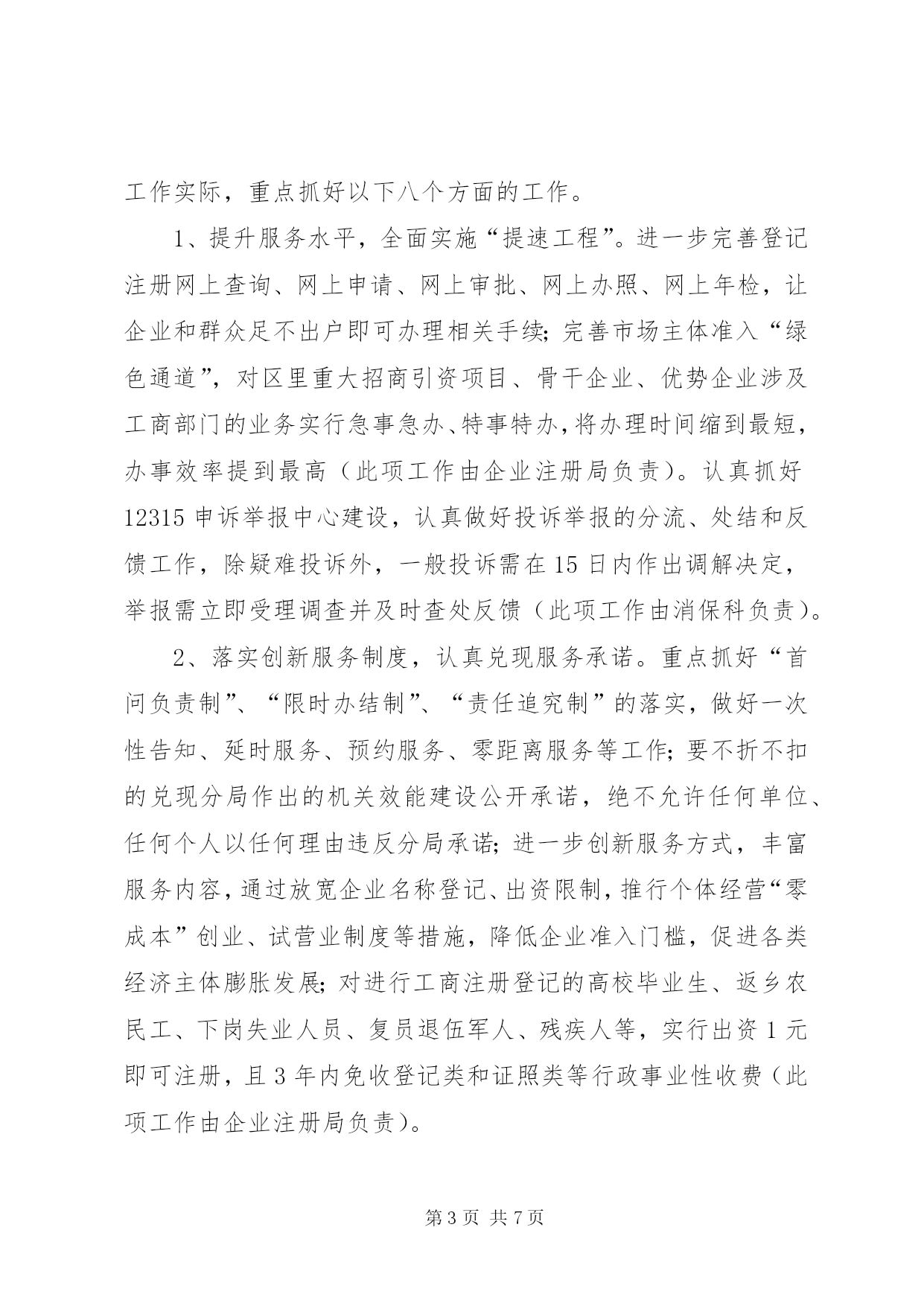 第PAGE\*Arabic\*MERGEFORMAT7页共NUMPAGES\*MERGEFORMAT7页工商局效能建设年指导方案为认真贯彻全区优化发展环境暨“机关效能建设年”活动会议精神,进一步提高分局行政服务效能,优化全区发展环境,扎实推进分局“机关效能建设年”活动深入开展,根据区委办公室、区政府办公室《关于印发〈区机关效能建设年活动工作方案〉的通知》要求,结合我局实际,制定本方案。一、指导思想以邓小平理论、“三个代表”重要思想为指导,全面学习实践科学发展观,深入贯彻落实党的十七大、十七届三中全会和国家、省、市工商行政管理工作会议精神,以实践“四个统一”为基本要求,以提高办事效率、提升服务水平为重点,以推进机关效能建设、树立廉洁、高效、为民工商形象为目标,积极采取有力措施,进一步规范行政行为、完善服务措施、强化监督管理,切实解决机关效能建设方面存在的突出问题。二、目标任务通过开展“机关效能建设年”活动,进一步加快推进以制度化、规范化、程序化、法治化为内容的“四化建设”,切实推动“两个禁令”、“十个不准”以及分局各项规章制度落实到位,力争在解决群众反映强烈的突出问题上有新突破,在解决影响和制约科学执法、和谐监管的突出问题上有新进展,在解决队伍政风行风方面的突出问题上有新成效,做到办事效率明显提高,工作作风明显转变,履职能力明显增强,努力实现建设高素质的队伍、运用高科技的手段、实行高效能的监管、达到高质量的服务的“四高目标”。三、活动内容和方法步骤“机关效能建设年”活动的主要内容是。紧紧围绕区委、区政府开展“机关效能建设年”活动的工作目标、活动内容和措施要求,始终将学习教育、明察暗访、监督检查贯穿全过程,集中解决影响机关效能方面的突出问题。整个活动分为学习动员、组织实施、考核总结三个阶段。(一)学习动员阶段(3月16日-4月10日)。主要是召开全局“机关效能建设年”活动动员大会,传达学习区委、区政府“机关效能建设年”会议精神及上级相关文件,下发《市工商局分局“机关效能建设年”活动实施方案》,对机关效能建设年活动进行动员和部署,组织全局干部职工对十七大、十七届三中全会精神,科学发展观,国家、省、市局工作会议精神,“两个禁令”、“十个不准”及分局规章制度进行深入学习。各单位要按照职责分工,制定本单位相应落实方案,于4月10日前报分局监察室。(二)组织实施阶段(4月11日-11月30日)按照区委、区政府机关效能建设工作方案的要求,结合分局工作实际,重点抓好以下八个方面的工作。1、提升服务水平,全面实施“提速工程”。进一步完善登记注册网上查询、网上申请、网上审批、网上办照、网上年检,让企业和群众足不出户即可办理相关手续;完善市场主体准入“绿色通道”,对区里重大招商引资项目、骨干企业、优势企业涉及工商部门的业务实行急事急办、特事特办,将办理时间缩到最短,办事效率提到最高(此项工作由企业注册局负责)。认真抓好12315申诉举报中心建设,认真做好投诉举报的分流、处结和反馈工作,除疑难投诉外,一般投诉需在15日内作出调解决定,举报需立即受理调查并及时查处反馈(此项工作由消保科负责)。2、落实创新服务制度,认真兑现服务承诺。重点抓好“首问负责制”、“限时办结制”、“责任追究制”的落实,做好一次性告知、延时服务、预约服务、零距离服务等工作;要不折不扣的兑现分局作出的机关效能建设公开承诺,绝不允许任何单位、任何个人以任何理由违反分局承诺;进一步创新服务方式,丰富服务内容,通过放宽企业名称登记、出资限制,推行个体经营“零成本”创业、试营业制度等措施,降低企业准入门槛,促进各类经济主体膨胀发展;对进行工商注册登记的高校毕业生、返乡农民工、下岗失业人员、复员退伍军人、残疾人等,实行出资1元即可注册,且3年内免收登记类和证照类等行政事业性收费(此项工作由企业注册局负责)。3、完善政务公开,积极打造阳光政务。按照以公开为原则、不公开为例外的规定,利用电子触摸屏、公开栏等形式,及时、方便、快捷地公开应公开的事项,让企业和群众明明白白办事;加强电子政务建设及电子监察网络平台建设,利用分局网络平台完善网上政务公开和网上投诉,充分利用现代信息技术提高行政效率(此项工作由监察室、信息中心负责)。4、深入实施红盾帮扶,促进企业做大做优做强。继续深入开展大走访活动,在大企业确定工商联络员,协调解决登记注册、商标、合同以及生产经营中遇到的难题(此项工作由企业注册局、各工商所负责);大力开展动产抵押登记、股权出质登记、股权出资登记,切实帮助企业缓解融资难题(此项工作由市场合同科、企业注册局负责);充分发挥个体私营企业协会的作用,通过举办高层论坛、组织“银企见面会”、技能培训等形式,全力帮扶个私会员壮大发展(此项工作由个私协负责);围绕全区优势企业、骨干