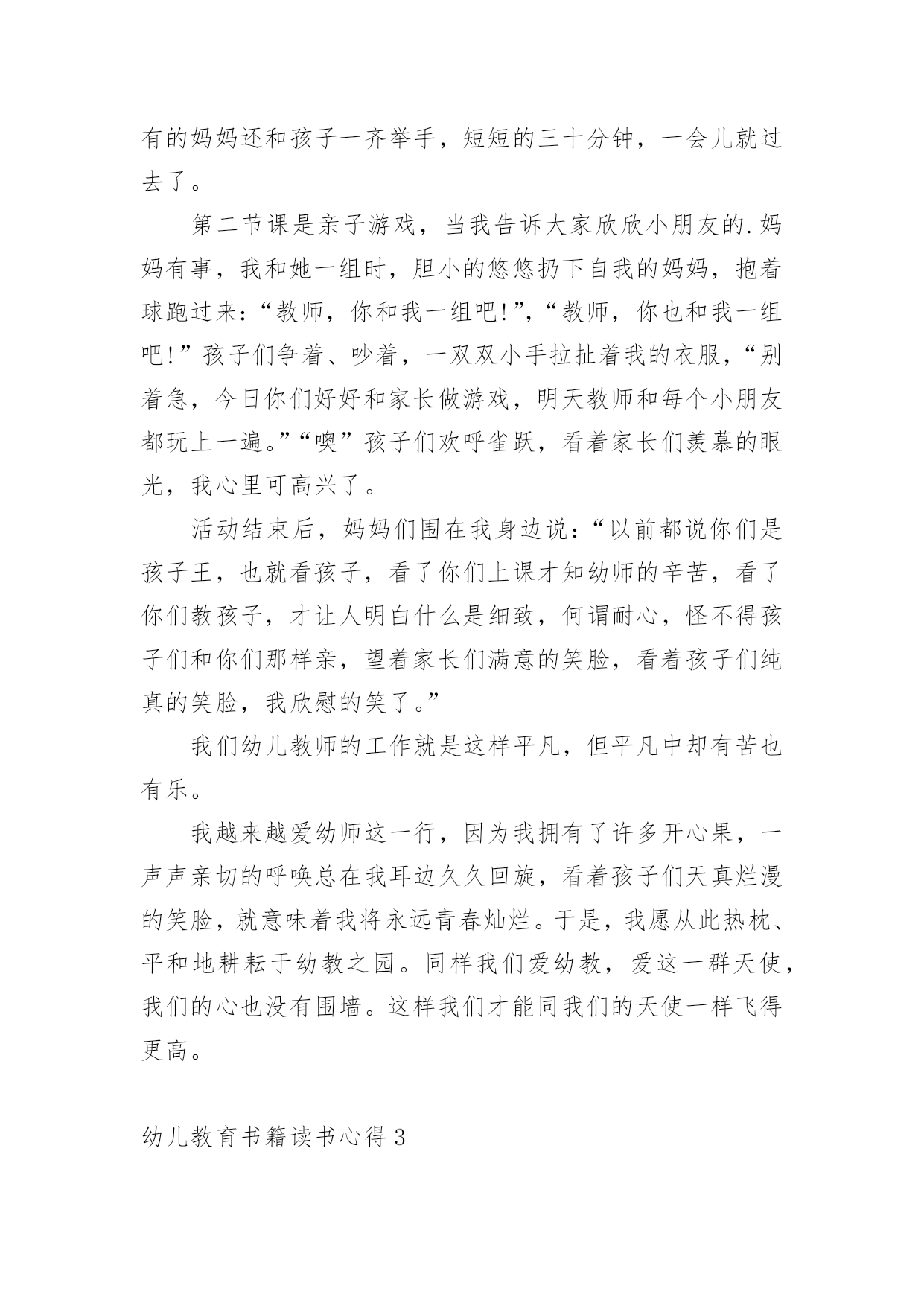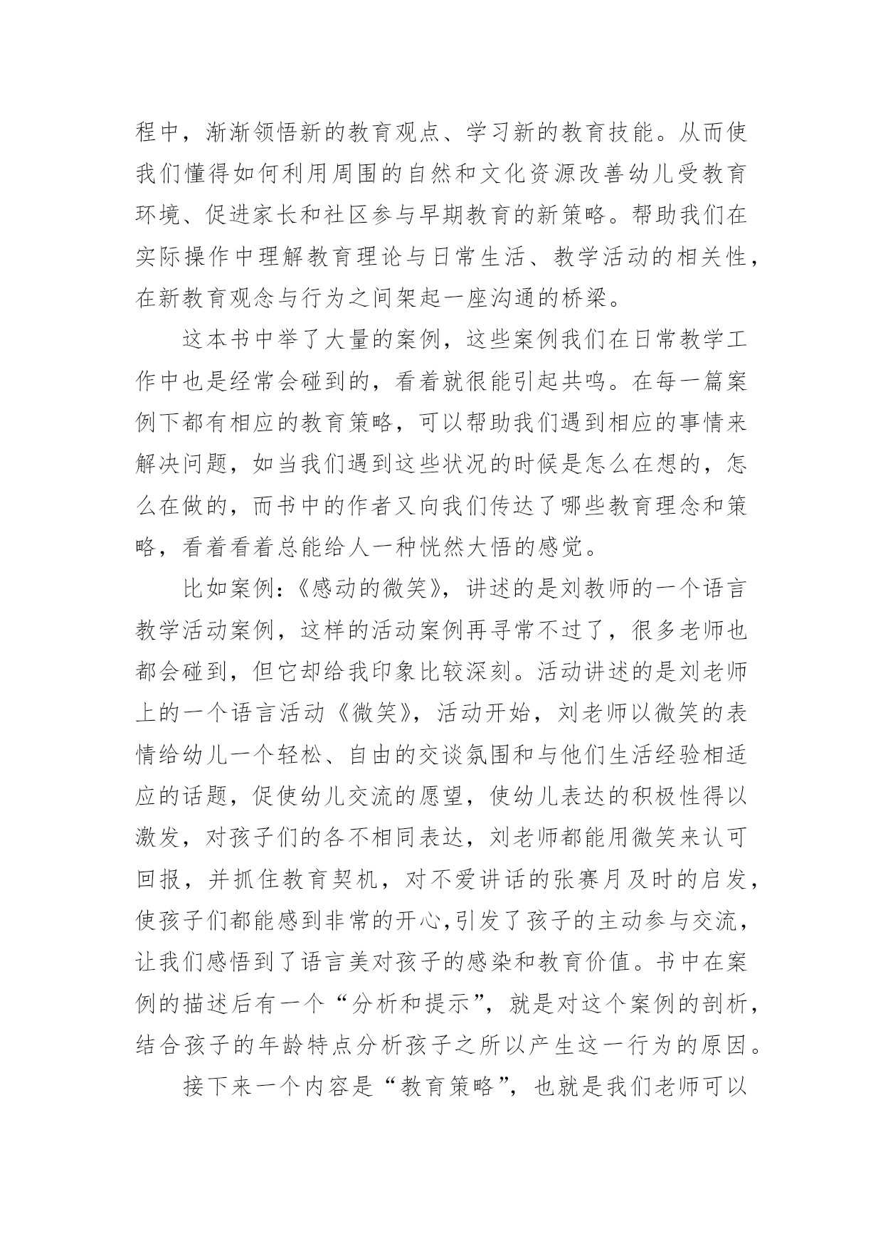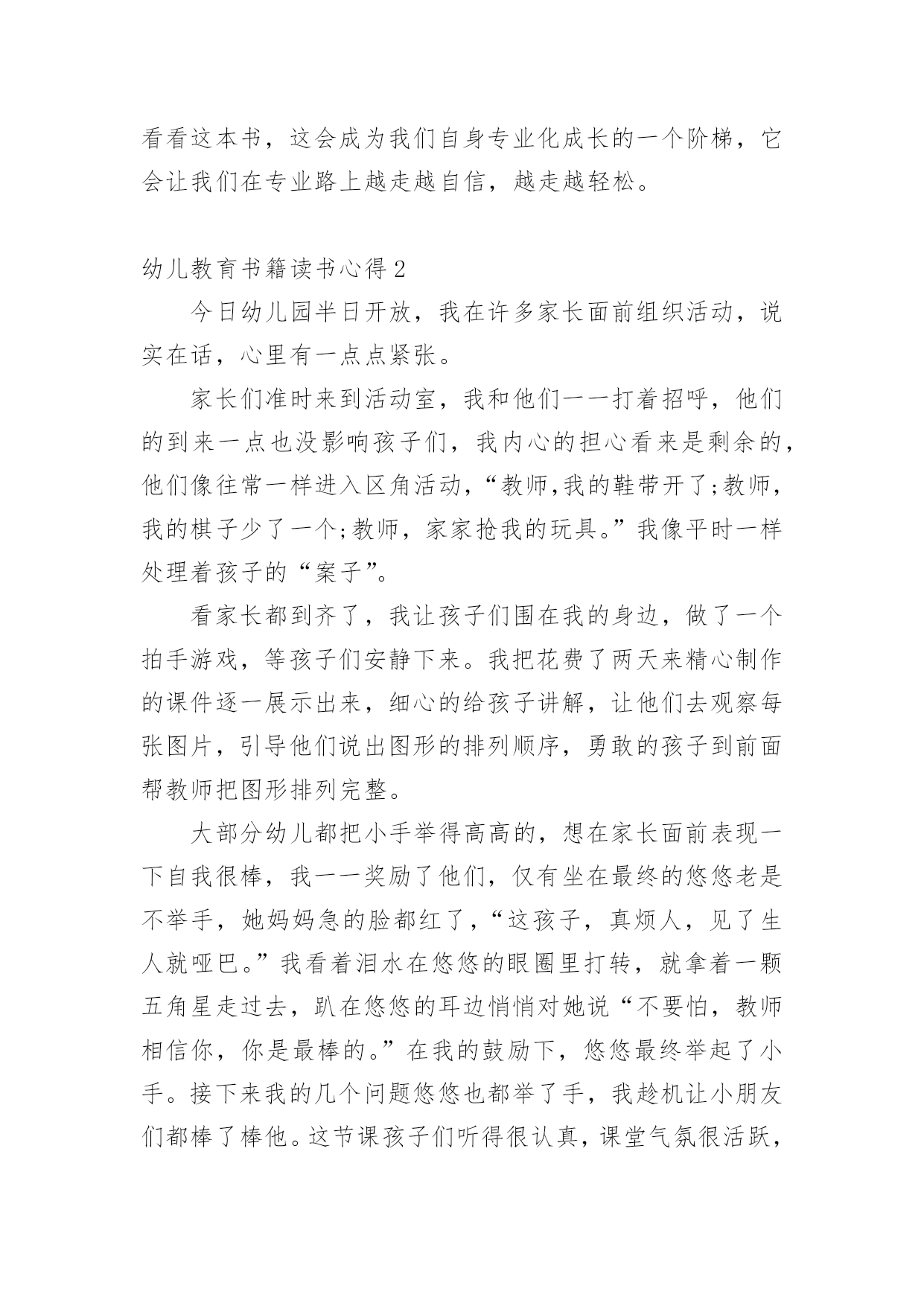 幼儿教育书籍读书心得幼儿教育书籍读书心得(7篇)当我们备受启迪时,可用写心得体会的方式将其记录下来,这么做可以让我们不断思考不断进步。那么好的心得体会是什么样的呢?下面是小编为大家收集的幼儿教育书籍读书心得,欢迎阅读与收藏。幼儿教育书籍读书心得1书籍作为生活的一个载体已经成为我们生存、发展、进步的必需品。经我市幼儿教师专业发展指导团队成员推荐,我有幸阅读了《给幼儿教师的一把钥匙》这本书,这本书内容丰富,它是开启幼儿教育的一扇门,这本书里的一个个的问题,一个个的案例,一个个分析都是从教师教育上发生的实例,实实在在帮助我们幼儿教师释疑教育困惑,指导我们解决实际问题的好书。《给幼儿教师的一把钥匙》是幼儿教师的教育实践策略汇集。内容包括《教师与儿童》《教师与家长》《教师与社区》三部分,用52个有代表性的问题,展示了当前幼儿教师需要具备的基本教育技能。每个问题中均设置了五个环节:体验分享、案例、分析和提示、教育策略、资源库。这几个环节能引导我们在自我体验下,逐步参与教育思考和研究;其中每一个主题的内容和形式都值得我们学习和研究;从具体的、容易理解的案例、分析、教育策略、新信息等的阅读过程中,渐渐领悟新的教育观点、学习新的教育技能。从而使我们懂得如何利用周围的自然和文化资源改善幼儿受教育环境、促进家长和社区参与早期教育的新策略。帮助我们在实际操作中理解教育理论与日常生活、教学活动的相关性,在新教育观念与行为之间架起一座沟通的桥梁。这本书中举了大量的案例,这些案例我们在日常教学工作中也是经常会碰到的,看着就很能引起共鸣。在每一篇案例下都有相应的教育策略,可以帮助我们遇到相应的事情来解决问题,如当我们遇到这些状况的时候是怎么在想的,怎么在做的,而书中的作者又向我们传达了哪些教育理念和策略,看着看着总能给人一种恍然大悟的感觉。比如案例:《感动的微笑》,讲述的是刘教师的一个语言教学活动案例,这样的活动案例再寻常不过了,很多老师也都会碰到,但它却给我印象比较深刻。活动讲述的是刘老师上的一个语言活动《微笑》,活动开始,刘老师以微笑的表情给幼儿一个轻松、自由的交谈氛围和与他们生活经验相适应的话题,促使幼儿交流的愿望,使幼儿表达的积极性得以激发,对孩子们的各不相同表达,刘老师都能用微笑来认可回报,并抓住教育契机,对不爱讲话的张赛月及时的启发,使孩子们都能感到非常的开心,引发了孩子的主动参与交流,让我们感悟到了语言美对孩子的感染和教育价值。书中在案例的描述后有一个“分析和提示”,就是对这个案例的剖析,结合孩子的年龄特点分析孩子之所以产生这一行为的原因。接下来一个内容是“教育策略”,也就是我们老师可以怎么做,采取一些什么样的教育策略帮助孩子改变这一现状,很具体,这个《感动的微笑》的案例,书中给予的“教育策略”。1、创设让幼儿自由表达,有话就说的语言环境。2、丰富幼儿的生活经验,有意识扩展幼儿语言交流的内容。3、创造个别交流的机会,引导幼儿学会与他人平等对话。4、利用文学作品培养幼儿的'语言表达能力。5、鼓励幼儿进行合作交流的活动。6、通过设计、提出问题,引导幼儿有话可说。7、主动与不爱说话的幼儿交谈(具体的内容在书P45页)。我班大多的孩子就是不敢在集体面前大胆的讲话,我运用了好多的方法对他们的帮助也不大,通过这个案例、分析与提示、加上教育策略对我有了很大的提示,使我茅塞顿开,知道了怎样让幼儿爱说会讲。《给幼儿教师的一把钥匙》吸引我的是大量来自一线教师所写的发生在我们身边的教育案例,及非常有针对性的可操作的帮助我们解决问题的策略指导。现在我们教师专业学习时常不知道如何将先进的理论具体地转化为自身的教育实践,往往是对《纲要》的理论耳熟能详,就是不知道如何去操作。《给幼儿教师的一把钥匙》这本书开启了我一扇门,成为我学习新技能的一把钥匙,它里面里还有很多其它的案例,看了之后都很有用,所以建议年轻的老师们,都可以来看看这本书,这会成为我们自身专业化成长的一个阶梯,它会让我们在专业路上越走越自信,越走越轻松。幼儿教育书籍读书心得2今日幼儿园半日开放,我在许多家长面前组织活动,说实在话,心里有一点点紧张。家长们准时来到活动室,我和他们一一打着招呼,他们的到来一点也没影响孩子们,我内心的担心看来是剩余的,他们像往常一样进入区角活动,“教师,我的鞋带开了;教师,我的棋子少了一个;教师,家家抢我的玩具。”我像平时一样处理着孩子的“案子”。看家长都到齐了,我让孩子们围在我的身边,做了一个拍手游戏,等孩子们安静下来。我把花费了两天来精心制作的课件逐一展示出来,细心的给孩子讲解,让他们去观察每张图片,引导他们说出图形的排列顺序,勇敢的孩子到前面帮教师把图形排列完整。大部分幼儿都把小手举得高高的,想在家长面前表现一下自我很棒,我一一奖励了他们,仅有坐在最终的悠悠老是不举手,她妈妈