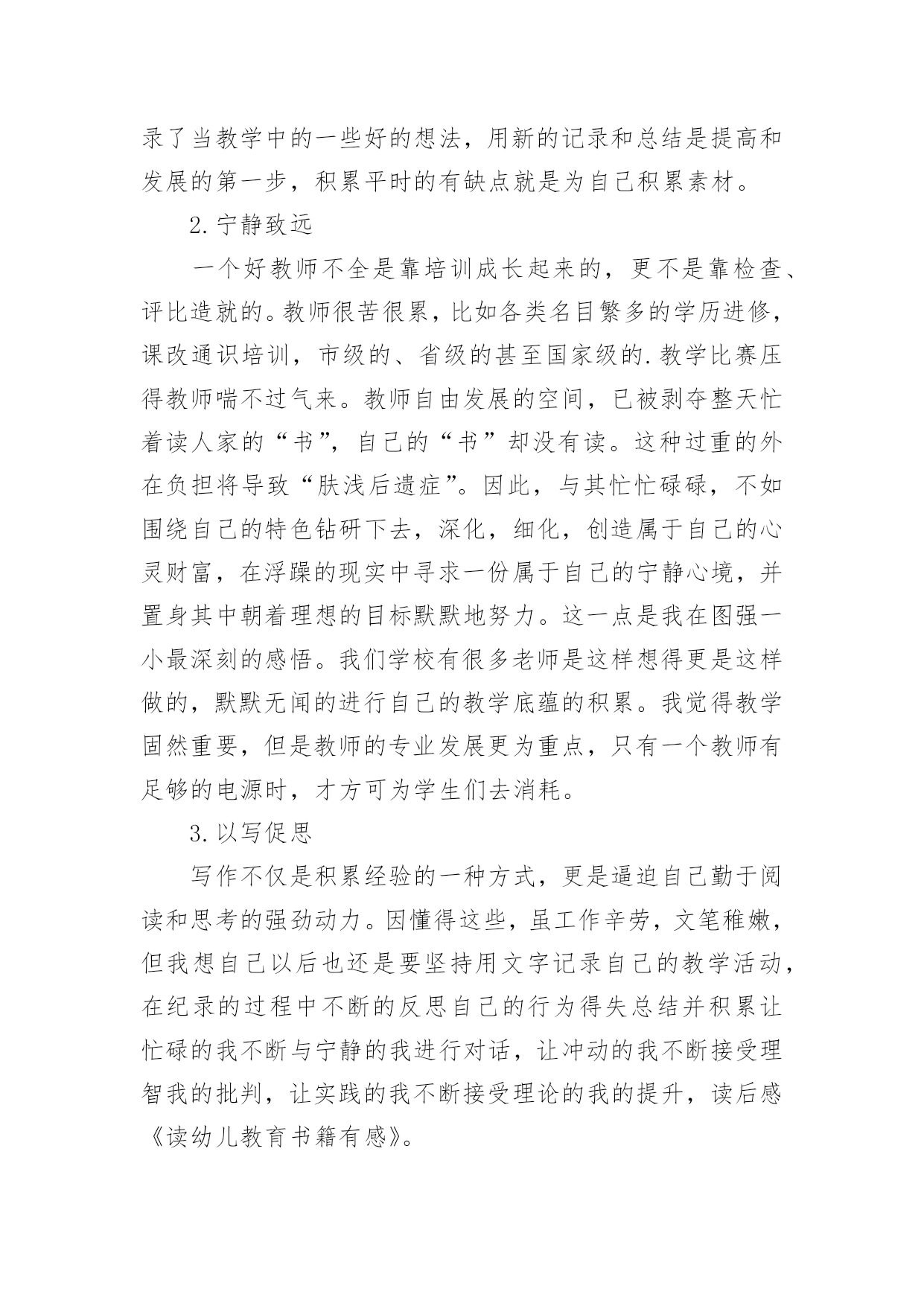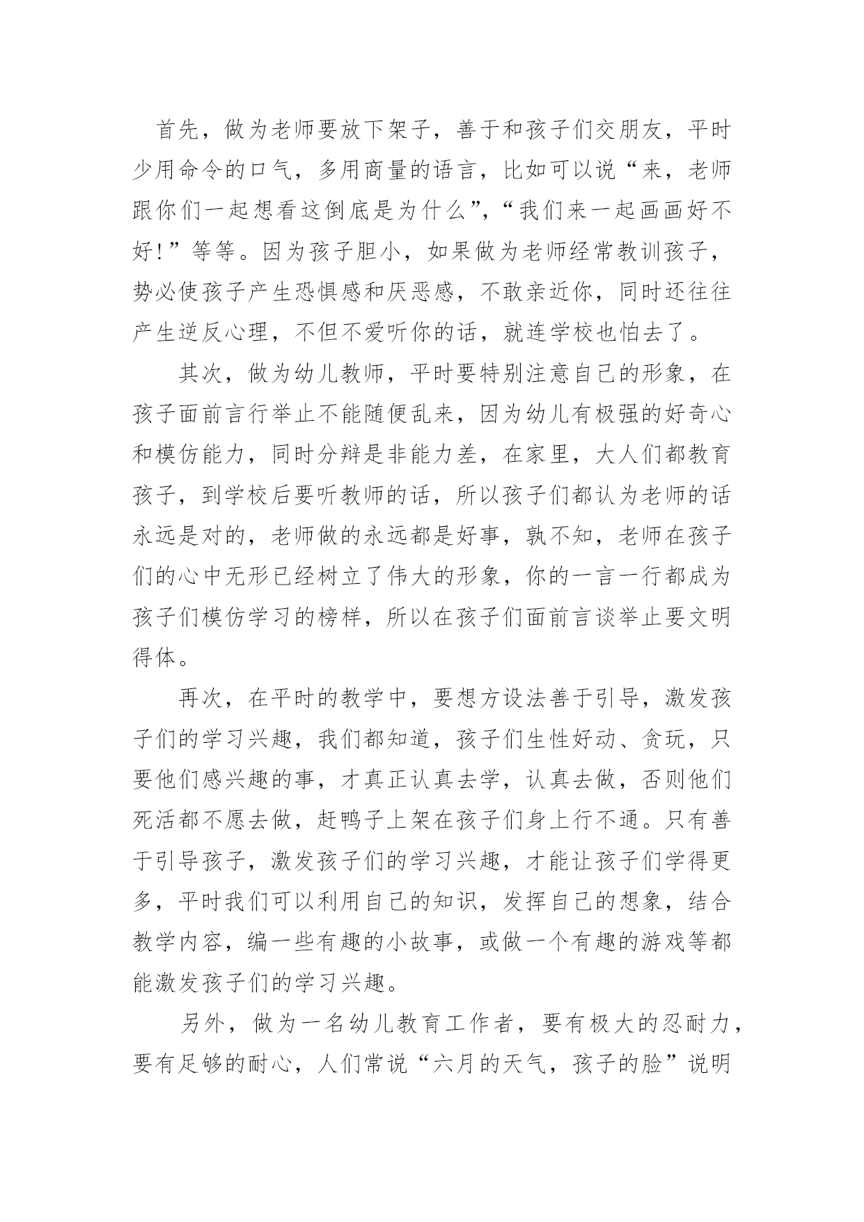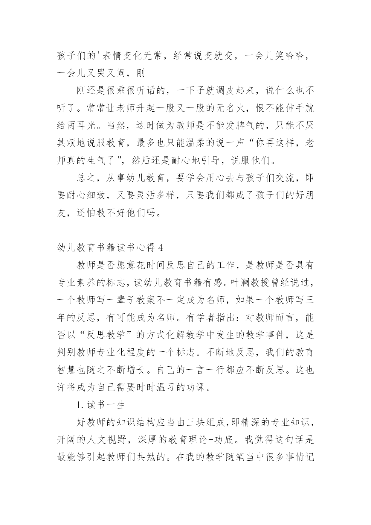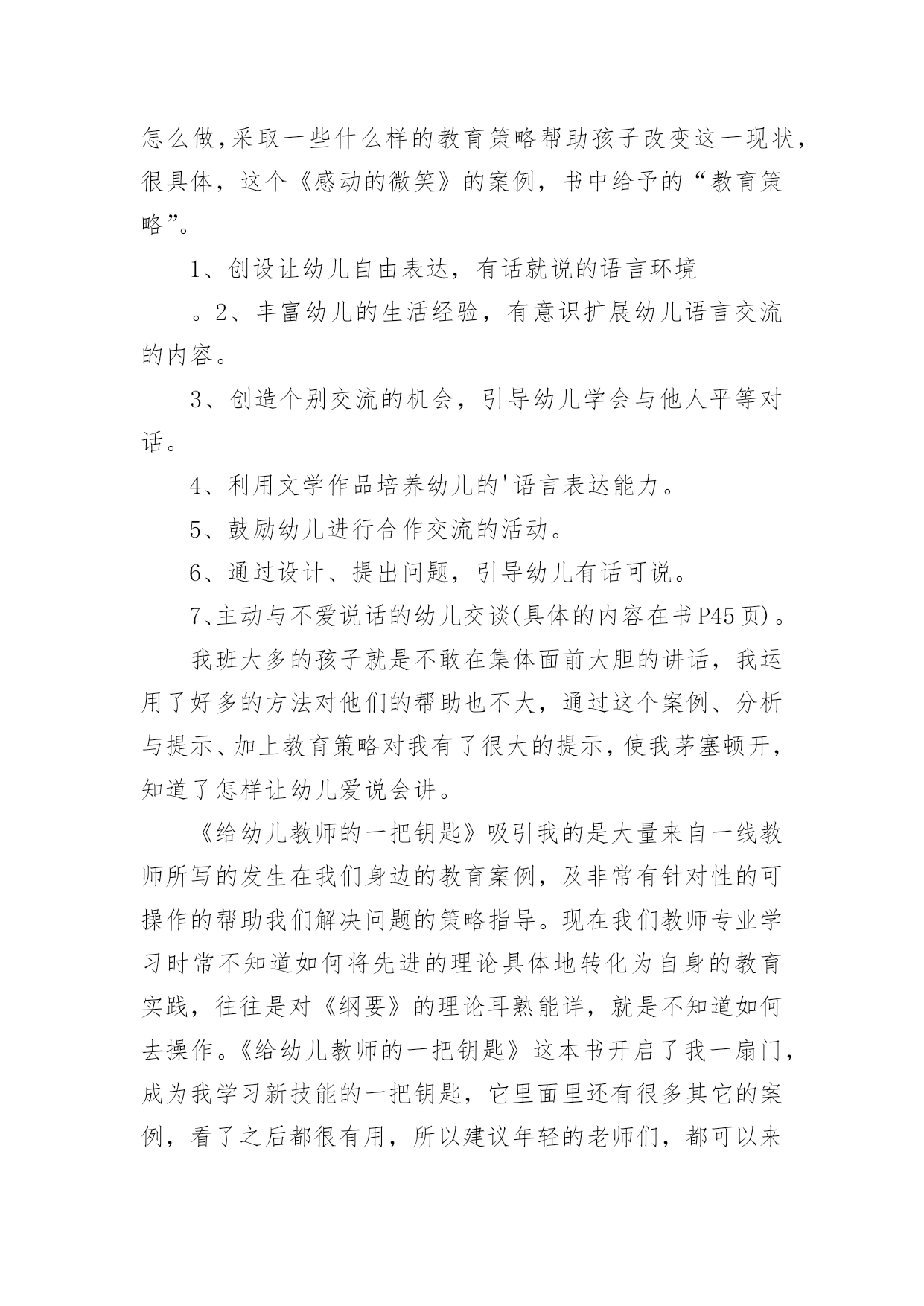 幼儿教育书籍读书心得幼儿教育书籍读书心得(7篇)当我们备受启迪时,可用写心得体会的方式将其记录下来,这么做可以让我们不断思考不断进步。那么好的心得体会是什么样的呢?下面是小编为大家收集的幼儿教育书籍读书心得,欢迎阅读与收藏。幼儿教育书籍读书心得1书籍作为生活的一个载体已经成为我们生存、发展、进步的必需品。经我市幼儿教师专业发展指导团队成员推荐,我有幸阅读了《给幼儿教师的一把钥匙》这本书,这本书内容丰富,它是开启幼儿教育的一扇门,这本书里的一个个的问题,一个个的案例,一个个分析都是从教师教育上发生的实例,实实在在帮助我们幼儿教师释疑教育困惑,指导我们解决实际问题的好书。《给幼儿教师的一把钥匙》是幼儿教师的教育实践策略汇集。内容包括《教师与儿童》《教师与家长》《教师与社区》三部分,用52个有代表性的问题,展示了当前幼儿教师需要具备的基本教育技能。每个问题中均设置了五个环节:体验分享、案例、分析和提示、教育策略、资源库。这几个环节能引导我们在自我体验下,逐步参与教育思考和研究;其中每一个主题的内容和形式都值得我们学习和研究;从具体的、容易理解的案例、分析、教育策略、新信息等的阅读过程中,渐渐领悟新的教育观点、学习新的教育技能。从而使我们懂得如何利用周围的自然和文化资源改善幼儿受教育环境、促进家长和社区参与早期教育的新策略。帮助我们在实际操作中理解教育理论与日常生活、教学活动的相关性,在新教育观念与行为之间架起一座沟通的桥梁。这本书中举了大量的案例,这些案例我们在日常教学工作中也是经常会碰到的,看着就很能引起共鸣。在每一篇案例下都有相应的教育策略,可以帮助我们遇到相应的事情来解决问题,如当我们遇到这些状况的时候是怎么在想的,怎么在做的,而书中的作者又向我们传达了哪些教育理念和策略,看着看着总能给人一种恍然大悟的感觉。比如案例:《感动的微笑》,讲述的是刘教师的一个语言教学活动案例,这样的活动案例再寻常不过了,很多老师也都会碰到,但它却给我印象比较深刻。活动讲述的是刘老师上的一个语言活动《微笑》,活动开始,刘老师以微笑的表情给幼儿一个轻松、自由的交谈氛围和与他们生活经验相适应的话题,促使幼儿交流的愿望,使幼儿表达的积极性得以激发,对孩子们的各不相同表达,刘老师都能用微笑来认可回报,并抓住教育契机,对不爱讲话的张赛月及时的启发,使孩子们都能感到非常的开心,引发了孩子的主动参与交流,让我们感悟到了语言美对孩子的感染和教育价值。书中在案例的描述后有一个“分析和提示”,就是对这个案例的剖析,结合孩子的年龄特点分析孩子之所以产生这一行为的原因。接下来一个内容是“教育策略”,也就是我们老师可以怎么做,采取一些什么样的教育策略帮助孩子改变这一现状,很具体,这个《感动的微笑》的案例,书中给予的“教育策略”。1、创设让幼儿自由表达,有话就说的语言环境。2、丰富幼儿的生活经验,有意识扩展幼儿语言交流的内容。3、创造个别交流的机会,引导幼儿学会与他人平等对话。4、利用文学作品培养幼儿的'语言表达能力。5、鼓励幼儿进行合作交流的活动。6、通过设计、提出问题,引导幼儿有话可说。7、主动与不爱说话的幼儿交谈(具体的内容在书P45页)。我班大多的孩子就是不敢在集体面前大胆的讲话,我运用了好多的方法对他们的帮助也不大,通过这个案例、分析与提示、加上教育策略对我有了很大的提示,使我茅塞顿开,知道了怎样让幼儿爱说会讲。《给幼儿教师的一把钥匙》吸引我的是大量来自一线教师所写的发生在我们身边的教育案例,及非常有针对性的可操作的帮助我们解决问题的策略指导。现在我们教师专业学习时常不知道如何将先进的理论具体地转化为自身的教育实践,往往是对《纲要》的理论耳熟能详,就是不知道如何去操作。《给幼儿教师的一把钥匙》这本书开启了我一扇门,成为我学习新技能的一把钥匙,它里面里还有很多其它的案例,看了之后都很有用,所以建议年轻的老师们,都可以来看看这本书,这会成为我们自身专业化成长的一个阶梯,它会让我们在专业路上越走越自信,越走越轻松。幼儿教育书籍读书心得2今日幼儿园半日开放,我在许多家长面前组织活动,说实在话,心里有一点点紧张。家长们准时来到活动室,我和他们一一打着招呼,他们的到来一点也没影响孩子们,我内心的担心看来是剩余的,他们像往常一样进入区角活动,“教师,我的鞋带开了;教师,我的棋子少了一个;教师,家家抢我的玩具。”我像平时一样处理着孩子的“案子”。看家长都到齐了,我让孩子们围在我的身边,做了一个拍手游戏,等孩子们安静下来。我把花费了两天来精心制作的课件逐一展示出来,细心的给孩子讲解,让他们去观察每张图片,引导他们说出图形的排列顺序,勇敢的孩子到前面帮教师把图形排列完整。大部分幼儿都把小手举得高高的,想在家长面前表现一下自我很棒,我一一奖励了他们,仅有坐在最终的悠悠老是不举手,她妈妈