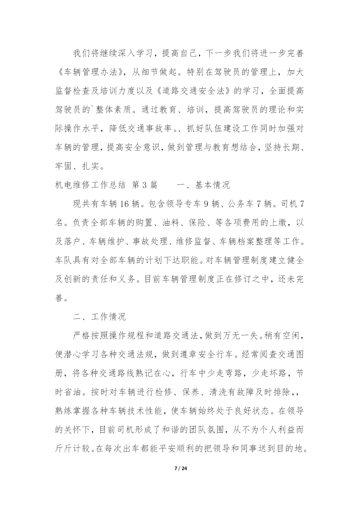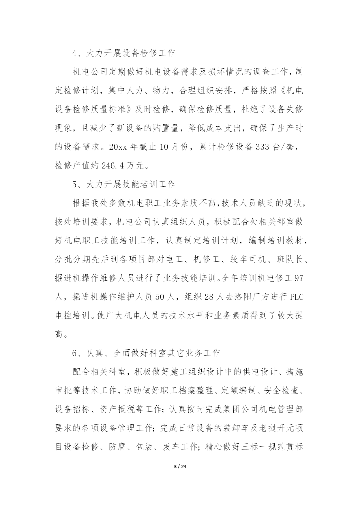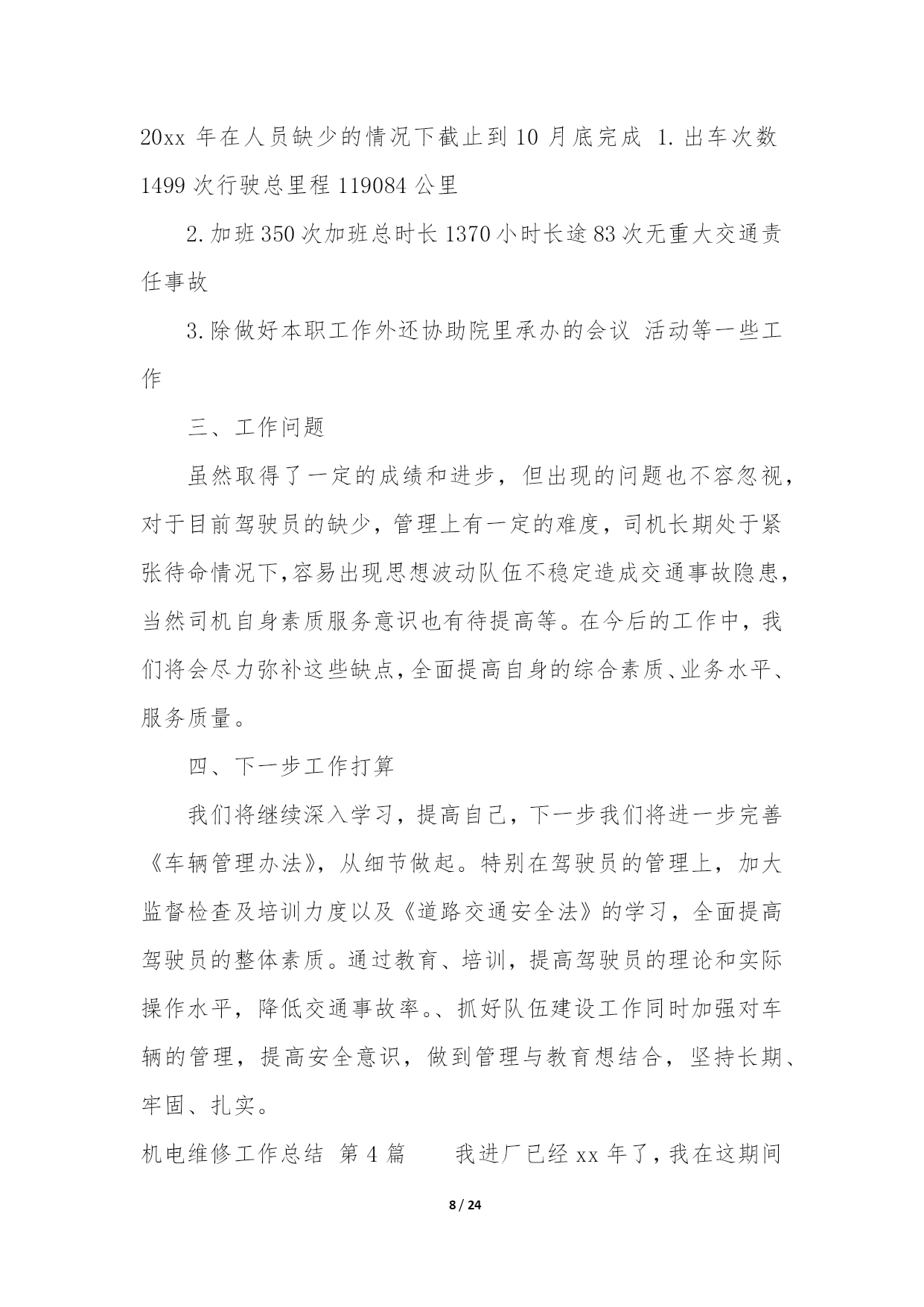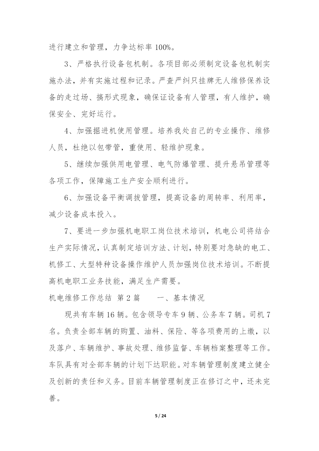 PAGE24/NUMPAGES24机电维修工作总结(汇编8篇)机电维修工作总结第1篇一年来,机电公司全体人员按照处及集团公司机电工作安排意见,围绕企业的生产和经营,团结协作,扎实工作,使我处机电管理水平稳步提高:机电设备完好率95.45%,使用率92%,标准化车间达标率90%以上,确保了全处施工生产顺利进行。1、全力做好设备租赁、平衡、调拨机电公司根据生产需要做好设备的合理衔接利用,对闲置设备及时调剂利用;对不用设备及时退租、退库;对缺口设备,首先积极面向外部市场,集中社会资源进行竟价租赁,不足的在集团中标厂家中压价采购,减少了成本投入。截止10月份,共退租老旧淘汰设备64台/套(其中外租的34台/套);外租大型新设备9台/套;新购设备281台(价值1321.8万元)。保证了新开工项目及原在建项目的设备需求,确保全处施工生产的顺利进行。2、全面为项目部做好服务工作机电公司将机电基础管理的文件、规范、规章制度等资料分类整理汇总,并制定项目部日常机电管理需要做的内容、方法,使项目部知道机电管理做什么,怎么做,使全处机电管理规范化和标准化。大型设备主要配件由集团公司招标定厂定价采购,解决了项目部配件购置难的问题。综掘机械化专业组现场服务及指导工作共12次,解决综掘设备运行中发生的疑难问题。积极参与施工现场设备安装、调试、拆除等工作(截止10月份,安装绞车、变电所等设备共12台/套)。为项目部提供生产和技术服务,帮助项目部解决机电技术难题,处理突发机电设备故障,确保设备完好安全运转。3、加强设备使用管理设备的使用管理是设备全过程管理的关键。机电大临工程筹备坚持高起点、高标准、高质量、严要求,严格按照设备检修、安装质量标准进行设备检修和安装。在日常设备运行管理中,认真贯彻执行各项规章制度和标准、办法,加强对在用设备设施的监督检查、维护保养,督促项目部规范操作。加强对在用提升设施、压风机、变电设备定期状态检测,消除安全隐患。加大对机电设备改造,进一步完善安全保护设施:今年改造绞车PLC双线保护功能电控6套;凿井悬吊稳车均安装安全闭锁行程开关,并在张集东项目部安装稳车PLC集控装置,保证了提升悬吊系统安全运行。认真开展机电质量标准化达标活动,严格执行奖、罚办法,定期组织机电质量标准化车间达标考评、检查,对存在的问题提出现场整改和限期整改要求。在20xx年度集团公司已进行的两次设备大检查中,参与考评的我处15个项目部,机电设备管理规范有序,每个车间均按标准化要求执行,综合得分都在90分以上(张集东99分为全公司最高),获得集团公司的好评。4、大力开展设备检修工作机电公司定期做好机电设备需求及损坏情况的调查工作,制定检修计划,集中人力、物力,合理组织安排,严格按照《机电设备检修质量标准》及时检修,确保检修质量,杜绝了设备失修现象,且减少了新设备的购置量,降低成本支出,确保了生产时的设备需求。20xx年截止10月份,累计检修设备333台/套,检修产值约246.4万元。5、大力开展技能培训工作根据我处多数机电职工业务素质不高,技术人员缺乏的现状,按处培训要求,机电公司认真组织人员,积极配合处相关部室做好机电职工技能培训工作,认真制定培训计划,编制培训教材,分批分期先后到各项目部对电工、机修工、绞车司机、班队长、掘进机操作维修人员进行了业务技能培训。全年培训机电修工97人,掘进机操作维护人员50人,组织28人去洛阳厂方进行PLC电控培训。使广大机电人员的技术水平和业务素质得到了较大提高。6、认真、全面做好科室其它业务工作配合相关科室,积极做好施工组织设计中的供电设计、措施审批等技术工作,协助做好职工档案整理、定额编制、安全检查、设备招标、资产抵税等工作;认真按时完成集团公司机电管理部要求的各项设备管理工作;完成日常设备的装卸车及老挝开元项目设备检修、防腐、包装、发车工作;精心做好三标一规范贯标工作;信息化及处网站平台机电资料录入和对项目部信息化资料检查、指导录入工作。但机电工作还存在一些比较突出问题和不足:一是个别项目经理不重视机电管理工作,对相关机电规章制度不贯彻、不执行、不实施。二是设备包机制流于形式,部分项目部平时只要设备能运转,基本上无人维护、检修、保养,在上级单位检查前突击做一下表面文章,搞形式,走过场。特别是掘进机使用存在“以包代管”现象,重使用轻保养维修,造成设备损坏严重,设备使用寿命减少,维修费用增大。三是高素质机电技术人员及业务熟练能力高的'机电设备维修、安装人员严重缺乏,整体素质较低,使机电管理的各项工作难度加大,在一定程度上影响了我处的发展。加强在职职工的岗位技能培训和机电人才引进、培养工作尤为重要。为确保机电工作有序进行、机电设备安全运转,20xx年将着重做好以下工作:1、增强机电管理工作的责任感,规范机电