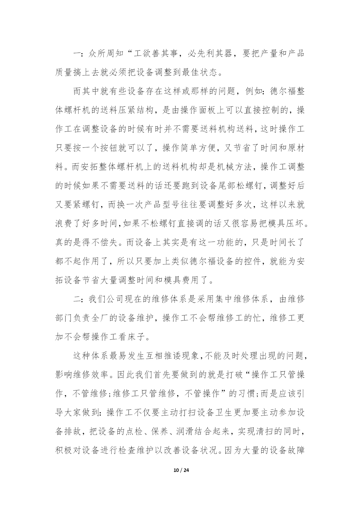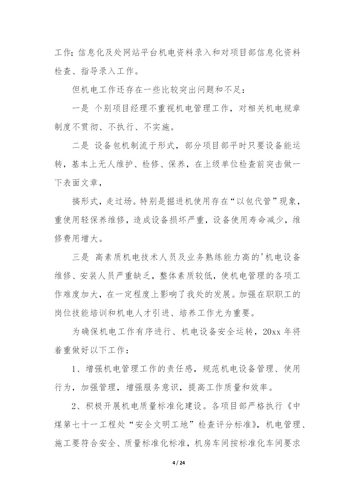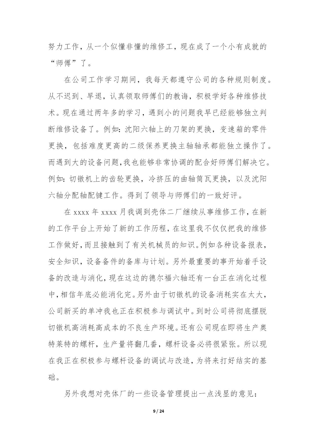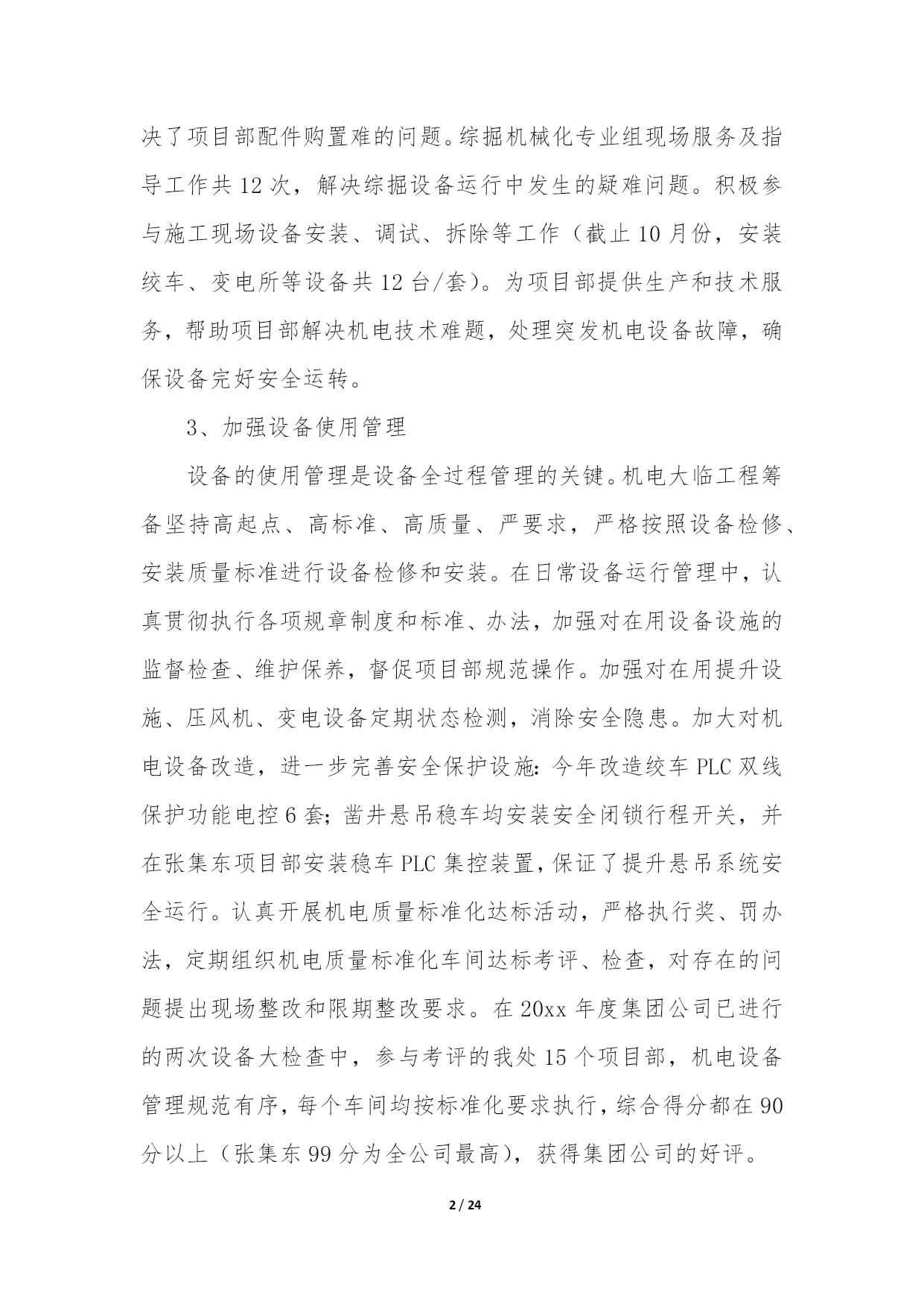 PAGE24/NUMPAGES24机电维修工作总结(汇编8篇)机电维修工作总结第1篇一年来,机电公司全体人员按照处及集团公司机电工作安排意见,围绕企业的生产和经营,团结协作,扎实工作,使我处机电管理水平稳步提高:机电设备完好率95.45%,使用率92%,标准化车间达标率90%以上,确保了全处施工生产顺利进行。1、全力做好设备租赁、平衡、调拨机电公司根据生产需要做好设备的合理衔接利用,对闲置设备及时调剂利用;对不用设备及时退租、退库;对缺口设备,首先积极面向外部市场,集中社会资源进行竟价租赁,不足的在集团中标厂家中压价采购,减少了成本投入。截止10月份,共退租老旧淘汰设备64台/套(其中外租的34台/套);外租大型新设备9台/套;新购设备281台(价值1321.8万元)。保证了新开工项目及原在建项目的设备需求,确保全处施工生产的顺利进行。2、全面为项目部做好服务工作机电公司将机电基础管理的文件、规范、规章制度等资料分类整理汇总,并制定项目部日常机电管理需要做的内容、方法,使项目部知道机电管理做什么,怎么做,使全处机电管理规范化和标准化。大型设备主要配件由集团公司招标定厂定价采购,解决了项目部配件购置难的问题。综掘机械化专业组现场服务及指导工作共12次,解决综掘设备运行中发生的疑难问题。积极参与施工现场设备安装、调试、拆除等工作(截止10月份,安装绞车、变电所等设备共12台/套)。为项目部提供生产和技术服务,帮助项目部解决机电技术难题,处理突发机电设备故障,确保设备完好安全运转。3、加强设备使用管理设备的使用管理是设备全过程管理的关键。机电大临工程筹备坚持高起点、高标准、高质量、严要求,严格按照设备检修、安装质量标准进行设备检修和安装。在日常设备运行管理中,认真贯彻执行各项规章制度和标准、办法,加强对在用设备设施的监督检查、维护保养,督促项目部规范操作。加强对在用提升设施、压风机、变电设备定期状态检测,消除安全隐患。加大对机电设备改造,进一步完善安全保护设施:今年改造绞车PLC双线保护功能电控6套;凿井悬吊稳车均安装安全闭锁行程开关,并在张集东项目部安装稳车PLC集控装置,保证了提升悬吊系统安全运行。认真开展机电质量标准化达标活动,严格执行奖、罚办法,定期组织机电质量标准化车间达标考评、检查,对存在的问题提出现场整改和限期整改要求。在20xx年度集团公司已进行的两次设备大检查中,参与考评的我处15个项目部,机电设备管理规范有序,每个车间均按标准化要求执行,综合得分都在90分以上(张集东99分为全公司最高),获得集团公司的好评。4、大力开展设备检修工作机电公司定期做好机电设备需求及损坏情况的调查工作,制定检修计划,集中人力、物力,合理组织安排,严格按照《机电设备检修质量标准》及时检修,确保检修质量,杜绝了设备失修现象,且减少了新设备的购置量,降低成本支出,确保了生产时的设备需求。20xx年截止10月份,累计检修设备333台/套,检修产值约246.4万元。5、大力开展技能培训工作根据我处多数机电职工业务素质不高,技术人员缺乏的现状,按处培训要求,机电公司认真组织人员,积极配合处相关部室做好机电职工技能培训工作,认真制定培训计划,编制培训教材,分批分期先后到各项目部对电工、机修工、绞车司机、班队长、掘进机操作维修人员进行了业务技能培训。全年培训机电修工97人,掘进机操作维护人员50人,组织28人去洛阳厂方进行PLC电控培训。使广大机电人员的技术水平和业务素质得到了较大提高。6、认真、全面做好科室其它业务工作配合相关科室,积极做好施工组织设计中的供电设计、措施审批等技术工作,协助做好职工档案整理、定额编制、安全检查、设备招标、资产抵税等工作;认真按时完成集团公司机电管理部要求的各项设备管理工作;完成日常设备的装卸车及老挝开元项目设备检修、防腐、包装、发车工作;精心做好三标一规范贯标工作;信息化及处网站平台机电资料录入和对项目部信息化资料检查、指导录入工作。但机电工作还存在一些比较突出问题和不足:一是个别项目经理不重视机电管理工作,对相关机电规章制度不贯彻、不执行、不实施。二是设备包机制流于形式,部分项目部平时只要设备能运转,基本上无人维护、检修、保养,在上级单位检查前突击做一下表面文章,搞形式,走过场。特别是掘进机使用存在“以包代管”现象,重使用轻保养维修,造成设备损坏严重,设备使用寿命减少,维修费用增大。三是高素质机电技术人员及业务熟练能力高的'机电设备维修、安装人员严重缺乏,整体素质较低,使机电管理的各项工作难度加大,在一定程度上影响了我处的发展。加强在职职工的岗位技能培训和机电人才引进、培养工作尤为重要。为确保机电工作有序进行、机电设备安全运转,20xx年将着重做好以下工作:1、增强机电管理工作的责任感,规范机电