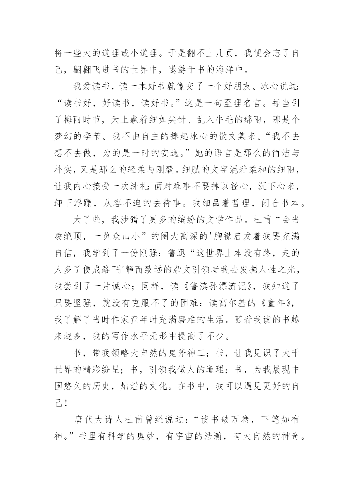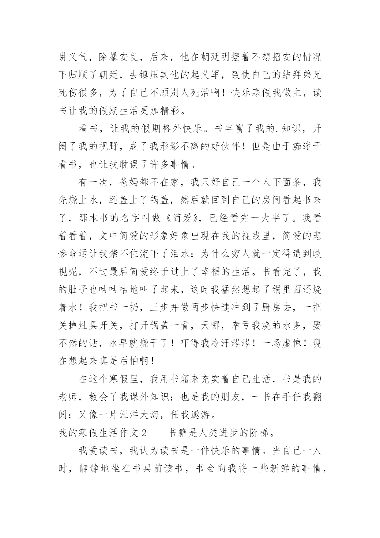 我的寒假生活作文我的寒假生活作文[热门]在学习、工作乃至生活中,大家或多或少都会接触过作文吧,写作文可以锻炼我们的独处习惯,让自己的心静下来,思考自己未来的方向。相信写作文是一个让许多人都头痛的问题,下面是小编收集整理的我的寒假生活作文,欢迎大家借鉴与参考,希望对大家有所帮助。我的寒假生活作文1我是个爱读书的孩子。看书是我的一种爱好,不,是嗜好。今年寒假,我又过了一把读书瘾。时间过得真快,转眼寒假即将结束。在这个寒假里,我最快乐的事情就是读书了。每天我除了认真完成各项作业外,其它的时间都用来读书和锻炼身体。阳光下、书桌旁、床头前都留下了我读书的身影。我读了好多好多的书,其中数《西游记》、《水浒传》给我印象深刻。读《西游记》带给我很大的震撼,唐僧一行四人去西天取经,一路上经历了九九八十一难,才终于取得真经。在取经路上,他们不知道遇见了多少的妖魔鬼怪,多少艰难险阻,但他们一路闯了过来,尤其是齐天大圣孙悟空,让我铭记在心。孙悟空应该是唐僧能取到真经的最大功臣,她不惧困难,经得起诱惑,遇见困难从不畏惧、从不退缩,总是千方百计想办法哭付困难,他在我心中就是一个勇往直前、不惧困难的大英雄!读《水浒传》让我心情很是不爽,里面讲了以宋江为首的农民起义的兴衰。起初,我认为宋江时一个英雄,讲义气,除暴安良,后来,他在朝廷明摆着不想招安的情况下归顺了朝廷,去镇压其他的起义军,致使自己的结拜弟兄死伤很多,为了自己不顾别人死活啊!快乐寒假我做主,读书让我的假期生活更加精彩。看书,让我的假期格外快乐。书丰富了我的.知识,开阔了我的视野,成了我形影不离的好伙伴!但是由于痴迷于看书,也让我耽误了许多事情。有一次,爸妈都不在家,我只好自己一个人下面条,我先烧上水,还盖上了锅盖,然后就回到自己的房间看起书来了,那本书的名字叫做《简爱》,已经看完一大半了。我看着看着,文中简爱的形象好象出现在我的视线里,简爱的悲惨命运让我禁不住流下了泪水:为什么穷人就一定得遭到歧视呢,不过最后简爱终于过上了幸福的生活。书看完了,我的肚子也咕咕咕地叫了起来,这时我猛然想起了锅里面还烧着水!我把书一扔,三步并做两步快速冲到了厨房去,一把关掉灶具开关,打开锅盖一看,天哪,幸亏我烧的水多,要不然的话,水早就烧干了!吓得我冷汗涔涔!一场虚惊!现在想起来真是后怕啊!在这个寒假里,我用书籍来充实着自己生活,书是我的老师,教会了我课外知识;也是我的朋友,一书在手任我翻阅;又像一片汪洋大海,任我遨游。我的寒假生活作文2书籍是人类进步的阶梯。我爱读书,我认为读书是一件快乐的事情。当自己一人时,静静地坐在书桌前读书,书会向我将一些新鲜的事情,将一些大的道理或小道理。于是翻不上几页,我便会忘了自己,翩翩飞进书的世界中,遨游于书的海洋中。我爱读书,读一本好书就像交了一个好朋友。冰心说过:“读书好,好读书,读好书。”这是一句至理名言。每当到了梅雨时节,天上飘着细如尖针、乱入牛毛的绵雨,那是个梦幻的季节。我不由自主的捧起冰心的散文集来。“我不去想不去做,为的是一时的安逸。”她的语言是那么的简洁与朴实,又是那么的轻柔与刚毅。细腻的文字混着柔和的细雨,让我内心接受一次洗礼:面对难事不要掉以轻心,沉下心来,卸下浮躁,从容不迫的去待事。我细品着哲理,闭合书本。大了些,我涉猎了更多的缤纷的文学作品。杜甫“会当凌绝顶,一览众山小”的阔大高深的'胸襟启发着我要充满自信,我学到了一份刚强;鲁迅“这世界上本没有路,走的人多了便成路”宁静而致远的杂文引领者我去发掘人性之光,我尝到了一片诚心;同样,读《鲁滨孙漂流记》,我知道了只要坚强,就没有克服不了的困难;读高尔基的《童年》,我了解了当时作家童年时充满磨难的生活。随着我读的书越来越多,我的写作水平无形中提高了不少。书,带我领略大自然的鬼斧神工;书,让我见识了大千世界的精彩纷呈;书,引领我做人的道理;书,为我展现中国悠久的历史,灿烂的文化。在书中,我可以遇见更好的自己!唐代大诗人杜甫曾经说过:“读书破万卷,下笔如有神。”书里有科学的奥妙,有宇宙的浩瀚,有大自然的神奇。书里的世界色彩斑斓。只要是好书,就开卷有益。只要是博览群书,才能使我们知识渊博。幽幽书香浸透我的灵魂,那香气,在为我进行着一场庄严的洗礼,那是对心灵最深处的洗涤。时光荏苒,流年辗转。我和书已经在一起六七年了,但是我还会和书继续做好朋友,编织我和书的精彩故事,我也在学着,慢慢长大……