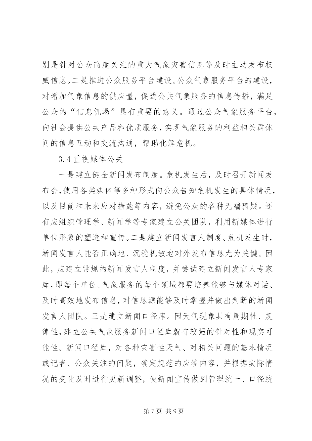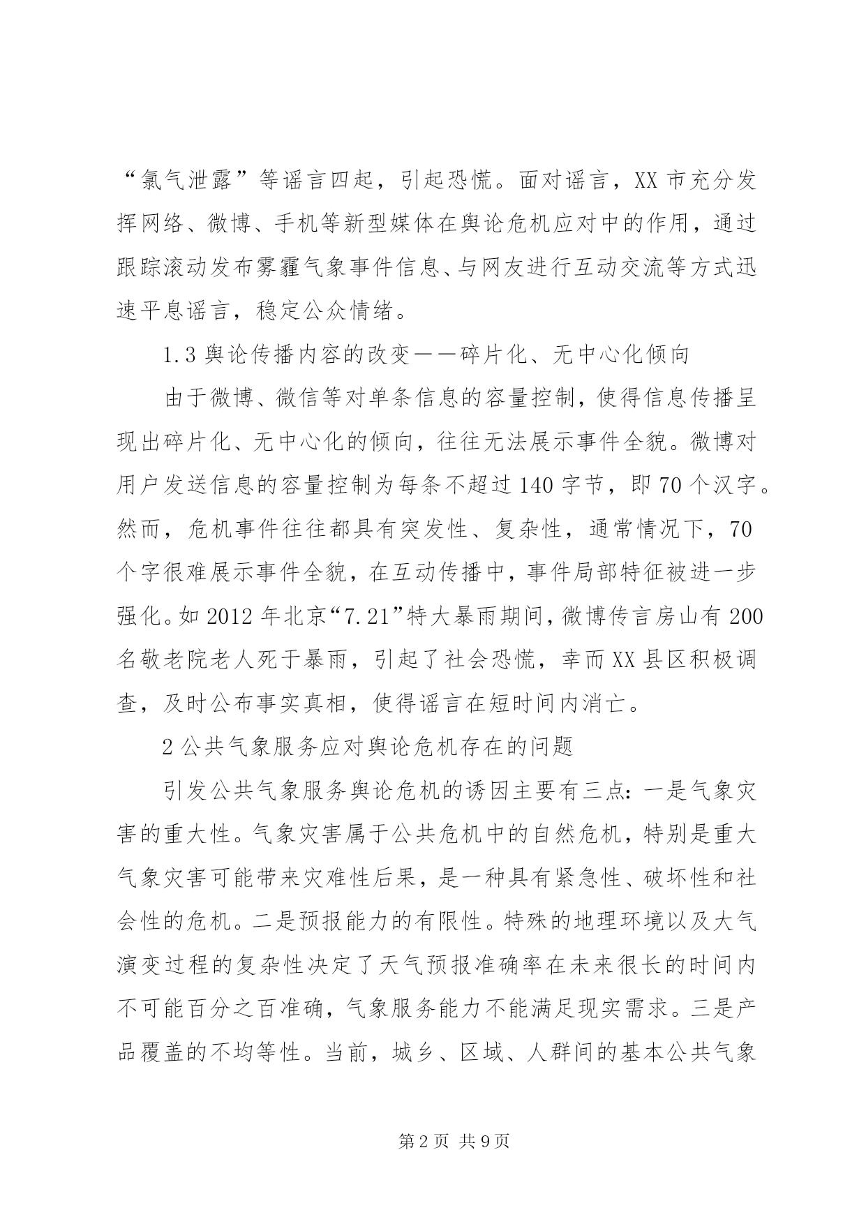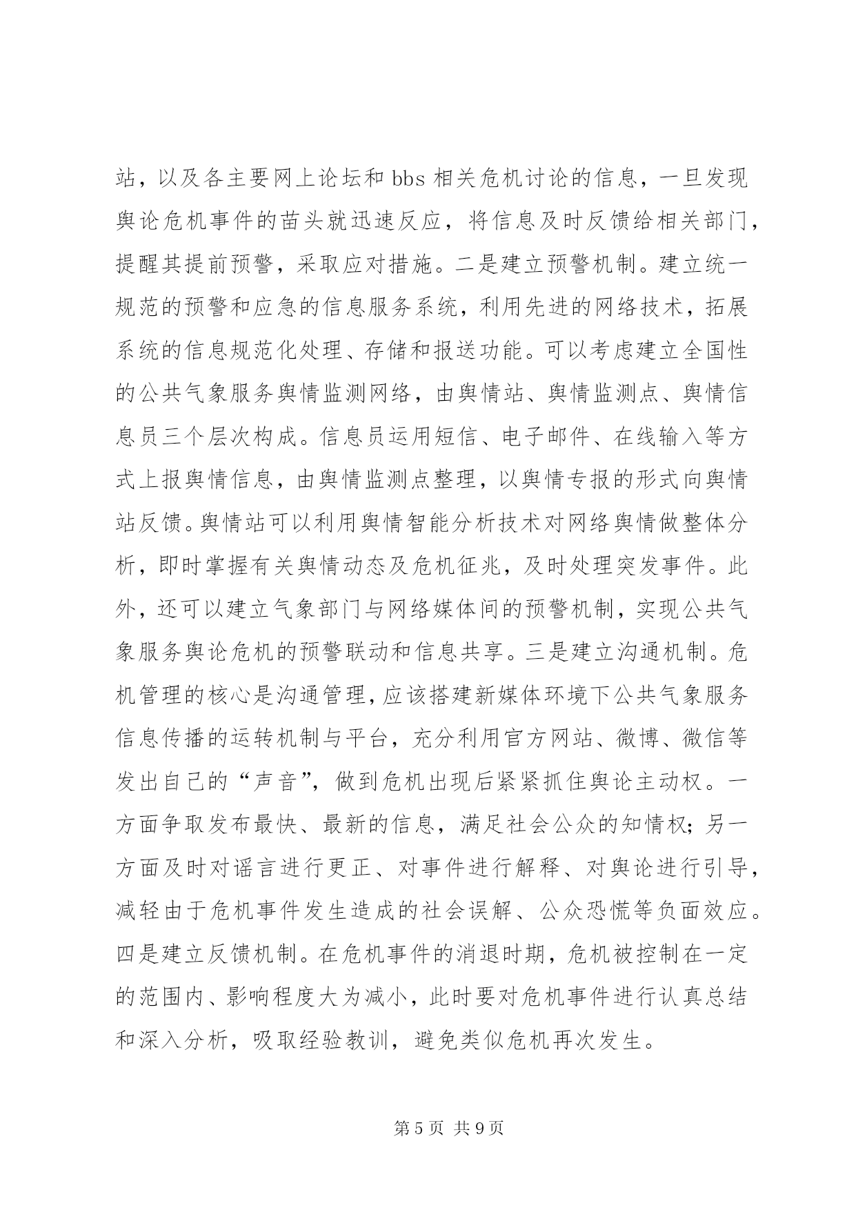 第PAGE\*Arabic\*MERGEFORMAT9页共NUMPAGES\*MERGEFORMAT9页公共气象服务舆论应对对策分析1公共气象服务面临的舆论环境1.1舆论制造主体的改变———“大众麦克风时代”以往在传统媒体为主体的时代,公共危机影响面较小,在新闻媒体尚未参与大规模报道时,危机就可以被解除。而在新媒体时代,互联网提供了一个强大的平台,使信息的发布和社群的组织变得简单、迅速,发布的成本也十分低廉,社会进入“大众麦克风时代”,使舆论危机初期的时间变得越来越短,危机的爆发很迅速,在相关部门或人员还没有做好准备时,相关的危机事件已经成为社会议论的焦点。如2008年南方雨雪冰冻灾害和2011年广东“4.17”雷雨大风期间,一些非理性的刷流量、搏粉丝举动故意放大社会痛点、增加了网络戾气。1.2舆论传播方式的改变--交互性强新媒体的发展已经让信息的传播方和接收方转变成一种地位上的均等和互动关系,信息的获取和传递可以随时进行,不再像以往语言文字时代和报纸、电视传播时代传播方居高临下、没有接收方及时反馈的单向传播方式。新媒介的传播类似于利用大众媒体的人际传播,而人际传播的弊端如谣言、流言、信息的扭曲等也通过大众媒体被放大,在这种情况下,危机事件很容易被夸张、放大甚至扭曲,给危机管理带来困难。如2012年6月11日上午开始,XX市出现严重雾霾天气,一时间,“锅炉爆炸”、“氯气泄露”等谣言四起,引起恐慌。面对谣言,XX市充分发挥网络、微博、手机等新型媒体在舆论危机应对中的作用,通过跟踪滚动发布雾霾气象事件信息、与网友进行互动交流等方式迅速平息谣言,稳定公众情绪。1.3舆论传播内容的改变--碎片化、无中心化倾向由于微博、微信等对单条信息的容量控制,使得信息传播呈现出碎片化、无中心化的倾向,往往无法展示事件全貌。微博对用户发送信息的容量控制为每条不超过140字节,即70个汉字。然而,危机事件往往都具有突发性、复杂性,通常情况下,70个字很难展示事件全貌,在互动传播中,事件局部特征被进一步强化。如2012年北京“7.21”特大暴雨期间,微博传言房山有200名敬老院老人死于暴雨,引起了社会恐慌,幸而XX县区积极调查,及时公布事实真相,使得谣言在短时间内消亡。2公共气象服务应对舆论危机存在的问题引发公共气象服务舆论危机的诱因主要有三点:一是气象灾害的重大性。气象灾害属于公共危机中的自然危机,特别是重大气象灾害可能带来灾难性后果,是一种具有紧急性、破坏性和社会性的危机。二是预报能力的有限性。特殊的地理环境以及大气演变过程的复杂性决定了天气预报准确率在未来很长的时间内不可能百分之百准确,气象服务能力不能满足现实需求。三是产品覆盖的不均等性。当前,城乡、区域、人群间的基本公共气象服务水平和质量差异明显。目前公共气象服务的舆论危机管理存在以下主要问题:2.1舆情监控机制不完善尽管气象部门在公共气象服务舆论危机管理方面采取了一些措施,但总的来看,尚没有形成务实、高效的运行体制,尚没有建立规划、有序的管理机制,尤其是对新媒体并没有引起足够的认识和警觉,很多单位没有组织成立专门人员对新媒体的舆论危机进行监测和预警,导致舆论危机出现苗头时,不能及时、果断预警,不能在短时间化解危机。就广西气象部门而言,目前仅有自治区气象局层面作了舆情监控,这种监控也仅限于主汛期由兼职人员对主流媒体做一些简单的新闻报道收集与整理,而市县级气象部门的舆情监控几乎处于空白状态。2.2媒介素养不高在信息量“超载”的新媒体时代,普通民众媒介素养普遍欠缺,从事公共气象服务的人员同样存在这一问题。通常对于媒介信息的选择、理解、质疑、评估的能力不足,如无法辨清“媒介现实”与“客观现实”、盲目依赖媒体、容易形成非理性狂欢等。通过对广西气象部门的初步调查,宣传业务人员和新闻发布人接受过媒体应对和沟通技巧专门培训的不足三成。如2008年新华社关于某市气象局《气象服务有偿渔民“保护伞”难撑》的报道,该市气象台人员在通过电话接受记者采访时“语焉不详”,在一定程度上体现出气象业务人员应对媒体的素质与能力存在问题。2.3策划能力不强策划,从出发点看是引导的问题,从结果来看也是应对的问题,策划,尤其是新闻报道策划应坚持适宜性原则,做好议程设置,适当引导舆论,要考虑群众真正需要什么,过多过滥的宣传报道有时起到反效果。如2012年北京“7.21”特大暴雨期间,电视、报纸等主流媒体大量报道聚焦于主要领导子夜奔赴一线、党员干部出现在抗灾一线、预报预警非常到位等事件,过多的此类报道推出后,微博舆论流露出一定的反感情绪,网友们认为“这种传统的报道形式,很少能起到真正及时沟通的作用”。2.4媒体公关意识不强有的单位认为,媒体公关就是与媒体建立良好的关系,在危机事件发生时通过各种手段掩盖、切断消息来