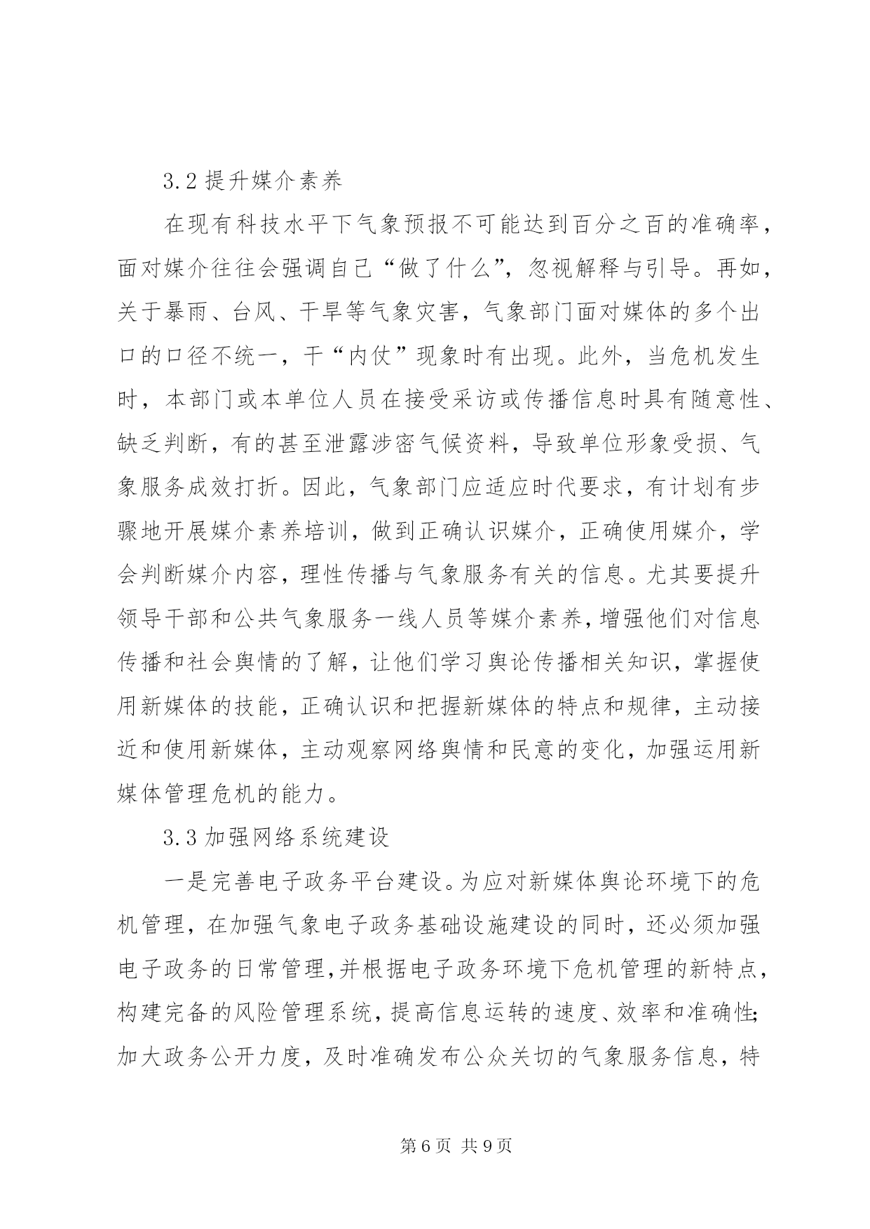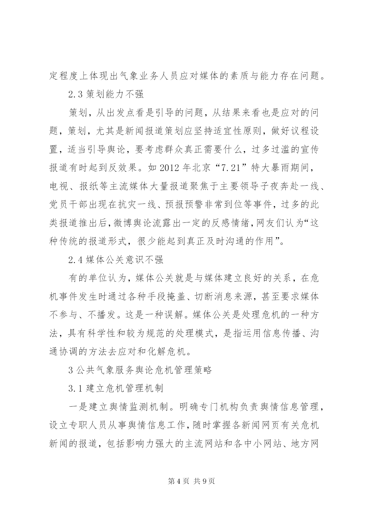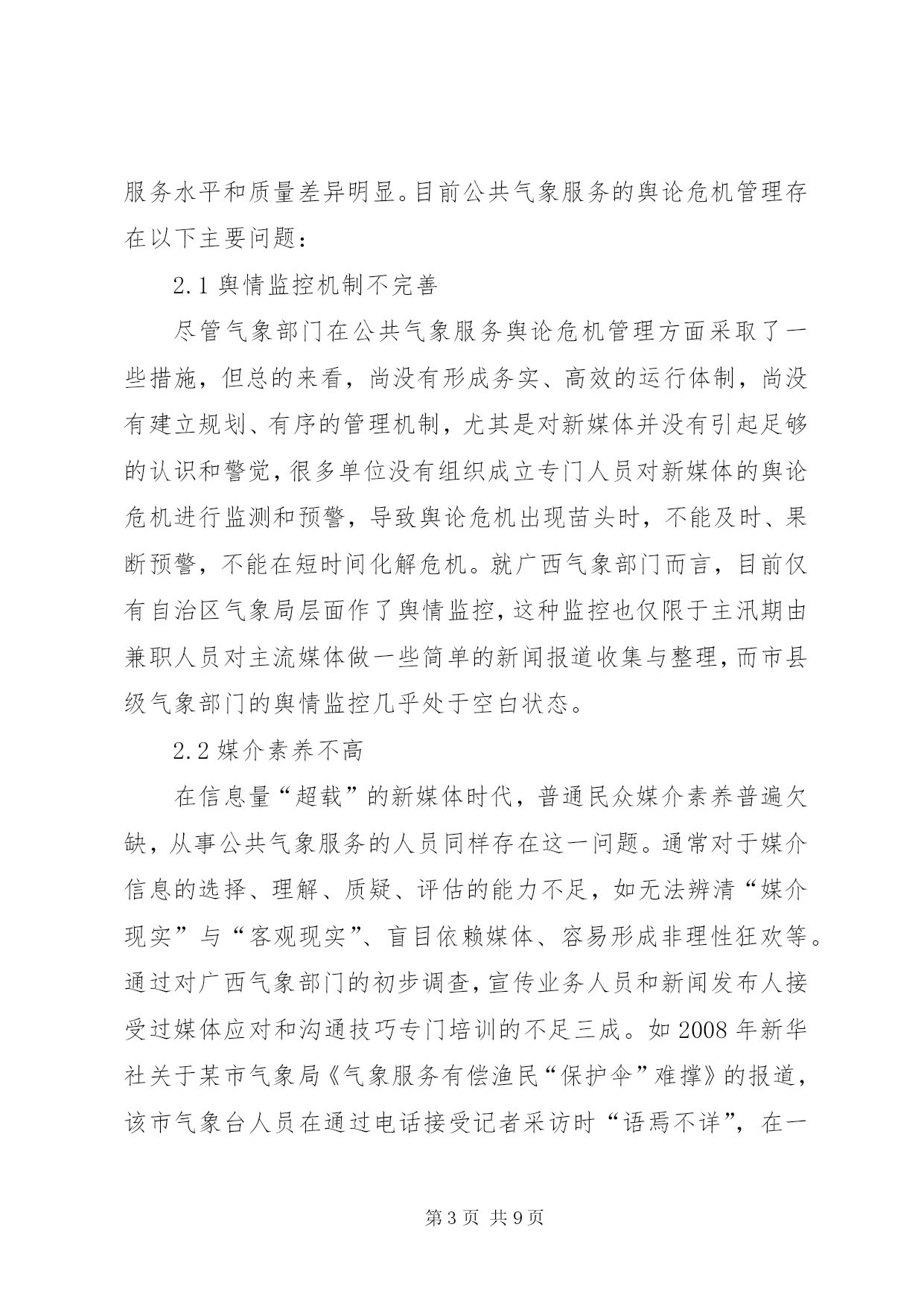 第PAGE\*Arabic\*MERGEFORMAT9页共NUMPAGES\*MERGEFORMAT9页公共气象服务舆论应对对策分析1公共气象服务面临的舆论环境1.1舆论制造主体的改变———“大众麦克风时代”以往在传统媒体为主体的时代,公共危机影响面较小,在新闻媒体尚未参与大规模报道时,危机就可以被解除。而在新媒体时代,互联网提供了一个强大的平台,使信息的发布和社群的组织变得简单、迅速,发布的成本也十分低廉,社会进入“大众麦克风时代”,使舆论危机初期的时间变得越来越短,危机的爆发很迅速,在相关部门或人员还没有做好准备时,相关的危机事件已经成为社会议论的焦点。如2008年南方雨雪冰冻灾害和2011年广东“4.17”雷雨大风期间,一些非理性的刷流量、搏粉丝举动故意放大社会痛点、增加了网络戾气。1.2舆论传播方式的改变--交互性强新媒体的发展已经让信息的传播方和接收方转变成一种地位上的均等和互动关系,信息的获取和传递可以随时进行,不再像以往语言文字时代和报纸、电视传播时代传播方居高临下、没有接收方及时反馈的单向传播方式。新媒介的传播类似于利用大众媒体的人际传播,而人际传播的弊端如谣言、流言、信息的扭曲等也通过大众媒体被放大,在这种情况下,危机事件很容易被夸张、放大甚至扭曲,给危机管理带来困难。如2012年6月11日上午开始,XX市出现严重雾霾天气,一时间,“锅炉爆炸”、“氯气泄露”等谣言四起,引起恐慌。面对谣言,XX市充分发挥网络、微博、手机等新型媒体在舆论危机应对中的作用,通过跟踪滚动发布雾霾气象事件信息、与网友进行互动交流等方式迅速平息谣言,稳定公众情绪。1.3舆论传播内容的改变--碎片化、无中心化倾向由于微博、微信等对单条信息的容量控制,使得信息传播呈现出碎片化、无中心化的倾向,往往无法展示事件全貌。微博对用户发送信息的容量控制为每条不超过140字节,即70个汉字。然而,危机事件往往都具有突发性、复杂性,通常情况下,70个字很难展示事件全貌,在互动传播中,事件局部特征被进一步强化。如2012年北京“7.21”特大暴雨期间,微博传言房山有200名敬老院老人死于暴雨,引起了社会恐慌,幸而XX县区积极调查,及时公布事实真相,使得谣言在短时间内消亡。2公共气象服务应对舆论危机存在的问题引发公共气象服务舆论危机的诱因主要有三点:一是气象灾害的重大性。气象灾害属于公共危机中的自然危机,特别是重大气象灾害可能带来灾难性后果,是一种具有紧急性、破坏性和社会性的危机。二是预报能力的有限性。特殊的地理环境以及大气演变过程的复杂性决定了天气预报准确率在未来很长的时间内不可能百分之百准确,气象服务能力不能满足现实需求。三是产品覆盖的不均等性。当前,城乡、区域、人群间的基本公共气象服务水平和质量差异明显。目前公共气象服务的舆论危机管理存在以下主要问题:2.1舆情监控机制不完善尽管气象部门在公共气象服务舆论危机管理方面采取了一些措施,但总的来看,尚没有形成务实、高效的运行体制,尚没有建立规划、有序的管理机制,尤其是对新媒体并没有引起足够的认识和警觉,很多单位没有组织成立专门人员对新媒体的舆论危机进行监测和预警,导致舆论危机出现苗头时,不能及时、果断预警,不能在短时间化解危机。就广西气象部门而言,目前仅有自治区气象局层面作了舆情监控,这种监控也仅限于主汛期由兼职人员对主流媒体做一些简单的新闻报道收集与整理,而市县级气象部门的舆情监控几乎处于空白状态。2.2媒介素养不高在信息量“超载”的新媒体时代,普通民众媒介素养普遍欠缺,从事公共气象服务的人员同样存在这一问题。通常对于媒介信息的选择、理解、质疑、评估的能力不足,如无法辨清“媒介现实”与“客观现实”、盲目依赖媒体、容易形成非理性狂欢等。通过对广西气象部门的初步调查,宣传业务人员和新闻发布人接受过媒体应对和沟通技巧专门培训的不足三成。如2008年新华社关于某市气象局《气象服务有偿渔民“保护伞”难撑》的报道,该市气象台人员在通过电话接受记者采访时“语焉不详”,在一定程度上体现出气象业务人员应对媒体的素质与能力存在问题。2.3策划能力不强策划,从出发点看是引导的问题,从结果来看也是应对的问题,策划,尤其是新闻报道策划应坚持适宜性原则,做好议程设置,适当引导舆论,要考虑群众真正需要什么,过多过滥的宣传报道有时起到反效果。如2012年北京“7.21”特大暴雨期间,电视、报纸等主流媒体大量报道聚焦于主要领导子夜奔赴一线、党员干部出现在抗灾一线、预报预警非常到位等事件,过多的此类报道推出后,微博舆论流露出一定的反感情绪,网友们认为“这种传统的报道形式,很少能起到真正及时沟通的作用”。2.4媒体公关意识不强有的单位认为,媒体公关就是与媒体建立良好的关系,在危机事件发生时通过各种手段掩盖、切断消息来