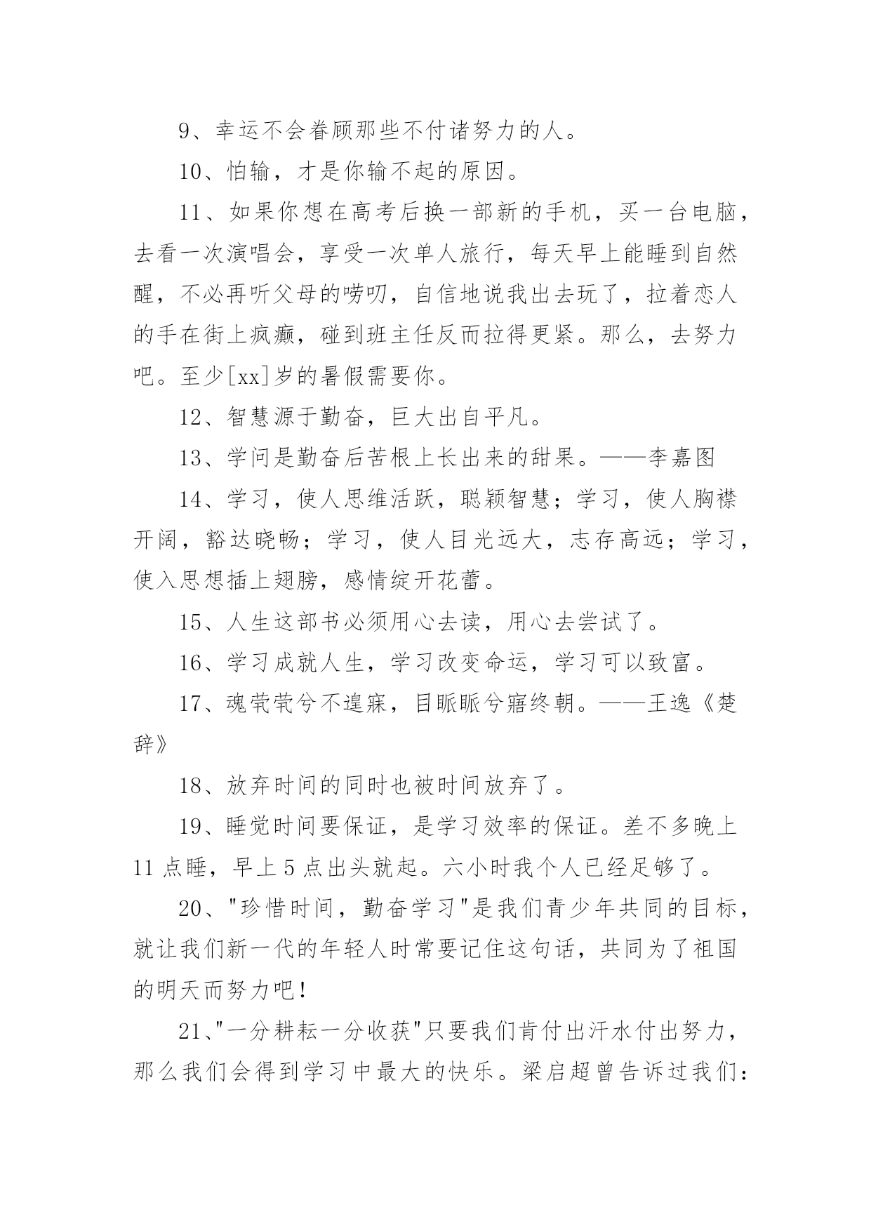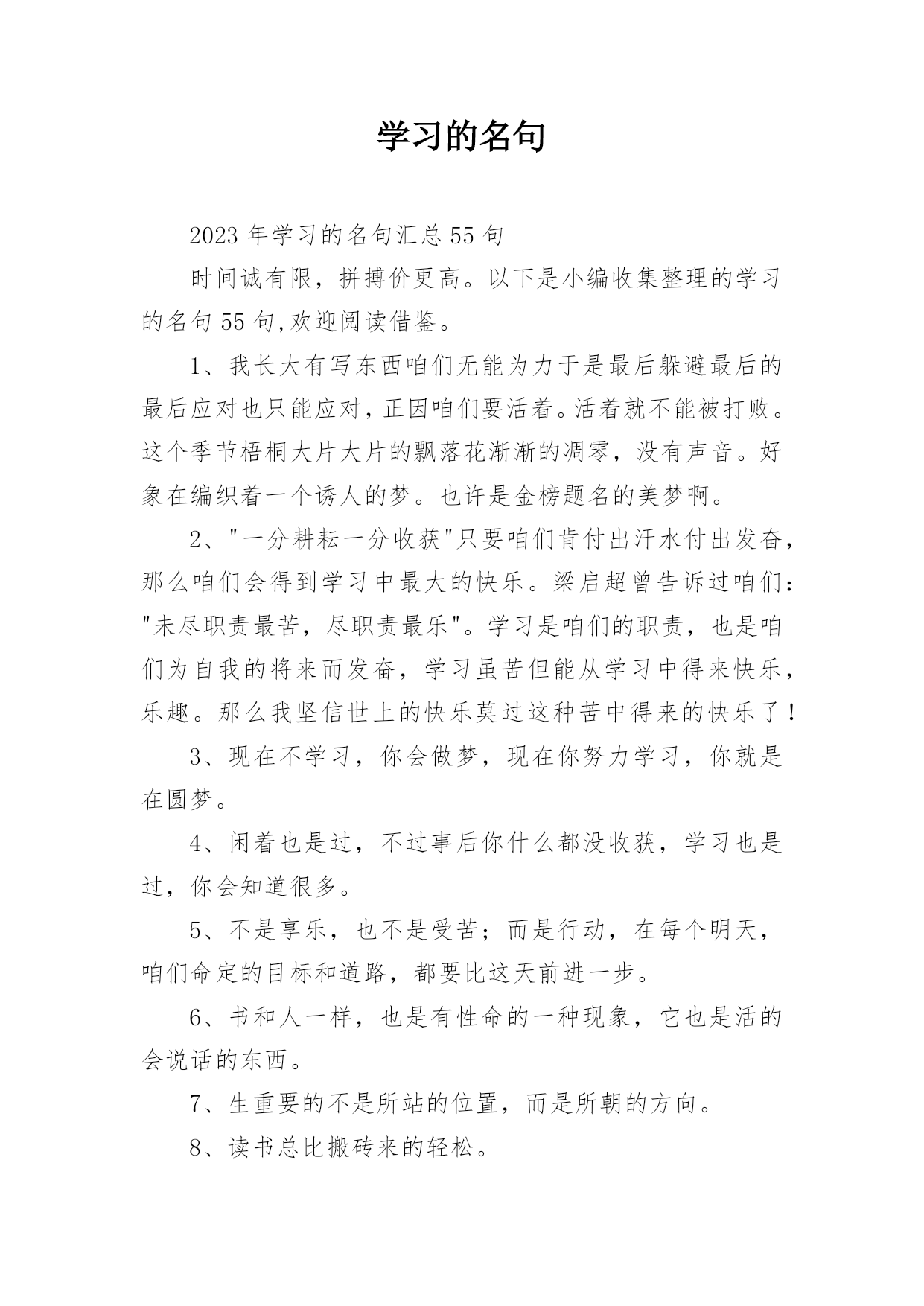 学习的名句2023年学习的名句汇总55句时间诚有限,拼搏价更高。以下是小编收集整理的学习的名句55句,欢迎阅读借鉴。1、我长大有写东西咱们无能为力于是最后躲避最后的最后应对也只能应对,正因咱们要活着。活着就不能被打败。这个季节梧桐大片大片的飘落花渐渐的凋零,没有声音。好象在编织着一个诱人的梦。也许是金榜题名的美梦啊。2、"一分耕耘一分收获"只要咱们肯付出汗水付出发奋,那么咱们会得到学习中最大的快乐。梁启超曾告诉过咱们:"未尽职责最苦,尽职责最乐"。学习是咱们的职责,也是咱们为自我的将来而发奋,学习虽苦但能从学习中得来快乐,乐趣。那么我坚信世上的快乐莫过这种苦中得来的快乐了!3、现在不学习,你会做梦,现在你努力学习,你就是在圆梦。4、闲着也是过,不过事后你什么都没收获,学习也是过,你会知道很多。5、不是享乐,也不是受苦;而是行动,在每个明天,咱们命定的目标和道路,都要比这天前进一步。6、书和人一样,也是有性命的一种现象,它也是活的会说话的东西。7、生重要的不是所站的位置,而是所朝的方向。8、读书总比搬砖来的轻松。9、幸运不会眷顾那些不付诸努力的人。10、怕输,才是你输不起的原因。11、如果你想在高考后换一部新的手机,买一台电脑,去看一次演唱会,享受一次单人旅行,每天早上能睡到自然醒,不必再听父母的唠叨,自信地说我出去玩了,拉着恋人的手在街上疯癫,碰到班主任反而拉得更紧。那么,去努力吧。至少[xx]岁的暑假需要你。12、智慧源于勤奋,巨大出自平凡。13、学问是勤奋后苦根上长出来的甜果。——李嘉图14、学习,使人思维活跃,聪颖智慧;学习,使人胸襟开阔,豁达晓畅;学习,使人目光远大,志存高远;学习,使入思想插上翅膀,感情绽开花蕾。15、人生这部书必须用心去读,用心去尝试了。16、学习成就人生,学习改变命运,学习可以致富。17、魂茕茕兮不遑寐,目眽眽兮寤终朝。——王逸《楚辞》18、放弃时间的同时也被时间放弃了。19、睡觉时间要保证,是学习效率的保证。差不多晚上11点睡,早上5点出头就起。六小时我个人已经足够了。20、"珍惜时间,勤奋学习"是我们青少年共同的目标,就让我们新一代的年轻人时常要记住这句话,共同为了祖国的明天而努力吧!21、"一分耕耘一分收获"只要我们肯付出汗水付出努力,那么我们会得到学习中最大的快乐。梁启超曾告诉过我们:"未尽责任最苦,尽责任最乐"。学习是我们的责任,也是我们为自己的将来而努力,学习虽苦但能从学习中得来快乐,乐趣。那么我相信世上的快乐莫过这种苦中得来的快乐了!22、在学习的路途中还有有远大的理想,有明确的目标,坚定的决心,这样较大实地一步一个脚印的走向自己的目标。实现自己的梦想,不管在路途中遇到多大的挫折,我们要有坚强的毅力,不临阵退缩!23、在现在的生活中,许多学生认为我们中国已经很强大了,不需要再刻苦读书,不需要再用功。其实,我们的国家还不能算是真正的富强,我们在很多方面扮演着强者的角色,但也在很多方面扮演着弱者的身份,要让我国实现真正意义上的强大,需要我们一代一代人的努力,因此,我们要好好学习,为中华之富强而读书!24、有趣的语文,你的知识永远是那么多,数也数不完,说也说不净。你永远装有一颗纯洁的心,用那美丽的微笑,照亮我们的生命,因为有你我们的生命才有乐趣。因为有你,我们的生活才有光彩。你孕育了一篇篇极具风味的文章。勾勒出了一幅幅具有神奇美丽的画卷!25、越能愉快的学习,产生快乐的感觉就越好。好希望每个人都能明白这个道理,能够在有限的生命里懂得,在学习这无限的海洋中体会快乐,在快乐中学习!26、在失败中不断总结学习的方法,那才是真正的学习,学习的场所不一定非得是学堂,盖恣连中学还没毕业呢,不也成了世界第一首富吗?但学堂却给大家提供了好的条件,即使遇到困难也会有很多人一起解决,但是,自己绝不能等待别人来解决,不断在学习中思考解决的方法,那才是学习者。27、要么你驾御生命,要么生命驾御你。28、勤奋,是学习的必需品。。不论你天赋高与低,无论你聪明或愚钝,只要勤奋,就一定能取得优异的成绩。现在许多优秀的学生,他们天赋都很高吗?不,不是的,他们都是正常的智商,而正是凭着勤奋靠着超人的努力,才取得了令我们惊叹的好成绩。29、无论你是多高的经验和技术,面对未来也要保持一个小学生的心态去学习和积累。30、有些冲动你必须要克制,有些人你务必要保持距离。虽说多些尝试就会多些经验和可能,但情感与善良浪费的太多,总有一天或多或少会消磨了你对生活的热爱。从我们出生开始就意味着要接受各种考验,人生就是一个学习和改正的过程,但即使是需要历练和修正自我的机会,也不要盲目的找人练习;活着就少不了大大小小的伤,但你可以选择不要伤得那么狼狈。31、聆听他人言谈是保持兴趣,能从中学习到许多事情。尽力追求让自己乐在其中、活在当下。从众多