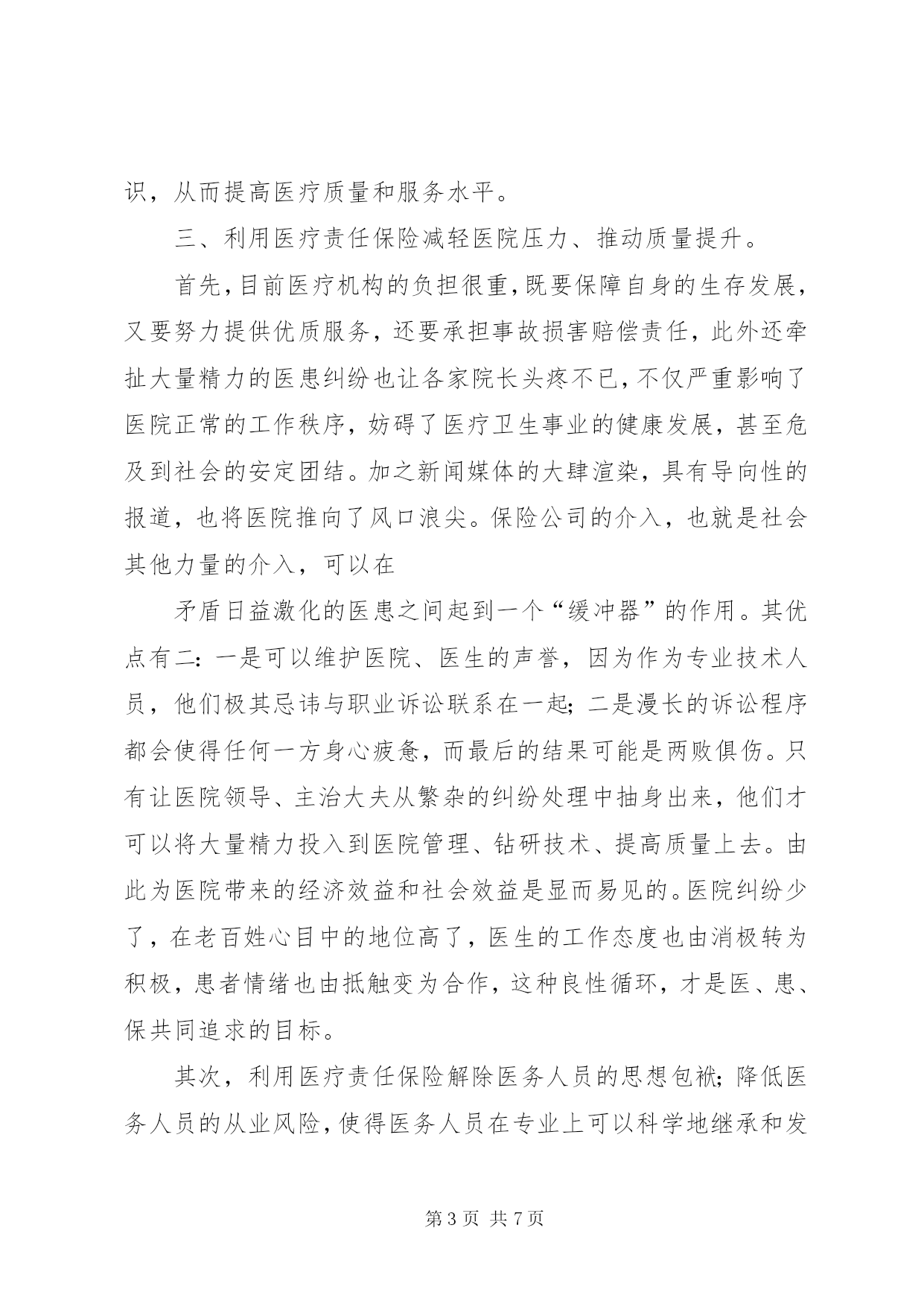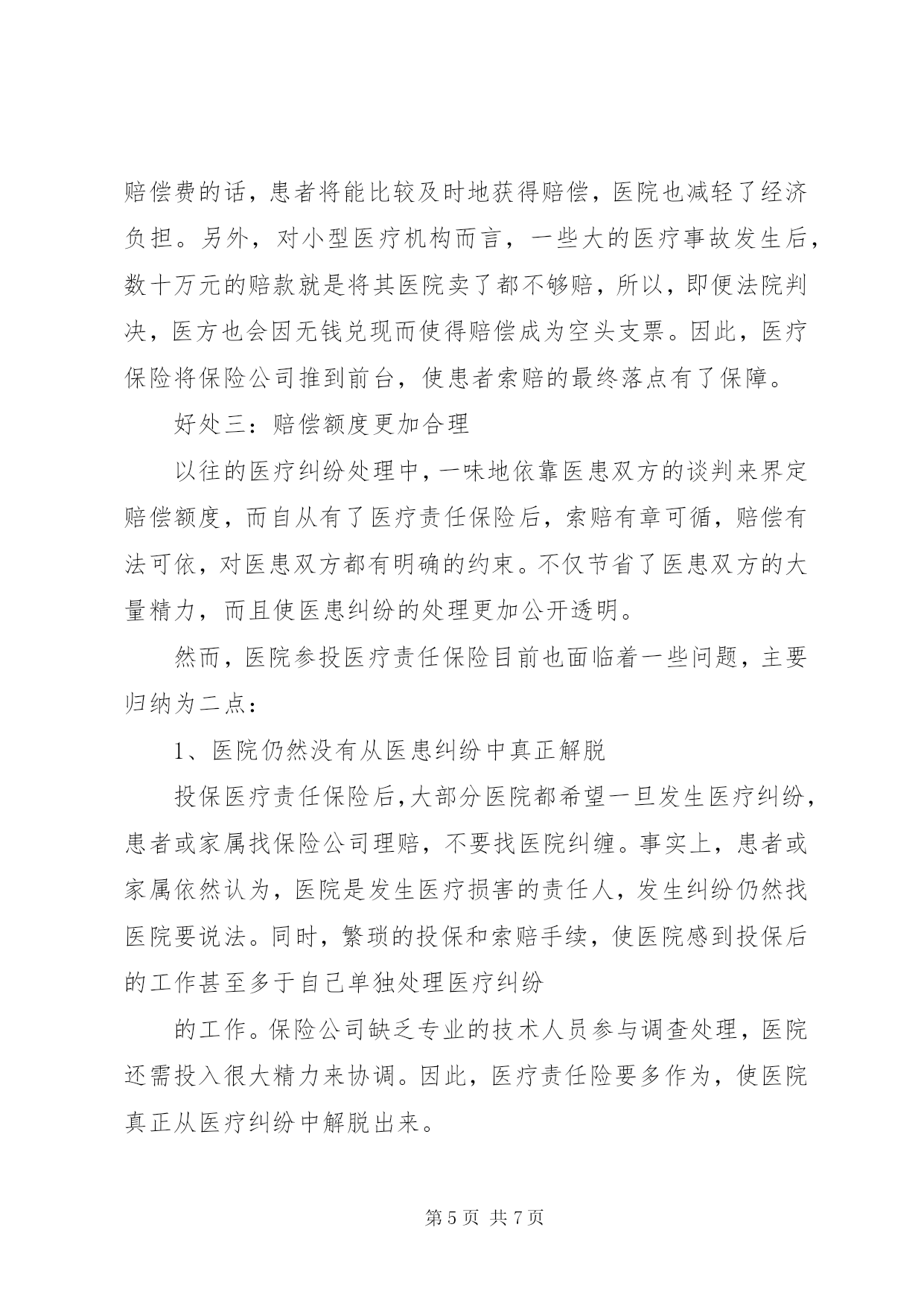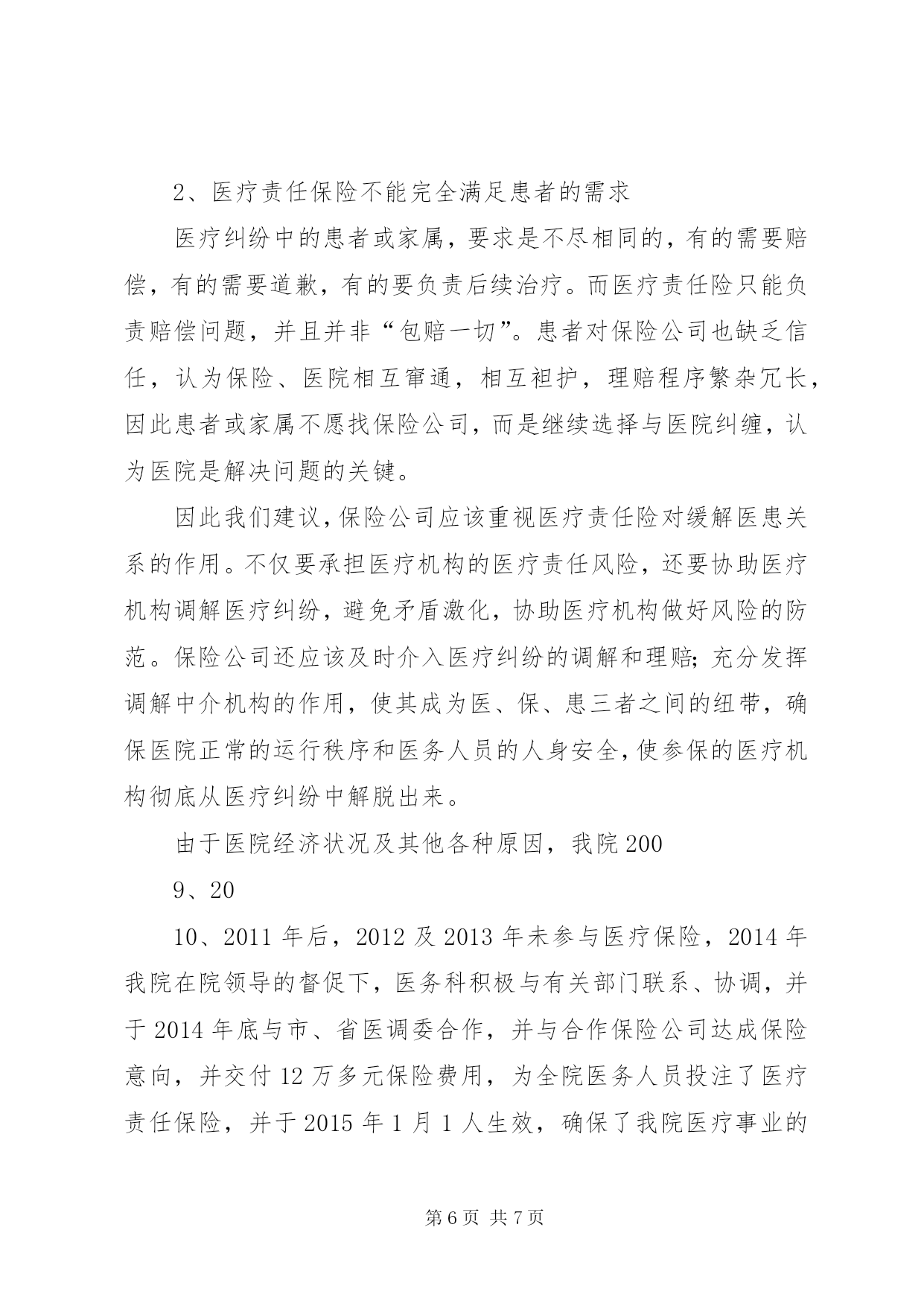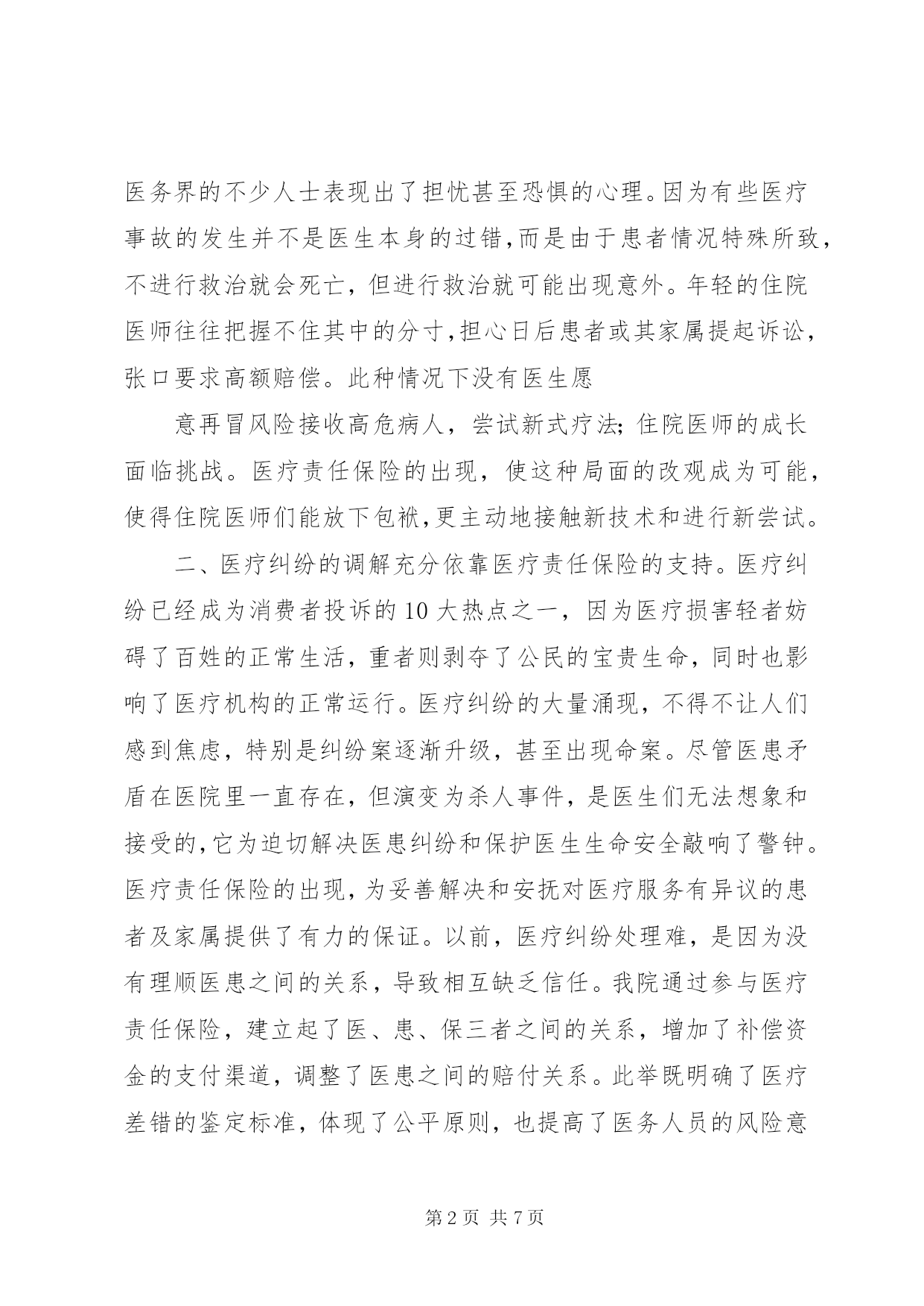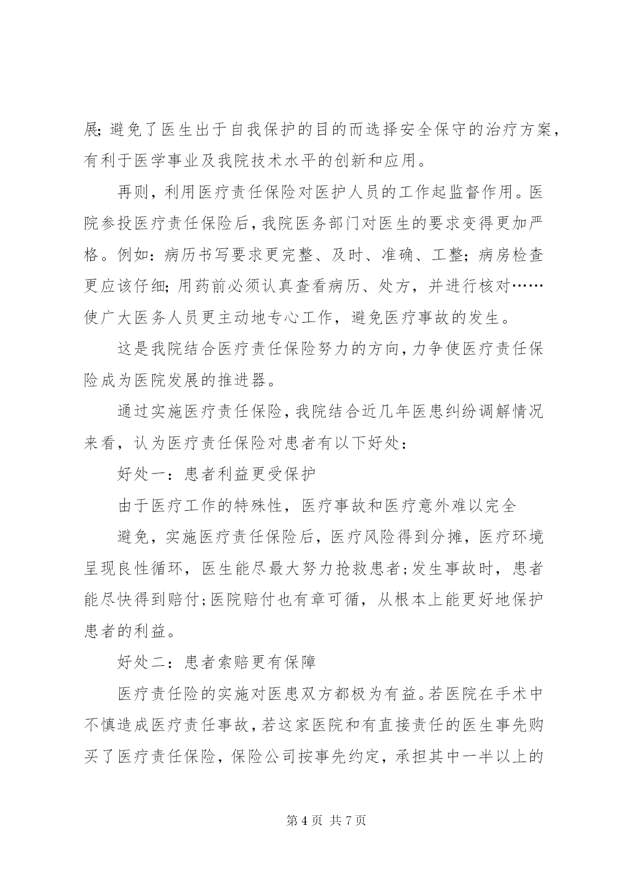 第PAGE\*Arabic\*MERGEFORMAT7页共NUMPAGES\*MERGEFORMAT7页医疗保险责任书XX县区人民医院医疗责任保险工作总结自2009年以来,我院按上级要求进行部署,积极动员和参加医疗责任保险,同时,对全体医护人员进行了医疗责任保险的教育,使得全体医护人员充分理解医疗责任保险的意义。我们在强调医患沟通的前提下,把规范化住院医师培训与医疗责任保险有机的加以结合;把医疗责任保险的政策运用到医患纠纷的调解中去;借医疗责任保险之力来提高医疗整体质量。实际工作中的措施主要有以下几条:一、在住院医师规范化培训的同时,结合医疗责任保险,鼓励年轻的住院医师多动手动脑,敢于实践,提高水平。我们知道,医生的医术之所以能不断提高,主要是依靠大量的临床实践,只有多接触各种各样的病例,积累了相当的经验,才能做到心中有数。特别是刚刚走上工作岗位的年轻大夫,更需要这方面的锻炼。一名优秀的医生,不仅在于7年、8年基础医学理论的认真学习与研究,更为重要的是在活生生的患者面前,如何处理而使他们转危为安,尤其是遇到一些疑难问题、突发事件或急诊状态。在新《条例》出台之前,医务人员还没有过多的心理顾虑,只要患者前来求医,本着救死扶伤的人道主义精神,都尽其所能地进行救治,只要有一分的希望就会付出十分的努力。然而自从宣布实行“举证责任倒臵”,以及加大事故赔偿力度后,医务界的不少人士表现出了担忧甚至恐惧的心理。因为有些医疗事故的发生并不是医生本身的过错,而是由于患者情况特殊所致,不进行救治就会死亡,但进行救治就可能出现意外。年轻的住院医师往往把握不住其中的分寸,担心日后患者或其家属提起诉讼,张口要求高额赔偿。此种情况下没有医生愿意再冒风险接收高危病人,尝试新式疗法;住院医师的成长面临挑战。医疗责任保险的出现,使这种局面的改观成为可能,使得住院医师们能放下包袱,更主动地接触新技术和进行新尝试。二、医疗纠纷的调解充分依靠医疗责任保险的支持。医疗纠纷已经成为消费者投诉的10大热点之一,因为医疗损害轻者妨碍了百姓的正常生活,重者则剥夺了公民的宝贵生命,同时也影响了医疗机构的正常运行。医疗纠纷的大量涌现,不得不让人们感到焦虑,特别是纠纷案逐渐升级,甚至出现命案。尽管医患矛盾在医院里一直存在,但演变为杀人事件,是医生们无法想象和接受的,它为迫切解决医患纠纷和保护医生生命安全敲响了警钟。医疗责任保险的出现,为妥善解决和安抚对医疗服务有异议的患者及家属提供了有力的保证。以前,医疗纠纷处理难,是因为没有理顺医患之间的关系,导致相互缺乏信任。我院通过参与医疗责任保险,建立起了医、患、保三者之间的关系,增加了补偿资金的支付渠道,调整了医患之间的赔付关系。此举既明确了医疗差错的鉴定标准,体现了公平原则,也提高了医务人员的风险意识,从而提高医疗质量和服务水平。三、利用医疗责任保险减轻医院压力、推动质量提升。首先,目前医疗机构的负担很重,既要保障自身的生存发展,又要努力提供优质服务,还要承担事故损害赔偿责任,此外还牵扯大量精力的医患纠纷也让各家院长头疼不已,不仅严重影响了医院正常的工作秩序,妨碍了医疗卫生事业的健康发展,甚至危及到社会的安定团结。加之新闻媒体的大肆渲染,具有导向性的报道,也将医院推向了风口浪尖。保险公司的介入,也就是社会其他力量的介入,可以在矛盾日益激化的医患之间起到一个“缓冲器”的作用。其优点有二:一是可以维护医院、医生的声誉,因为作为专业技术人员,他们极其忌讳与职业诉讼联系在一起;二是漫长的诉讼程序都会使得任何一方身心疲惫,而最后的结果可能是两败俱伤。只有让医院领导、主治大夫从繁杂的纠纷处理中抽身出来,他们才可以将大量精力投入到医院管理、钻研技术、提高质量上去。由此为医院带来的经济效益和社会效益是显而易见的。医院纠纷少了,在老百姓心目中的地位高了,医生的工作态度也由消极转为积极,患者情绪也由抵触变为合作,这种良性循环,才是医、患、保共同追求的目标。其次,利用医疗责任保险解除医务人员的思想包袱;降低医务人员的从业风险,使得医务人员在专业上可以科学地继承和发展;避免了医生出于自我保护的目的而选择安全保守的治疗方案,有利于医学事业及我院技术水平的创新和应用。再则,利用医疗责任保险对医护人员的工作起监督作用。医院参投医疗责任保险后,我院医务部门对医生的要求变得更加严格。例如:病历书写要求更完整、及时、准确、工整;病房检查更应该仔细;用药前必须认真查看病历、处方,并进行核对……使广大医务人员更主动地专心工作,避免医疗事故的发生。这是我院结合医疗责任保险努力的方向,力争使医疗责任保险成为医院发展的推进器。通过实施医疗责任保险,我院结合近几年医患纠纷调解情况来看,认为医疗责任保险对患者有以下好处:好处一:患者利益更受保护由于医疗工作的特殊性