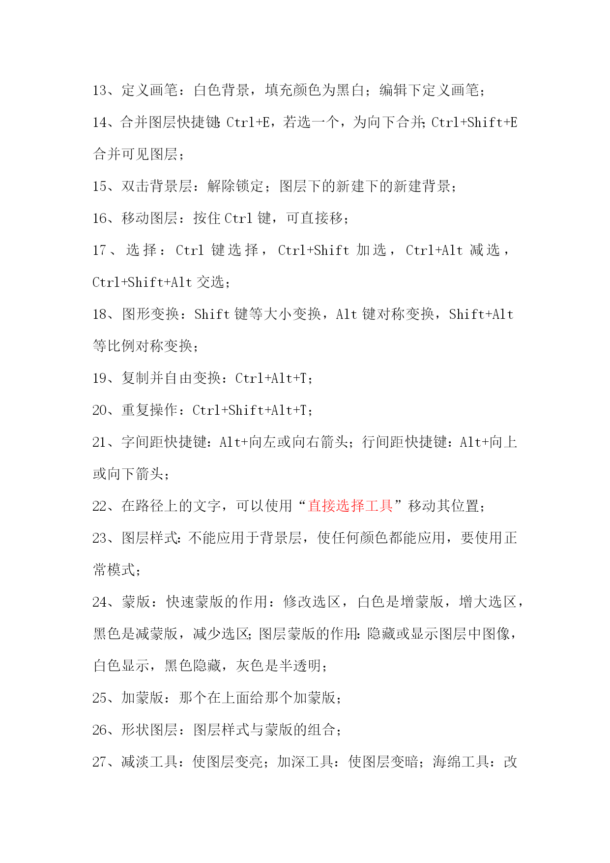PHOTOSHOP视频教程笔记1、图章工具的作用:使用Alt+复制所点击图像,并可复制到另一张图片中;2、渐变工具:删除渐变条上的中间色,往下拉;复制某一图标颜色,单击后在所需地方点击即可;3、吸管工具:默认是前景色,按住Alt键吸取的是背景色;4、选取:按住“空格键”为选择选区时,移动开始点;5、新建同样大小的图片:Ctrl+A全选、Ctrl+C复制、Ctrl+N新建;条件是不透明的背景层;6、文字工具:建立文字选区,使用横排文字工具;7、自定义图案:一定要用矩形选区选取并无羽化;快速应用图案:编辑下的填充下的图案;8、钢笔工具:去除控制一端手柄,按住Alt键;9、修改路径:利用直接选择工具;修改一端,按住Alt键或使用“转换点工具”;增加锚点,利用钢笔工具下的“增加锚点工具”;删除锚点,利用钢笔工具下的“删除锚点工具”;增加或删除,也可利用钢笔工具;10、直线路径与曲线路径的相互转化:利用钢笔下的“转换点工具”;11、移动选区:选择选区工具,选第一个,在里面移动;移动路径:使用“直接选择工具”,点击边缘移动,选择路径时,使用“路径选择工具”很方便;12、路径变选区快捷键:Ctrl+Enter;路径和选区可以混合使用;13、定义画笔:白色背景,填充颜色为黑白;编辑下定义画笔;14、合并图层快捷键:Ctrl+E,若选一个,为向下合并;Ctrl+Shift+E合并可见图层;15、双击背景层:解除锁定;图层下的新建下的新建背景;16、移动图层:按住Ctrl键,可直接移;17、选择:Ctrl键选择,Ctrl+Shift加选,Ctrl+Alt减选,Ctrl+Shift+Alt交选;18、图形变换:Shift键等大小变换,Alt键对称变换,Shift+Alt等比例对称变换;19、复制并自由变换:Ctrl+Alt+T;20、重复操作:Ctrl+Shift+Alt+T;21、字间距快捷键:Alt+向左或向右箭头;行间距快捷键:Alt+向上或向下箭头;22、在路径上的文字,可以使用“直接选择工具”移动其位置;23、图层样式:不能应用于背景层,使任何颜色都能应用,要使用正常模式;24、蒙版:快速蒙版的作用:修改选区,白色是增蒙版,增大选区,黑色是减蒙版,减少选区;图层蒙版的作用:隐藏或显示图层中图像,白色显示,黑色隐藏,灰色是半透明;25、加蒙版:那个在上面给那个加蒙版;26、形状图层:图层样式与蒙版的组合;27、减淡工具:使图层变亮;加深工具:使图层变暗;海绵工具:改变饱和度;28、图像的颜色模式:(1)颜色的多少(2)文件的大小(3)通道的数目;位图:只有两种颜色;灰度:黑白色,256种灰色信息;索引:256种灰色和彩色的混合;RGB:256*256*256种颜色(三原色);CMYK:C代表青色,M代表洋红,Y代表黄色,K代表黑色(印刷色);29、