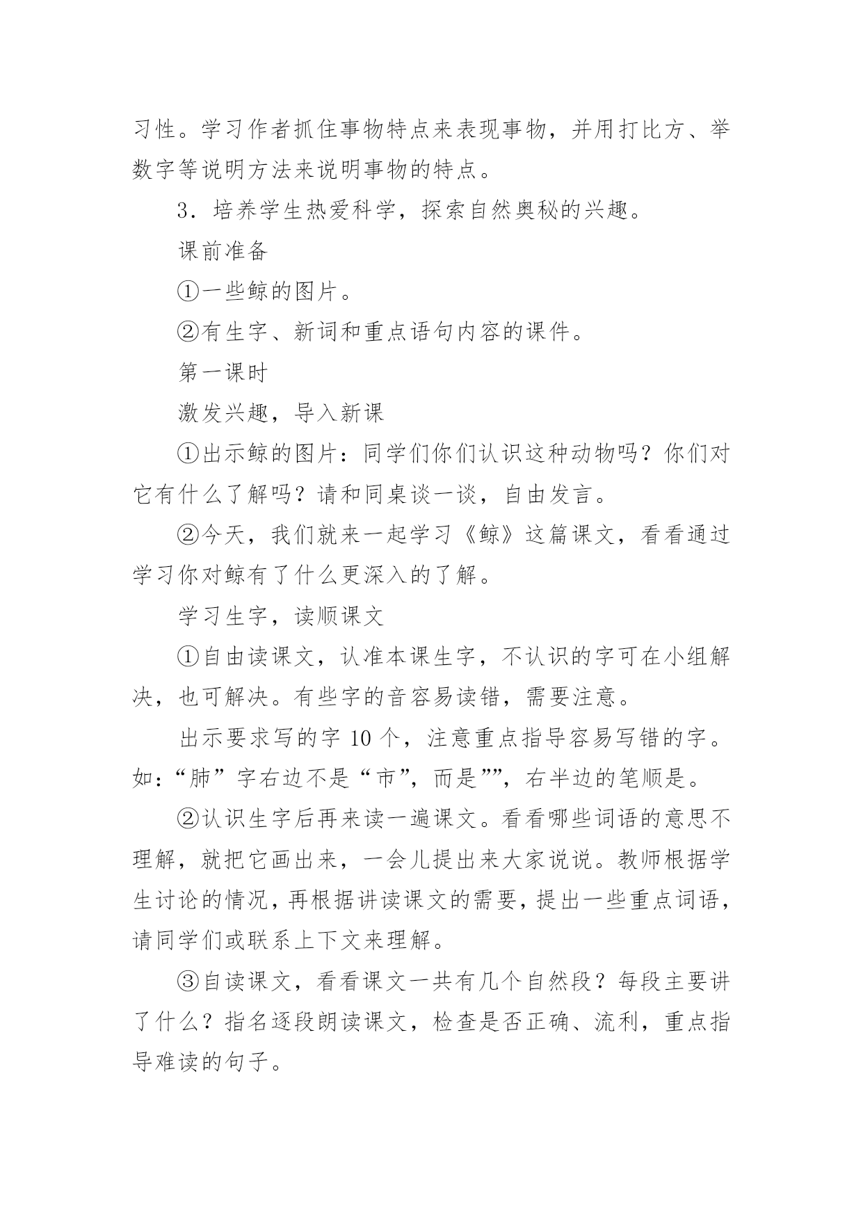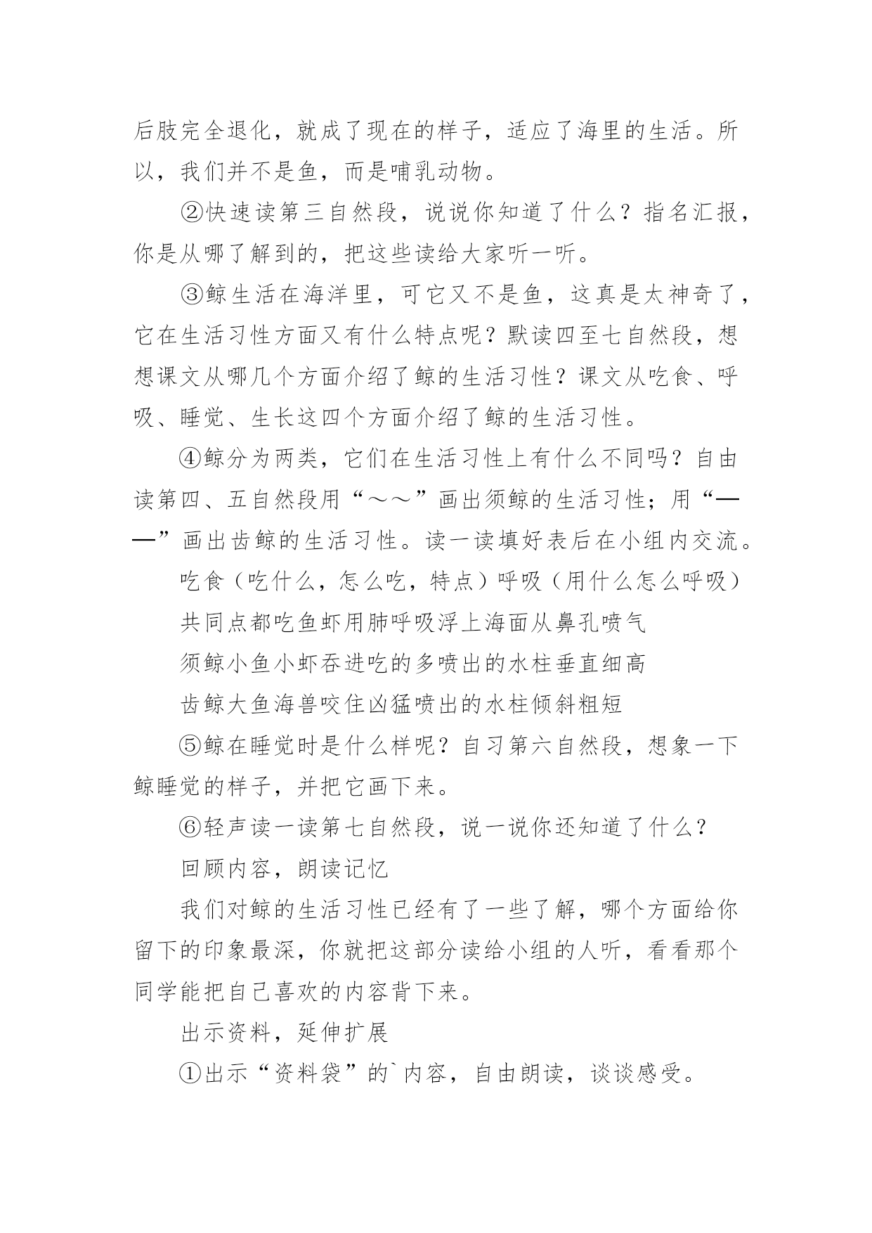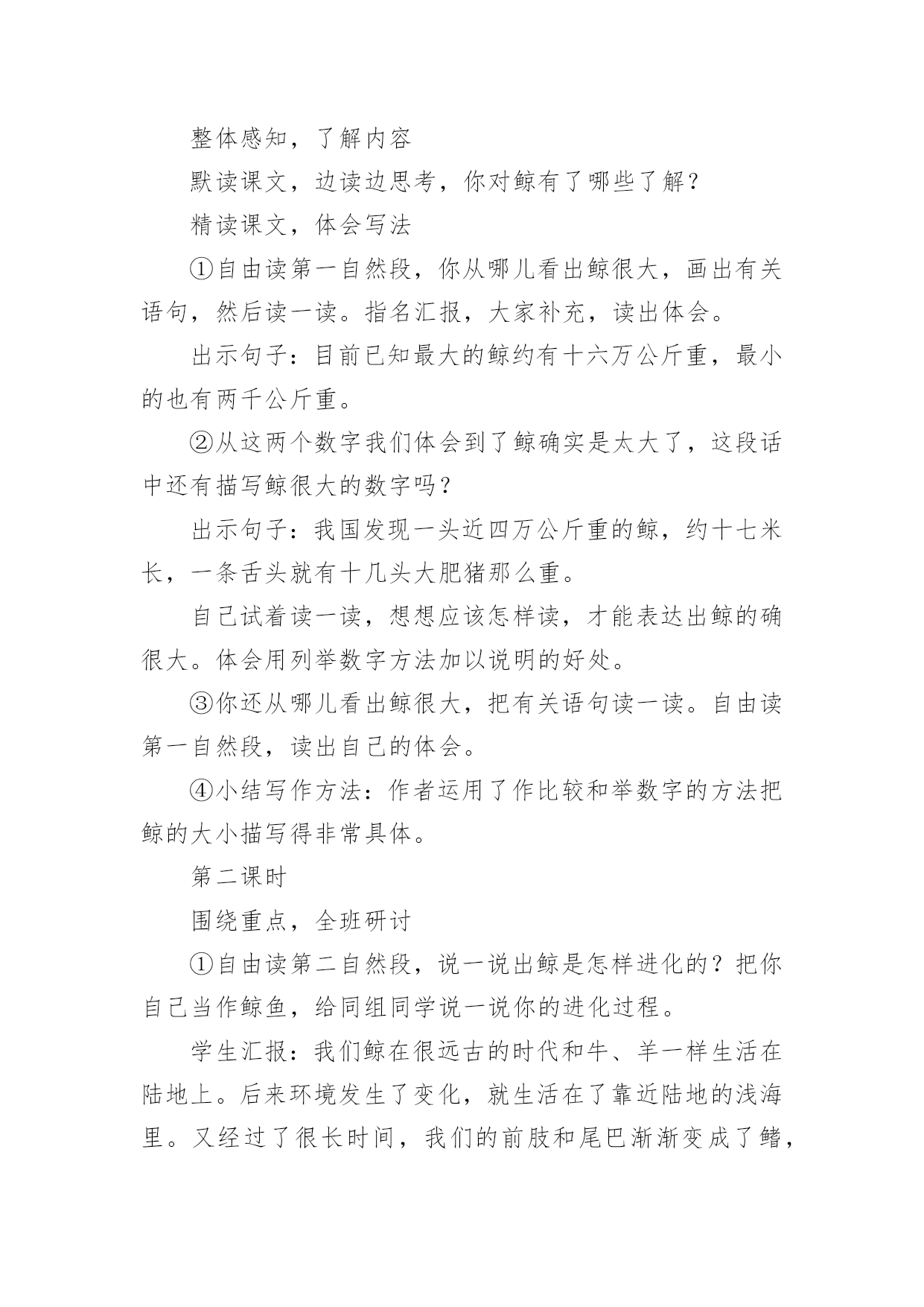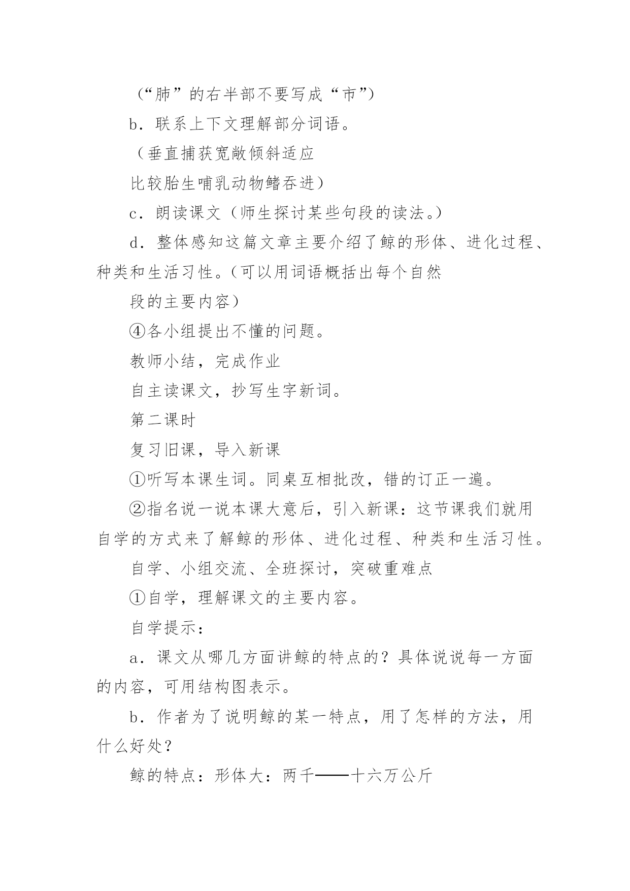 《鲸》教学设计《鲸》教学设计15篇[必备]作为一位不辞辛劳的人民教师,常常需要准备教学设计,教学设计是对学业业绩问题的解决措施进行策划的过程。怎样写教学设计才更能起到其作用呢?以下是小编帮大家整理的《鲸》教学设计,希望能够帮助到大家。《鲸》教学设计1教学目标:1、熟读课文,理解内容,了解鲸的生活习性及其特点;2、复述课文,切身体验,渗透环保教育,初步领悟说明事物的方法。教学设计思想(一)交流写法,导入新课。与学生交流自己喜欢的小动物,及其写小动物应写哪些内容,导入新课。(二)初读课文,整体感知。1、认识水海洋动物鲸,板书鲸,教师画鲸。2、检查朗读,指名分节朗读。3、读后交流,通过读书,你读懂了什么?并提出不明白的问题。师生交流鲸不是鱼。(三)精读课文,了解习性。1、引读睡觉或其他的段落,小结学习方法“找特点——读语句——说方法”了解鲸的生活习性,体会写作方法。2、依法自读。饮食、呼吸等部分。3、汇报交流。(四)对话辩证,深化内涵。1、引:鲸太可爱了,老师也想养鲸,可是有人认为鲸不能养,现在同学们和老师组正反两方,依据你的理解与老师辩论。老师观点:要养鲸,同学观点:鲸不能养。2、师生辩证,老师及时点拨引导,深化对文章内容的理解。(五)拓展延伸,内化感悟。1、引:根据辩论,鲸的'确不可养,但老师爱鲸,因为鲸的作用太大了。出示资料一:鲸的用途。2、出示资料二,正因为鲸的用途大,所有有人捕杀鲸,资料人类捕鲸资料。指名读。3、如果你是一头活着的鲸,你会对人类说什么话?《鲸》教学设计2教学反思:上完《鲸》这一课,回忆起同学们那生动有趣的“鲸的自述”,我非常激动。激动之余,我也产生了一些感触。首先,我觉得,让学生掌握一定的学习方法有利于他们自学习惯的养成。在教学中,我先重点指导学生学习课文的第四自然段,让他们掌握一定的学习方法,以便下面几个自然段的学习。实践证明,这种方法是可行的,学生乐在其中,充分发挥了潜力,真正做到了低耗高效。同样是这一课,几年前我也上过,用的是逐段讲解的方法,不仅耗时,而且低效。还有一点,恰当地使用直观形象的教学手段,可以激发学生的学习兴趣。这堂课上完之后,还有不少学生围着我转,要我再播放课件给他们看,说是还看不过瘾。我想,直观形象的教学,不仅是低年级,高年级学生也是很喜欢的。另外,本文出现了一些常见的说明方法,但对小学生来说,显得较为陌生。由于这些说明方法在本文中的重要作用,我便在适当的时机让学生初步认识。希望这对他们日后的学习有所帮助。值得一提的是,学生在学完这一课后设计的有关鲸的小报,真是让人叹为观止。他们在小报中介绍了抹香鲸、啮齿鲸、蓝鲸……可见他们对鲸兴趣浓厚,课后查找了大量的资料,对鲸的了解还真不少!这样的学习,从课内延伸到课外,效果的确不错。不过,我也在反思,《鲸》是一篇科普性较强的文章,如何让学生更好地学习它,既让学生学到有趣的动物知识,又不失去语文学科的特性,能否有更好的教法或学法,让学生获益更多呢?教学设计:学习目标1.学会本课11个生字,正确读写“捕获、倾斜、哺乳动物”等词。2.朗读课文,了解鲸的形体、种类、进化过程和生活习性。学习作者抓住事物特点来表现事物,并用打比方、举数字等说明方法来说明事物的特点。3.培养学生热爱科学,探索自然奥秘的兴趣。课前准备①一些鲸的图片。②有生字、新词和重点语句内容的课件。第一课时激发兴趣,导入新课①出示鲸的图片:同学们你们认识这种动物吗?你们对它有什么了解吗?请和同桌谈一谈,自由发言。②今天,我们就来一起学习《鲸》这篇课文,看看通过学习你对鲸有了什么更深入的了解。学习生字,读顺课文①自由读课文,认准本课生字,不认识的字可在小组解决,也可解决。有些字的音容易读错,需要注意。出示要求写的字10个,注意重点指导容易写错的字。如:“肺”字右边不是“市”,而是””,右半边的笔顺是。②认识生字后再来读一遍课文。看看哪些词语的意思不理解,就把它画出来,一会儿提出来大家说说。教师根据学生讨论的情况,再根据讲读课文的需要,提出一些重点词语,请同学们或联系上下文来理解。③自读课文,看看课文一共有几个自然段?每段主要讲了什么?指名逐段朗读课文,检查是否正确、流利,重点指导难读的句子。整体感知,了解内容默读课文,边读边思考,你对鲸有了哪些了解?精读课文,体会写法①自由读第一自然段,你从哪儿看出鲸很大,画出有关语句,然后读一读。指名汇报,大家补充,读出体会。出示句子:目前已知最大的鲸约有十六万公斤重,最小的也有两千公斤重。②从这两个数字我们体会到了鲸确实是太大了,这段话中还有描写鲸很大的数字吗?出示句子:我国发现一头近四万公斤重的鲸,约十七米长,一条舌头就有十几头大肥猪那么重。自己试着读一读,想想应该怎样读,才能表达出鲸的确很大。体会用列举数字方法加以说明的好处。③你还从哪儿看出鲸很大