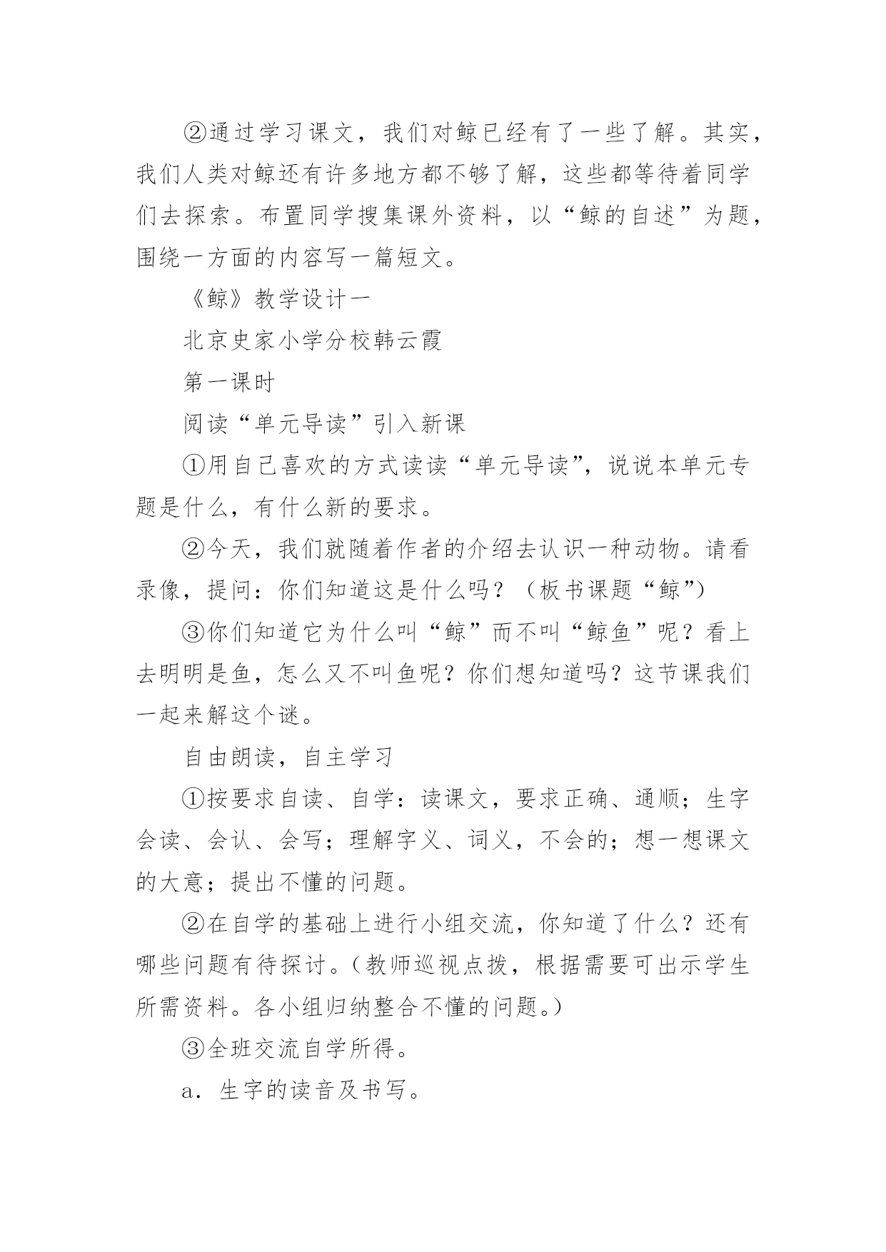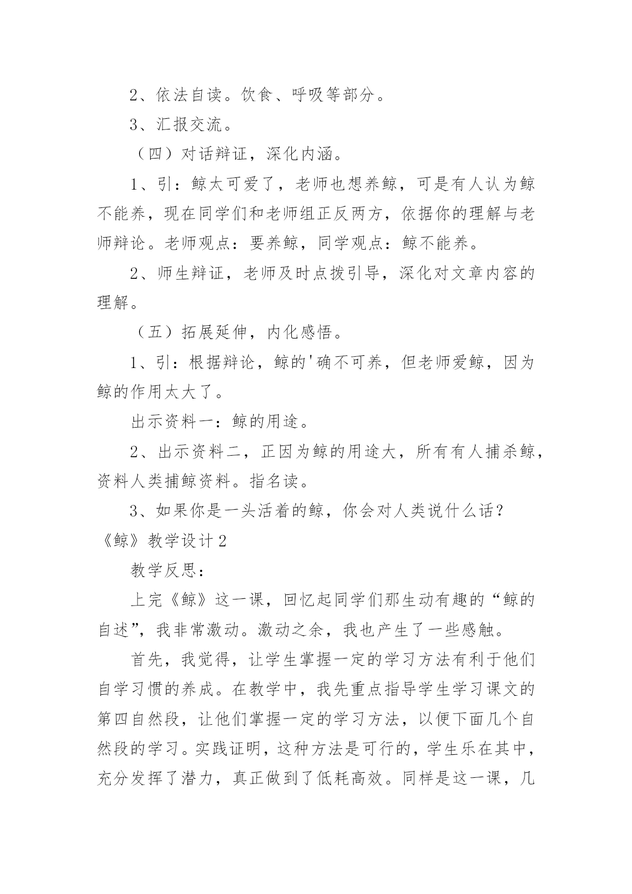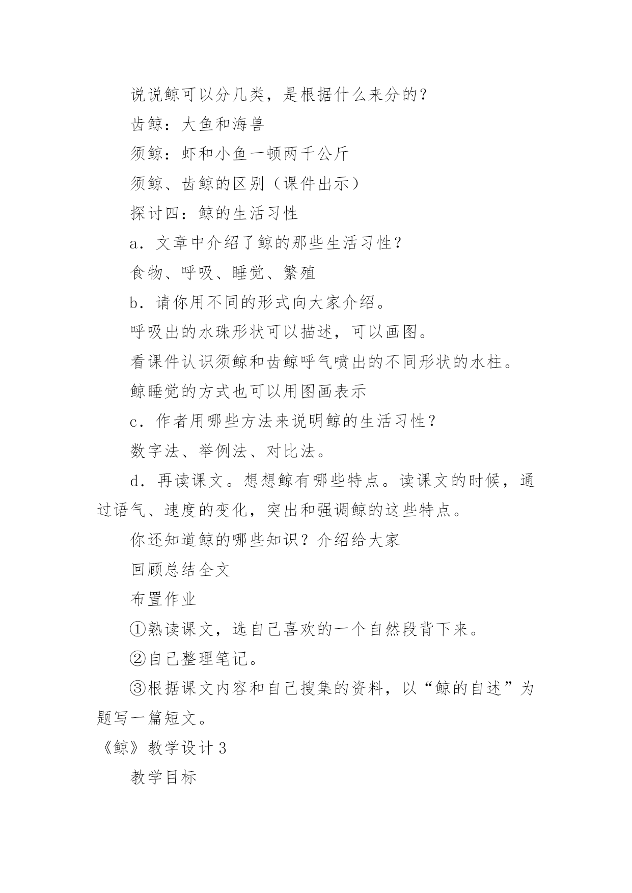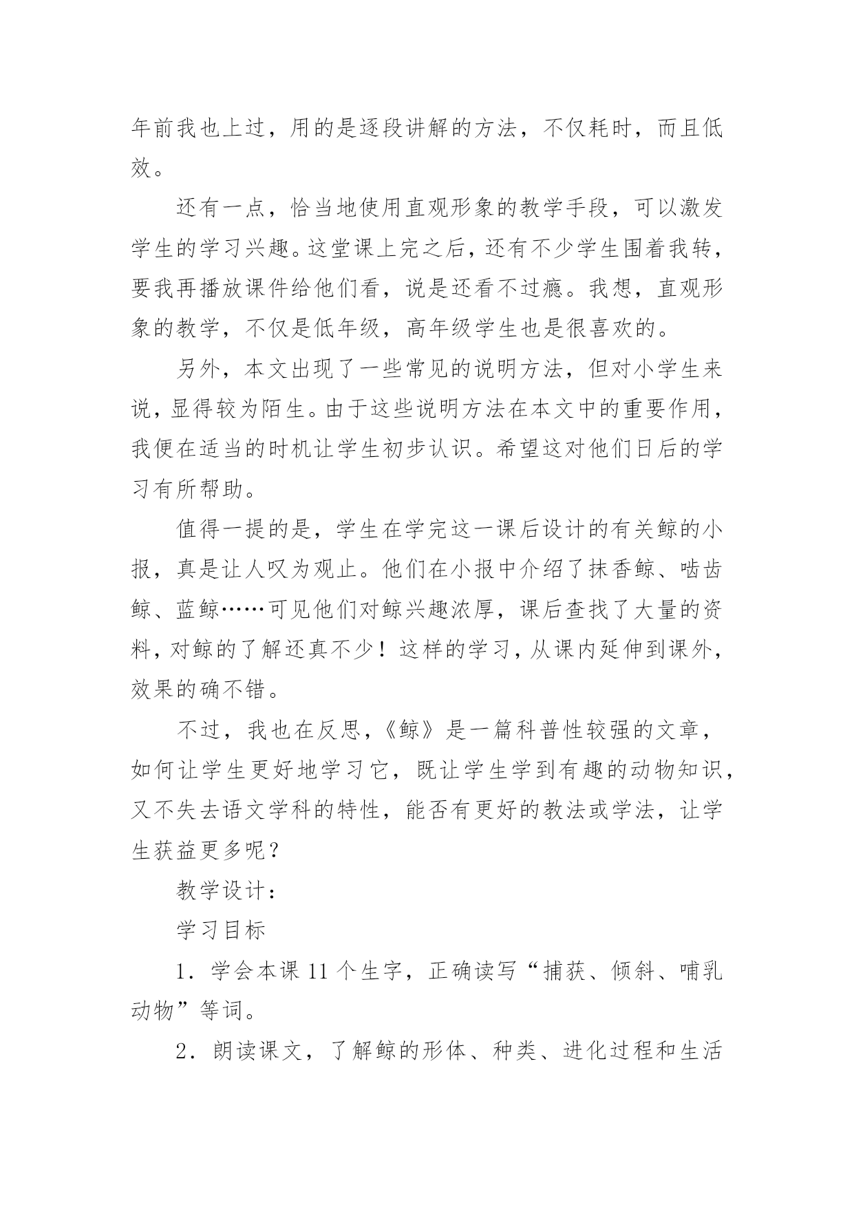 《鲸》教学设计《鲸》教学设计15篇[必备]作为一位不辞辛劳的人民教师,常常需要准备教学设计,教学设计是对学业业绩问题的解决措施进行策划的过程。怎样写教学设计才更能起到其作用呢?以下是小编帮大家整理的《鲸》教学设计,希望能够帮助到大家。《鲸》教学设计1教学目标:1、熟读课文,理解内容,了解鲸的生活习性及其特点;2、复述课文,切身体验,渗透环保教育,初步领悟说明事物的方法。教学设计思想(一)交流写法,导入新课。与学生交流自己喜欢的小动物,及其写小动物应写哪些内容,导入新课。(二)初读课文,整体感知。1、认识水海洋动物鲸,板书鲸,教师画鲸。2、检查朗读,指名分节朗读。3、读后交流,通过读书,你读懂了什么?并提出不明白的问题。师生交流鲸不是鱼。(三)精读课文,了解习性。1、引读睡觉或其他的段落,小结学习方法“找特点——读语句——说方法”了解鲸的生活习性,体会写作方法。2、依法自读。饮食、呼吸等部分。3、汇报交流。(四)对话辩证,深化内涵。1、引:鲸太可爱了,老师也想养鲸,可是有人认为鲸不能养,现在同学们和老师组正反两方,依据你的理解与老师辩论。老师观点:要养鲸,同学观点:鲸不能养。2、师生辩证,老师及时点拨引导,深化对文章内容的理解。(五)拓展延伸,内化感悟。1、引:根据辩论,鲸的'确不可养,但老师爱鲸,因为鲸的作用太大了。出示资料一:鲸的用途。2、出示资料二,正因为鲸的用途大,所有有人捕杀鲸,资料人类捕鲸资料。指名读。3、如果你是一头活着的鲸,你会对人类说什么话?《鲸》教学设计2教学反思:上完《鲸》这一课,回忆起同学们那生动有趣的“鲸的自述”,我非常激动。激动之余,我也产生了一些感触。首先,我觉得,让学生掌握一定的学习方法有利于他们自学习惯的养成。在教学中,我先重点指导学生学习课文的第四自然段,让他们掌握一定的学习方法,以便下面几个自然段的学习。实践证明,这种方法是可行的,学生乐在其中,充分发挥了潜力,真正做到了低耗高效。同样是这一课,几年前我也上过,用的是逐段讲解的方法,不仅耗时,而且低效。还有一点,恰当地使用直观形象的教学手段,可以激发学生的学习兴趣。这堂课上完之后,还有不少学生围着我转,要我再播放课件给他们看,说是还看不过瘾。我想,直观形象的教学,不仅是低年级,高年级学生也是很喜欢的。另外,本文出现了一些常见的说明方法,但对小学生来说,显得较为陌生。由于这些说明方法在本文中的重要作用,我便在适当的时机让学生初步认识。希望这对他们日后的学习有所帮助。值得一提的是,学生在学完这一课后设计的有关鲸的小报,真是让人叹为观止。他们在小报中介绍了抹香鲸、啮齿鲸、蓝鲸……可见他们对鲸兴趣浓厚,课后查找了大量的资料,对鲸的了解还真不少!这样的学习,从课内延伸到课外,效果的确不错。不过,我也在反思,《鲸》是一篇科普性较强的文章,如何让学生更好地学习它,既让学生学到有趣的动物知识,又不失去语文学科的特性,能否有更好的教法或学法,让学生获益更多呢?教学设计:学习目标1.学会本课11个生字,正确读写“捕获、倾斜、哺乳动物”等词。2.朗读课文,了解鲸的形体、种类、进化过程和生活习性。学习作者抓住事物特点来表现事物,并用打比方、举数字等说明方法来说明事物的特点。3.培养学生热爱科学,探索自然奥秘的兴趣。课前准备①一些鲸的图片。②有生字、新词和重点语句内容的课件。第一课时激发兴趣,导入新课①出示鲸的图片:同学们你们认识这种动物吗?你们对它有什么了解吗?请和同桌谈一谈,自由发言。②今天,我们就来一起学习《鲸》这篇课文,看看通过学习你对鲸有了什么更深入的了解。学习生字,读顺课文①自由读课文,认准本课生字,不认识的字可在小组解决,也可解决。有些字的音容易读错,需要注意。出示要求写的字10个,注意重点指导容易写错的字。如:“肺”字右边不是“市”,而是””,右半边的笔顺是。②认识生字后再来读一遍课文。看看哪些词语的意思不理解,就把它画出来,一会儿提出来大家说说。教师根据学生讨论的情况,再根据讲读课文的需要,提出一些重点词语,请同学们或联系上下文来理解。③自读课文,看看课文一共有几个自然段?每段主要讲了什么?指名逐段朗读课文,检查是否正确、流利,重点指导难读的句子。整体感知,了解内容默读课文,边读边思考,你对鲸有了哪些了解?精读课文,体会写法①自由读第一自然段,你从哪儿看出鲸很大,画出有关语句,然后读一读。指名汇报,大家补充,读出体会。出示句子:目前已知最大的鲸约有十六万公斤重,最小的也有两千公斤重。②从这两个数字我们体会到了鲸确实是太大了,这段话中还有描写鲸很大的数字吗?出示句子:我国发现一头近四万公斤重的鲸,约十七米长,一条舌头就有十几头大肥猪那么重。自己试着读一读,想想应该怎样读,才能表达出鲸的确很大。体会用列举数字方法加以说明的好处。③你还从哪儿看出鲸很大