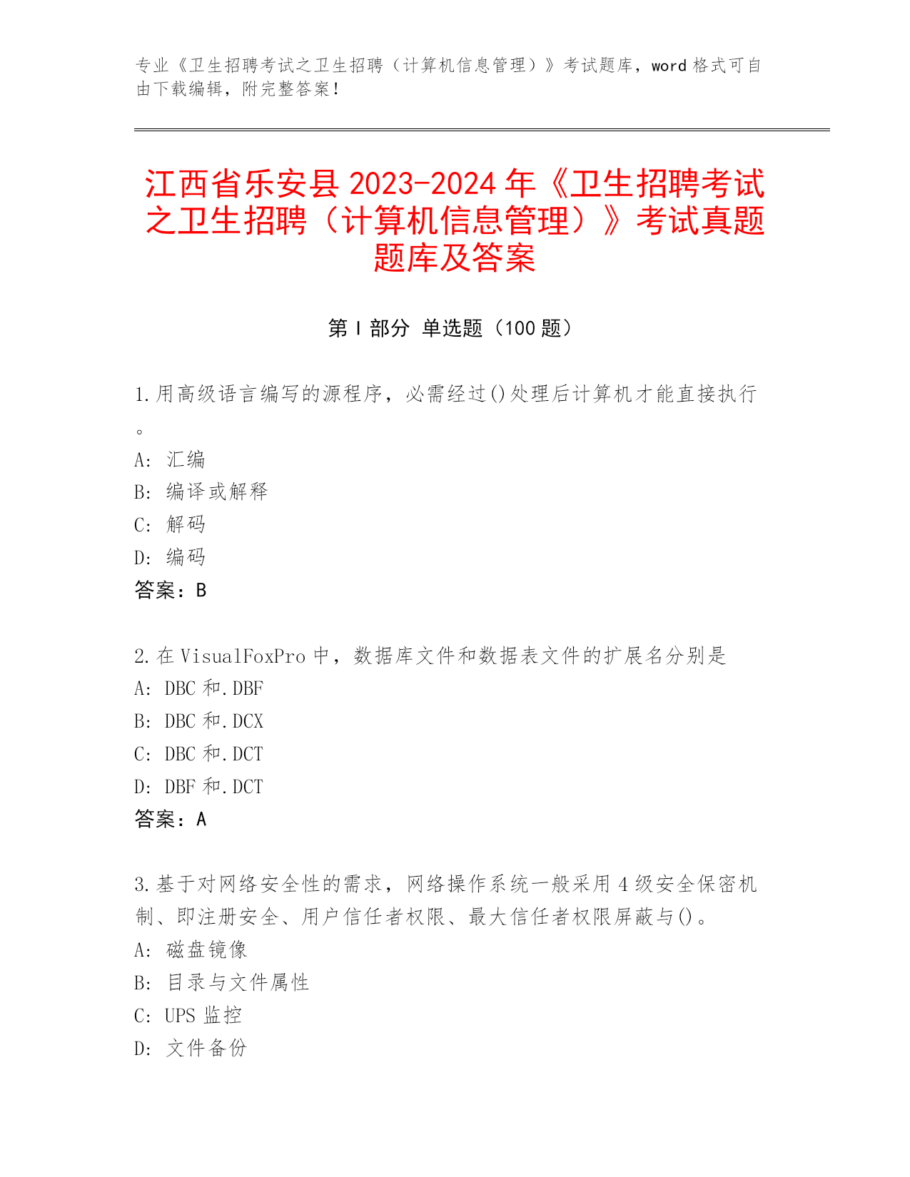 江西省乐安县2023-2024年《卫生招聘考试之卫生招聘(计算机信息管理)》考试真题题库及答案