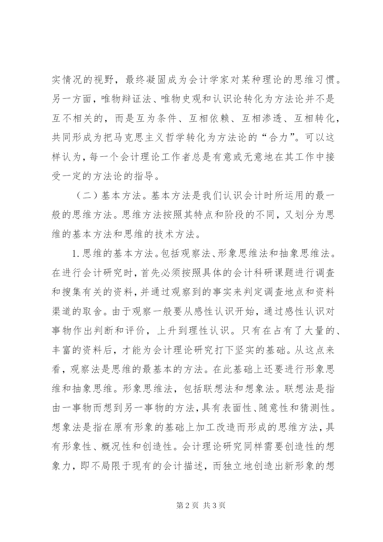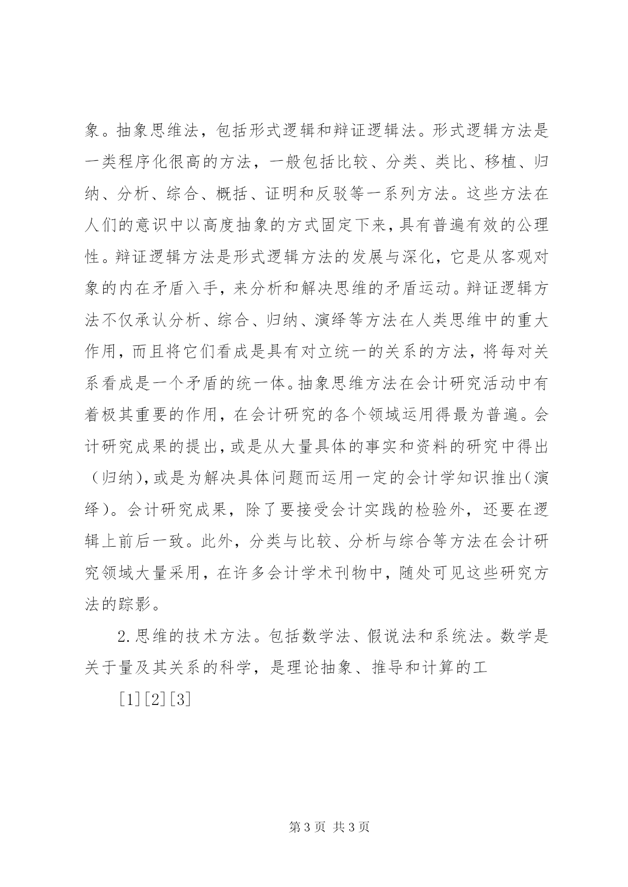 第PAGE\*Arabic\*MERGEFORMAT3页共NUMPAGES\*MERGEFORMAT3页关于理论研究方法体系的思考苏武俊(湖南大学会计学院410079)所谓会计理论研究方法是我们(认识主体)把握会计这一事物(认识客体)的途径、手段、工具和方式的总和,它所要解决的问题是“怎样才能正确地认识会计”。会计理论研究方法有着丰富的内涵和外延,而思维方法是会计理论研究方法的核心,本文主要侧重认识中的思维方法来探讨会计理论研究方法。思维属于人类的理性认识,它是在感性认识的基础上,借助于语言材料对客观事物间接、概括性的反映。思维方法则是指思维的基本程序和使用的基本手段。会计理论是关于会计的一种理性认识,它同其他科学的理论研究的思维方法一样,一般有三个层次:(一)方法论。方法论是认识世界和改造世界的根本方法,它是会计理论方法的最高层次。马克思主义哲学的认识论是会计理论研究的指导。具体地说,就是要把辩证唯物主义、历史唯物主义和革命能动的反映论当作会计理论研究方法的方法论。同其它学科一样,方法论在会计理研究方法体系中的作用主要体现在两个方面:一方面方法论是哲学思维或哲学方法论在会计学家意识中的体现,又是从哲学角度对会计现实和会计理论的审视,是提供会计学家认识会计的方法模式,这种模式被潜移默化地内化为会计学家的思维方式或方法意识,构成他们观察、思考会计现实情况的视野,最终凝固成为会计学家对某种理论的思维习惯。另一方面,唯物辩证法、唯物史观和认识论转化为方法论并不是互不相关的,而是互为条件、互相依赖、互相渗透、互相转化,共同形成为把马克思主义哲学转化为方法论的“合力”。可以这样认为,每一个会计理论工作者总是有意或无意地在其工作中接受一定的方法论的指导。(二)基本方法。基本方法是我们认识会计时所运用的最一般的思维方法。思维方法按照其特点和阶段的不同,又划分为思维的基本方法和思维的技术方法。1.思维的基本方法。包括观察法、形象思维法和抽象思维法。在进行会计研究时,首先必须按照具体的会计科研课题进行调查和搜集有关的资料,并通过观察到的事实来判定调查地点和资料渠道的取舍。由于观察一般要从感性认识开始,通过感性认识对事物作出判断和评价,上升到理性认识。只有在占有了大量的、丰富的资料后,才能为会计理论研究打下坚实的基础。从这点来看,观察法是思维的最基本的方法。在此基础上还要进行形象思维和抽象思维。形象思维法,包括联想法和想象法。联想法是指由一事物而想到另一事物的方法,具有表面性、随意性和猜测性。想象法是指在原有形象的基础上加工改造而形成的思维方法,具有形象性、概况性和创造性。会计理论研究同样需要创造性的想象力,即不局限于现有的会计描述,而独立地创造出新形象的想象。抽象思维法,包括形式逻辑和辩证逻辑法。形式逻辑方法是一类程序化很高的方法,一般包括比较、分类、类比、移植、归纳、分析、综合、概括、证明和反驳等一系列方法。这些方法在人们的意识中以高度抽象的方式固定下来,具有普遍有效的公理性。辩证逻辑方法是形式逻辑方法的发展与深化,它是从客观对象的内在矛盾入手,来分析和解决思维的矛盾运动。辩证逻辑方法不仅承认分析、综合、归纳、演绎等方法在人类思维中的重大作用,而且将它们看成是具有对立统一的关系的方法,将每对关系看成是一个矛盾的统一体。抽象思维方法在会计研究活动中有着极其重要的作用,在会计研究的各个领域运用得最为普遍。会计研究成果的提出,或是从大量具体的事实和资料的研究中得出(归纳),或是为解决具体问题而运用一定的会计学知识推出(演绎)。会计研究成果,除了要接受会计实践的检验外,还要在逻辑上前后一致。此外,分类与比较、分析与综合等方法在会计研究领域大量采用,在许多会计学术刊物中,随处可见这些研究方法的踪影。2.思维的技术方法。包括数学法、假说法和系统法。数学是关于量及其关系的科学,是理论抽象、推导和计算的工[1][2][3]