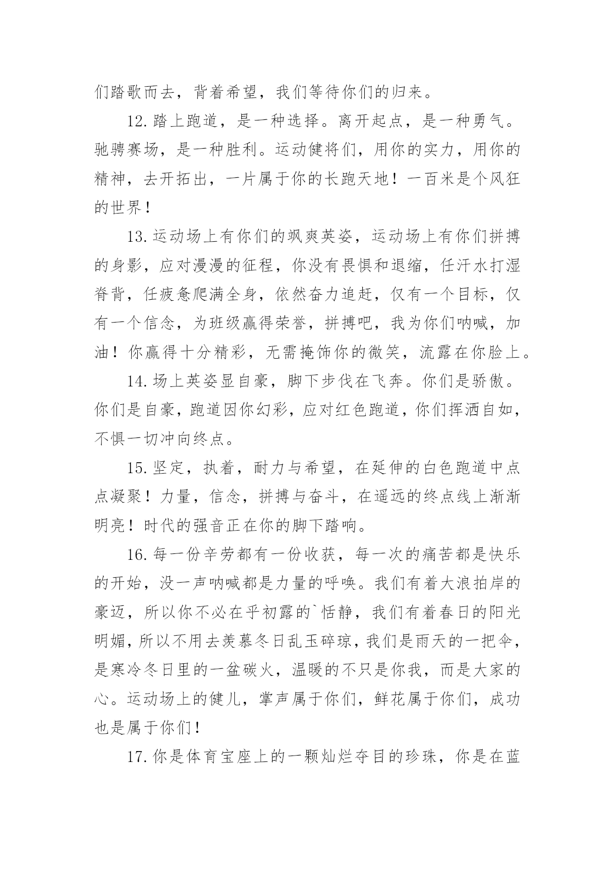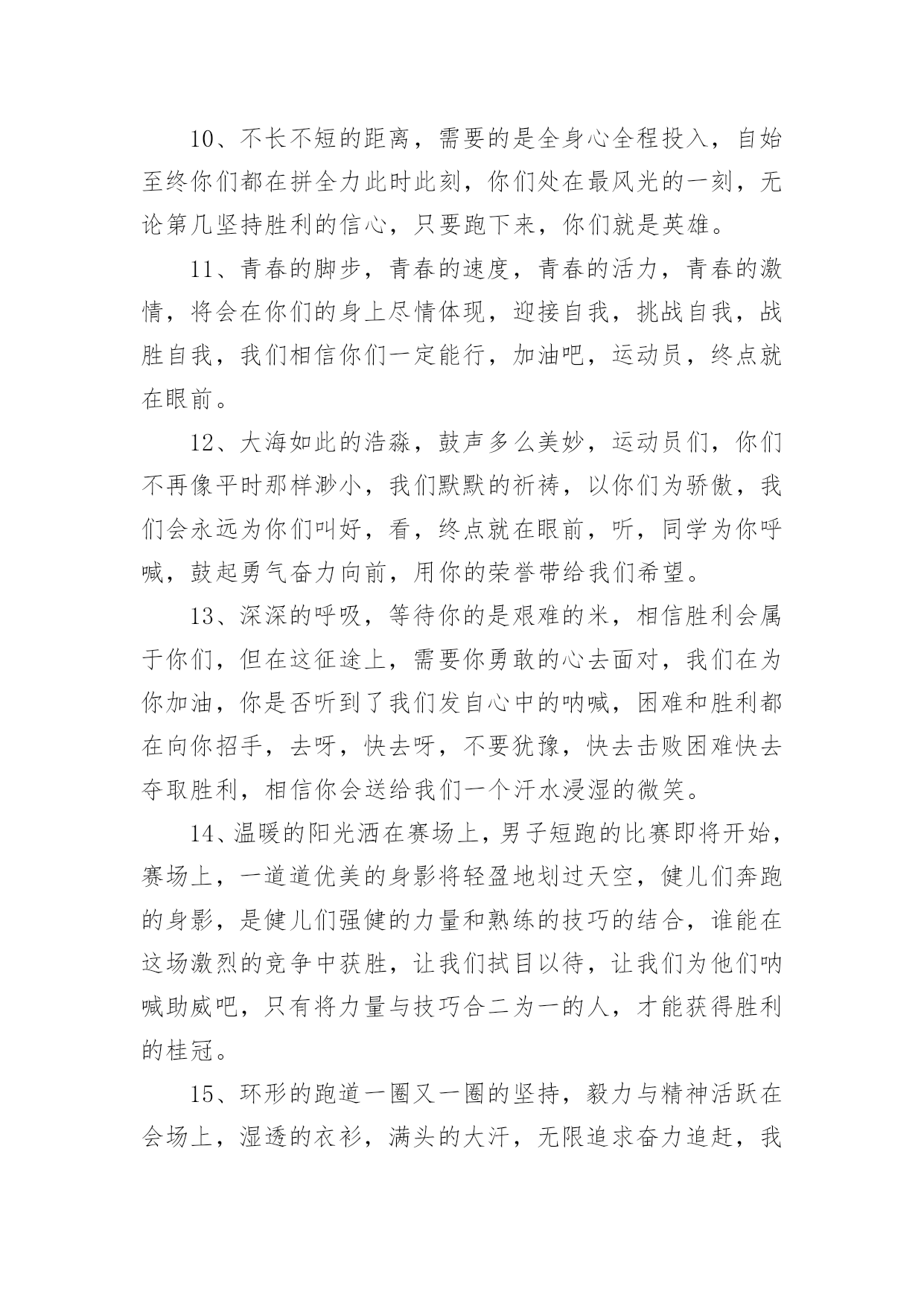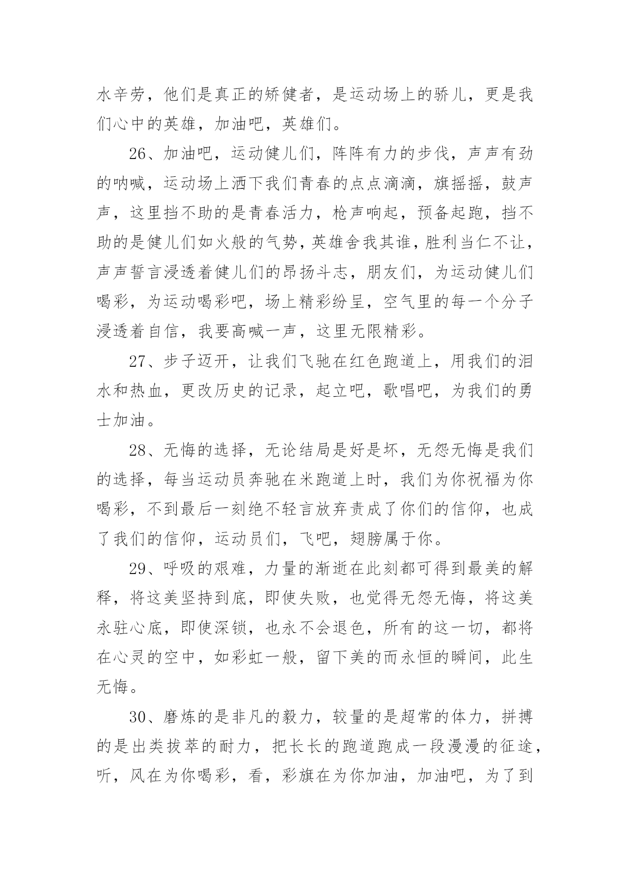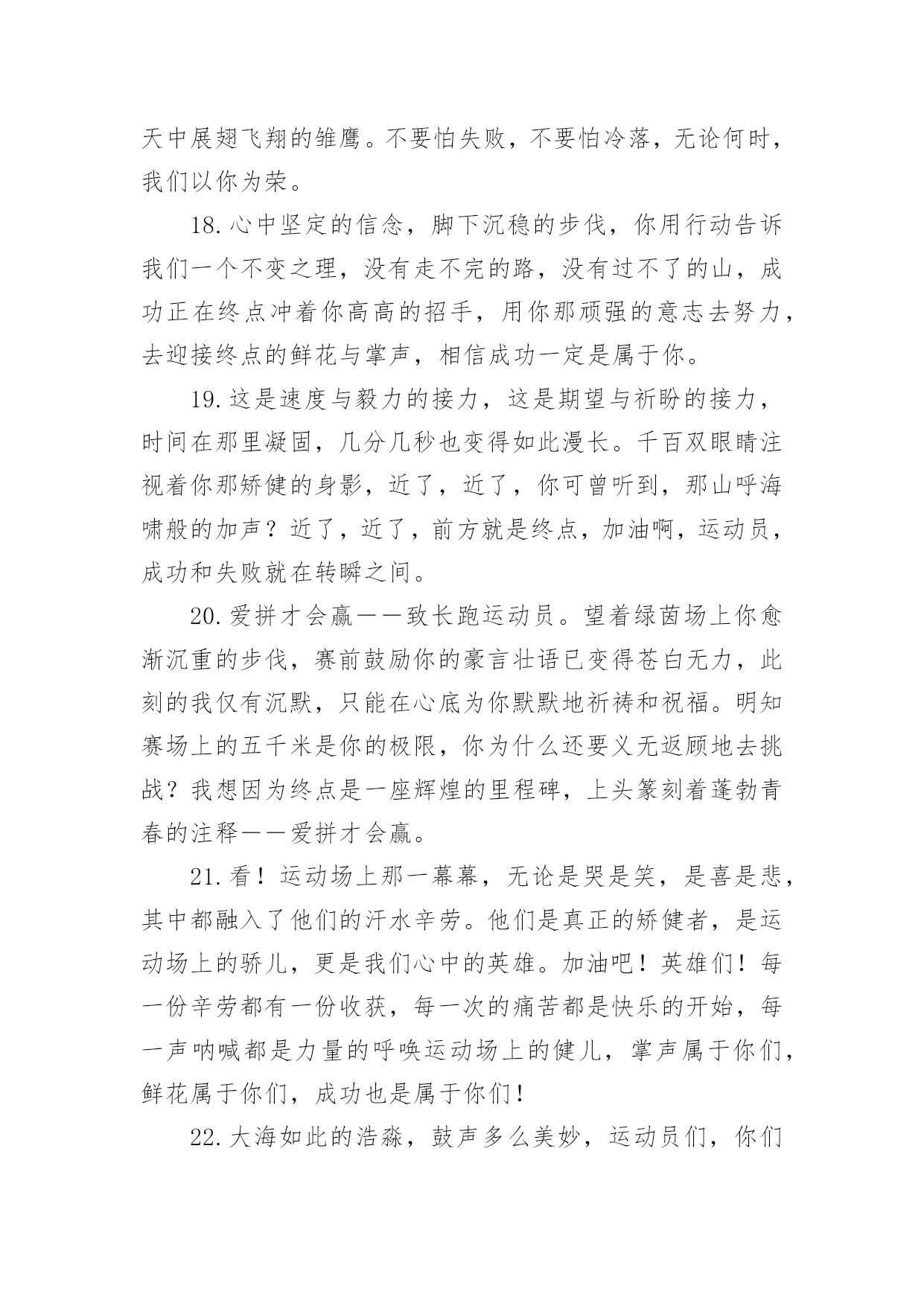 田径运动会加油稿在社会一步步向前发展的今天,很多地方都会使用到加油稿,借助加油稿可以表达对对方的鼓励和支持。还是对加油稿一筹莫展吗?下面是小编收集整理的田径运动会加油稿,仅供参考,希望能够帮助到大家。田径运动会加油稿11.赛场上,一道道优美的弧线将轻盈地划过天空。健儿们用手中的标枪向距离的权限发起一轮又一轮的挑战。标枪在空中轻盈的姿态,是健儿们强健的力量和熟练的技巧的结合。谁能在这场激烈的竞争中获胜?让我们拭目以待,让我们为他们呐喊助威吧!2.真的,人生要是能有一个草稿,能再誊写一次,那该多好!我们会绝对认真地叙写自己的人生,也许不必须比别人写得更好,但肯定要比自己第一次写得漂亮。或许,人生不可能像自己想象的那样完美,一生的路也不可能都是平坦的,人的情绪也不会永远静如止水。3.运动场上有你们的飒爽英姿,运动场上有你们拼搏的身影,应对漫漫的征程,你没有畏惧和退缩,任汗水打湿脊背,任疲惫爬满全身,依然分离追赶,只有一个目标,只有一个信念,为班级赢得荣誉,拼搏吧,我为你们呐喊,加油。4.心中坚定的信念,脚下沉稳的步伐,你用行动告诉我们一个不变之理,没有走不完的路,没有过不了的山,成功正在终点冲着你高高的招手,用你那顽强的意志去努力,去迎接终点的鲜花与掌声,相信成功必须是属于你。5.萧瑟的秋风,挡不住你们破竹的锐气。6.心中坚定的信念,脚下沉稳的步伐,你用行动告诉我们一个不变之理,没有走不完的路,没有过不了的山,成功正在终点冲着你高高的招手,用你那顽强的意志去努力,去迎接终点的鲜花与掌声,相信成功一定属于你。7.你用行动述说着过城的重要,没有无尽的终点,没有无法攀登的险峰,希望载着终点在向你微笑,拼搏吧!经历是一种精彩,迸发你全部的能量,成功是你汗水的写照。8.青春的脚步,青春的速度,青春的活力,青春的活力,将会在你们的身上尽情体现。迎接自我,挑战自我,战胜自我!我们相信你们必须能行,加油吧,运动员!终点就在眼前!9.今日的你们英姿飒爽,今日的你们朝气蓬勃,今日的你们一马当先。相信自己,你是最棒的!不要放弃,不要气馁。成功永远属于你们。米运动员啊!加油啊。10.不为掌声的注释、不为刻意的征服、不为失败的痛苦,只有辛勤的汗水化作快乐的回忆,只有努力的追求迈向非凡的成功11.就像花儿准备了春、秋、冬,就是为了红透整个盛夏。就像雪花经历了春、夏、秋就是为了洁白整个严冬。蹲下,昂首,出发……轻轻的一抬脚,便牵动了全场的目光。潇洒的挥挥手,便满足了那一份无言的等待。迎着朝阳,你们踏歌而去,背着希望,我们等待你们的归来。12.踏上跑道,是一种选择。离开起点,是一种勇气。驰骋赛场,是一种胜利。运动健将们,用你的实力,用你的精神,去开拓出,一片属于你的长跑天地!一百米是个风狂的世界!13.运动场上有你们的飒爽英姿,运动场上有你们拼搏的身影,应对漫漫的征程,你没有畏惧和退缩,任汗水打湿脊背,任疲惫爬满全身,依然奋力追赶,仅有一个目标,仅有一个信念,为班级赢得荣誉,拼搏吧,我为你们呐喊,加油!你赢得十分精彩,无需掩饰你的微笑,流露在你脸上。14.场上英姿显自豪,脚下步伐在飞奔。你们是骄傲。你们是自豪,跑道因你幻彩,应对红色跑道,你们挥洒自如,不惧一切冲向终点。15.坚定,执着,耐力与希望,在延伸的白色跑道中点点凝聚!力量,信念,拼搏与奋斗,在遥远的终点线上渐渐明亮!时代的强音正在你的脚下踏响。16.每一份辛劳都有一份收获,每一次的痛苦都是快乐的开始,没一声呐喊都是力量的呼唤。我们有着大浪拍岸的豪迈,所以你不必在乎初露的`恬静,我们有着春日的阳光明媚,所以不用去羡慕冬日乱玉碎琼,我们是雨天的一把伞,是寒冷冬日里的一盆碳火,温暖的不只是你我,而是大家的心。运动场上的健儿,掌声属于你们,鲜花属于你们,成功也是属于你们!17.你是体育宝座上的一颗灿烂夺目的珍珠,你是在蓝天中展翅飞翔的雏鹰。不要怕失败,不要怕冷落,无论何时,我们以你为荣。18.心中坚定的信念,脚下沉稳的步伐,你用行动告诉我们一个不变之理,没有走不完的路,没有过不了的山,成功正在终点冲着你高高的招手,用你那顽强的意志去努力,去迎接终点的鲜花与掌声,相信成功一定是属于你。19.这是速度与毅力的接力,这是期望与祈盼的接力,时间在那里凝固,几分几秒也变得如此漫长。千百双眼睛注视着你那矫健的身影,近了,近了,你可曾听到,那山呼海啸般的加声?近了,近了,前方就是终点,加油啊,运动员,成功和失败就在转瞬之间。20.爱拼才会赢――致长跑运动员。望着绿茵场上你愈渐沉重的步伐,赛前鼓励你的豪言壮语已变得苍白无力,此刻的我仅有沉默,只能在心底为你默默地祈祷和祝福。明知赛场上的五千米是你的极限,你为什么还要义无返顾地去挑战?我想因为终点是一座辉煌的里程碑,上头篆刻着蓬勃青春的注释――爱拼才会赢。21.看!运动场上那一