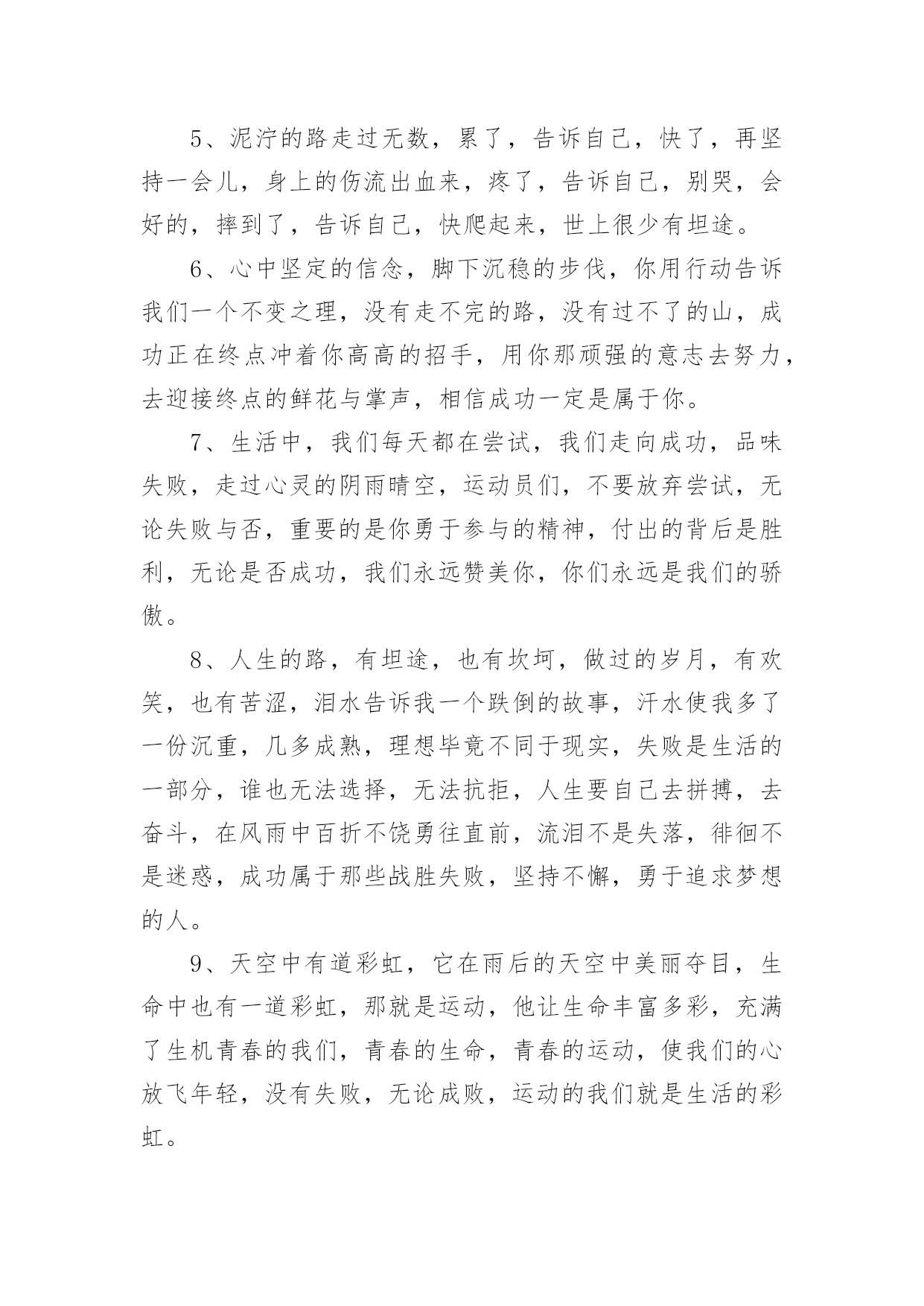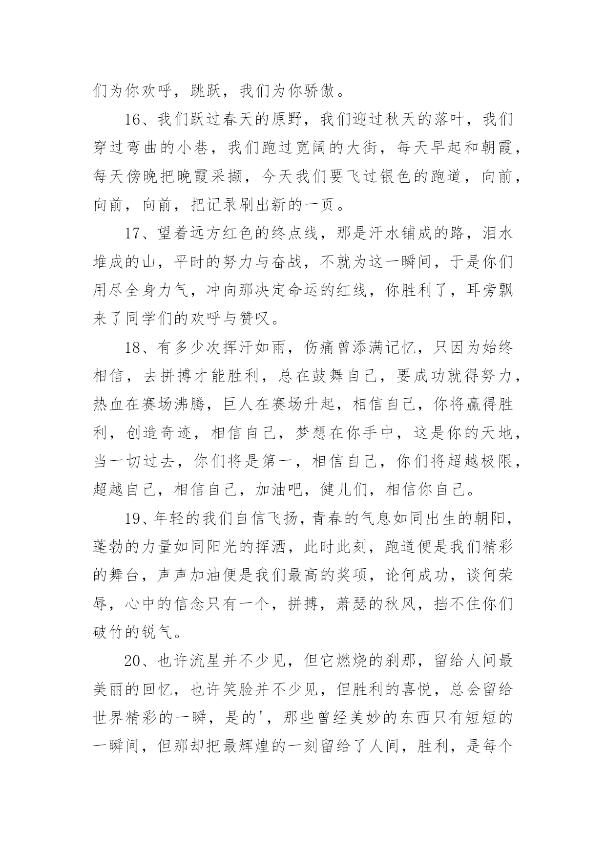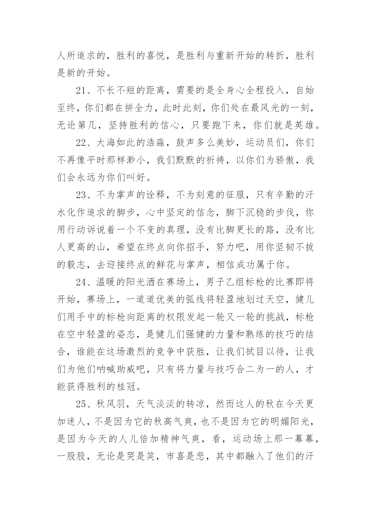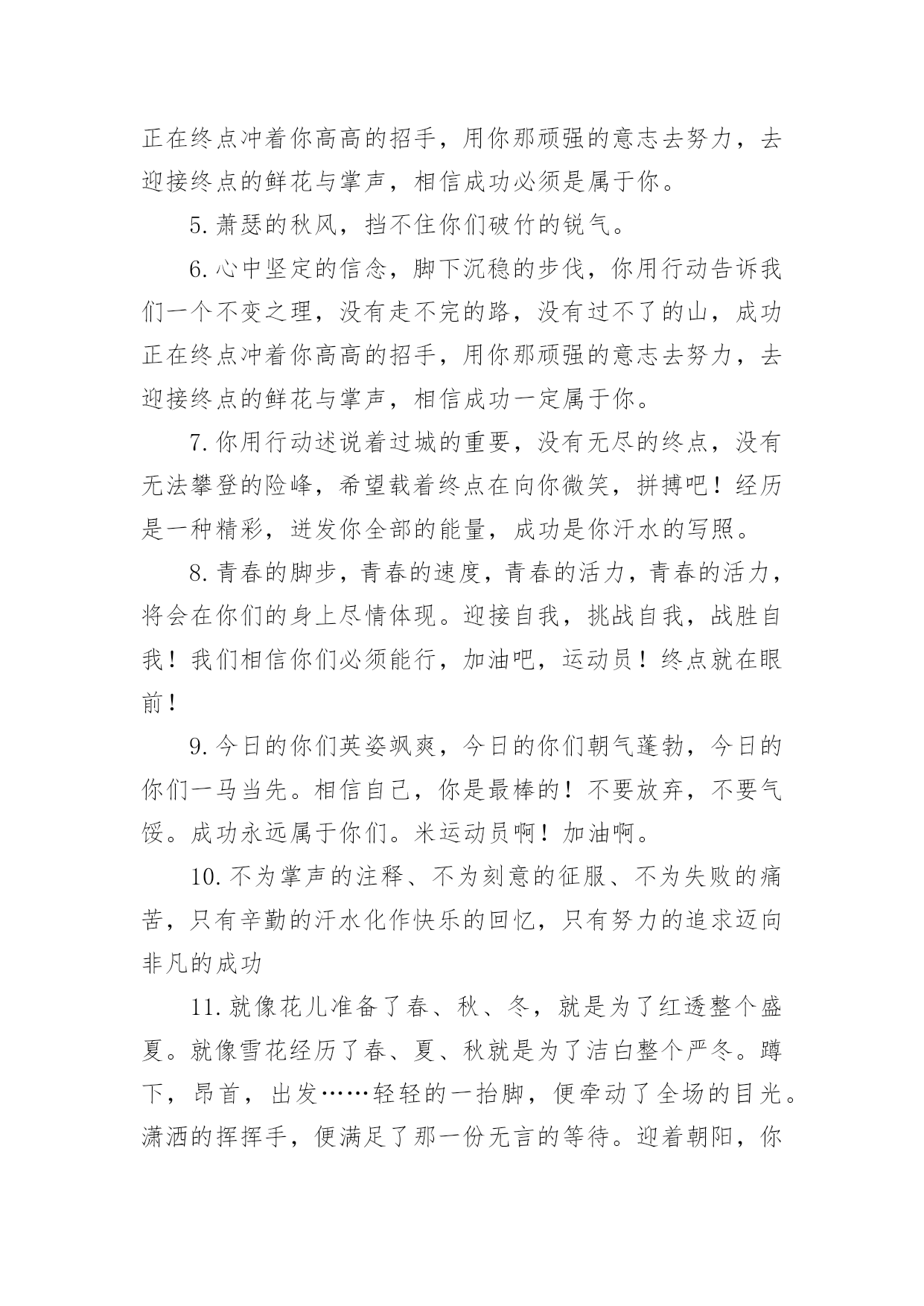 田径运动会加油稿在社会一步步向前发展的今天,很多地方都会使用到加油稿,借助加油稿可以表达对对方的鼓励和支持。还是对加油稿一筹莫展吗?下面是小编收集整理的田径运动会加油稿,仅供参考,希望能够帮助到大家。田径运动会加油稿11.赛场上,一道道优美的弧线将轻盈地划过天空。健儿们用手中的标枪向距离的权限发起一轮又一轮的挑战。标枪在空中轻盈的姿态,是健儿们强健的力量和熟练的技巧的结合。谁能在这场激烈的竞争中获胜?让我们拭目以待,让我们为他们呐喊助威吧!2.真的,人生要是能有一个草稿,能再誊写一次,那该多好!我们会绝对认真地叙写自己的人生,也许不必须比别人写得更好,但肯定要比自己第一次写得漂亮。或许,人生不可能像自己想象的那样完美,一生的路也不可能都是平坦的,人的情绪也不会永远静如止水。3.运动场上有你们的飒爽英姿,运动场上有你们拼搏的身影,应对漫漫的征程,你没有畏惧和退缩,任汗水打湿脊背,任疲惫爬满全身,依然分离追赶,只有一个目标,只有一个信念,为班级赢得荣誉,拼搏吧,我为你们呐喊,加油。4.心中坚定的信念,脚下沉稳的步伐,你用行动告诉我们一个不变之理,没有走不完的路,没有过不了的山,成功正在终点冲着你高高的招手,用你那顽强的意志去努力,去迎接终点的鲜花与掌声,相信成功必须是属于你。5.萧瑟的秋风,挡不住你们破竹的锐气。6.心中坚定的信念,脚下沉稳的步伐,你用行动告诉我们一个不变之理,没有走不完的路,没有过不了的山,成功正在终点冲着你高高的招手,用你那顽强的意志去努力,去迎接终点的鲜花与掌声,相信成功一定属于你。7.你用行动述说着过城的重要,没有无尽的终点,没有无法攀登的险峰,希望载着终点在向你微笑,拼搏吧!经历是一种精彩,迸发你全部的能量,成功是你汗水的写照。8.青春的脚步,青春的速度,青春的活力,青春的活力,将会在你们的身上尽情体现。迎接自我,挑战自我,战胜自我!我们相信你们必须能行,加油吧,运动员!终点就在眼前!9.今日的你们英姿飒爽,今日的你们朝气蓬勃,今日的你们一马当先。相信自己,你是最棒的!不要放弃,不要气馁。成功永远属于你们。米运动员啊!加油啊。10.不为掌声的注释、不为刻意的征服、不为失败的痛苦,只有辛勤的汗水化作快乐的回忆,只有努力的追求迈向非凡的成功11.就像花儿准备了春、秋、冬,就是为了红透整个盛夏。就像雪花经历了春、夏、秋就是为了洁白整个严冬。蹲下,昂首,出发……轻轻的一抬脚,便牵动了全场的目光。潇洒的挥挥手,便满足了那一份无言的等待。迎着朝阳,你们踏歌而去,背着希望,我们等待你们的归来。12.踏上跑道,是一种选择。离开起点,是一种勇气。驰骋赛场,是一种胜利。运动健将们,用你的实力,用你的精神,去开拓出,一片属于你的长跑天地!一百米是个风狂的世界!13.运动场上有你们的飒爽英姿,运动场上有你们拼搏的身影,应对漫漫的征程,你没有畏惧和退缩,任汗水打湿脊背,任疲惫爬满全身,依然奋力追赶,仅有一个目标,仅有一个信念,为班级赢得荣誉,拼搏吧,我为你们呐喊,加油!你赢得十分精彩,无需掩饰你的微笑,流露在你脸上。14.场上英姿显自豪,脚下步伐在飞奔。你们是骄傲。你们是自豪,跑道因你幻彩,应对红色跑道,你们挥洒自如,不惧一切冲向终点。15.坚定,执着,耐力与希望,在延伸的白色跑道中点点凝聚!力量,信念,拼搏与奋斗,在遥远的终点线上渐渐明亮!时代的强音正在你的脚下踏响。16.每一份辛劳都有一份收获,每一次的痛苦都是快乐的开始,没一声呐喊都是力量的呼唤。我们有着大浪拍岸的豪迈,所以你不必在乎初露的`恬静,我们有着春日的阳光明媚,所以不用去羡慕冬日乱玉碎琼,我们是雨天的一把伞,是寒冷冬日里的一盆碳火,温暖的不只是你我,而是大家的心。运动场上的健儿,掌声属于你们,鲜花属于你们,成功也是属于你们!17.你是体育宝座上的一颗灿烂夺目的珍珠,你是在蓝天中展翅飞翔的雏鹰。不要怕失败,不要怕冷落,无论何时,我们以你为荣。18.心中坚定的信念,脚下沉稳的步伐,你用行动告诉我们一个不变之理,没有走不完的路,没有过不了的山,成功正在终点冲着你高高的招手,用你那顽强的意志去努力,去迎接终点的鲜花与掌声,相信成功一定是属于你。19.这是速度与毅力的接力,这是期望与祈盼的接力,时间在那里凝固,几分几秒也变得如此漫长。千百双眼睛注视着你那矫健的身影,近了,近了,你可曾听到,那山呼海啸般的加声?近了,近了,前方就是终点,加油啊,运动员,成功和失败就在转瞬之间。20.爱拼才会赢――致长跑运动员。望着绿茵场上你愈渐沉重的步伐,赛前鼓励你的豪言壮语已变得苍白无力,此刻的我仅有沉默,只能在心底为你默默地祈祷和祝福。明知赛场上的五千米是你的极限,你为什么还要义无返顾地去挑战?我想因为终点是一座辉煌的里程碑,上头篆刻着蓬勃青春的注释――爱拼才会赢。21.看!运动场上那一