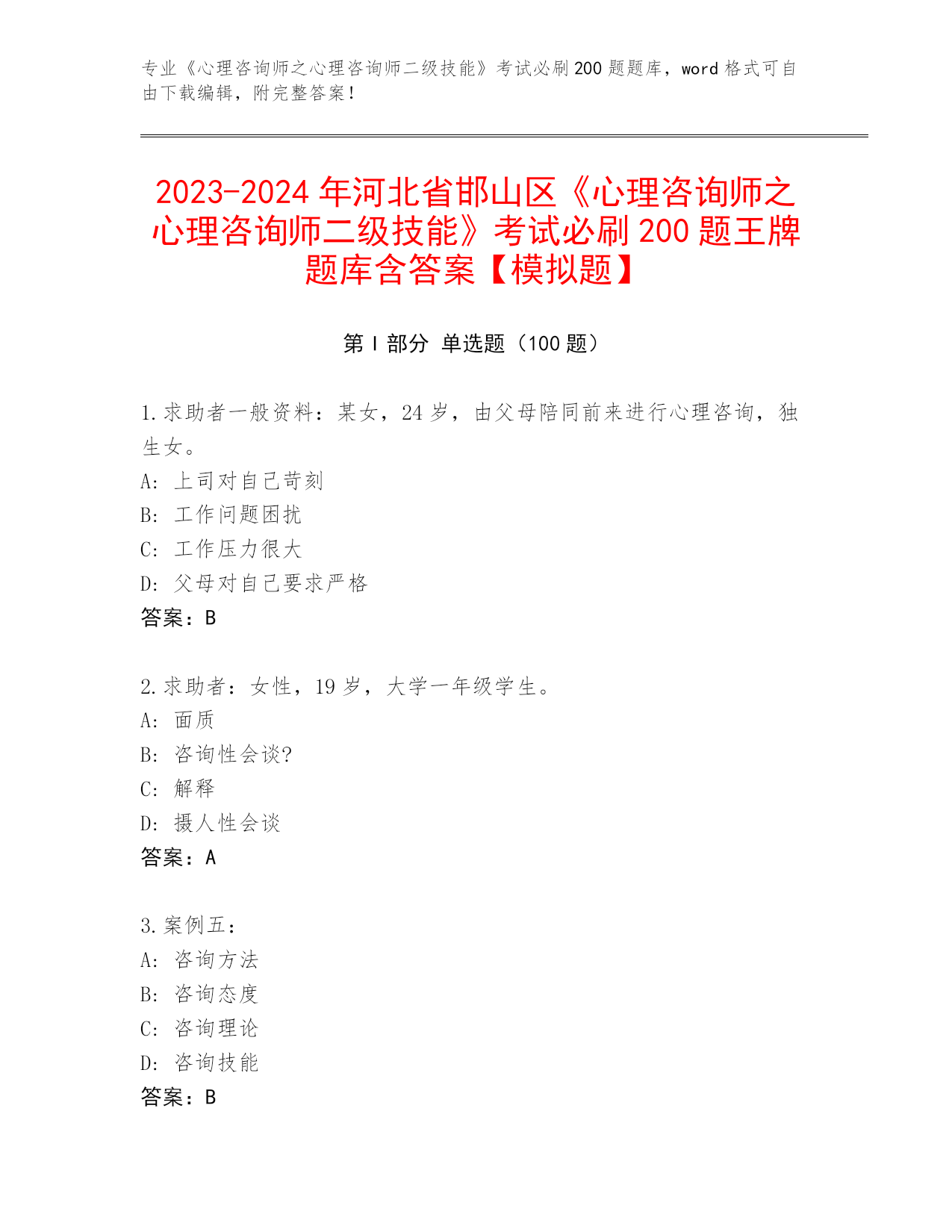 河北省邯山区2024年《心理咨询师之心理咨询师二级技能》资格考试必刷200题题库带答案
